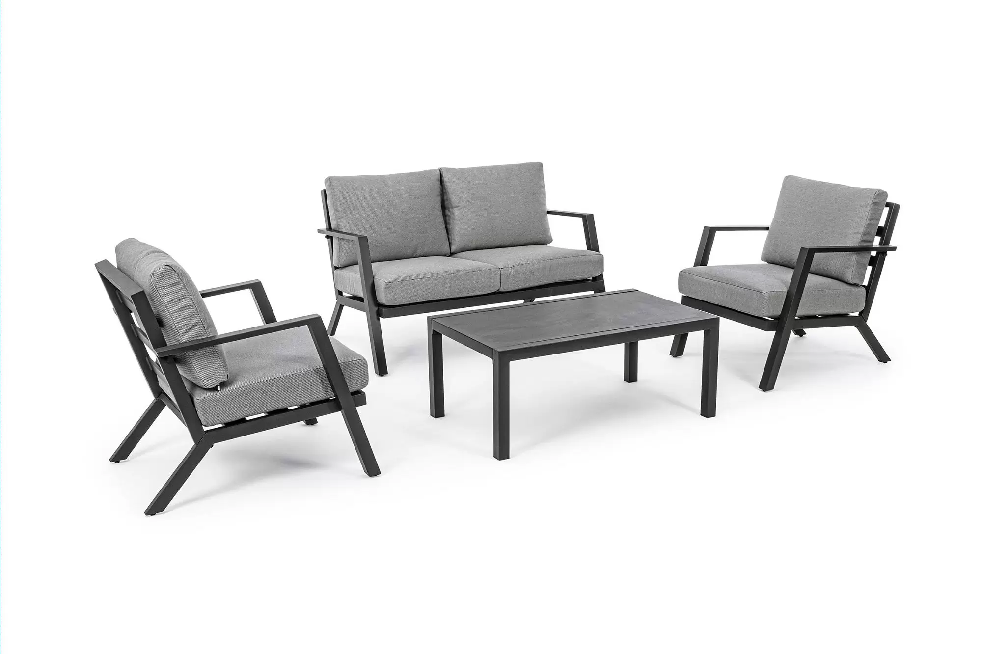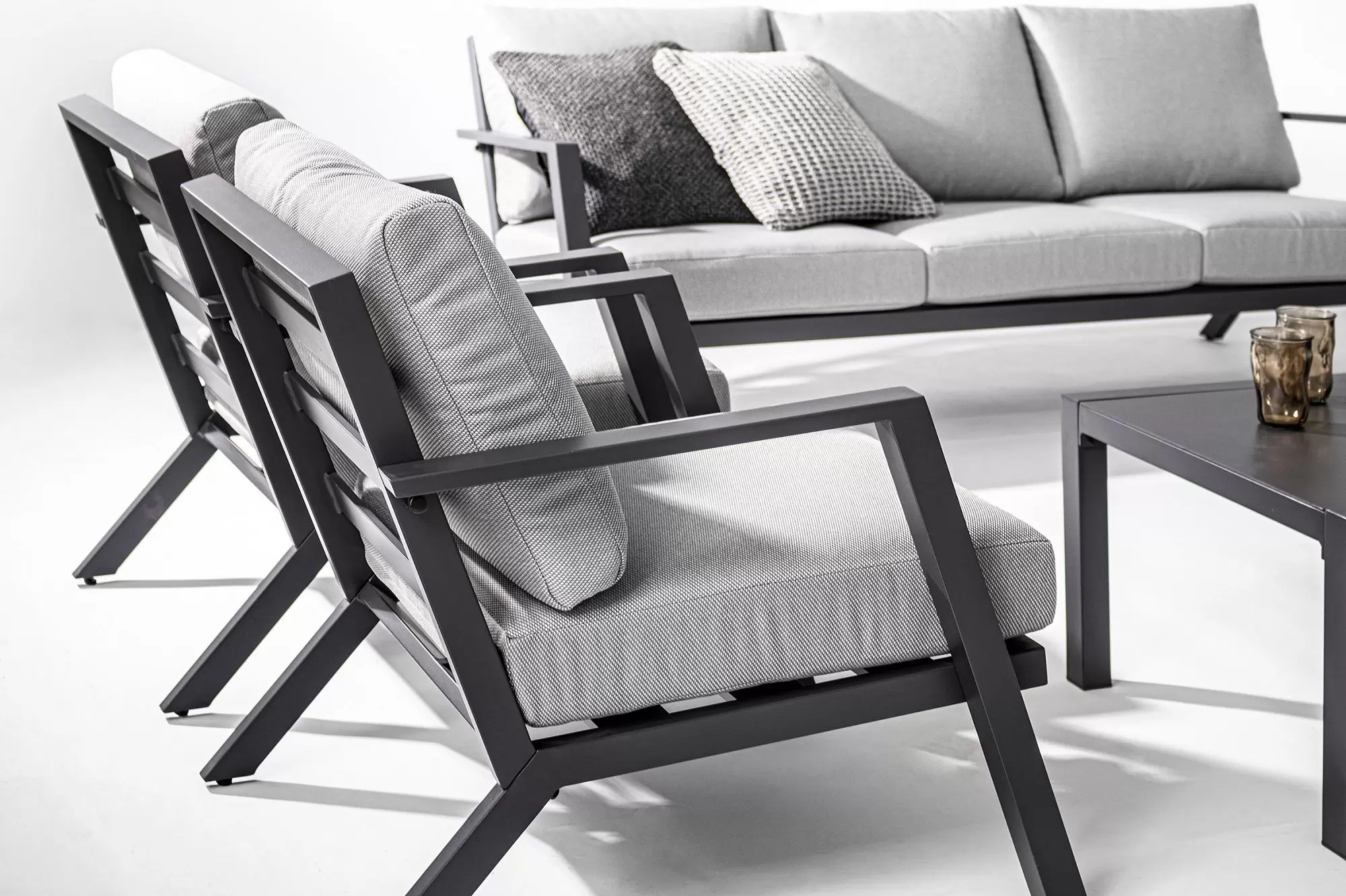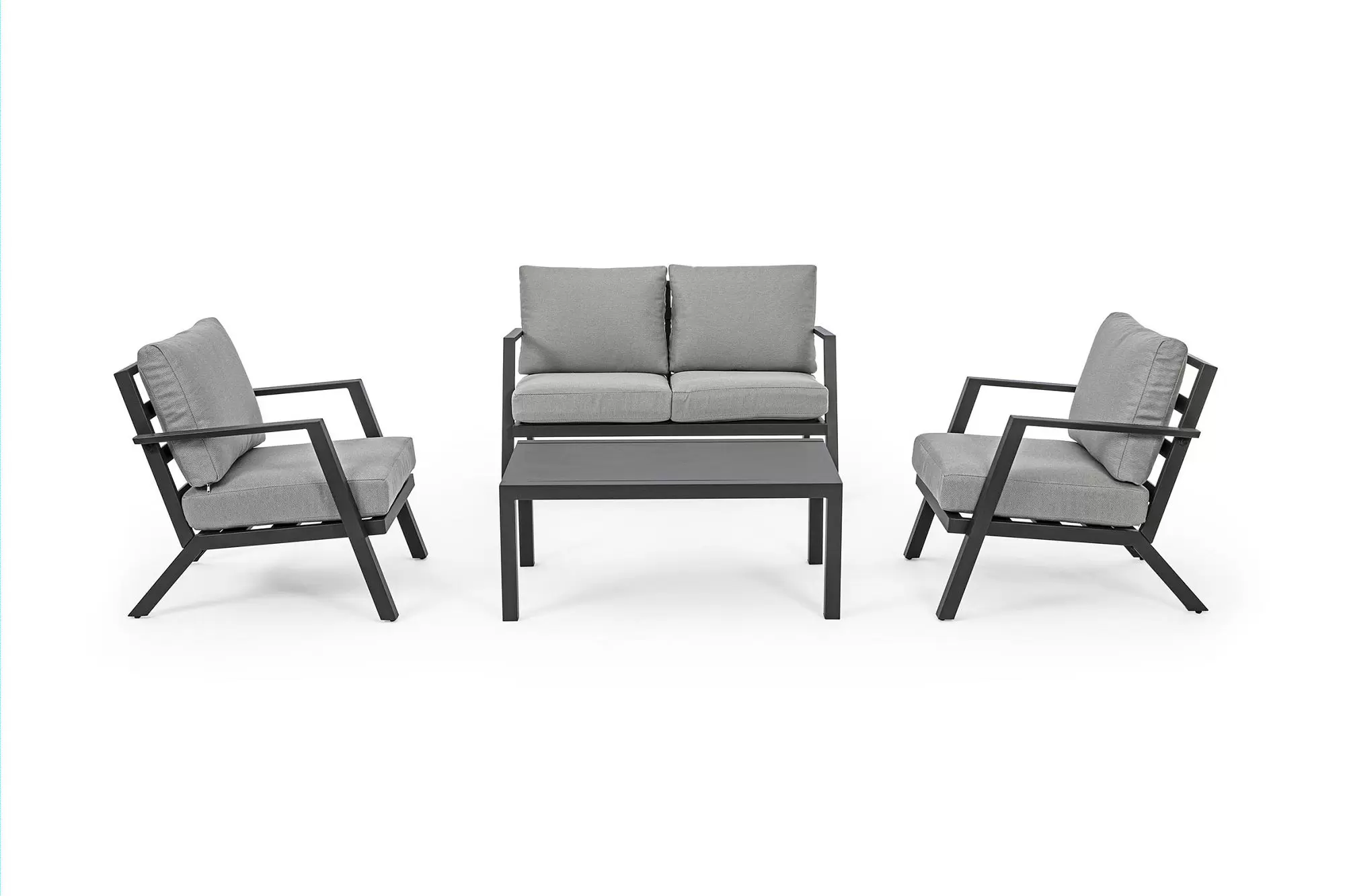 Aluminiowy zestaw wypoczynkowy z poduszkami z materiału Olefin. Idealny zestaw na nieduży taras.