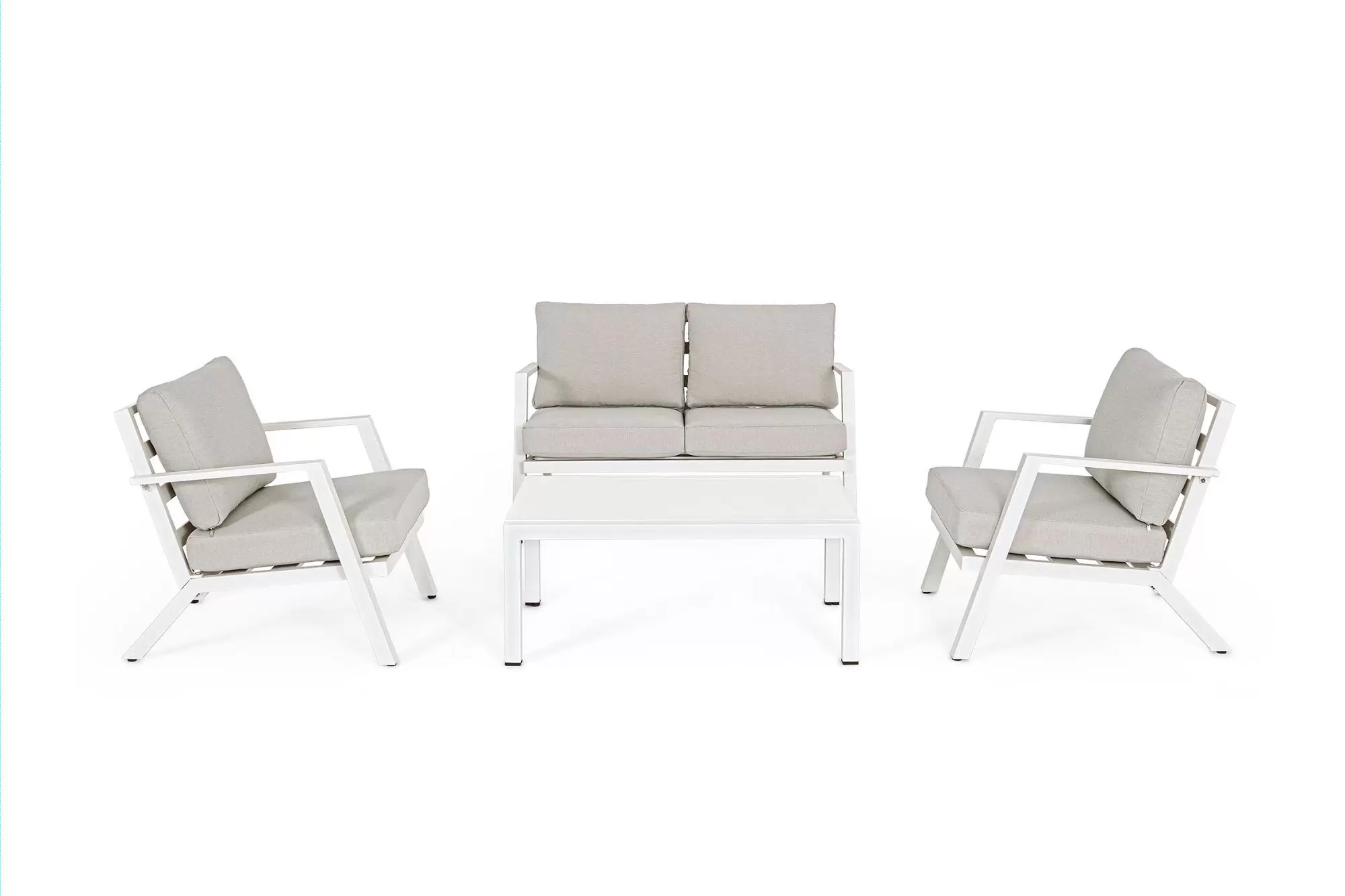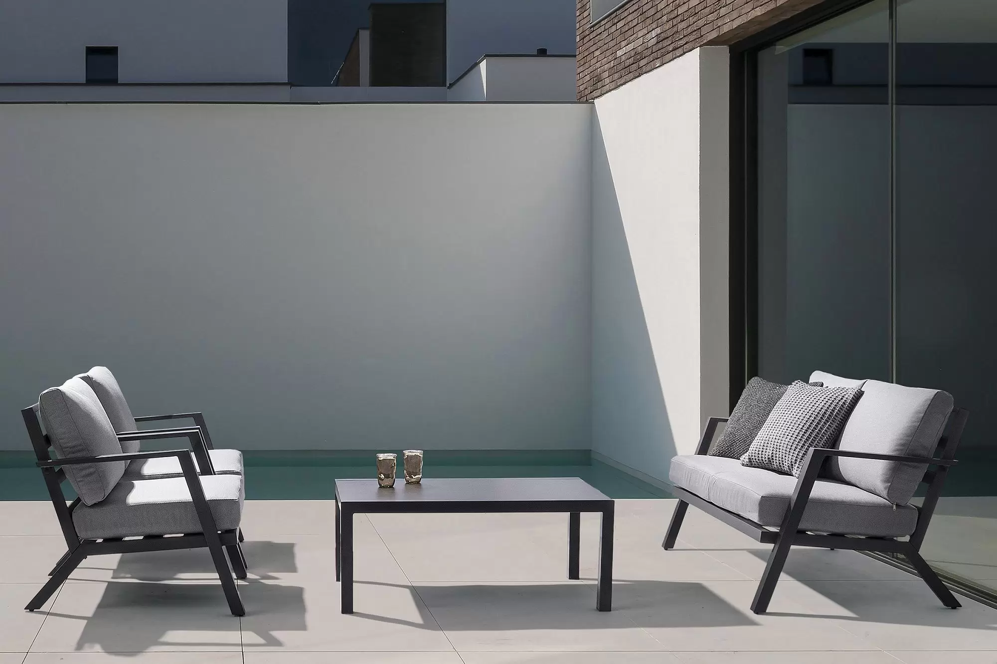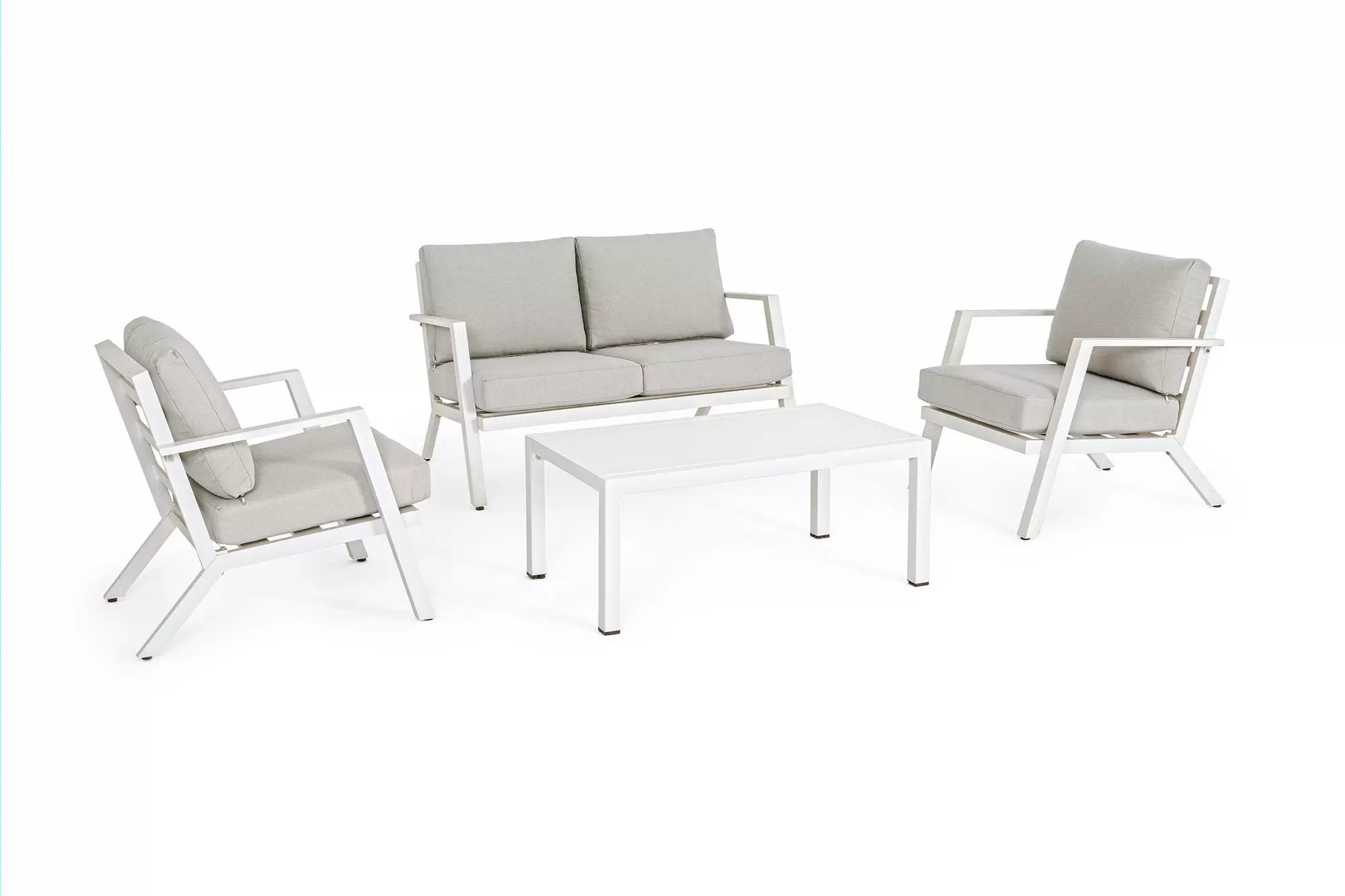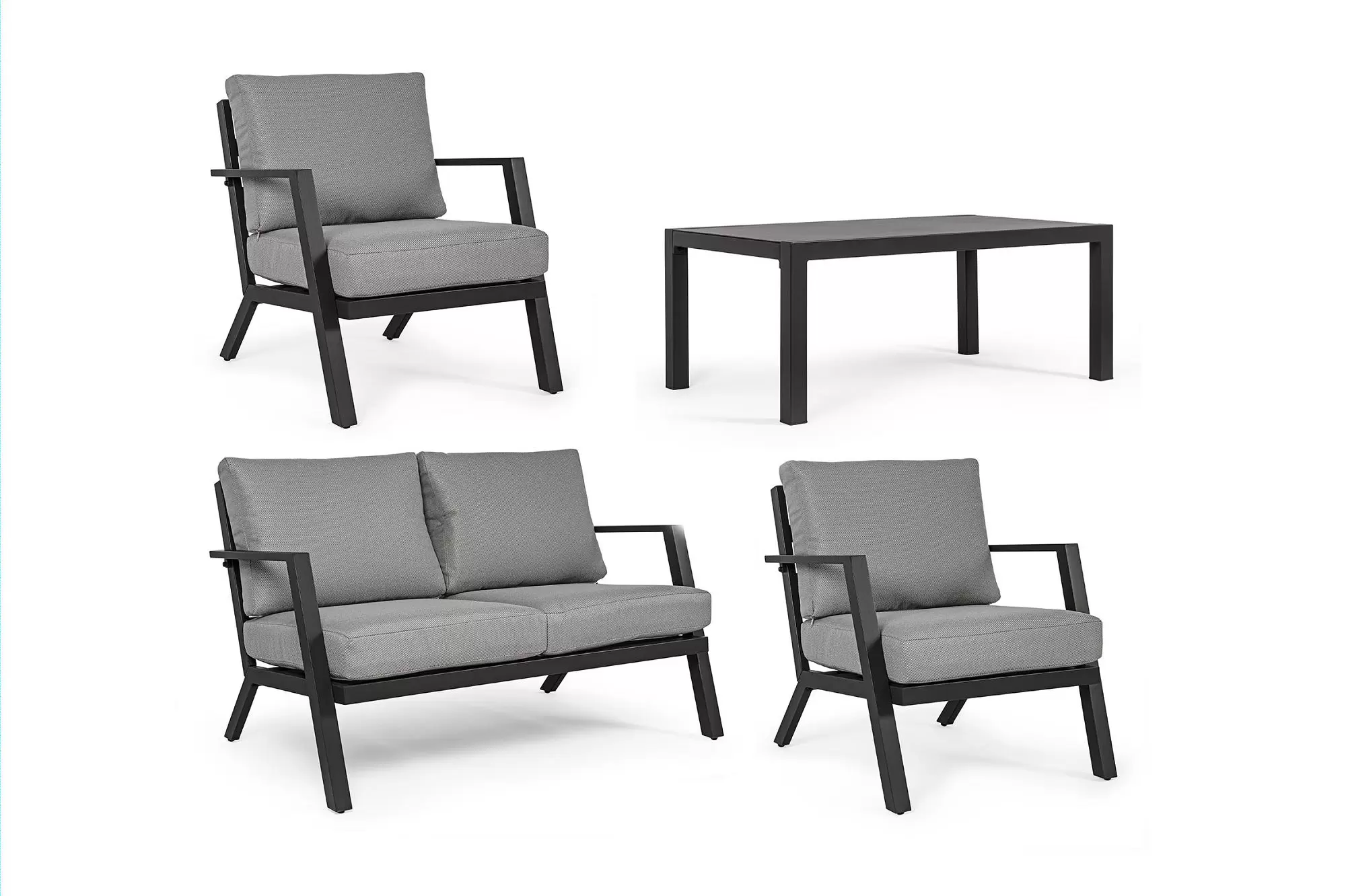 Aluminiowy zestaw wypoczynkowy z poduszkami z materiału Olefin. Idealny zestaw na nieduży taras.