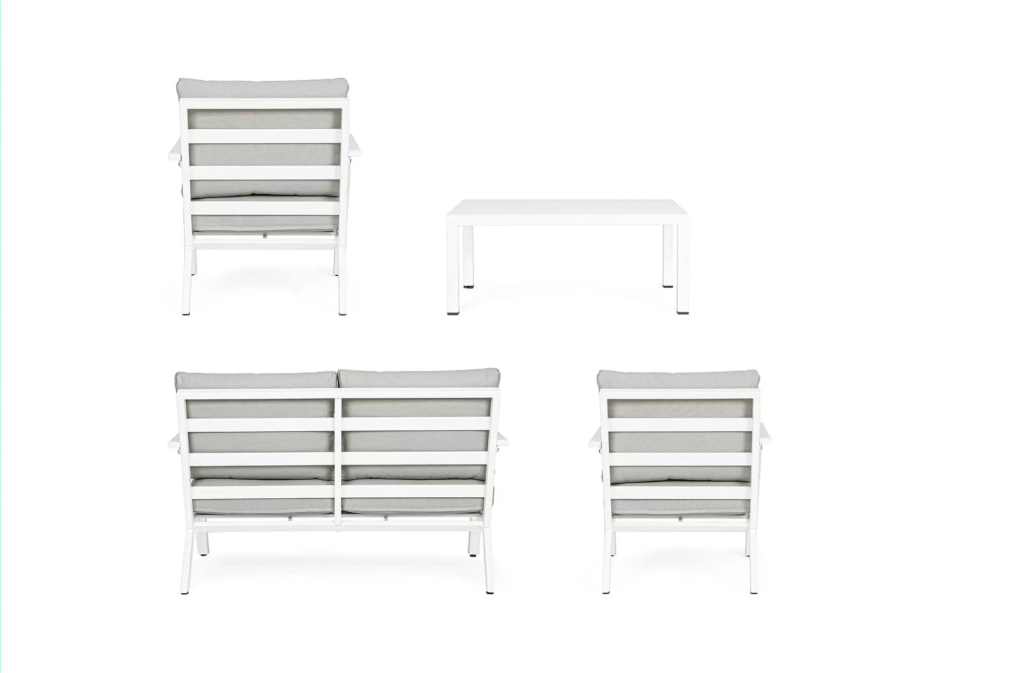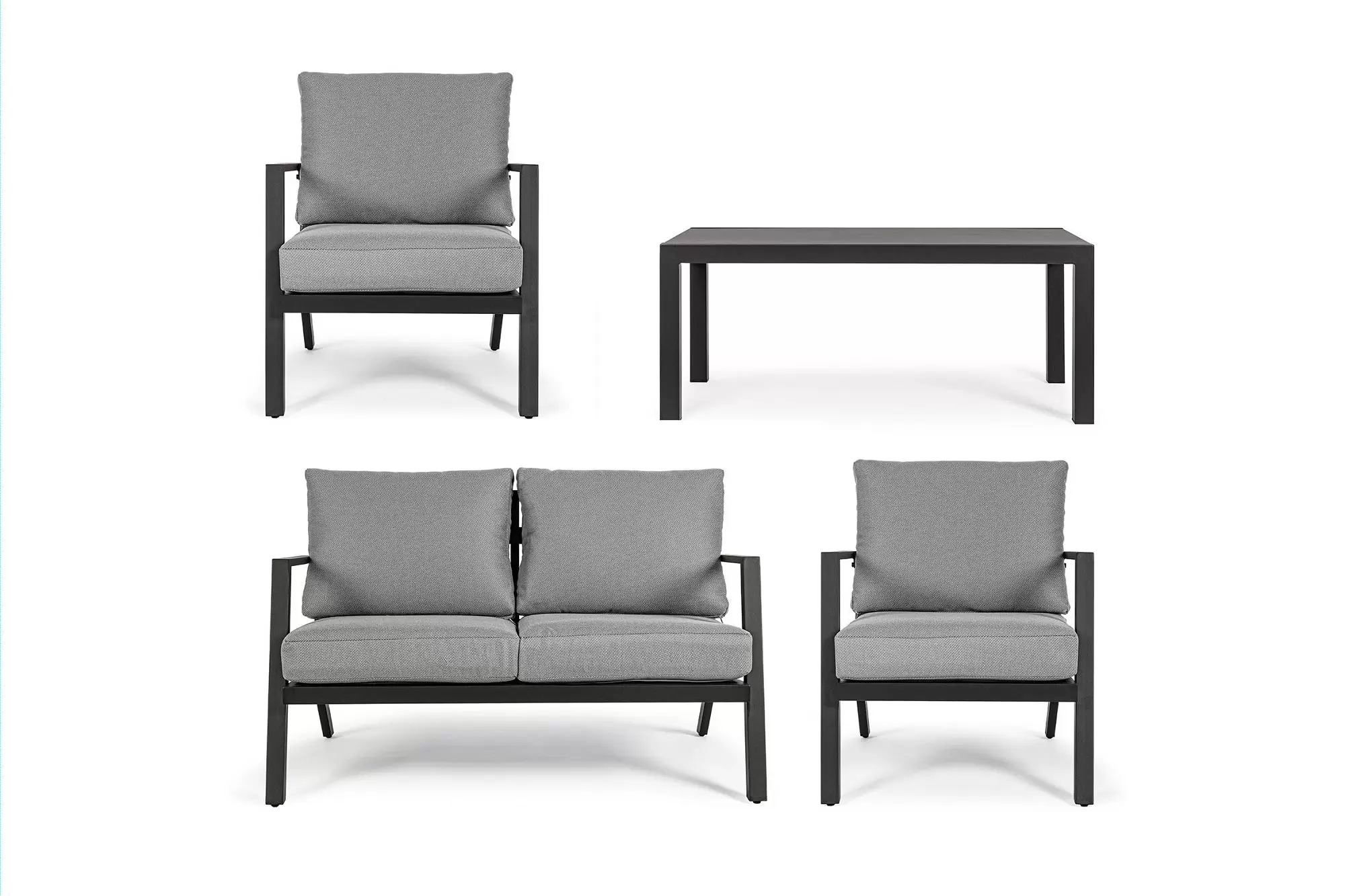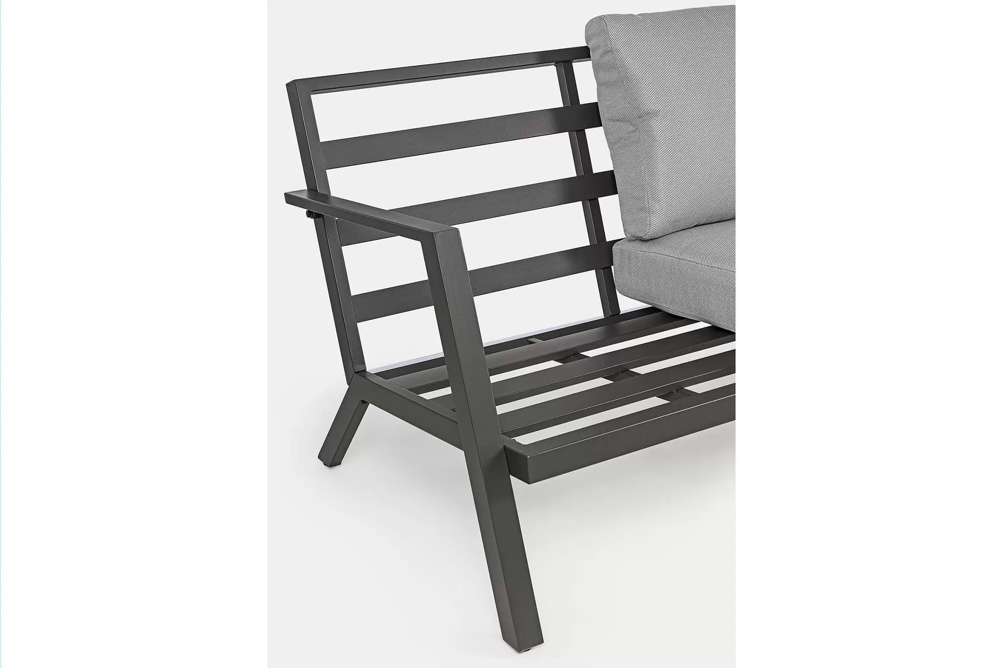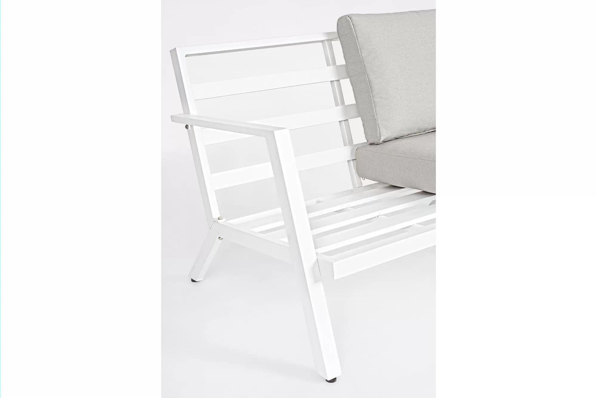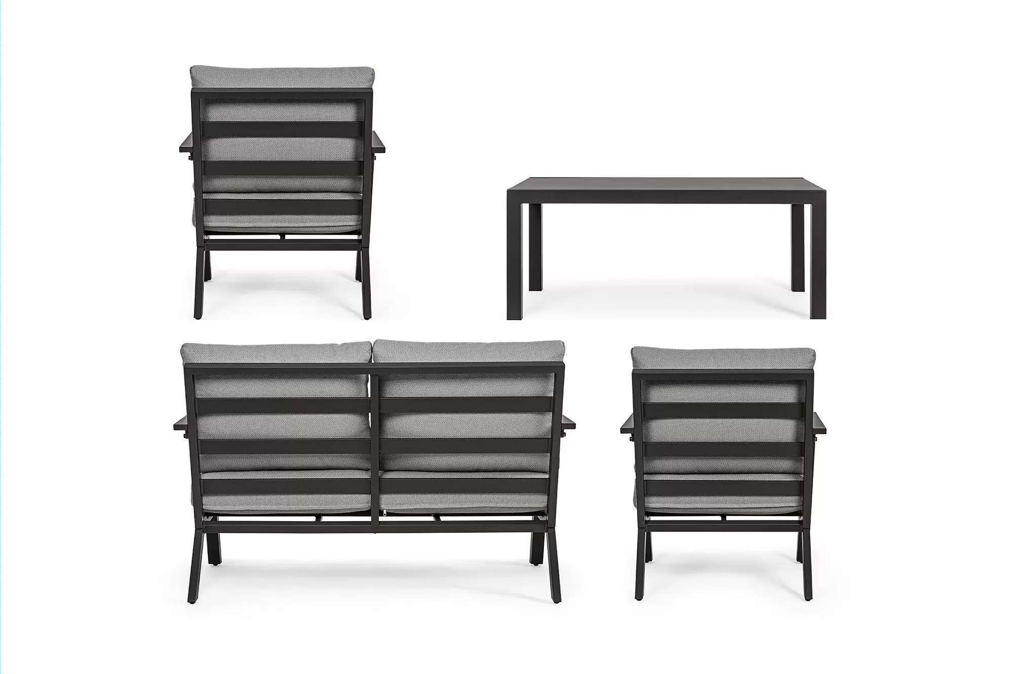 Konstrukcja aluminiowa malowana proszkowo na kolor ciemnoszary (poduszki jasnoszare), biały (p. szarobeżowe) lub kawowy (p. beżowe).