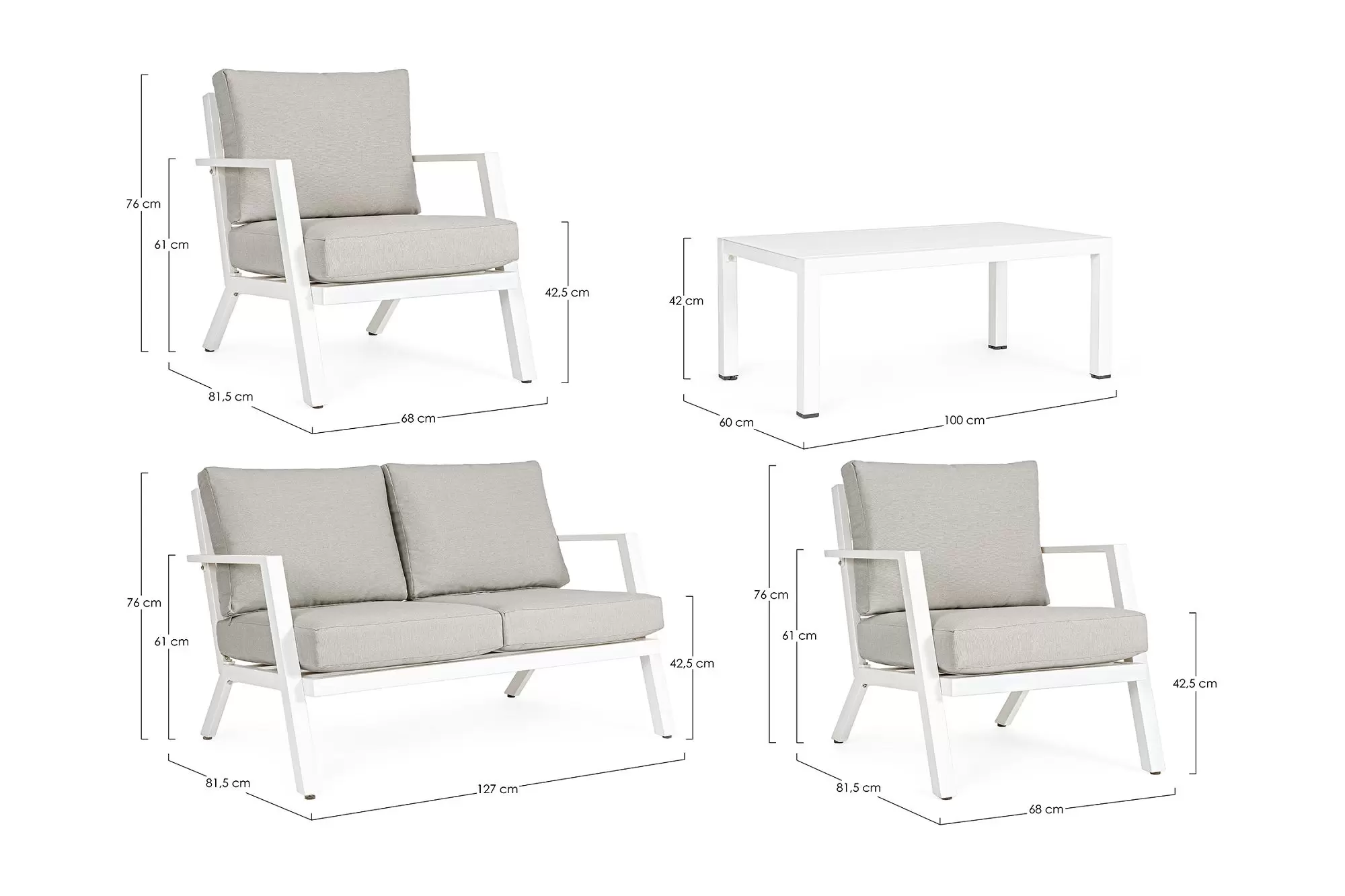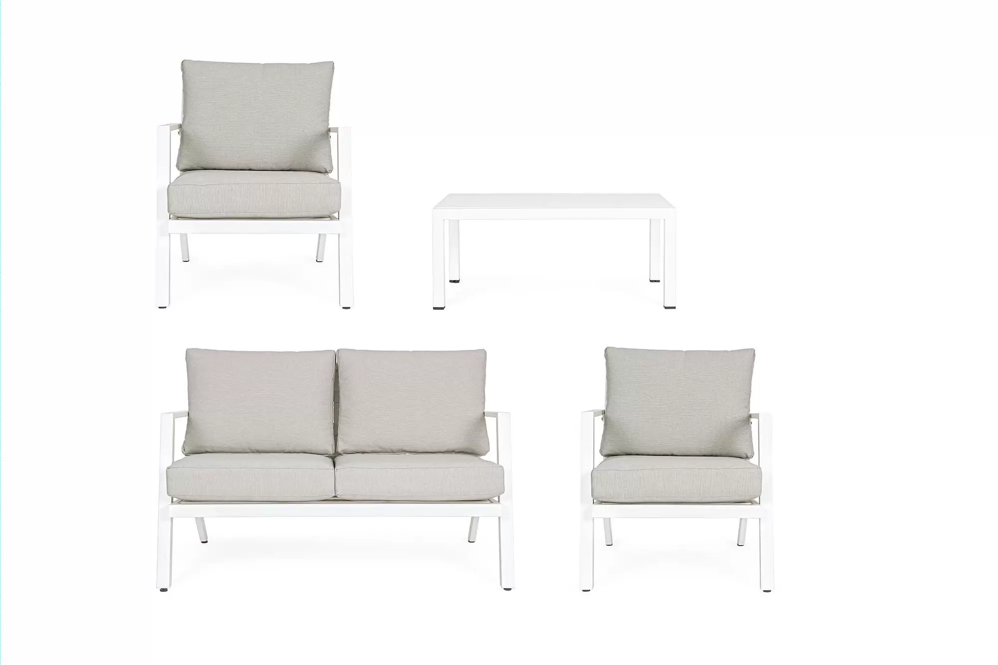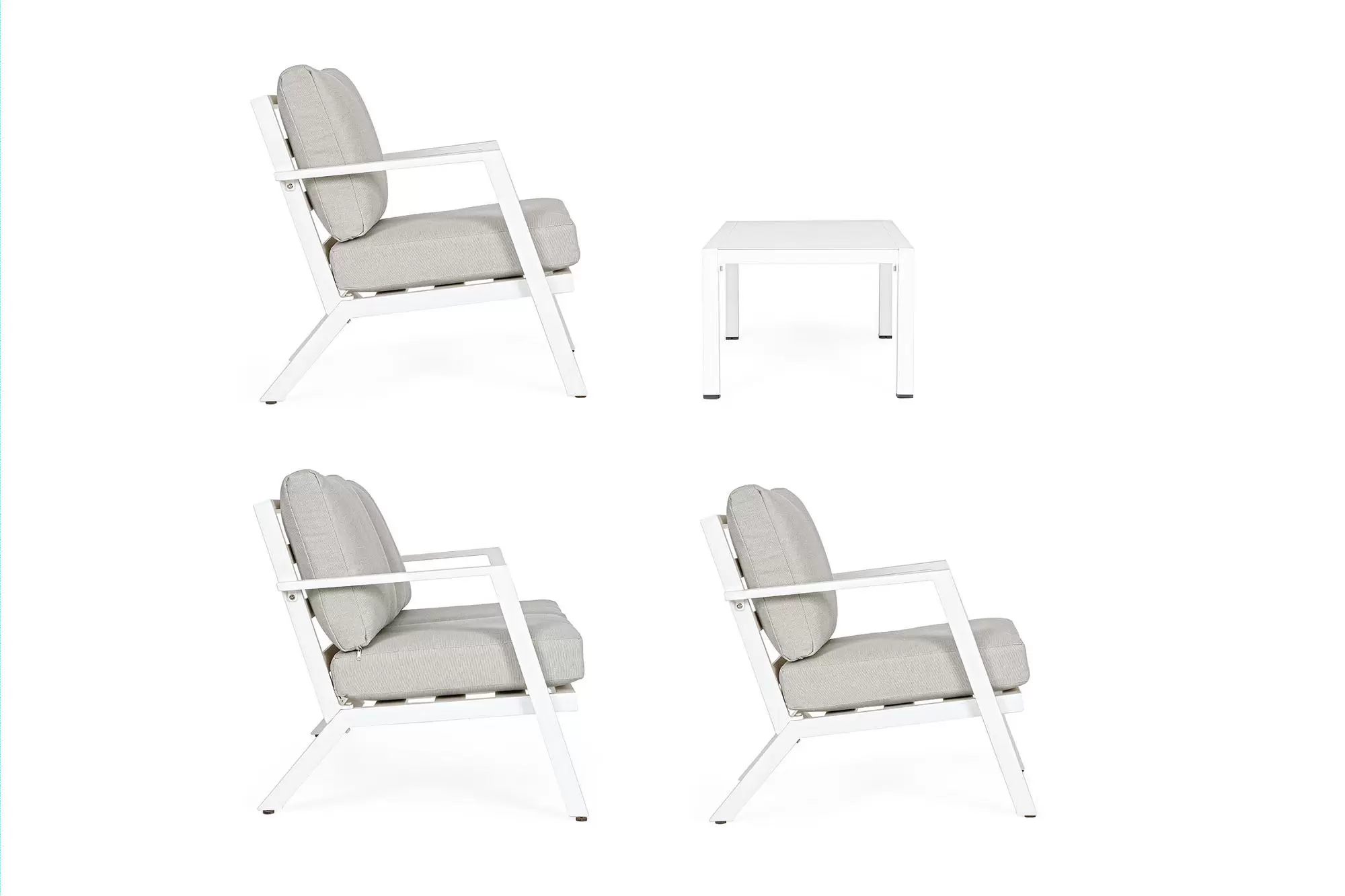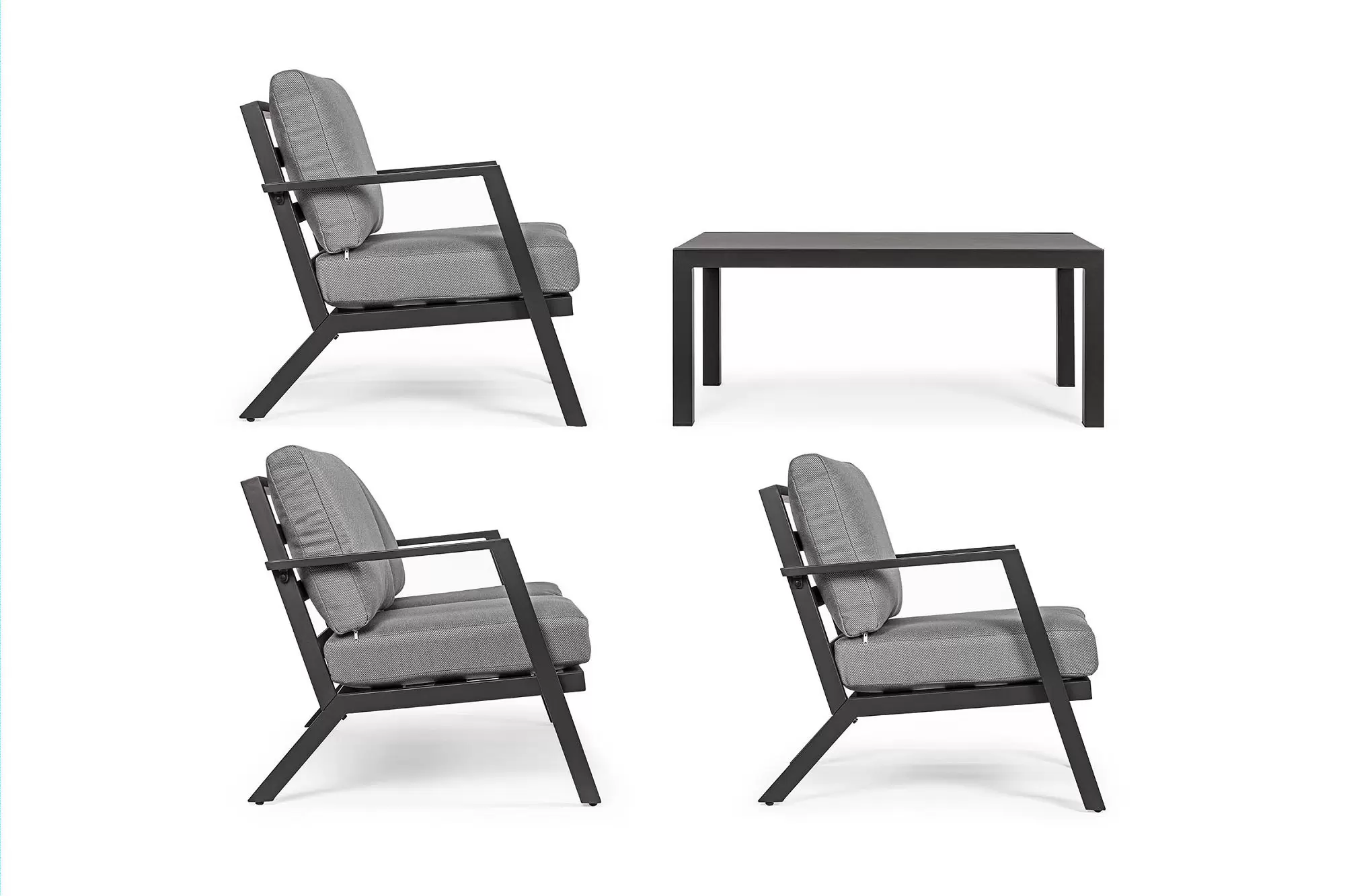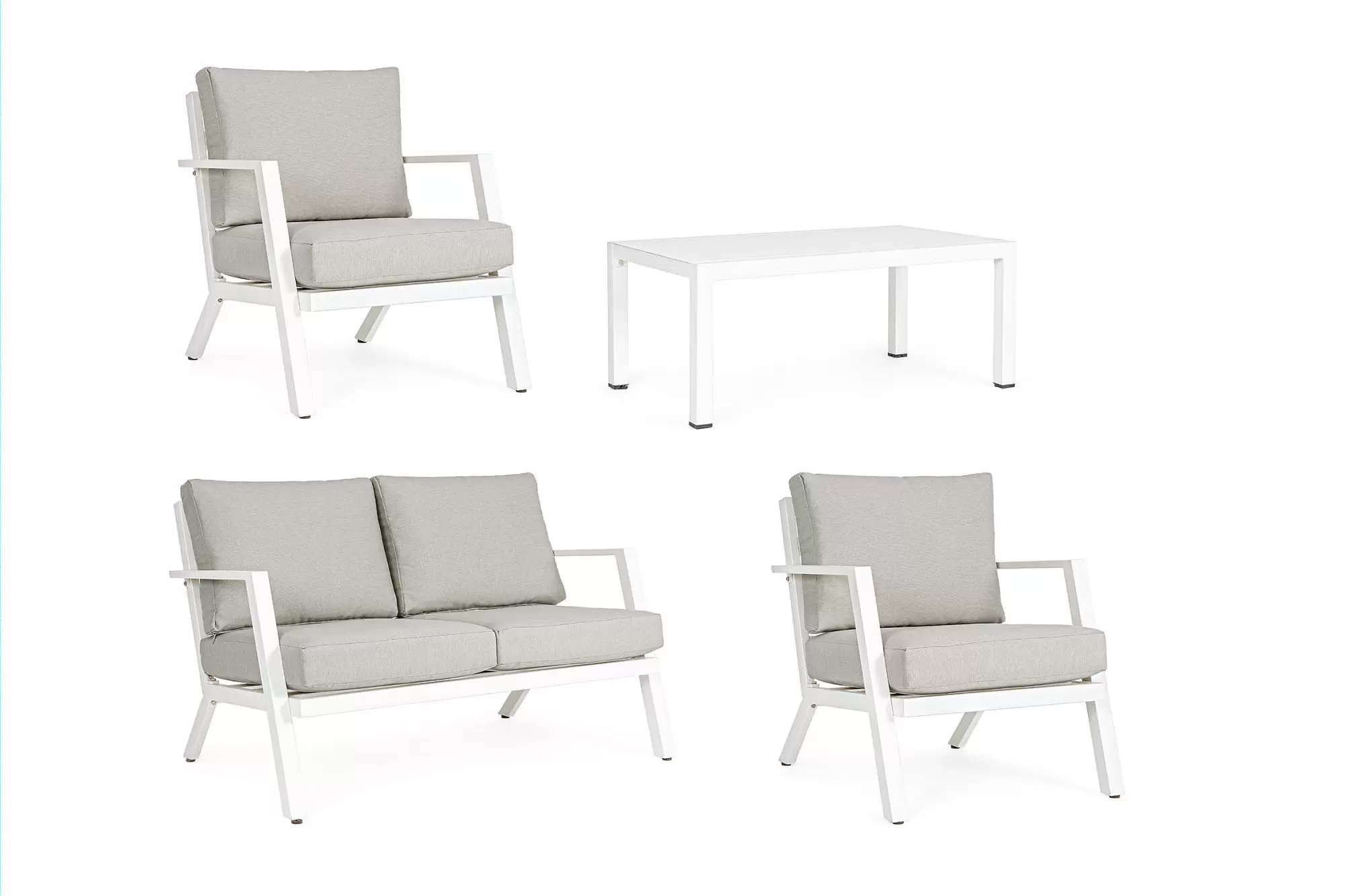 Konstrukcja aluminiowa malowana proszkowo na kolor ciemnoszary (poduszki jasnoszare), biały (p. szarobeżowe) lub kawowy (p. beżowe).