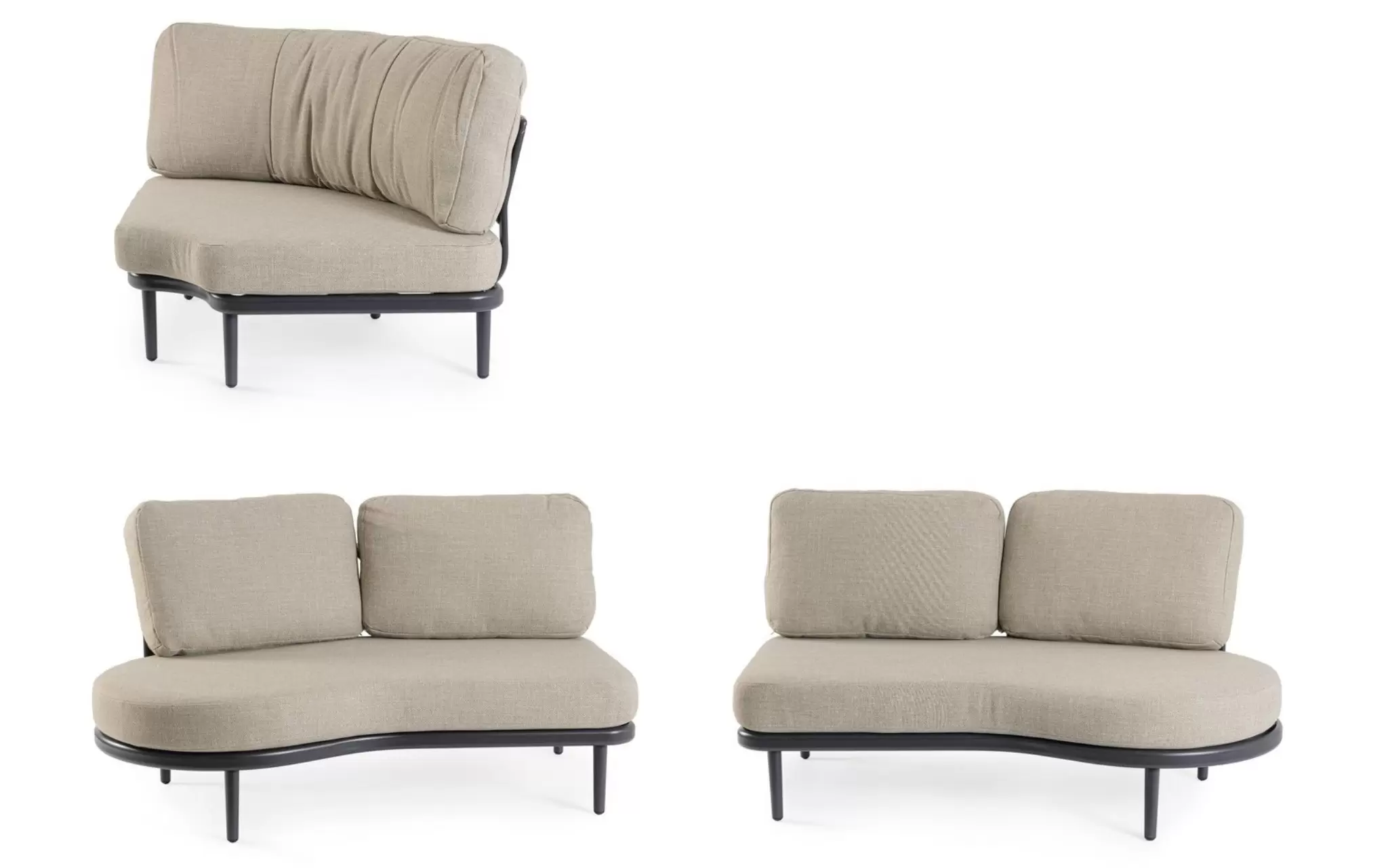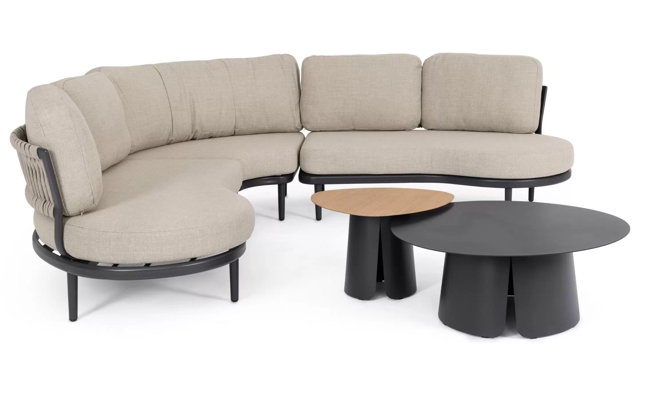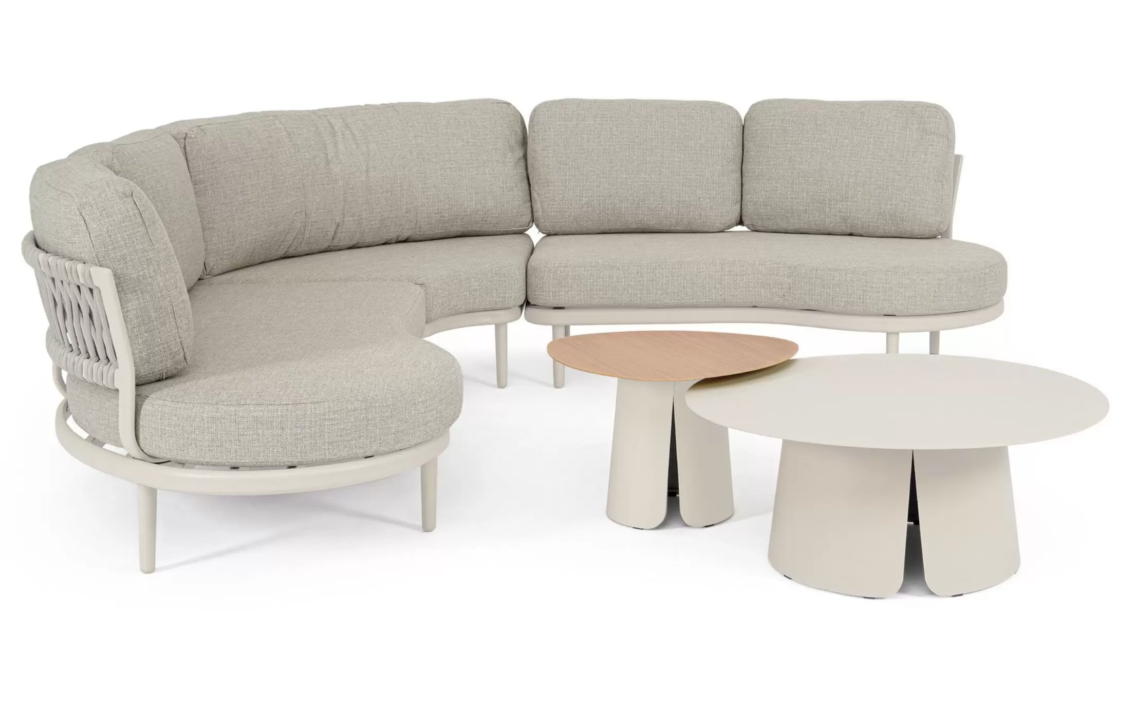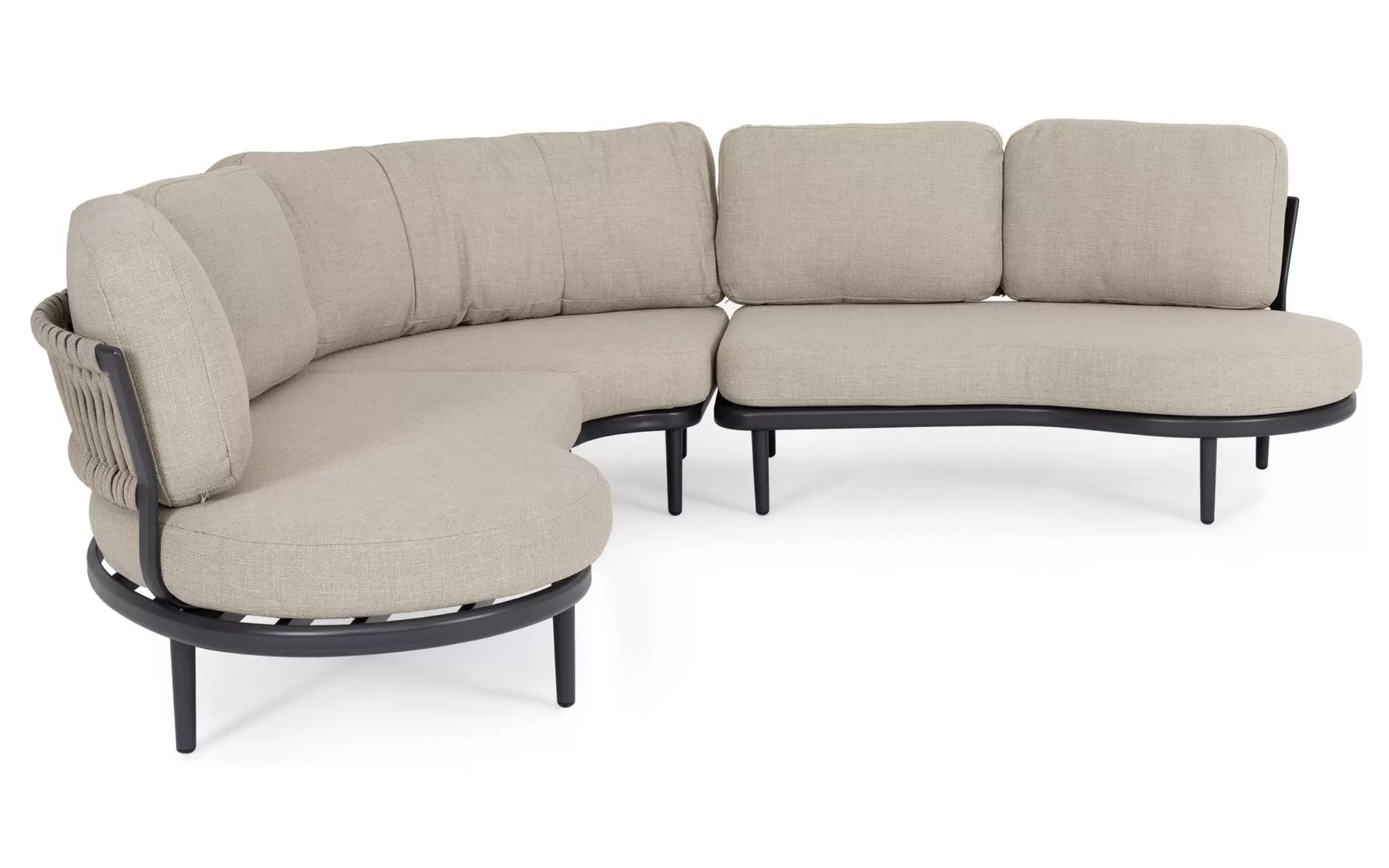 HELIOS to nowoczesny, modułowy zestaw ogrodowy o płynnych, półokrągłych liniach, który tworzy komfortową strefę wypoczynkową sprzyjającą relaksowi i rozmowom. Konstrukcja składa się z dwóch podwójnych modułów bocznych oraz jednego modułu narożnego, które po połączeniu tworzą elegancki narożnik o miękkiej, opływowej formie.