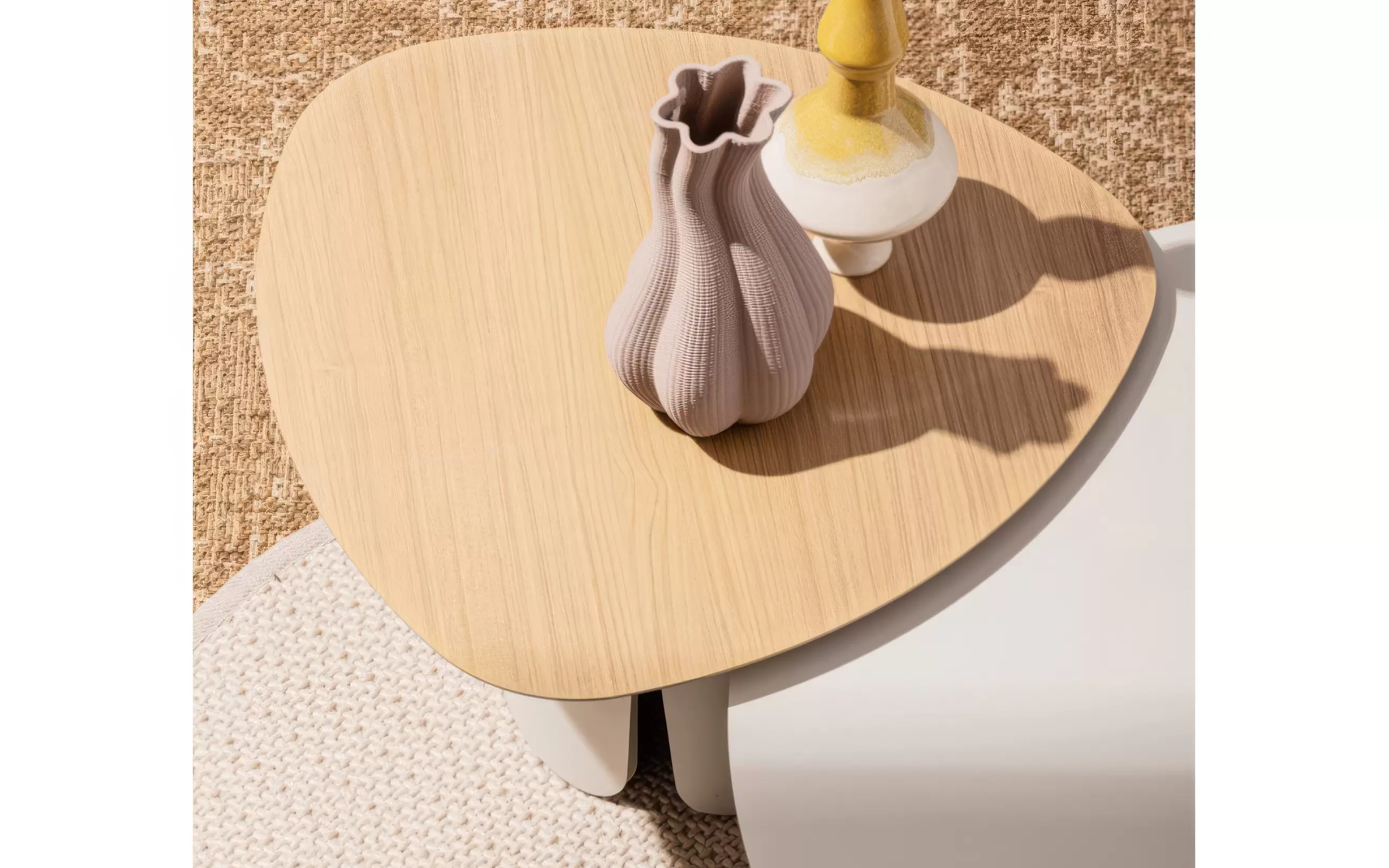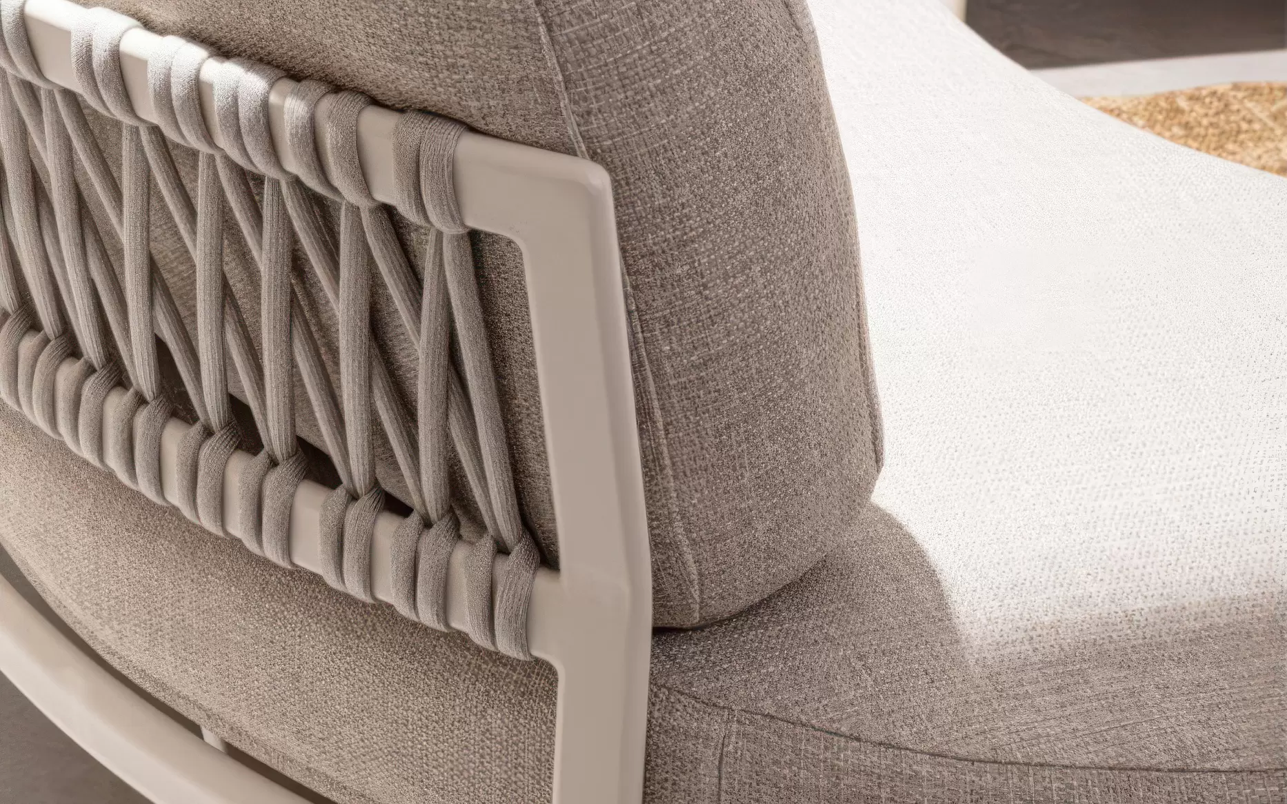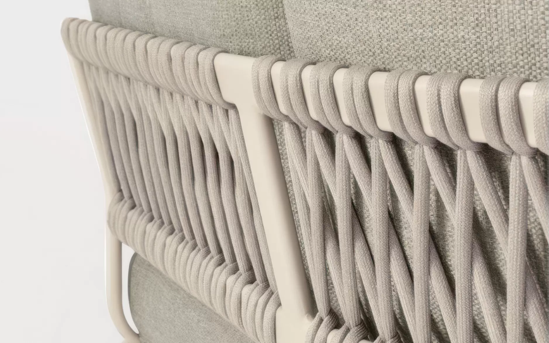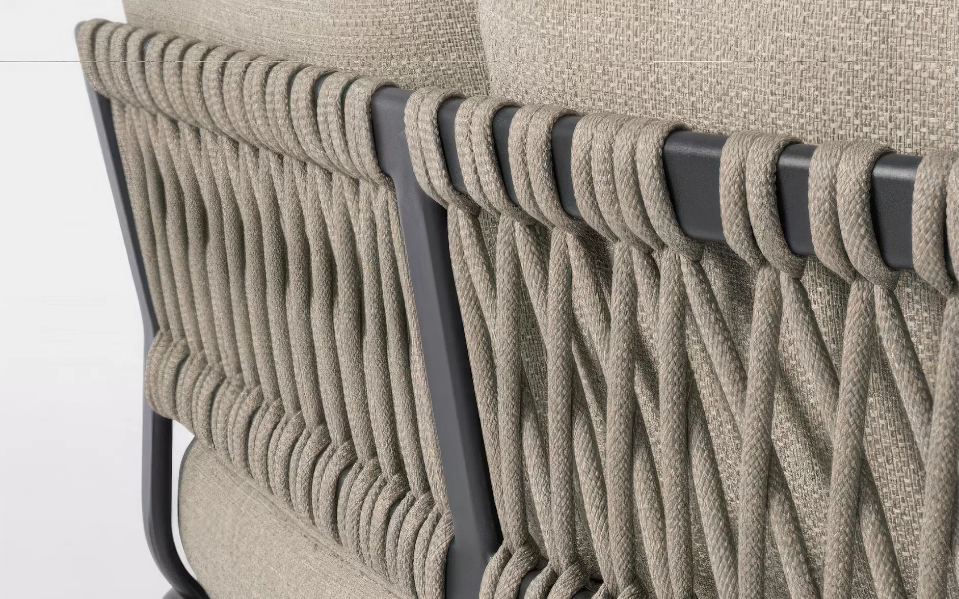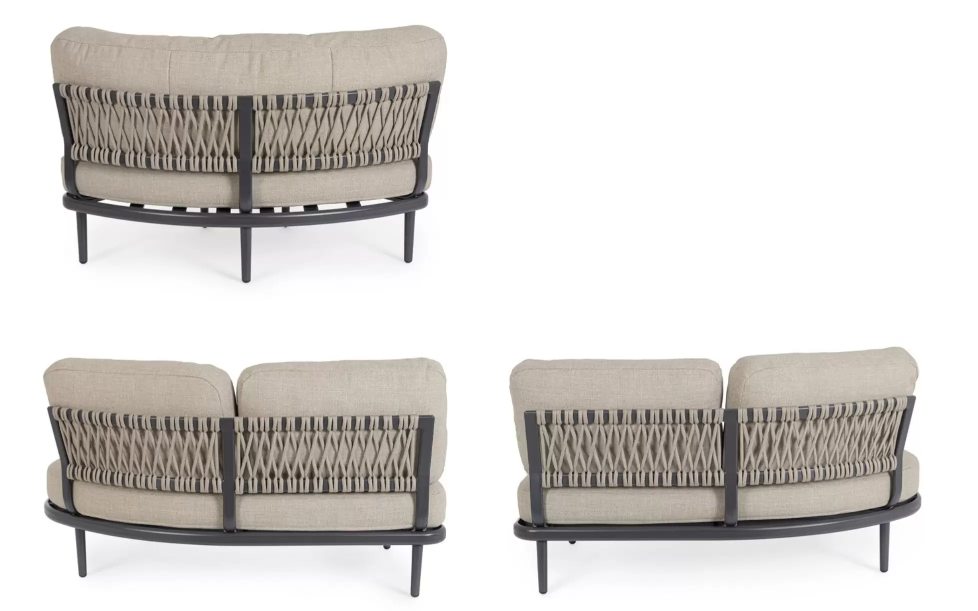 Stelaż wykonano z aluminium malowanego proszkowo, co zapewnia odporność na korozję i stabilność użytkową. Oparcia zdobi plecionka z liny syntetycznej, nadająca całości rzemieślniczego charakteru. W zestawie znajdują się również dwa stoliki o spójnej stylistyce, pełniące funkcję stolika kawowego i pomocniczego.