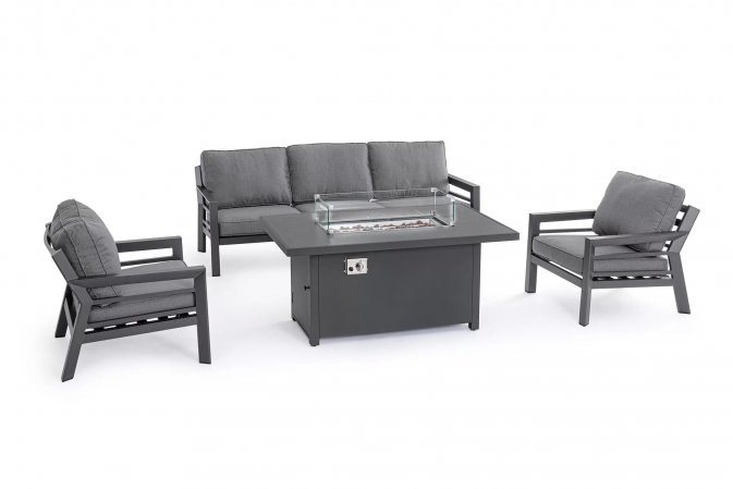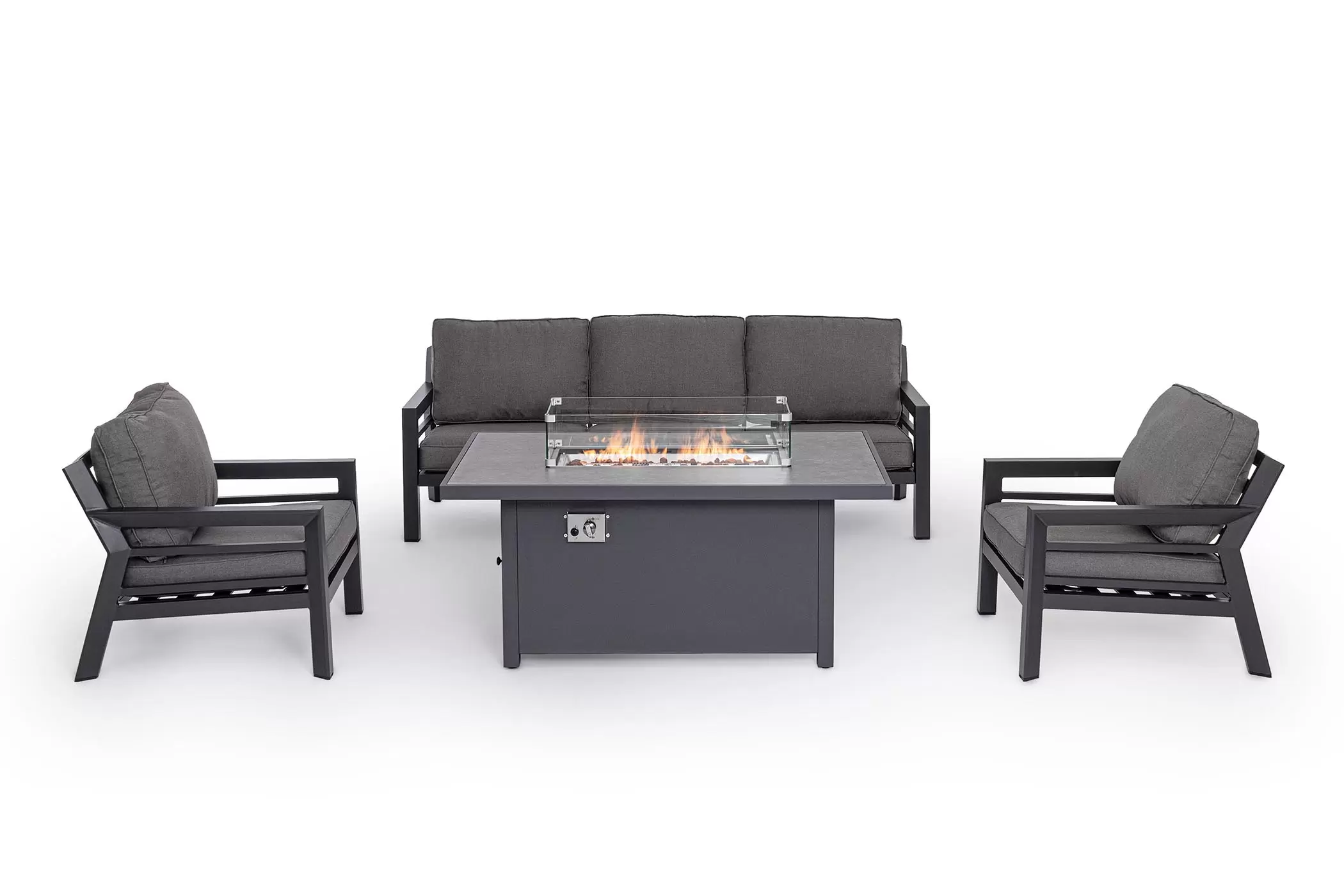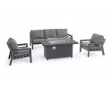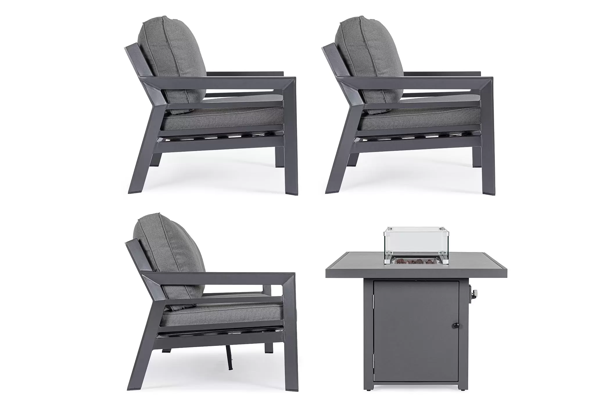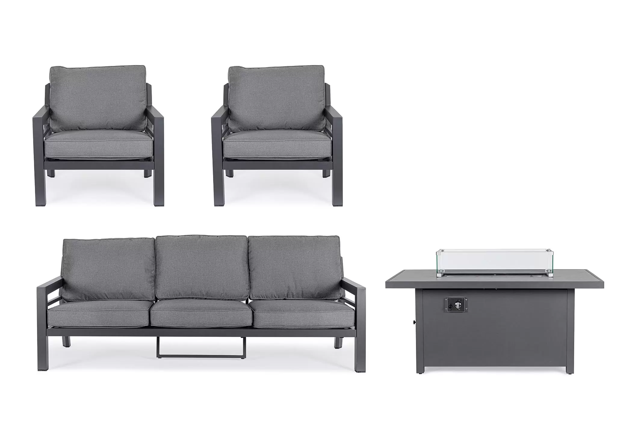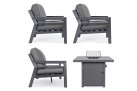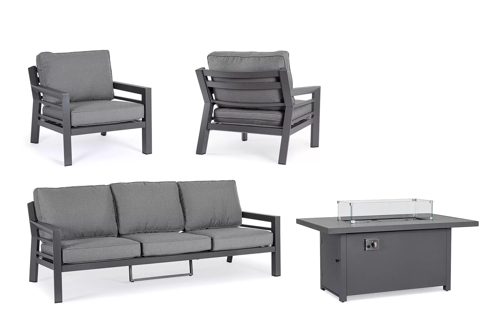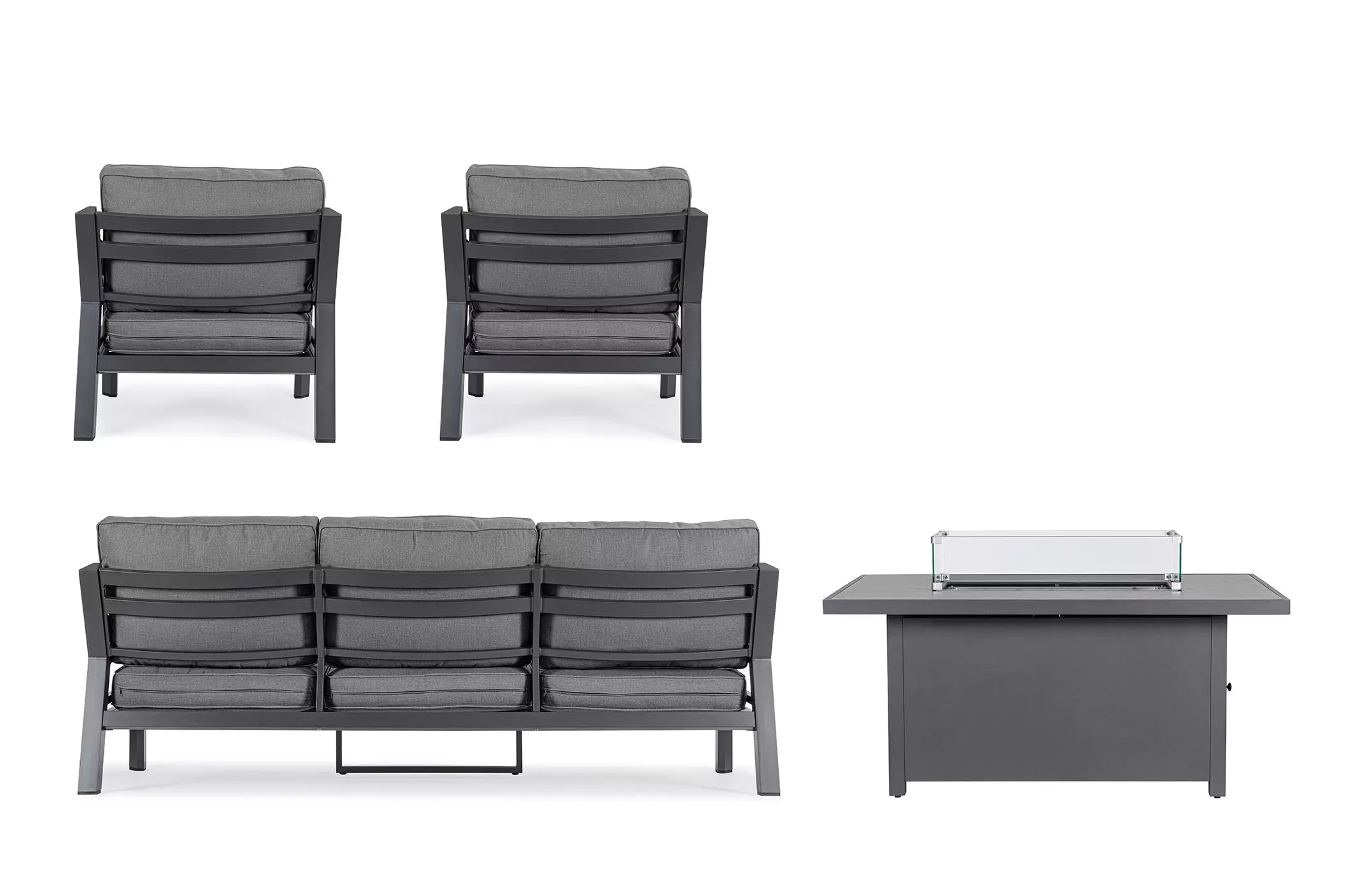 Nowoczesny zestaw wypoczynkowy ogrodowy, wykonany w całości z aluminium ze stolikiem wysokim z wbudowanym kominkiem gazowym z osłonami ze szkła hartowanego.