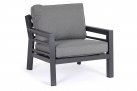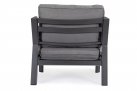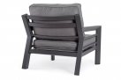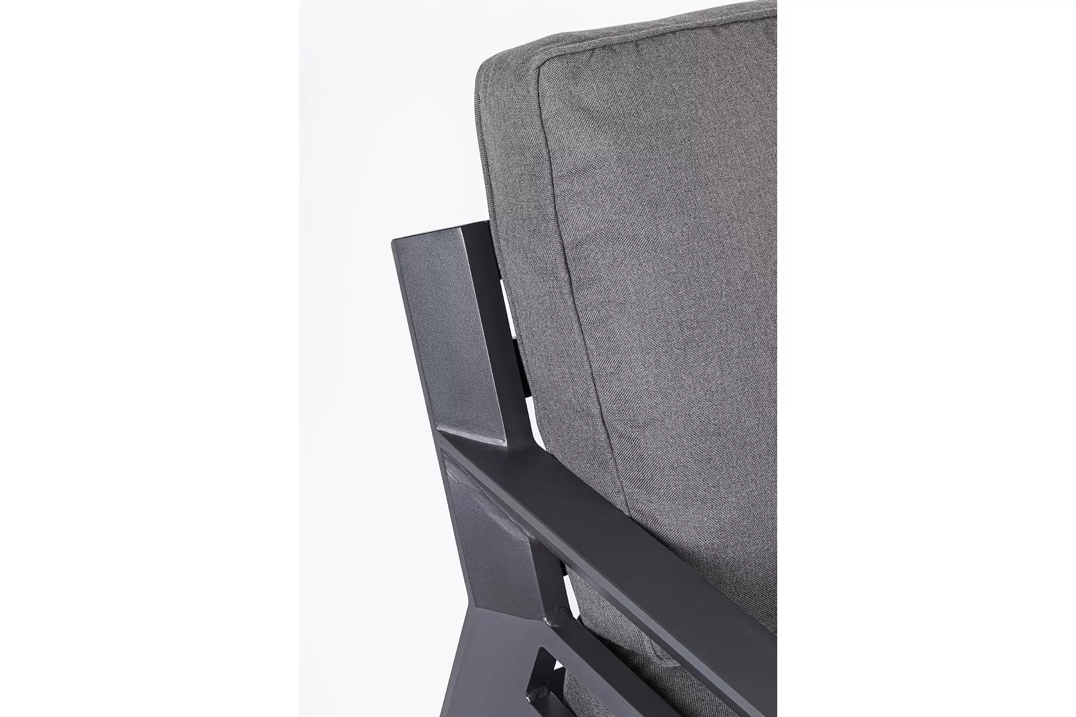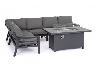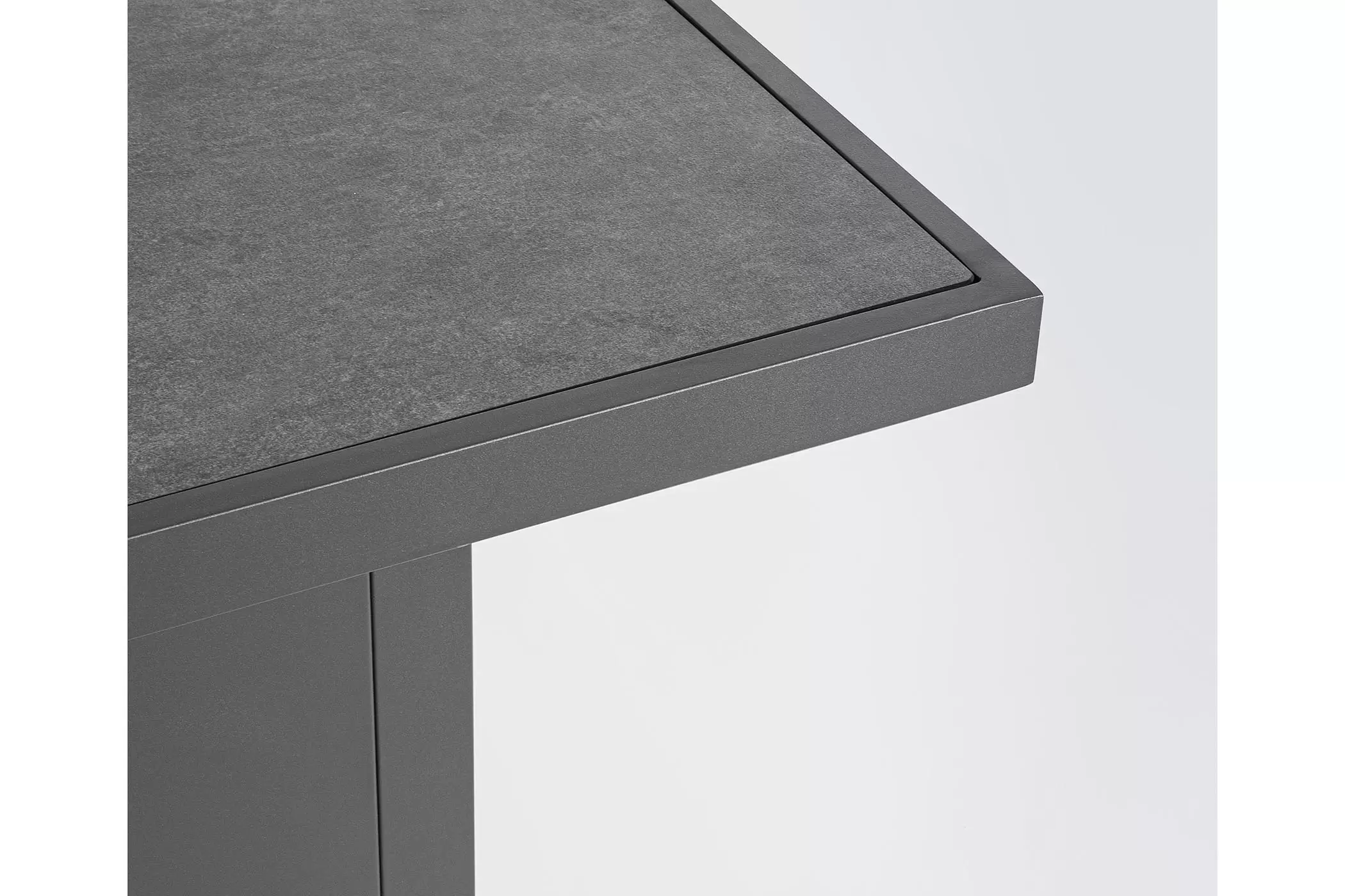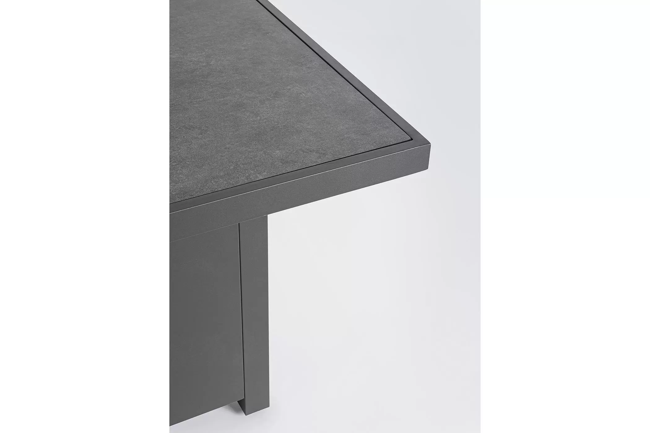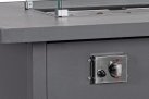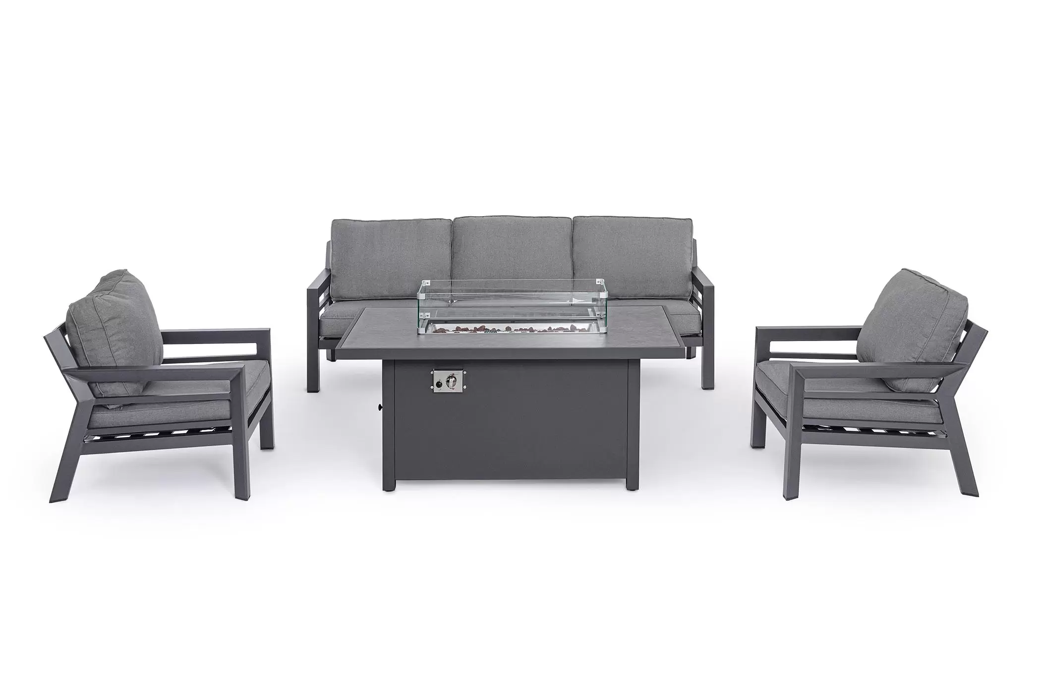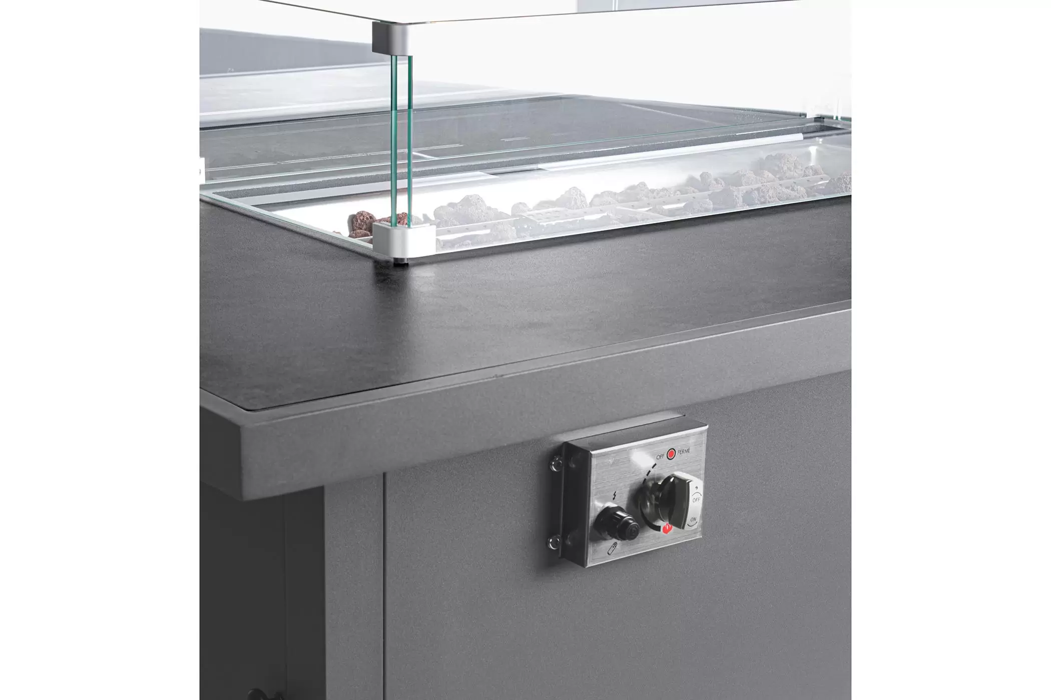 Nowoczesny zestaw wypoczynkowy ogrodowy, wykonany w całości z aluminium ze stolikiem wysokim z wbudowanym kominkiem gazowym z osłonami ze szkła hartowanego.