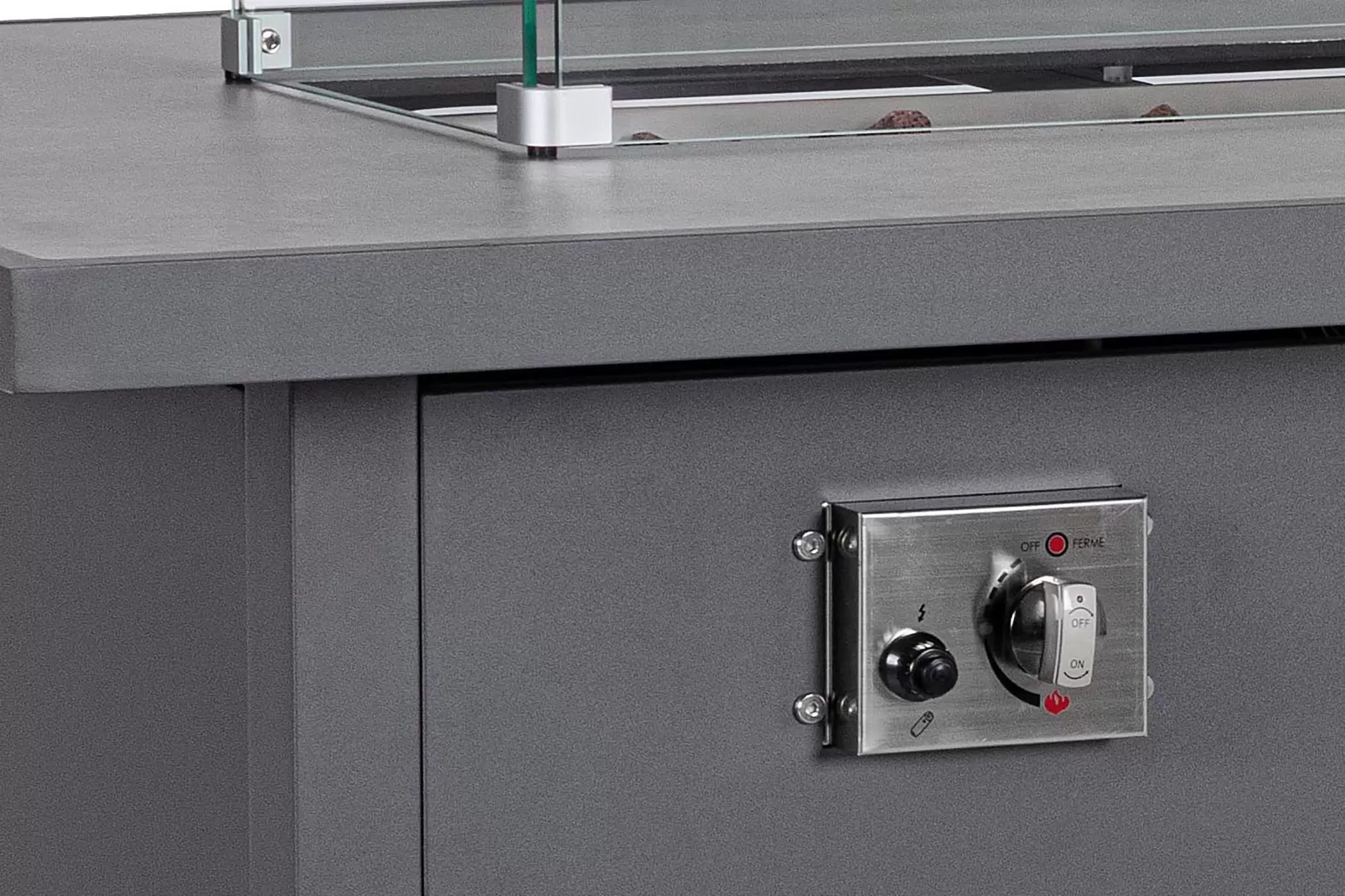 Atrakcją tego zestawu jest wysoki stolik z wbudowanym kominkiem gazowym umożliwiającym wypoczynek na tarasie w chłodniejsze wieczory.