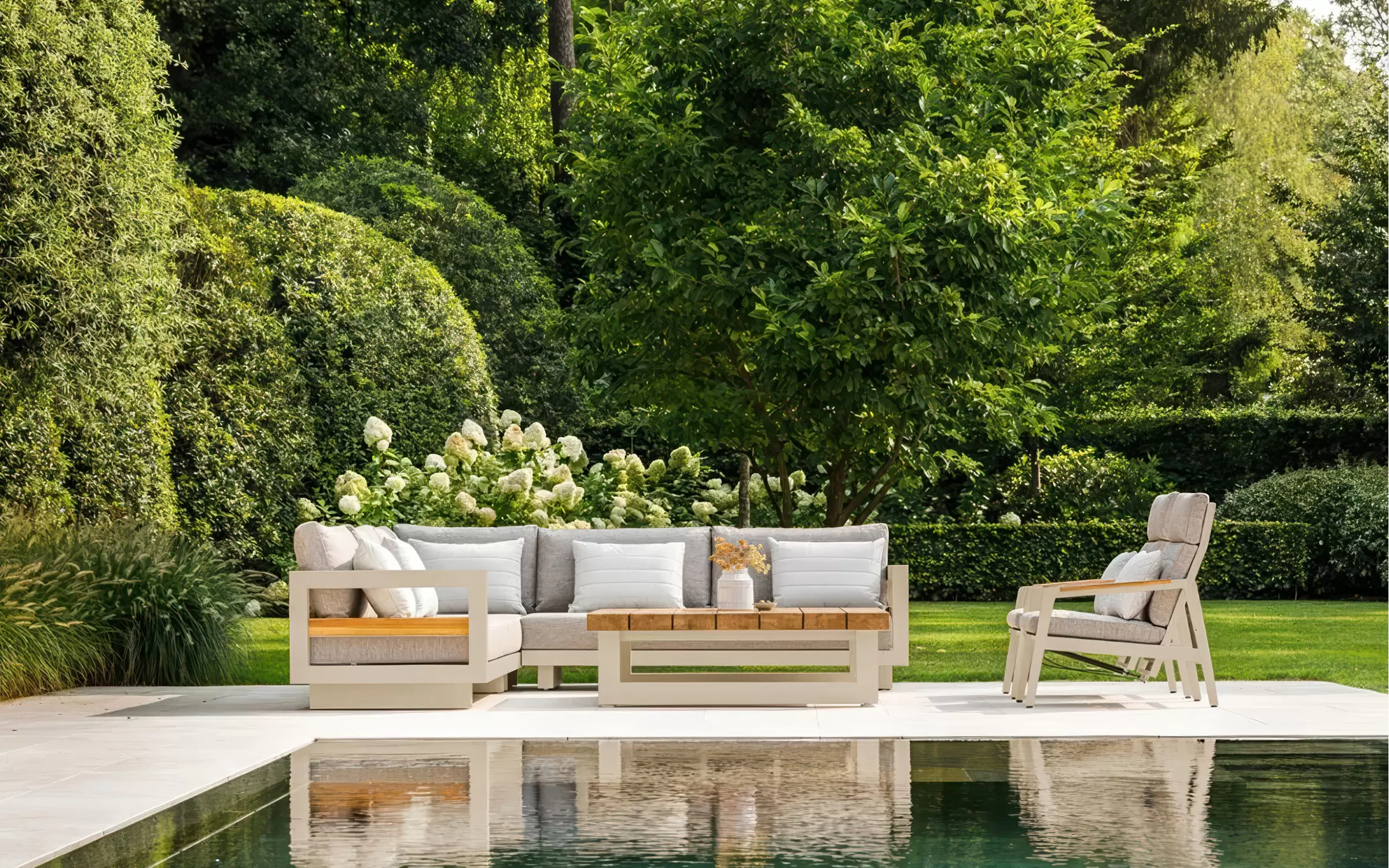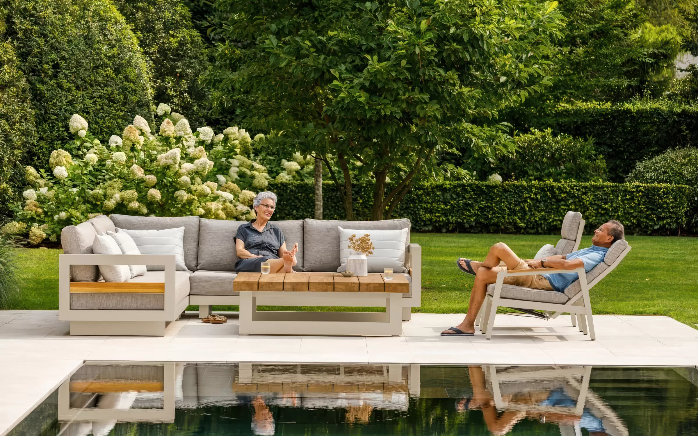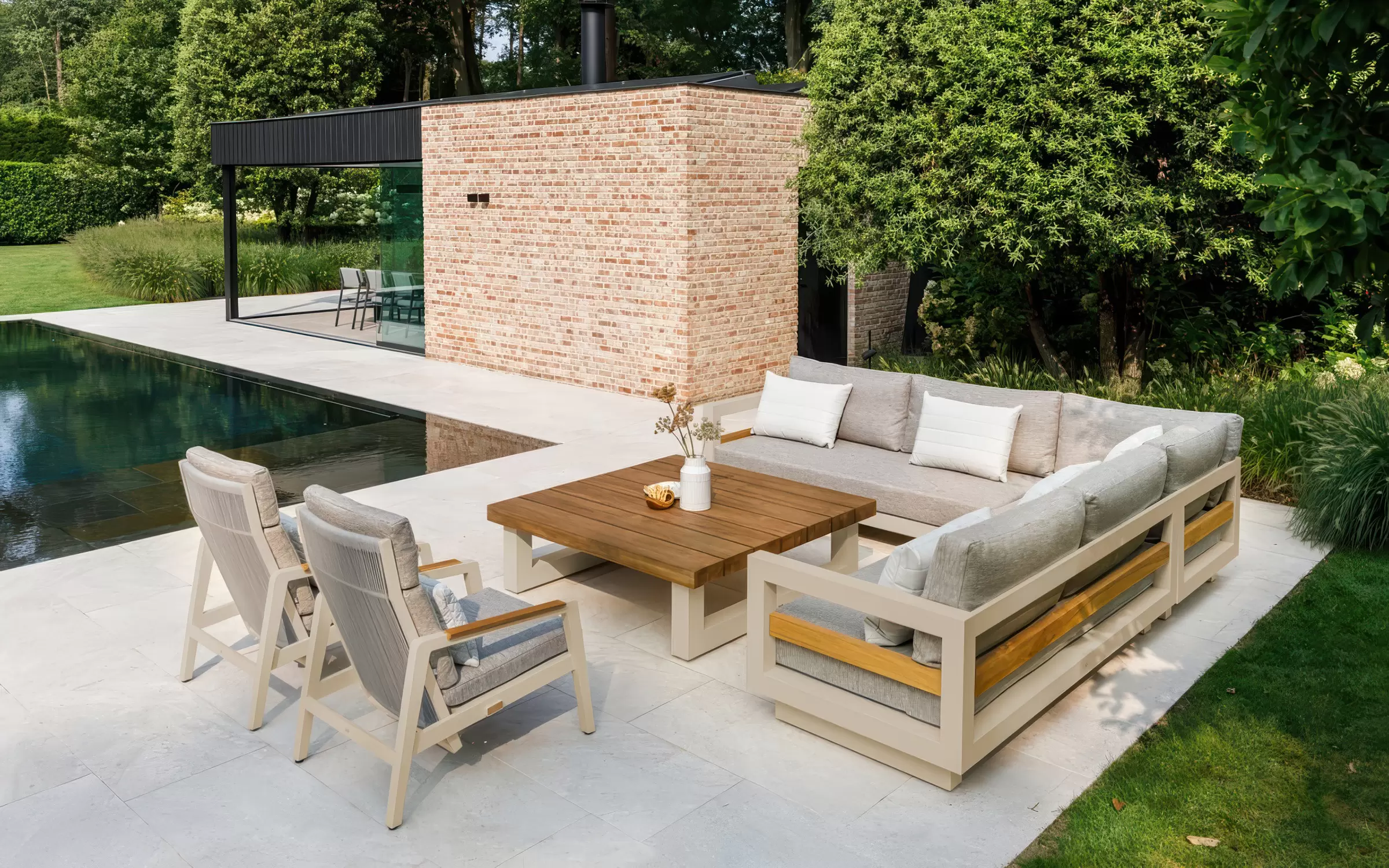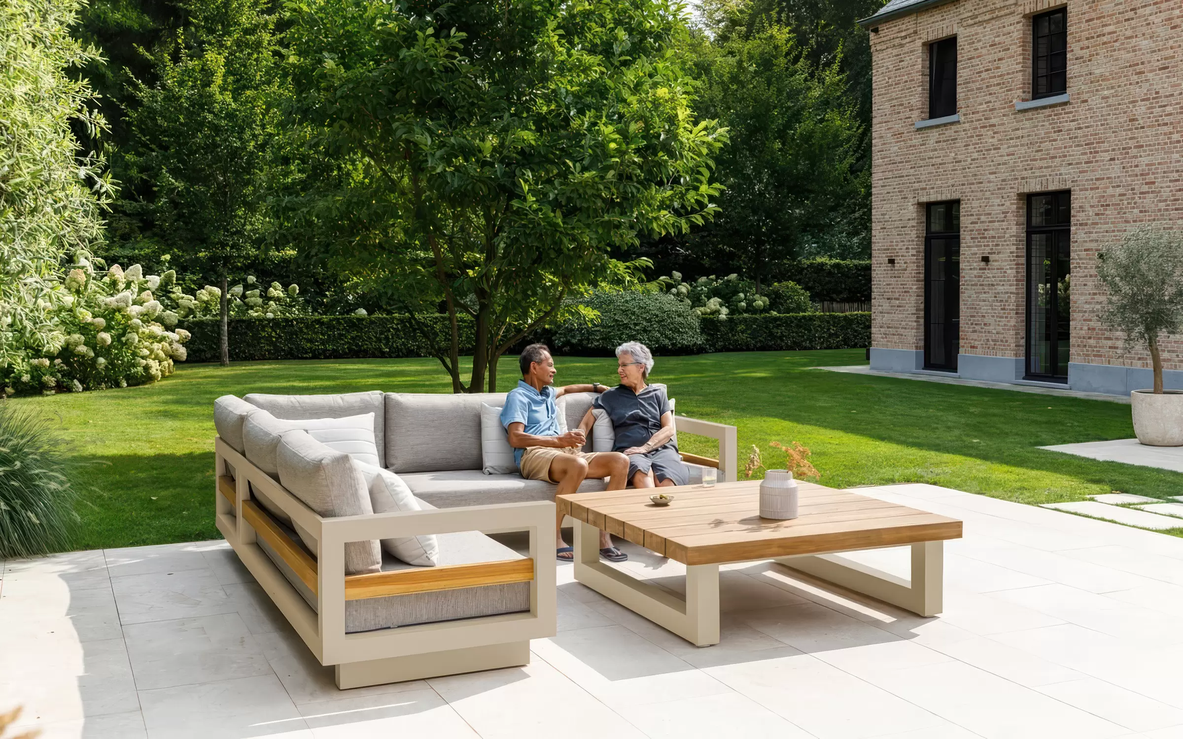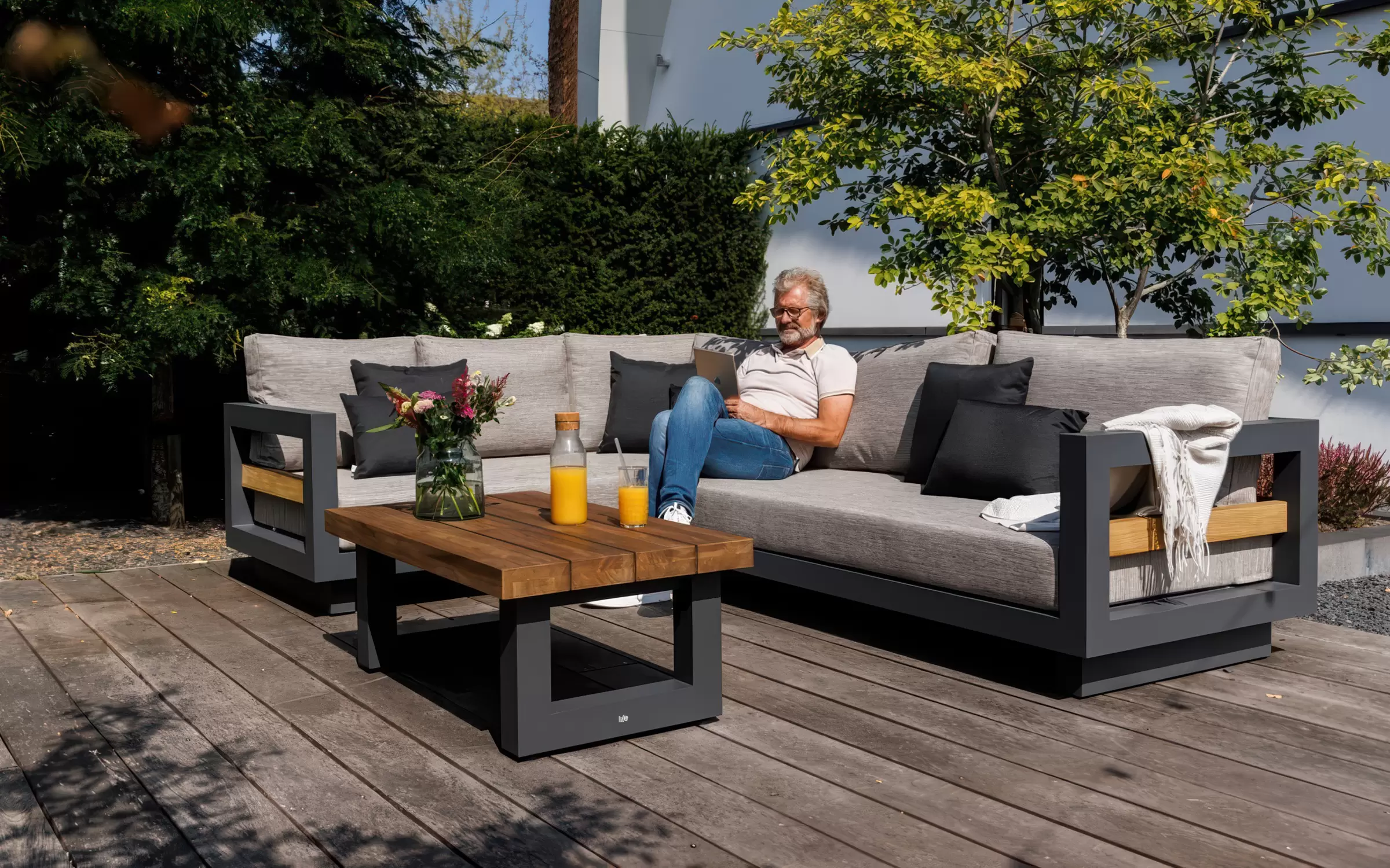 Fundamentem zestawu jest solidna, a przy tym niezwykle lekka rama. To właśnie dzięki niej nasze aluminiowe meble wypoczynkowe na taras są tak cenione za całkowitą odporność na rdzę i łatwość w reorganizacji przestrzeni. Nowoczesność metalu została tu zestawiona z wstawkami z naturalnego drewna tekowego, co nadaje całości szlachetnego wyglądu i wizualnego ciepła. Praktycznym dopełnieniem zestawu jest dopasowany stolik kawowy, tworzący spójną i funkcjonalną całość.