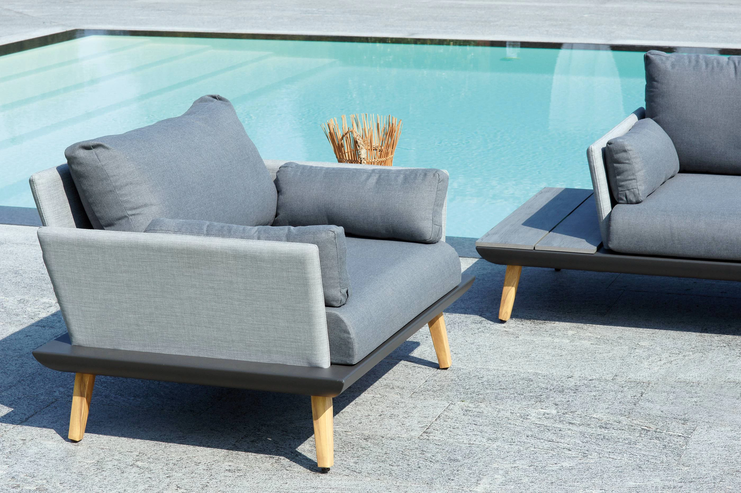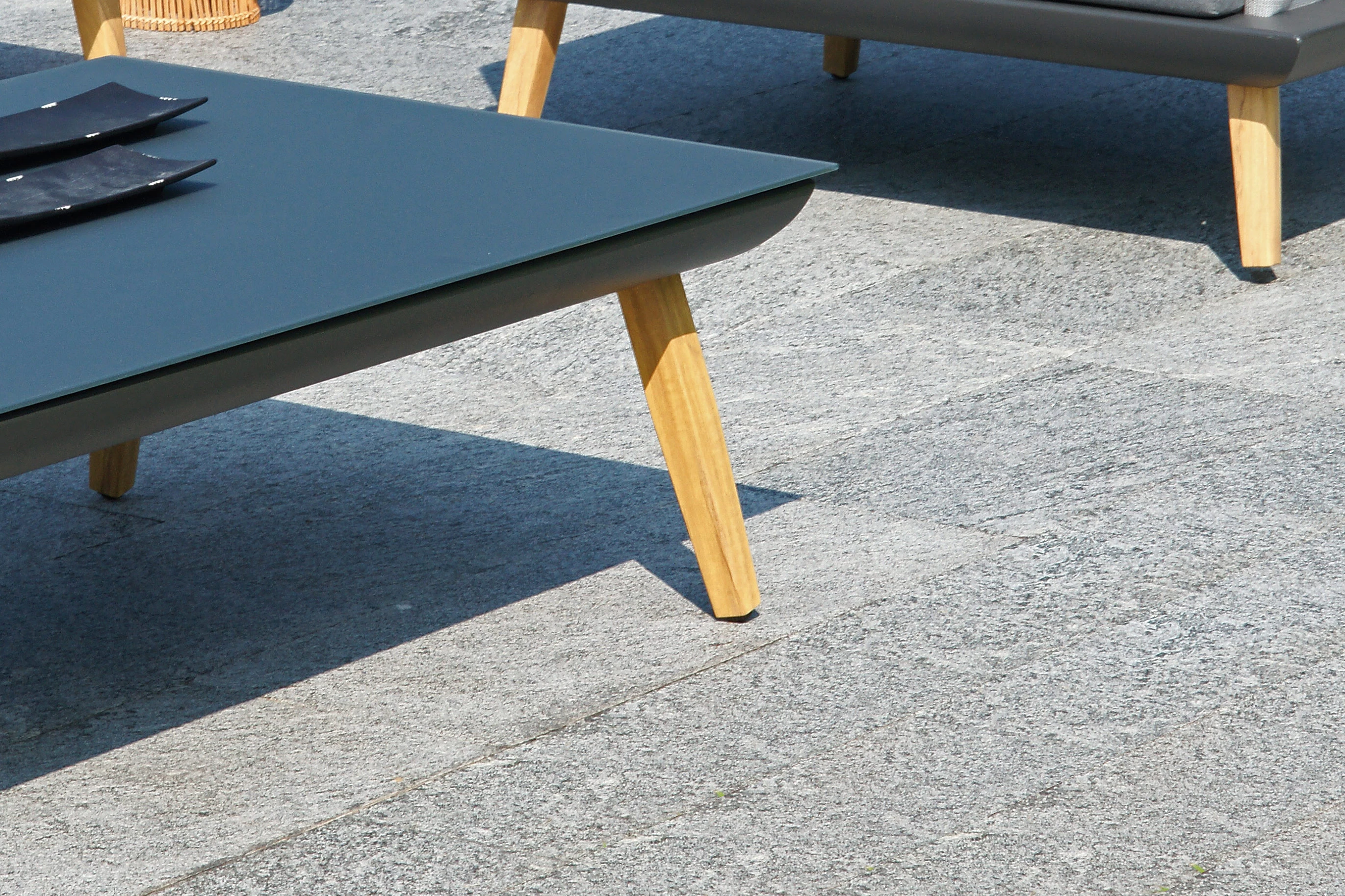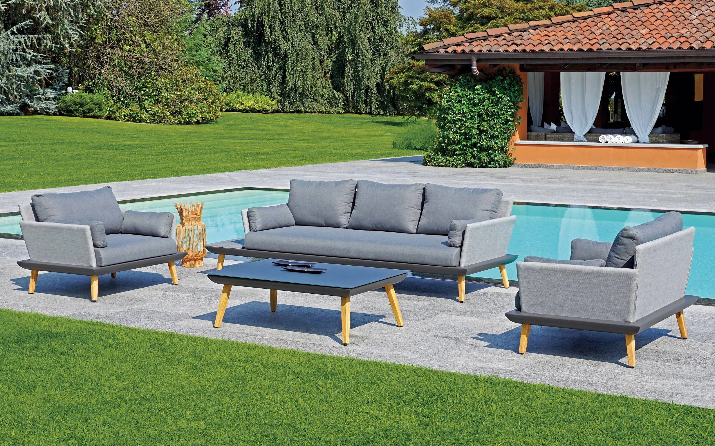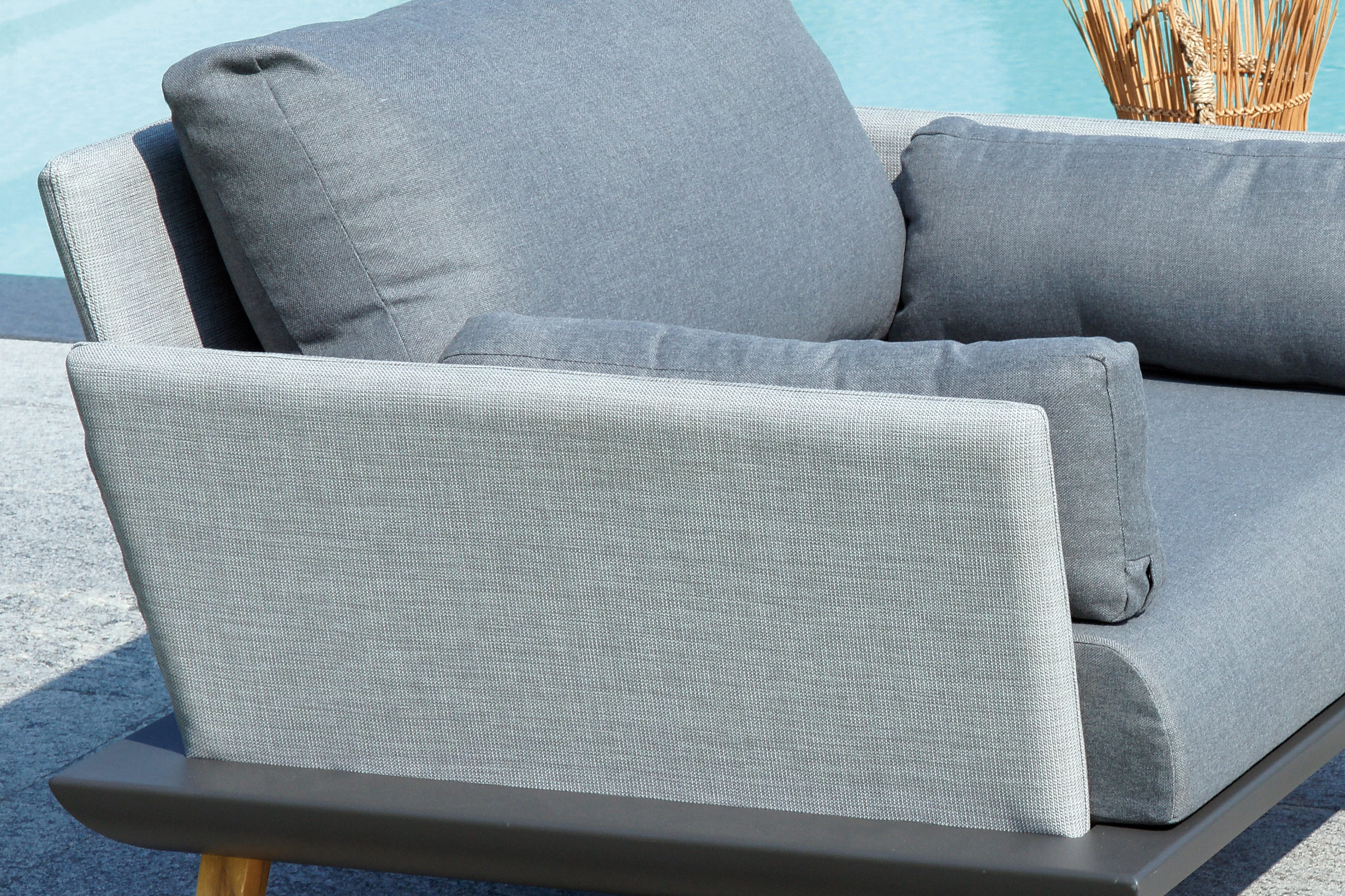 Konstrukcja z aluminium malowanego proszkowo w kolorze antracytowym. Nogi z powłoką sublimacyjną z efektem drewna. Blat stolika kawowego ze szkła hartowanego matowego. Poduszki zdejmowane z poliestru w kolorze szarym.