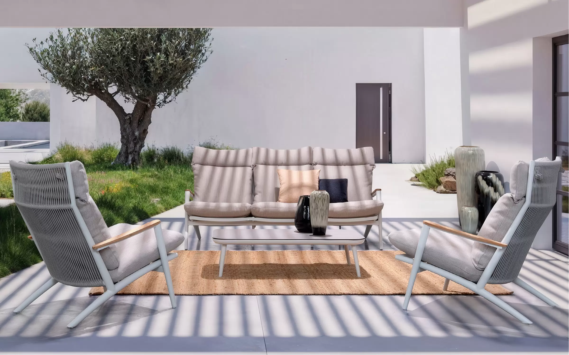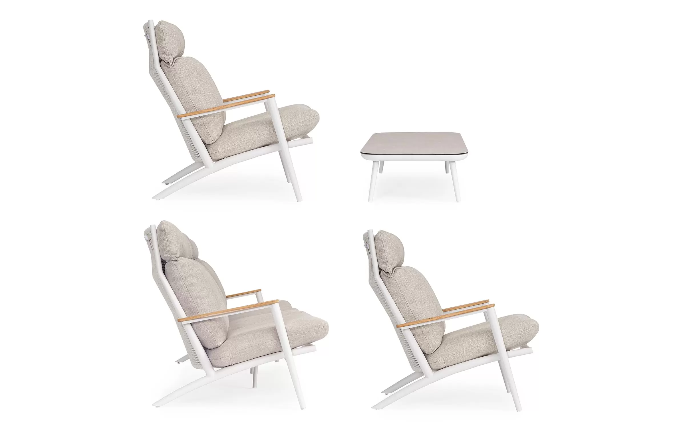 Meble ogrodowe aluminiowe z wysokimi oparciami. Ozdobnie wyplatane oparcia z liny polipropylenowej oraz teakowe wstawki na podłokietnikach uzupełniają niecodzienny design tego wygodnego modelu.