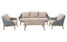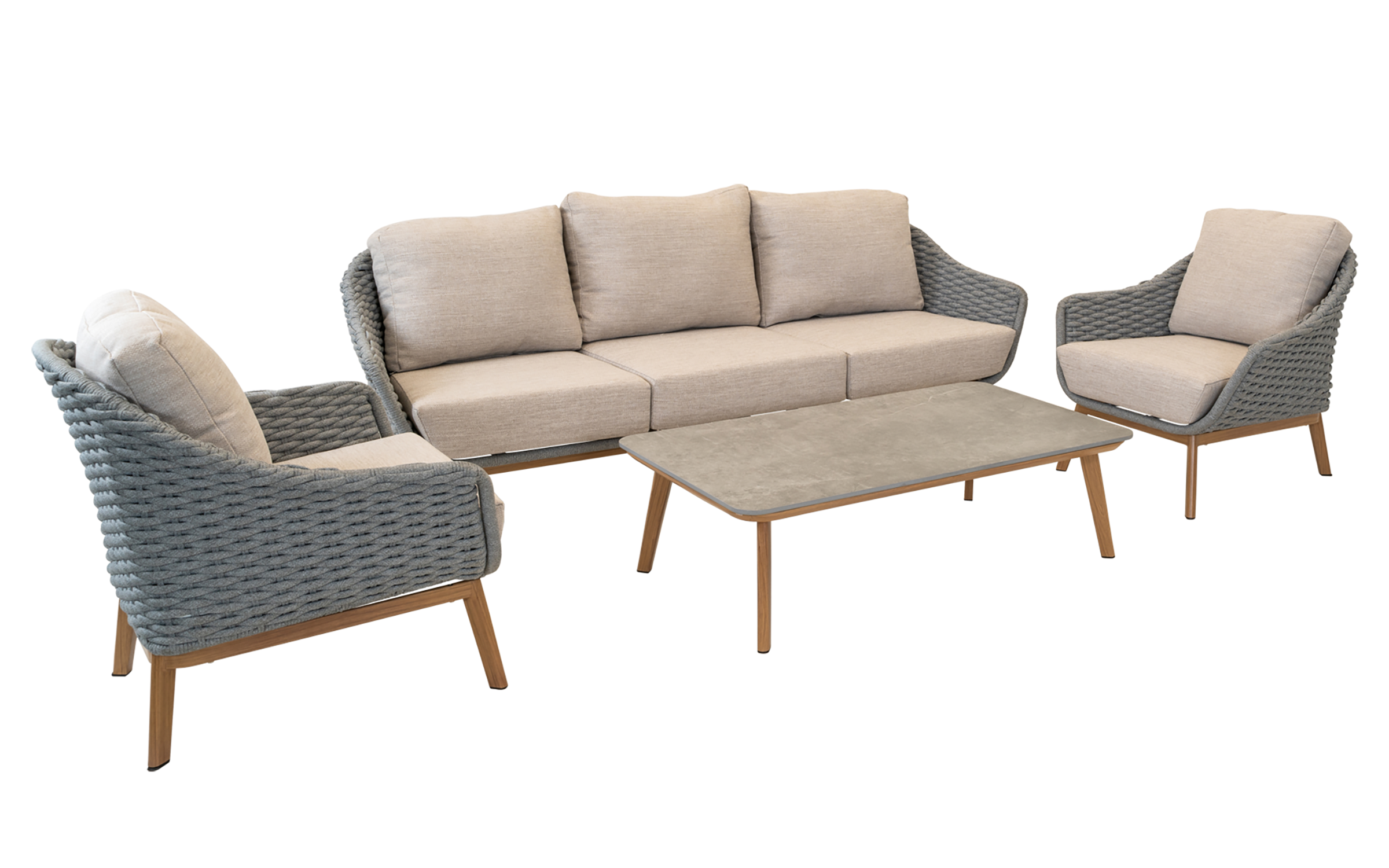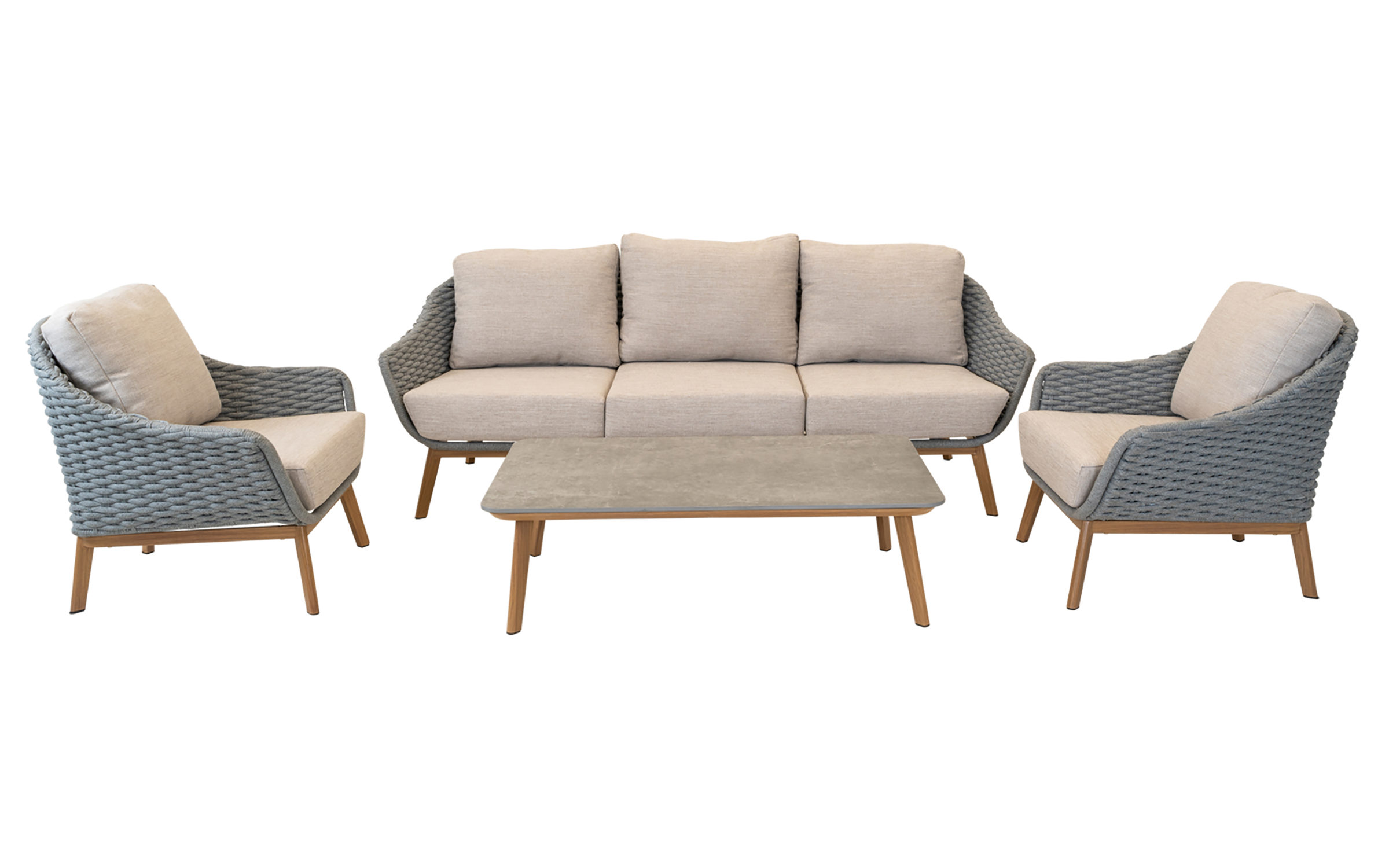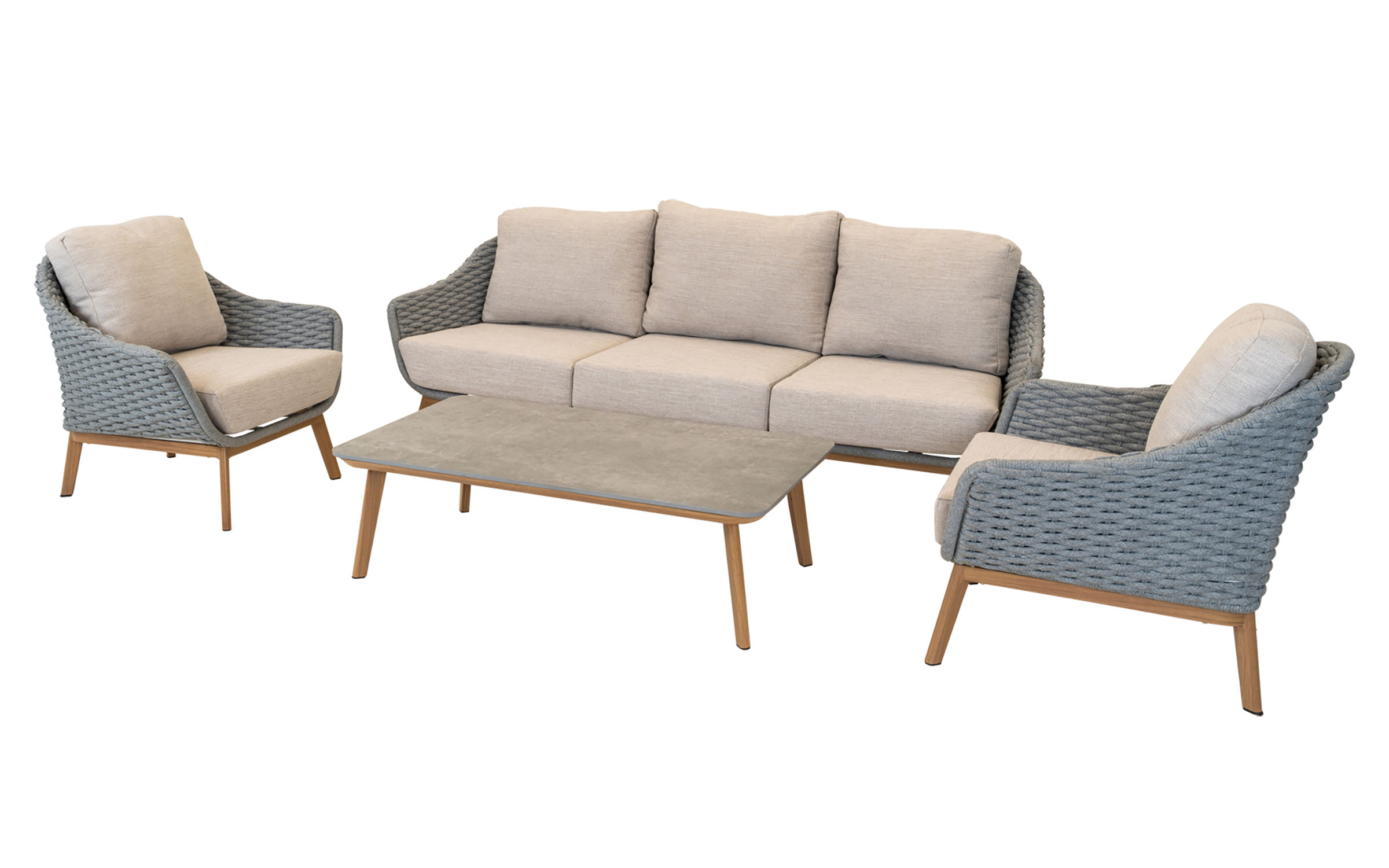 Zestaw lounge IBIZA marki Lesli Living łączy naturalny wygląd z wysoką trwałością. W komplecie: sofa 2‑osobowa, dwa fotele oraz stolik kawowy. Konstrukcja wykonana z aluminium w wykończeniu woodlook zapewnia odporność na warunki atmosferyczne przy jednoczesnym, ciepłym charakterze. Boki i oparcia są oplecione liną polipropylenową, która dodaje lekkości, poprawia wentylację i komfort siedzenia. Blat stolika z sintered stone jest wytrzymały, łatwy w pielęgnacji i odporny na zarysowania. Poduszki z tkaniny Olefin 370 g/m² w kolorze jasnoszarym (lichtgrau meliert) są odporne na wilgoć, UV i zabrudzenia.