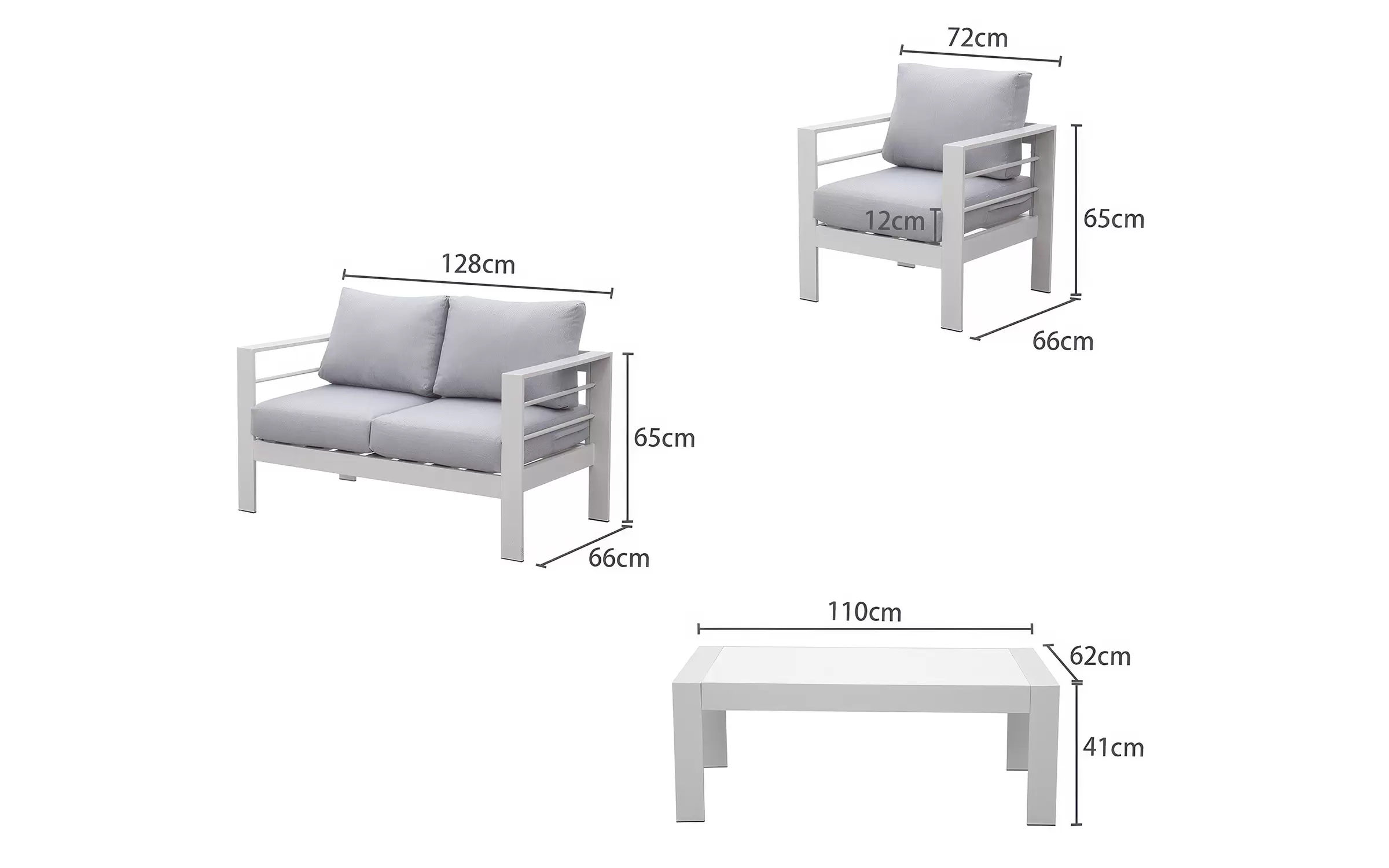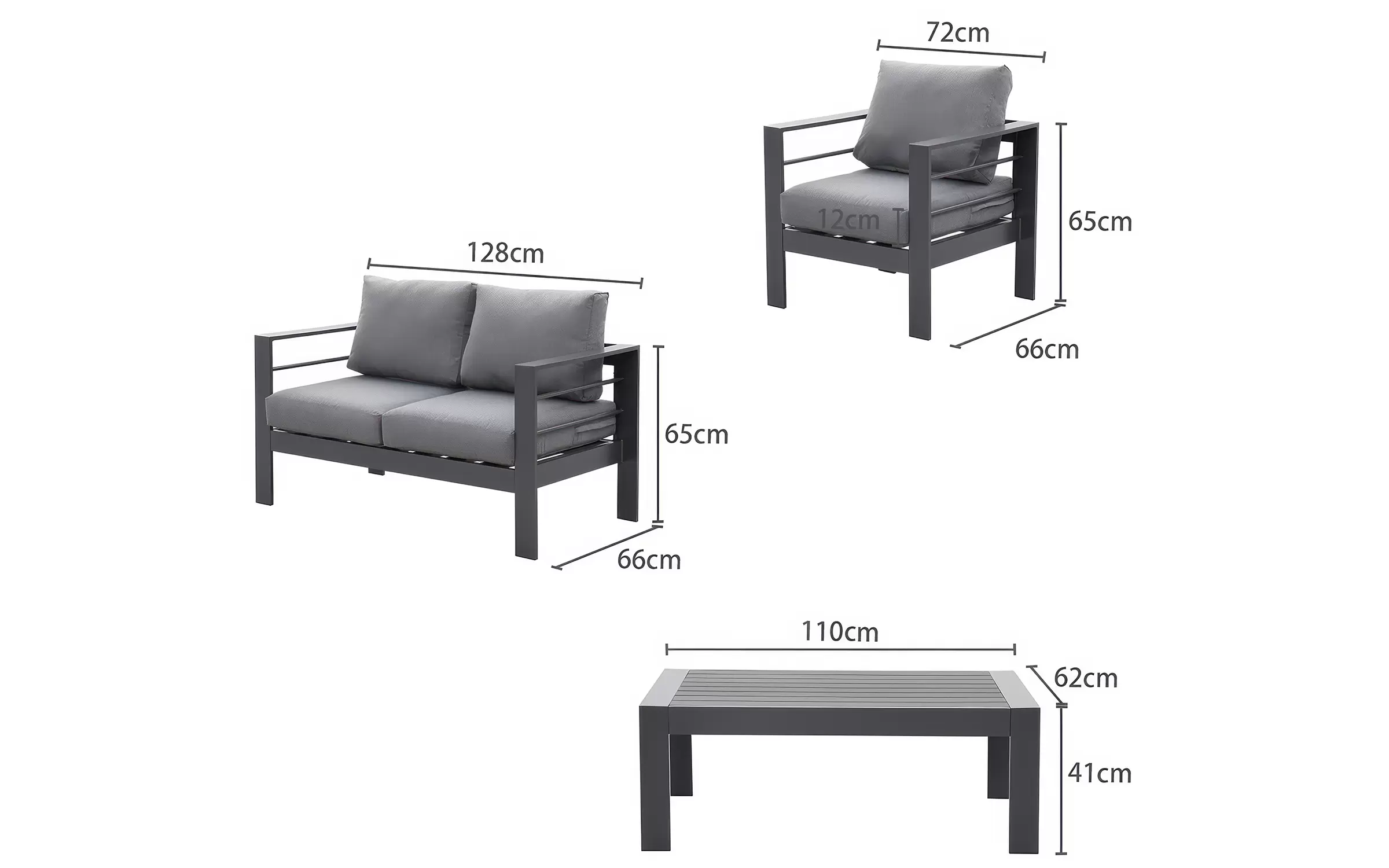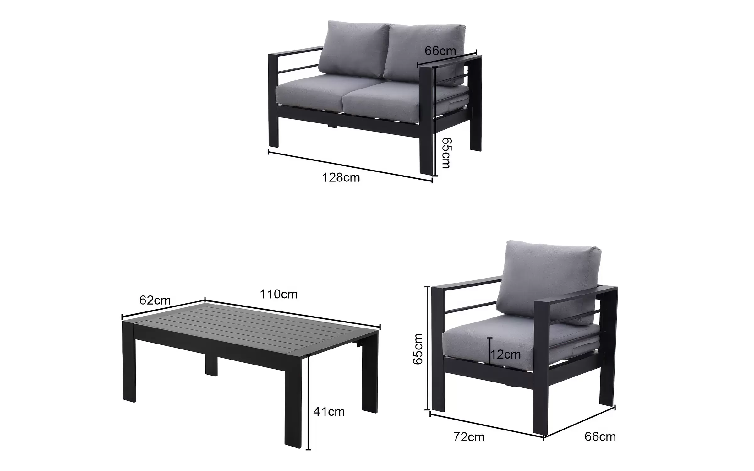 Szerokość 128 cm / Głębokość 66 cm / Wysokość 65 cm (ok. 78 cm z poduszką na oparciu)