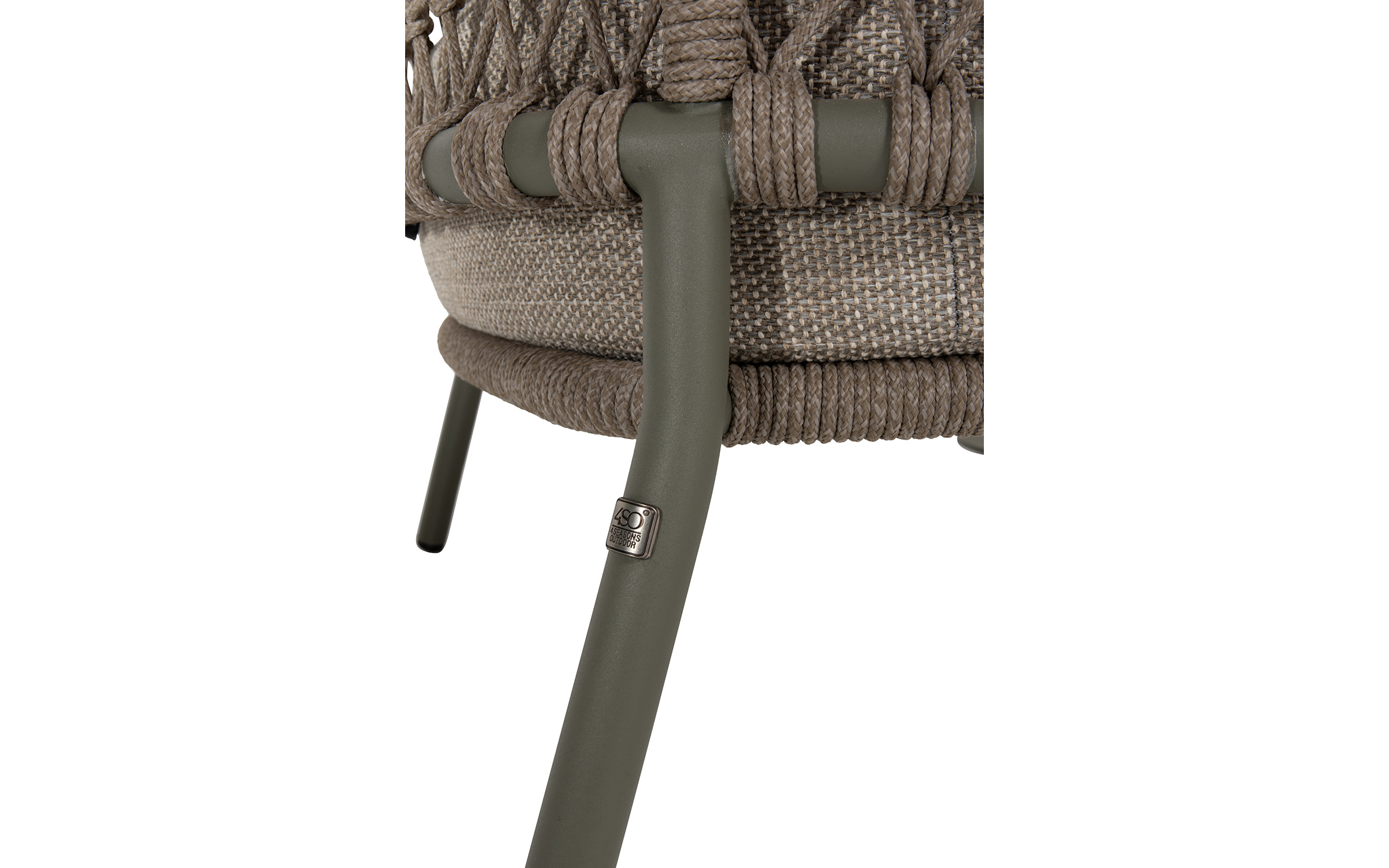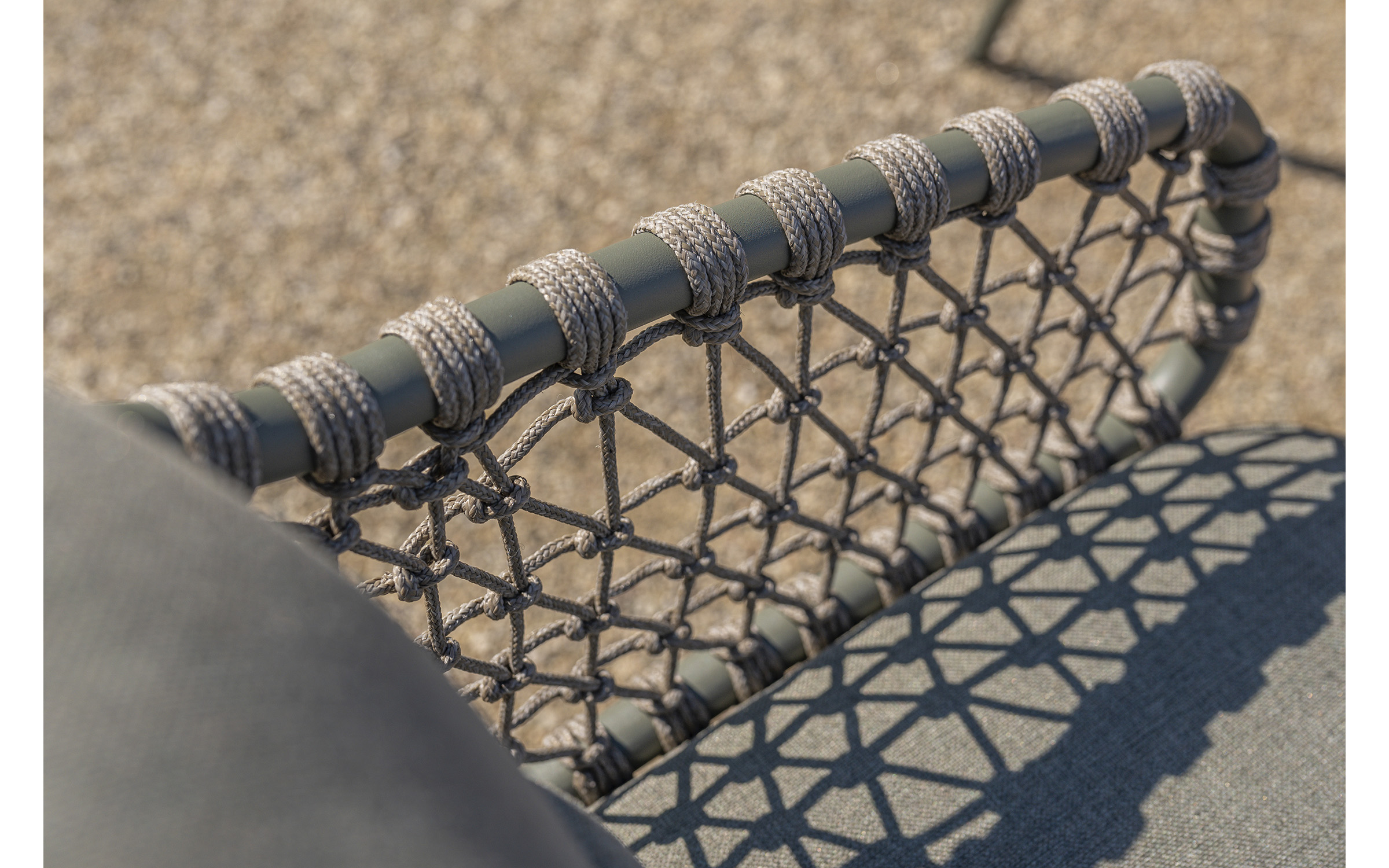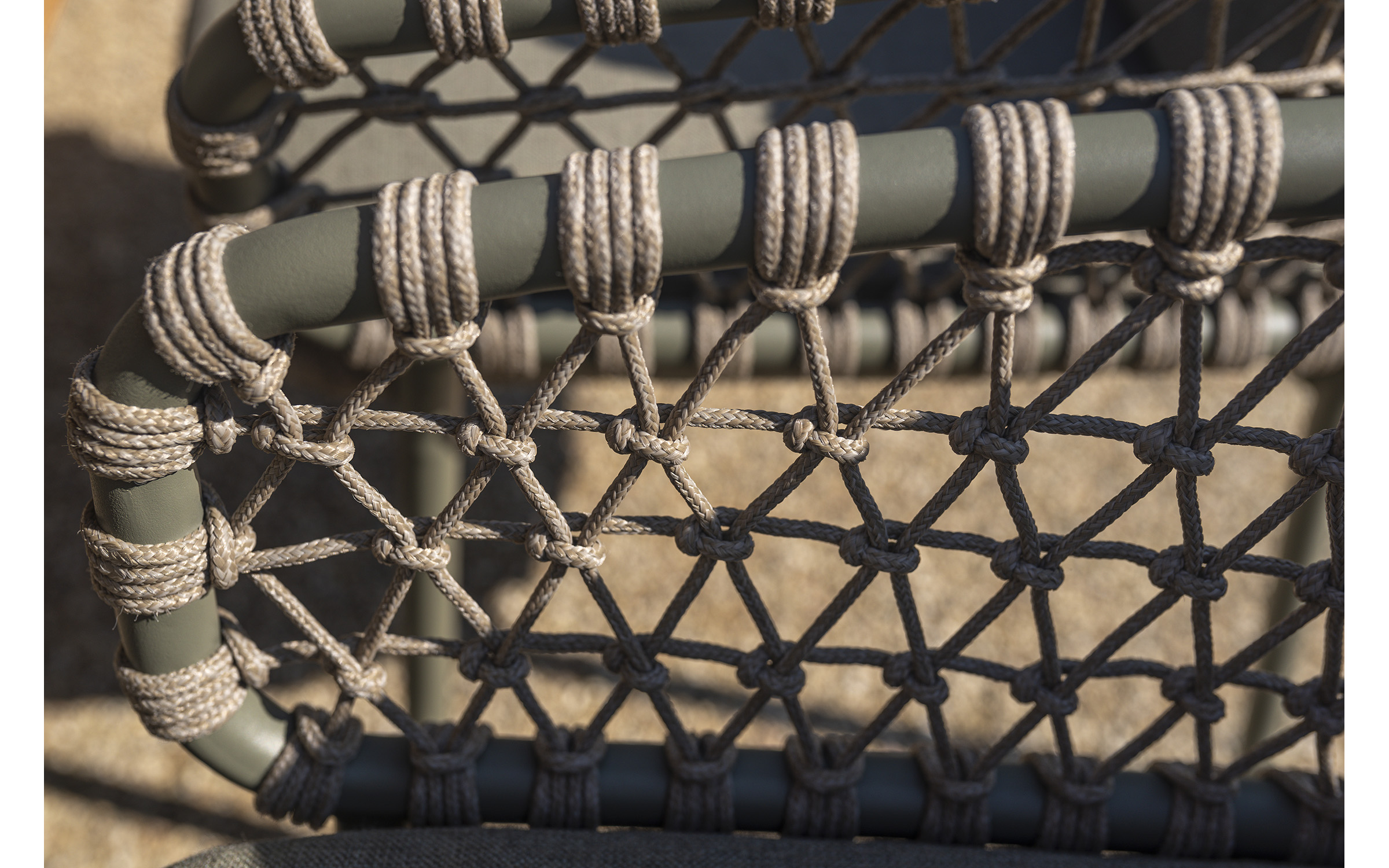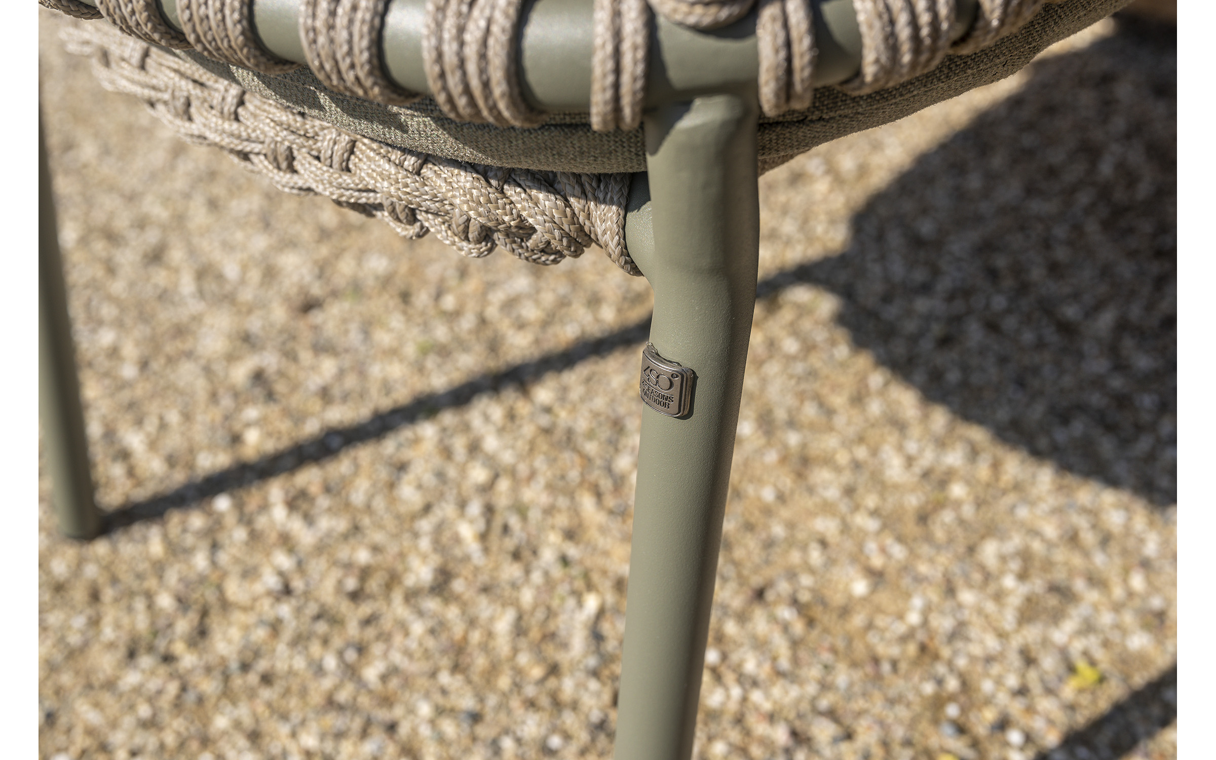 Konstrukcja wykonana jest z wysokiej jakości, malowanej proszkowo stali nierdzewnej, a plecionka z liny polipropylenowej nadają zestawowi unikalny wygląd.