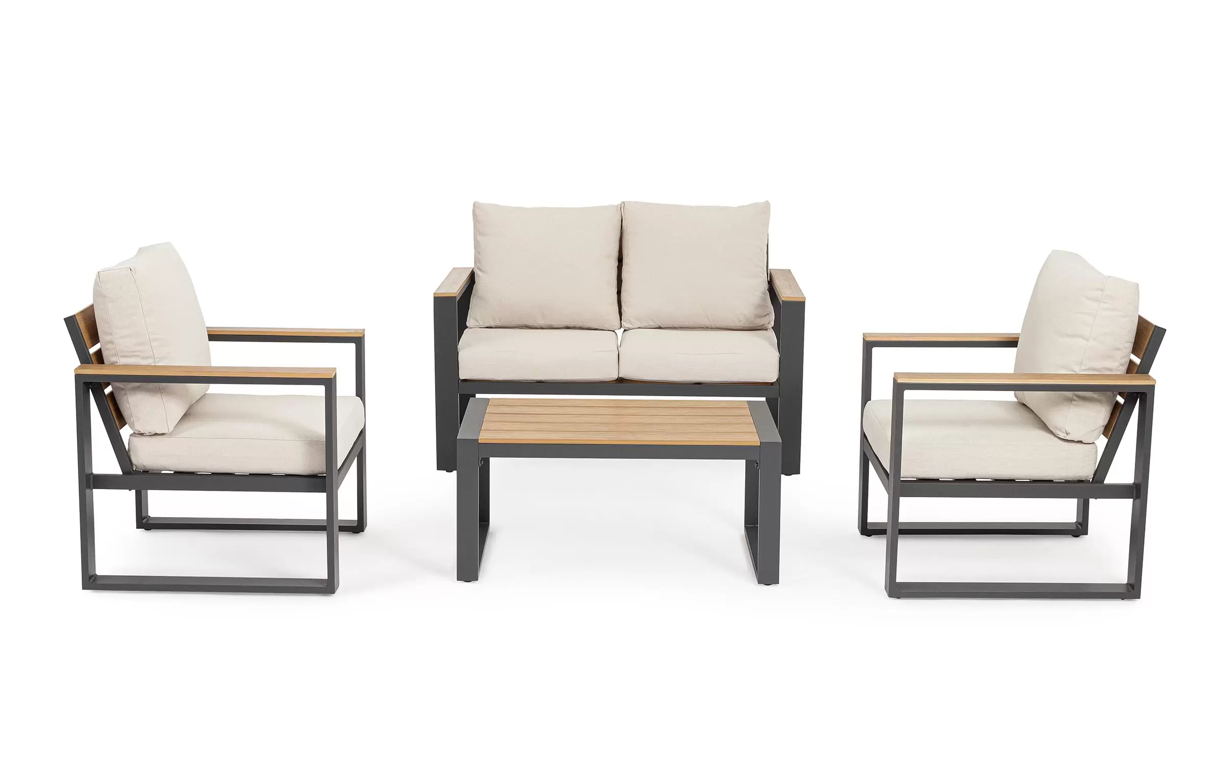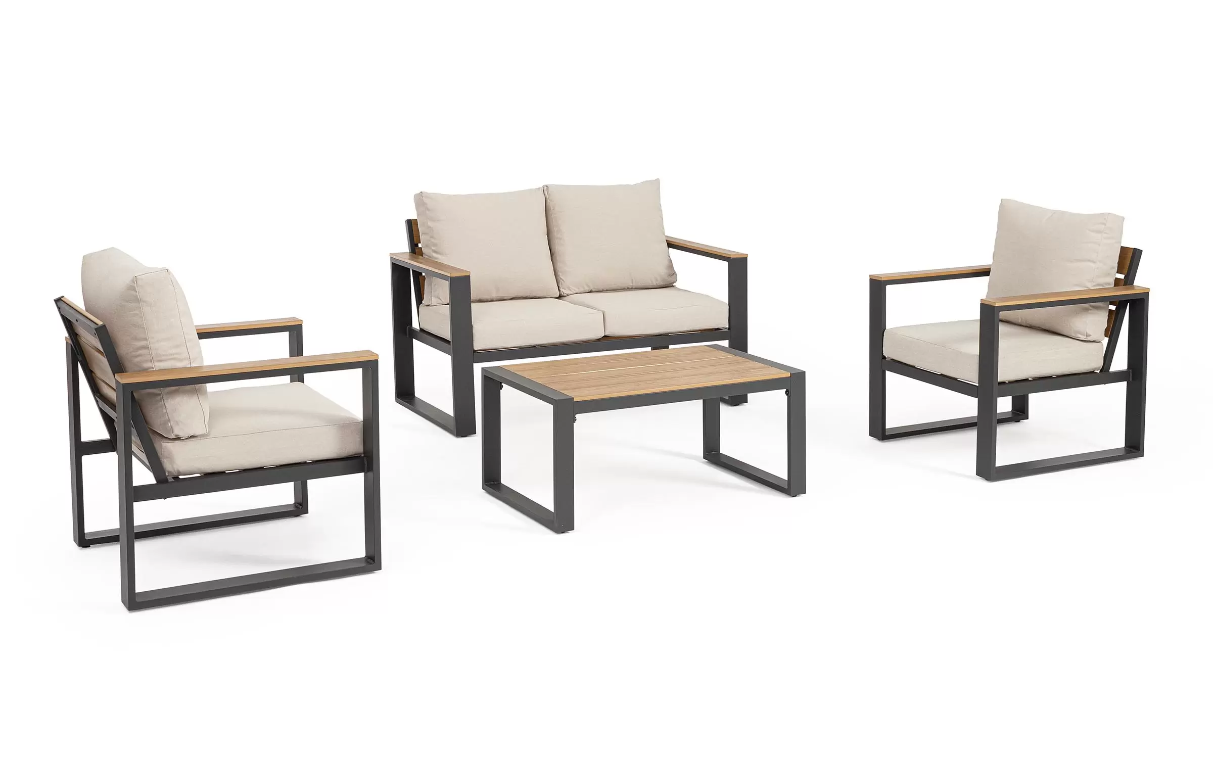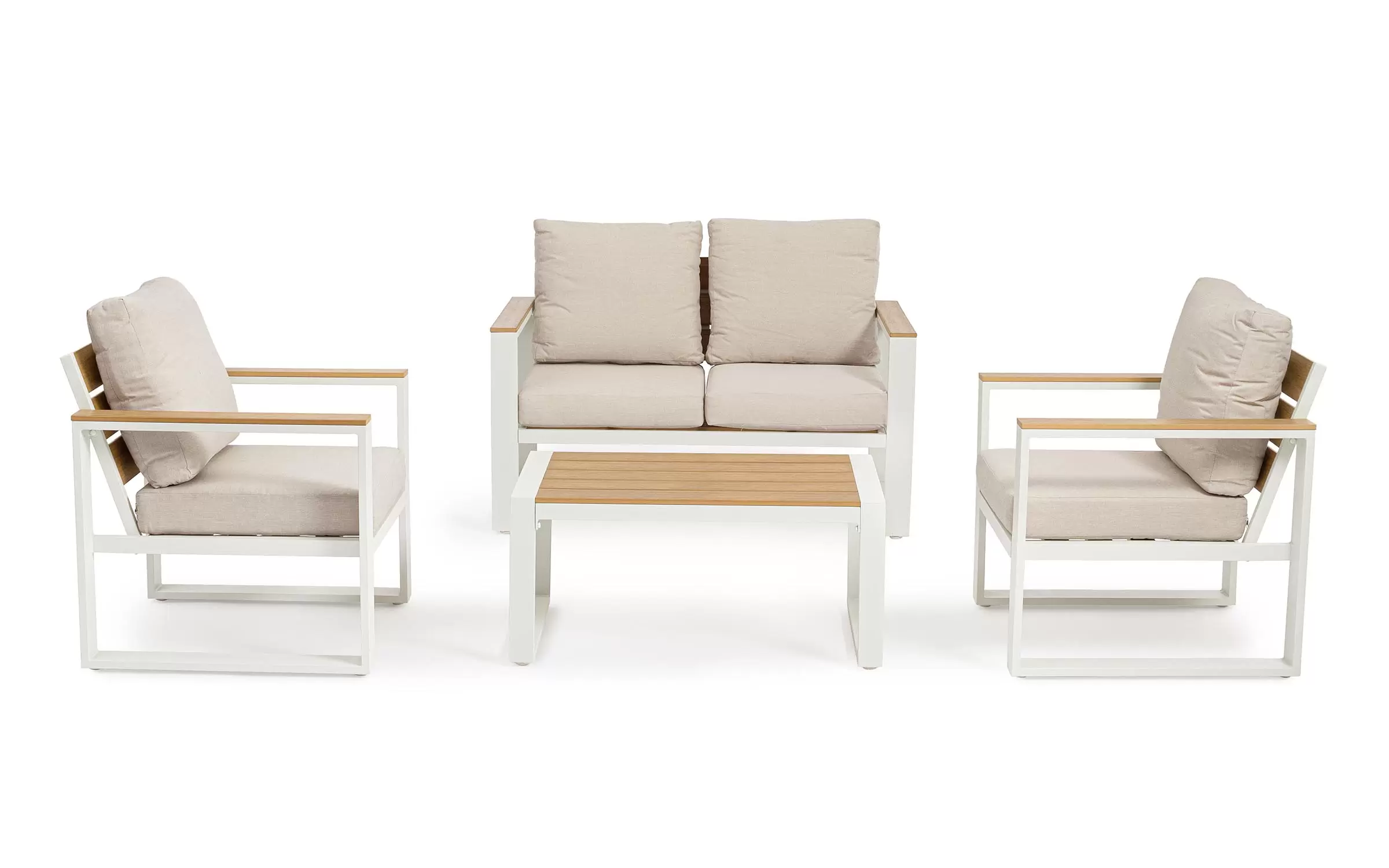 Lekki komplet kawowy dla czterech osób do użytku na zewnątrz. Sofa, dwa fotele i stolik wykonane w lekkiej wizualnie formie.