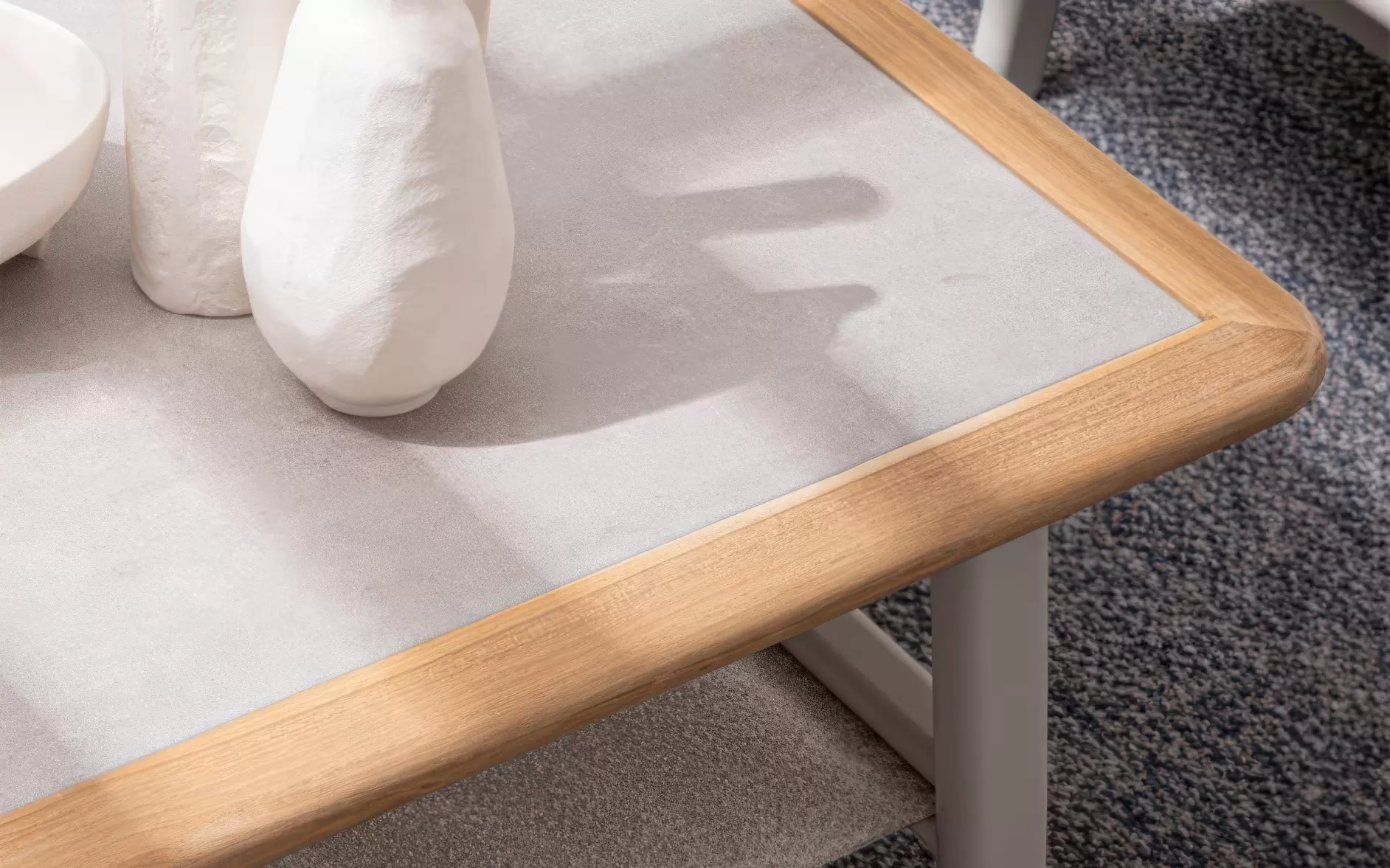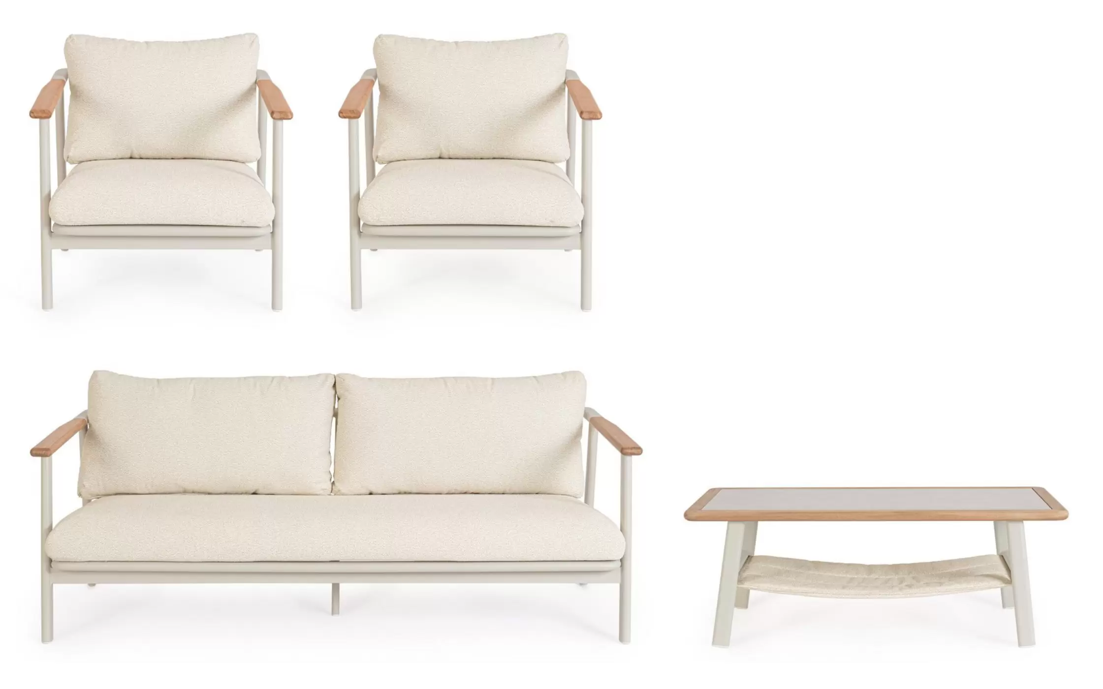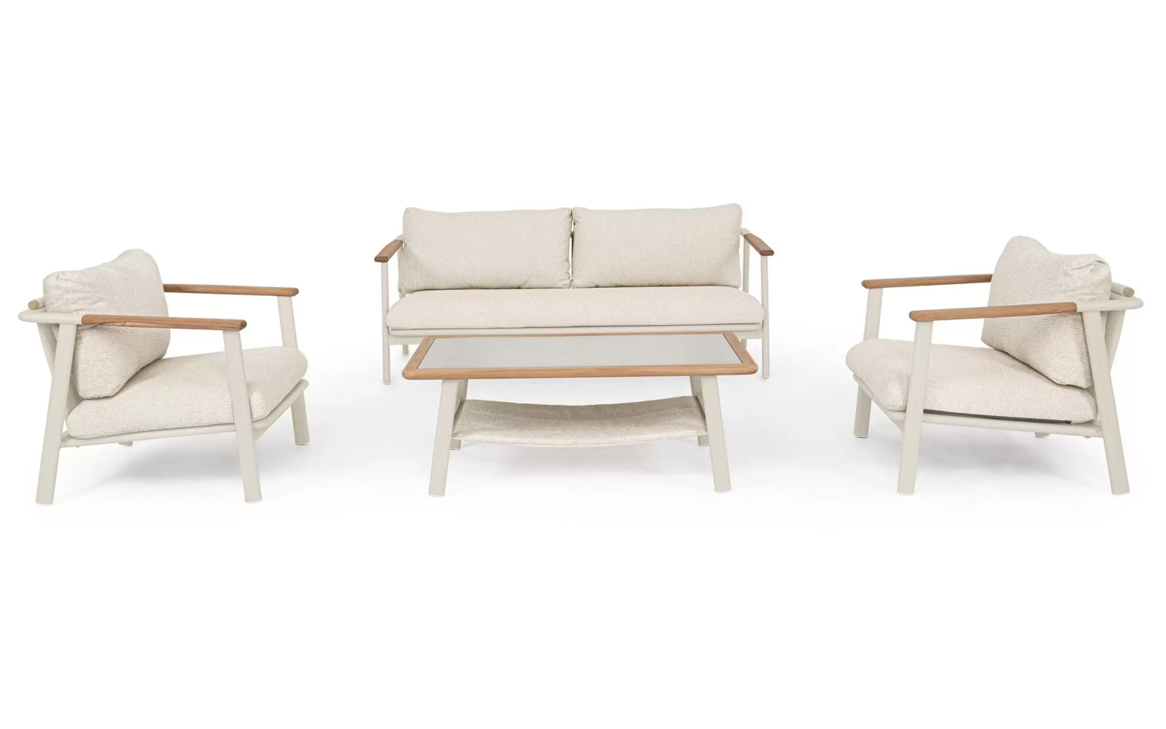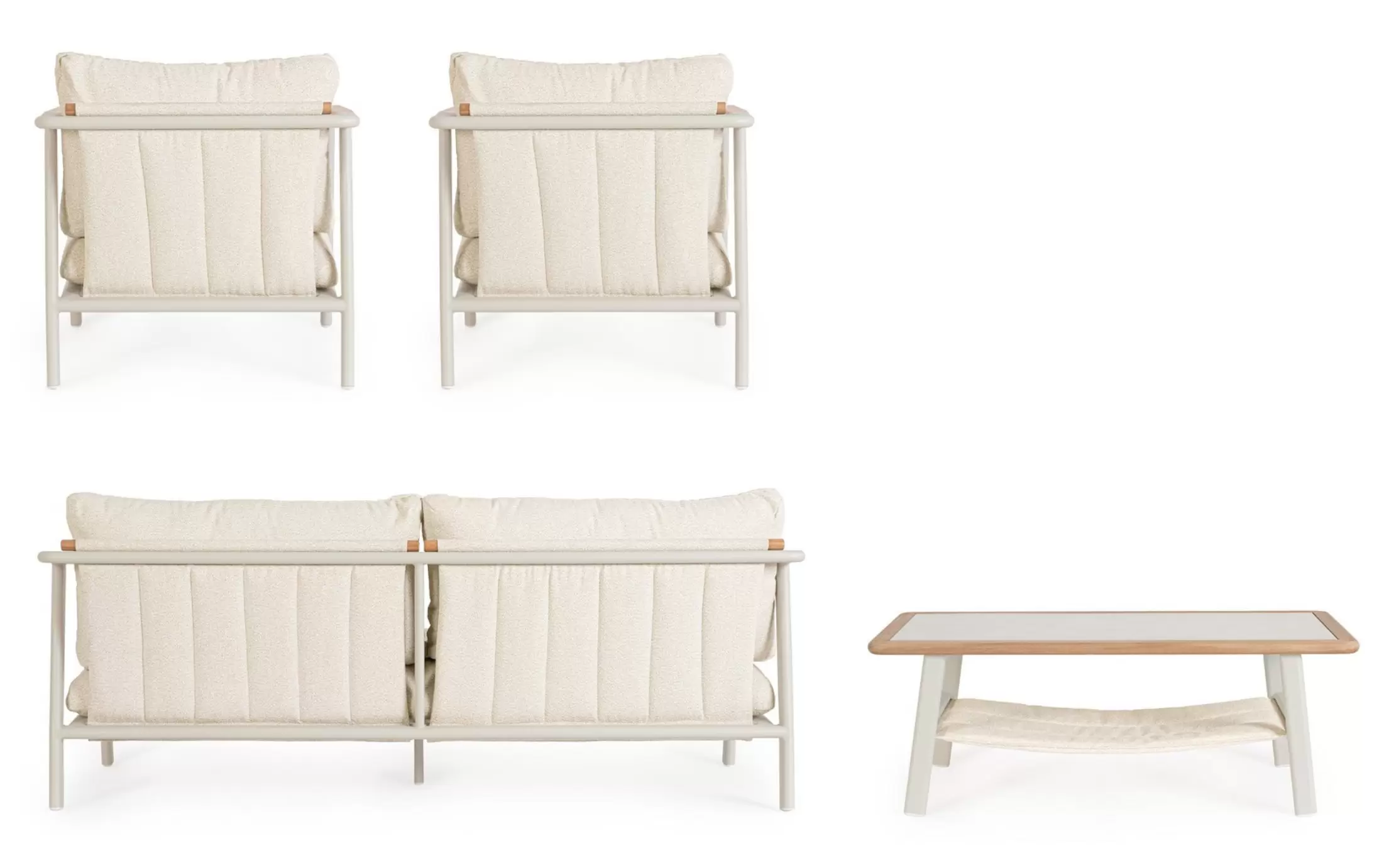 Funkcjonalność zestawu Leonida idzie w parze z innowacyjną teksturą materiałów. Zastosowanie tkaniny o strukturze bouclé nadaje poduszkom unikalną miękkość i trójwymiarowość, co rzadko spotyka się w produktach dedykowanych do użytku zewnętrznego. Stolik kawowy z blatem imitującym naturalny kamień stanowi kropkę nad „i” całego zestawu, łącząc trwałość szkła z estetyką surowych minerałów. To kompletna i przemyślana koncepcja, która przetrwa wiele sezonów, zachowując swój nienaganny styl i komfort.