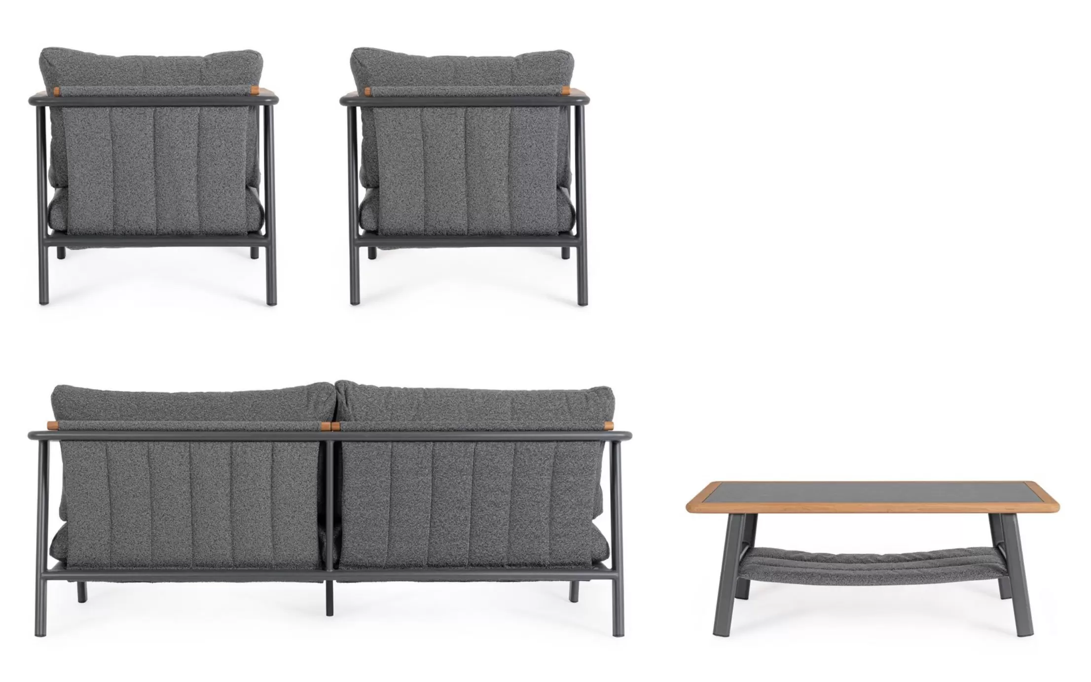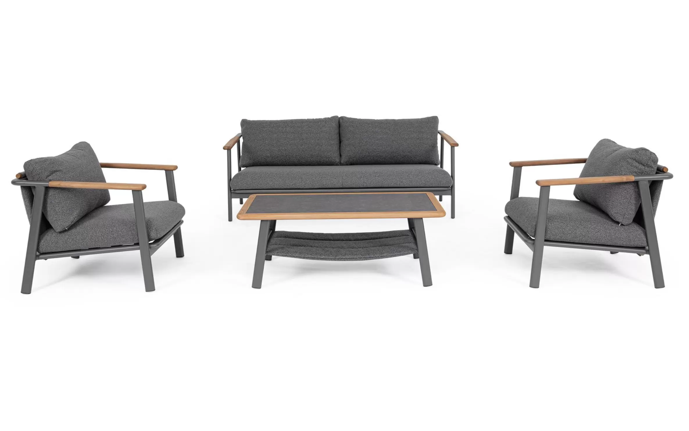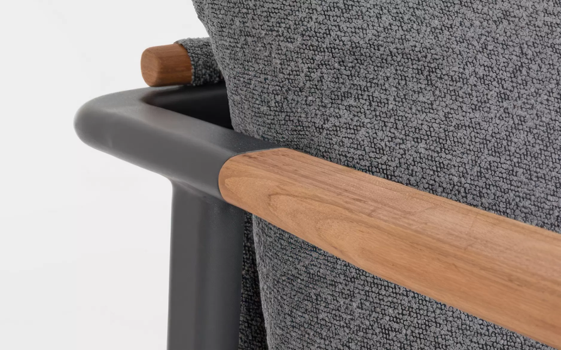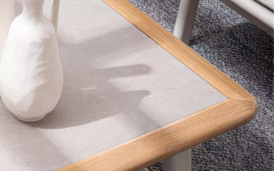 Drewno teakowe ???? – starannie wyselekcjonowane, naturalne wstawki zintegrowane z podłokietnikami i tylną częścią oparć. Teak to egzotyczny surowiec o wyjątkowej gęstości i wysokiej zawartości naturalnych olejów, co czyni go całkowicie odpornym na gnicie. Z biegiem czasu drewno to pokrywa się szlachetną, srebrzystą patyną, która podkreśla prestiżowy charakter mebli.