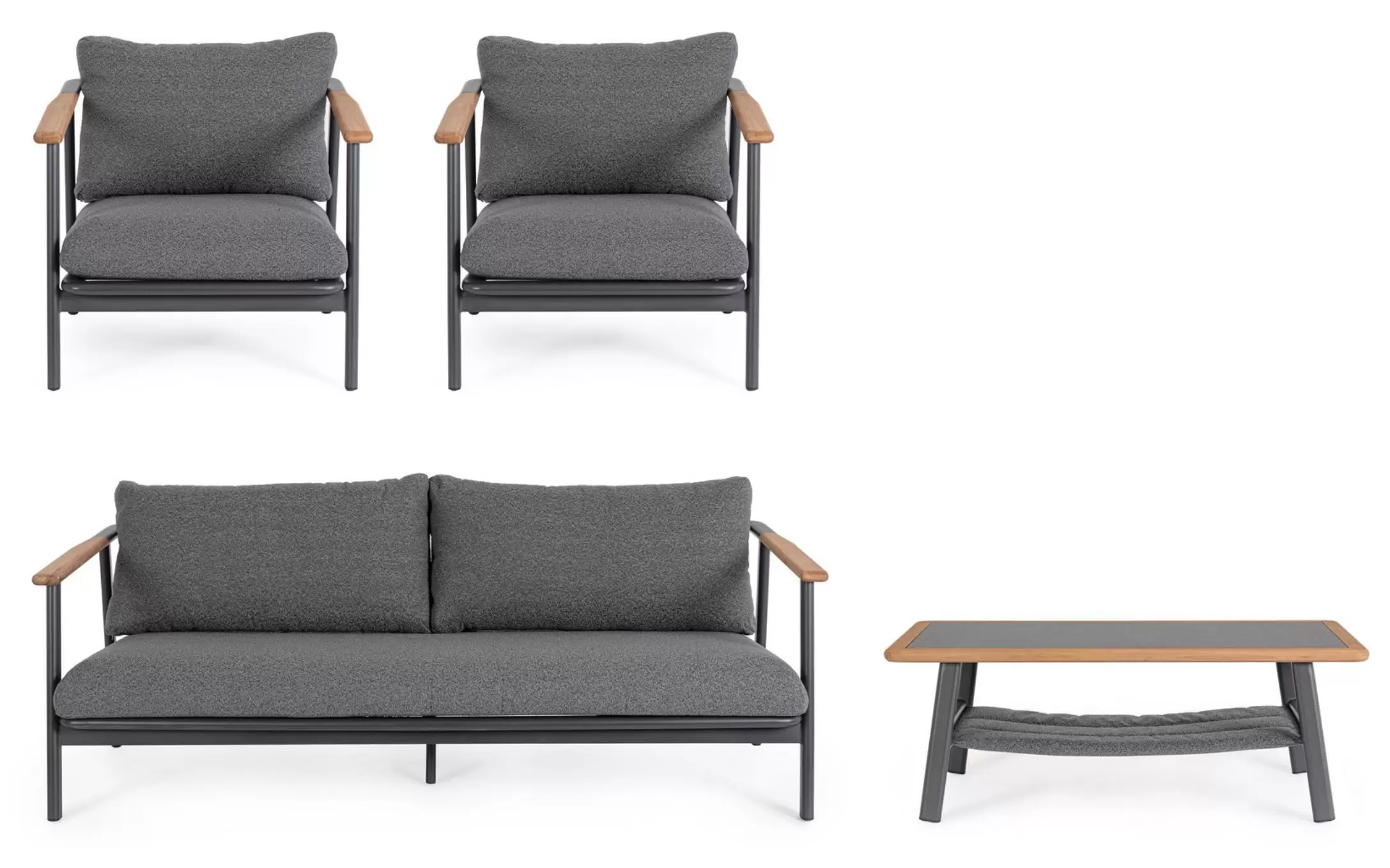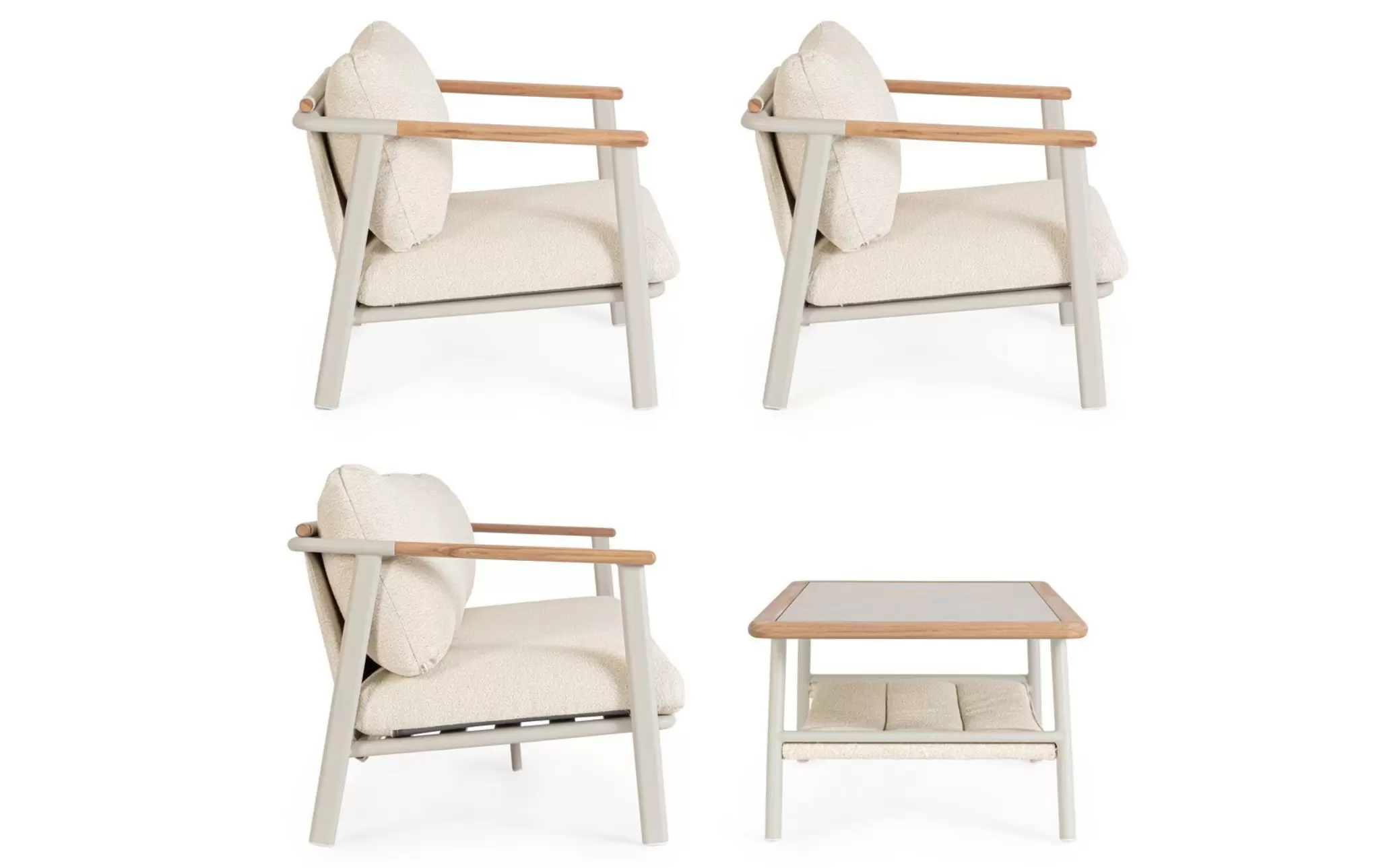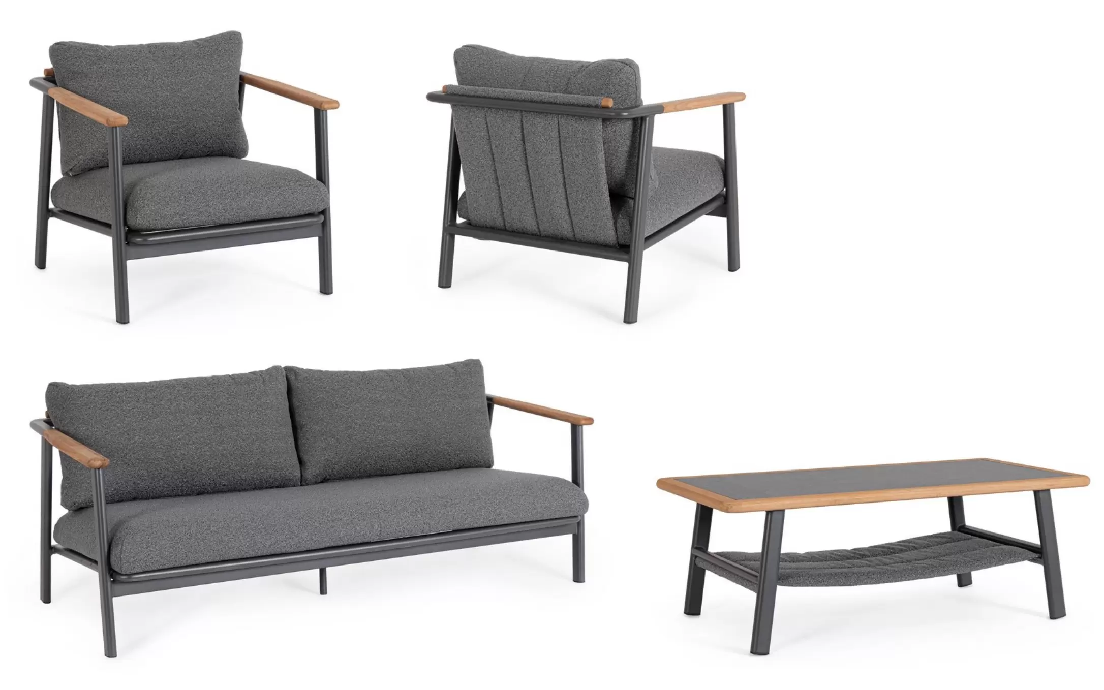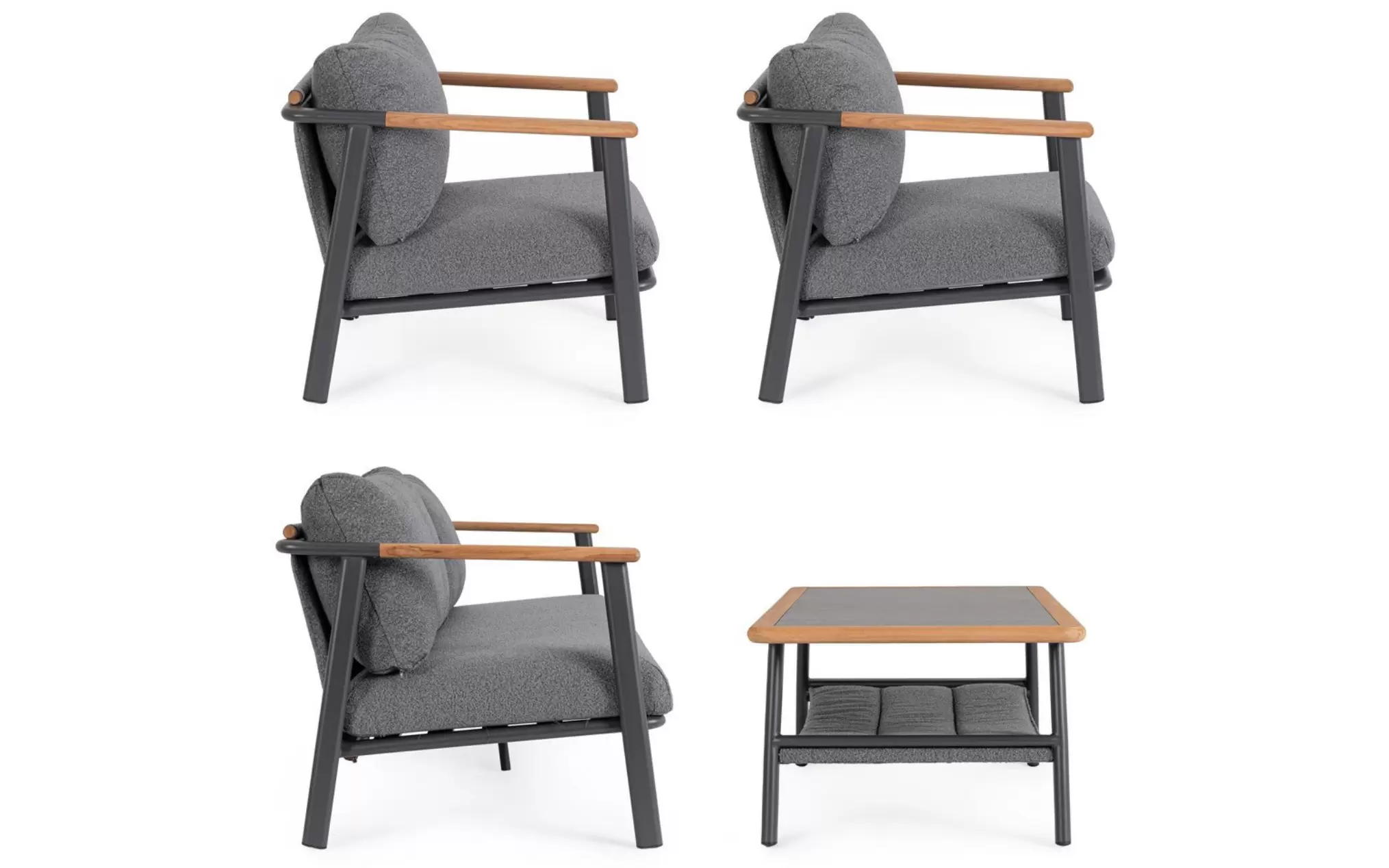 Drewno teakowe ???? – starannie wyselekcjonowane, naturalne wstawki zintegrowane z podłokietnikami i tylną częścią oparć. Teak to egzotyczny surowiec o wyjątkowej gęstości i wysokiej zawartości naturalnych olejów, co czyni go całkowicie odpornym na gnicie. Z biegiem czasu drewno to pokrywa się szlachetną, srebrzystą patyną, która podkreśla prestiżowy charakter mebli.