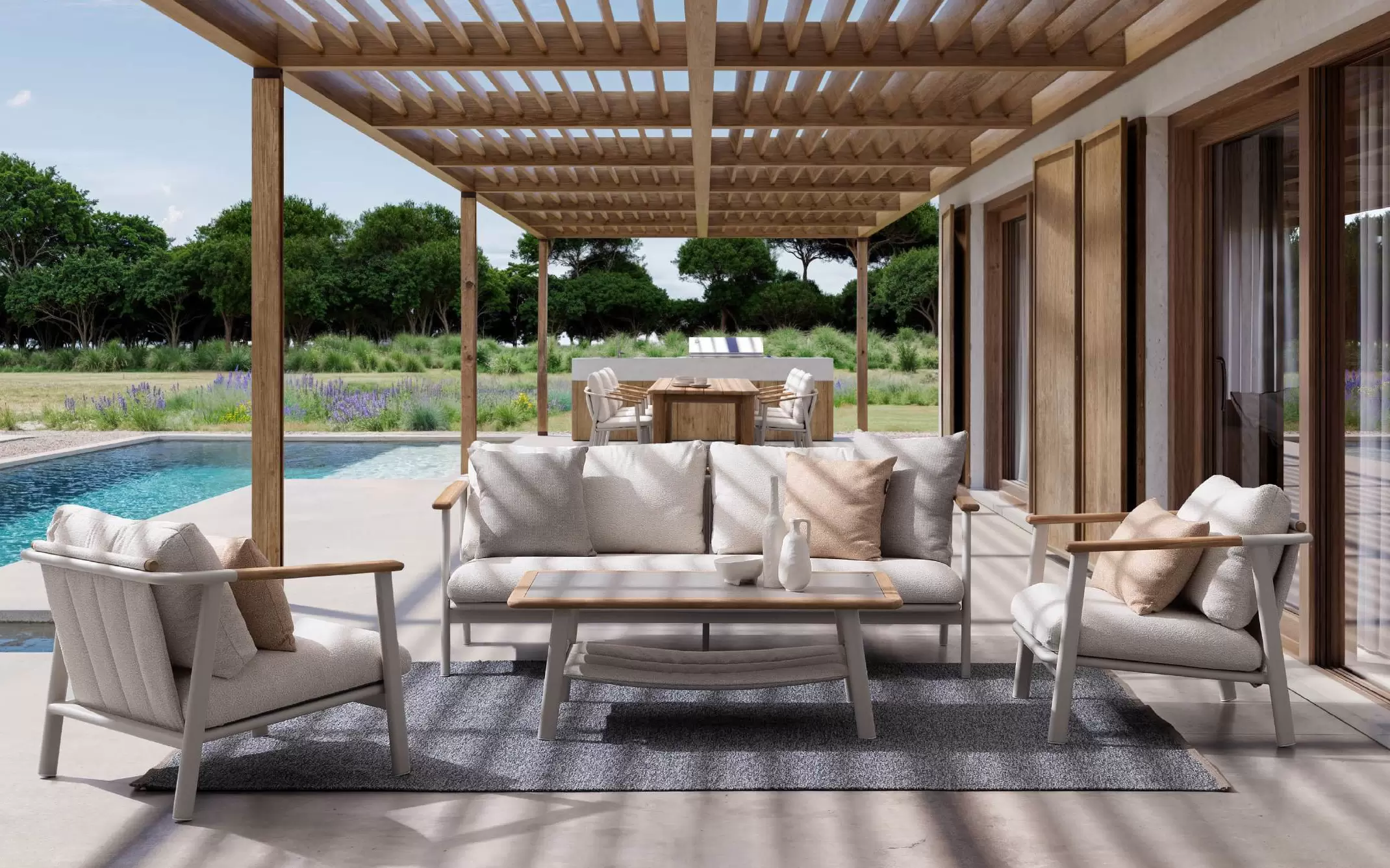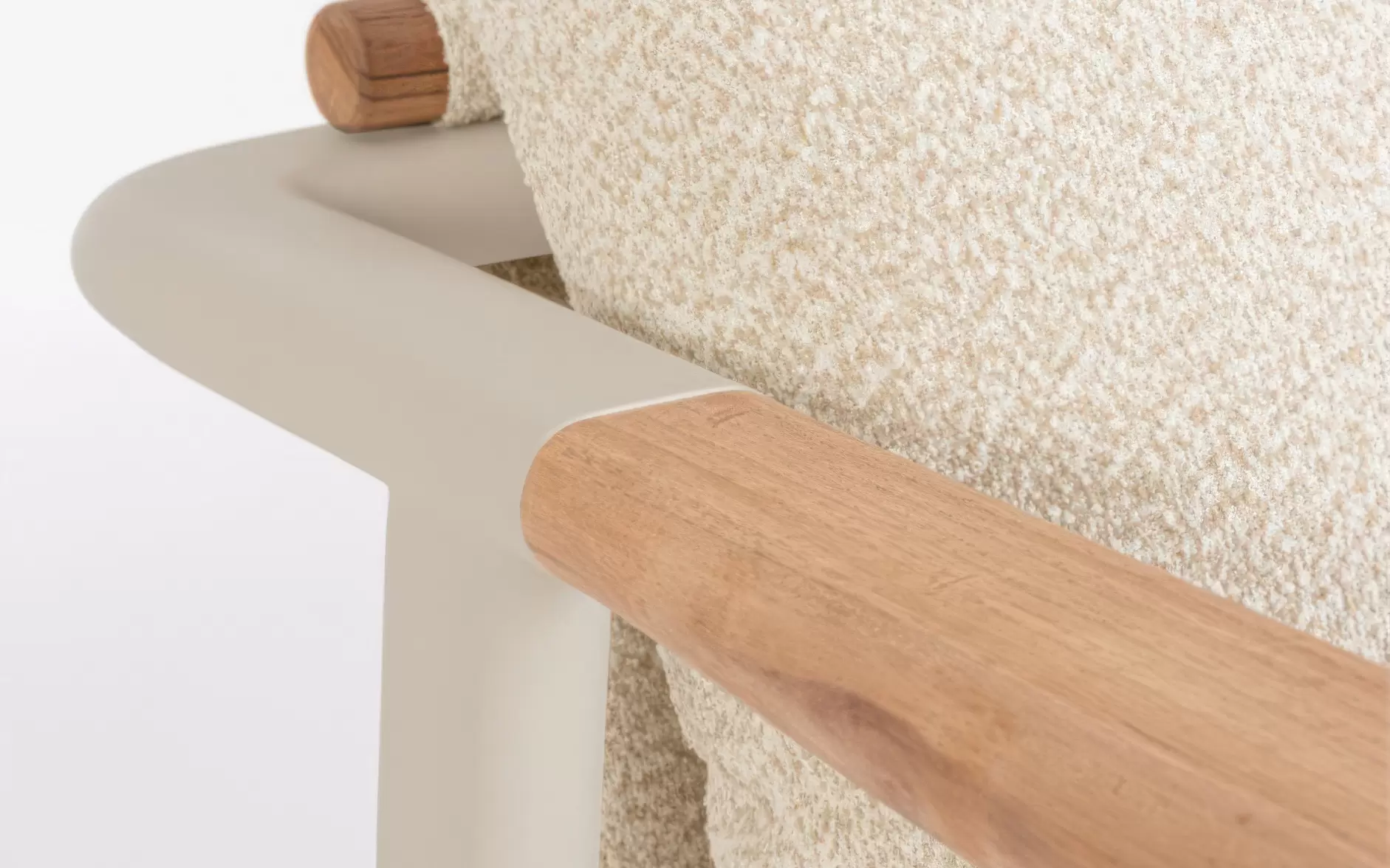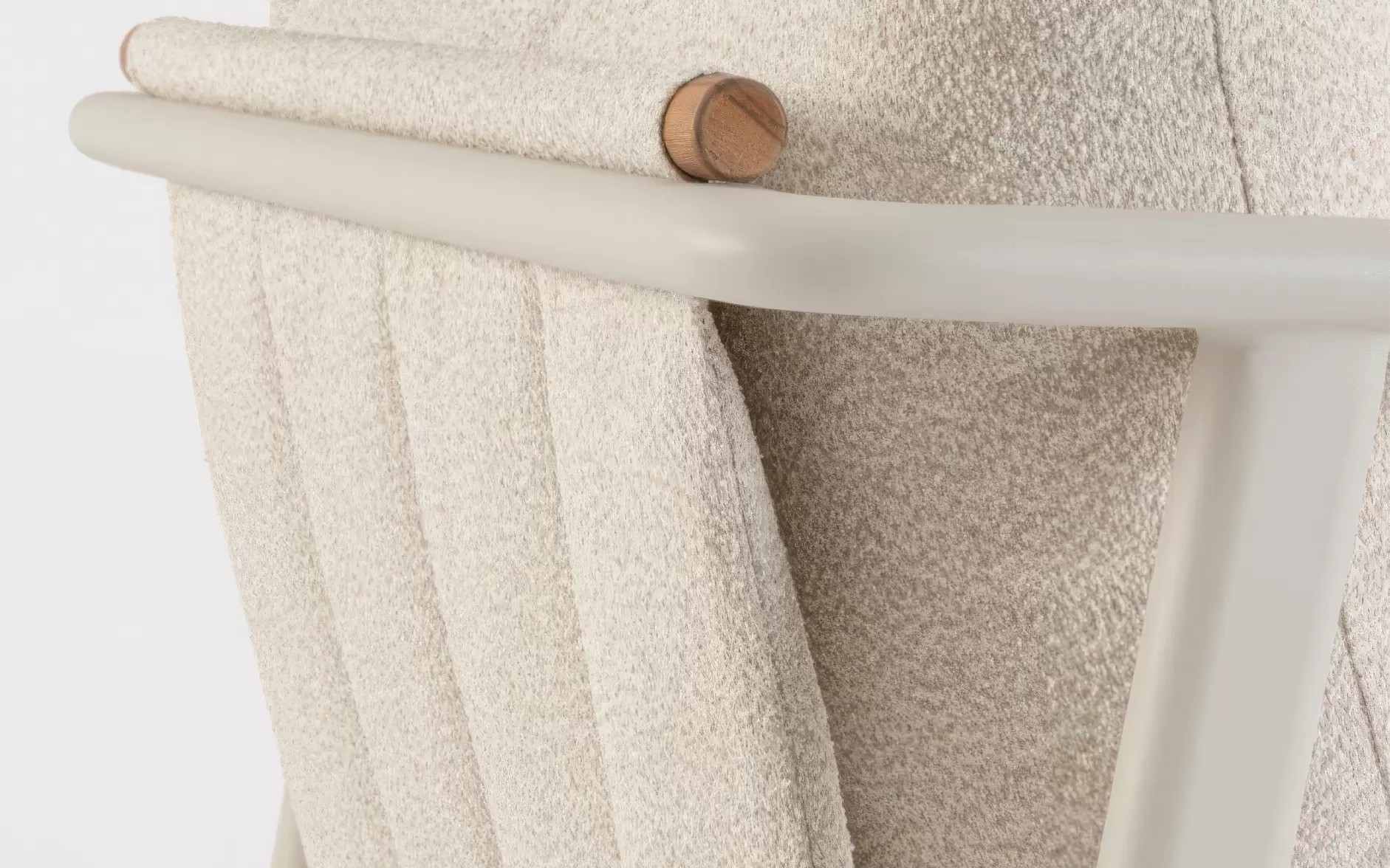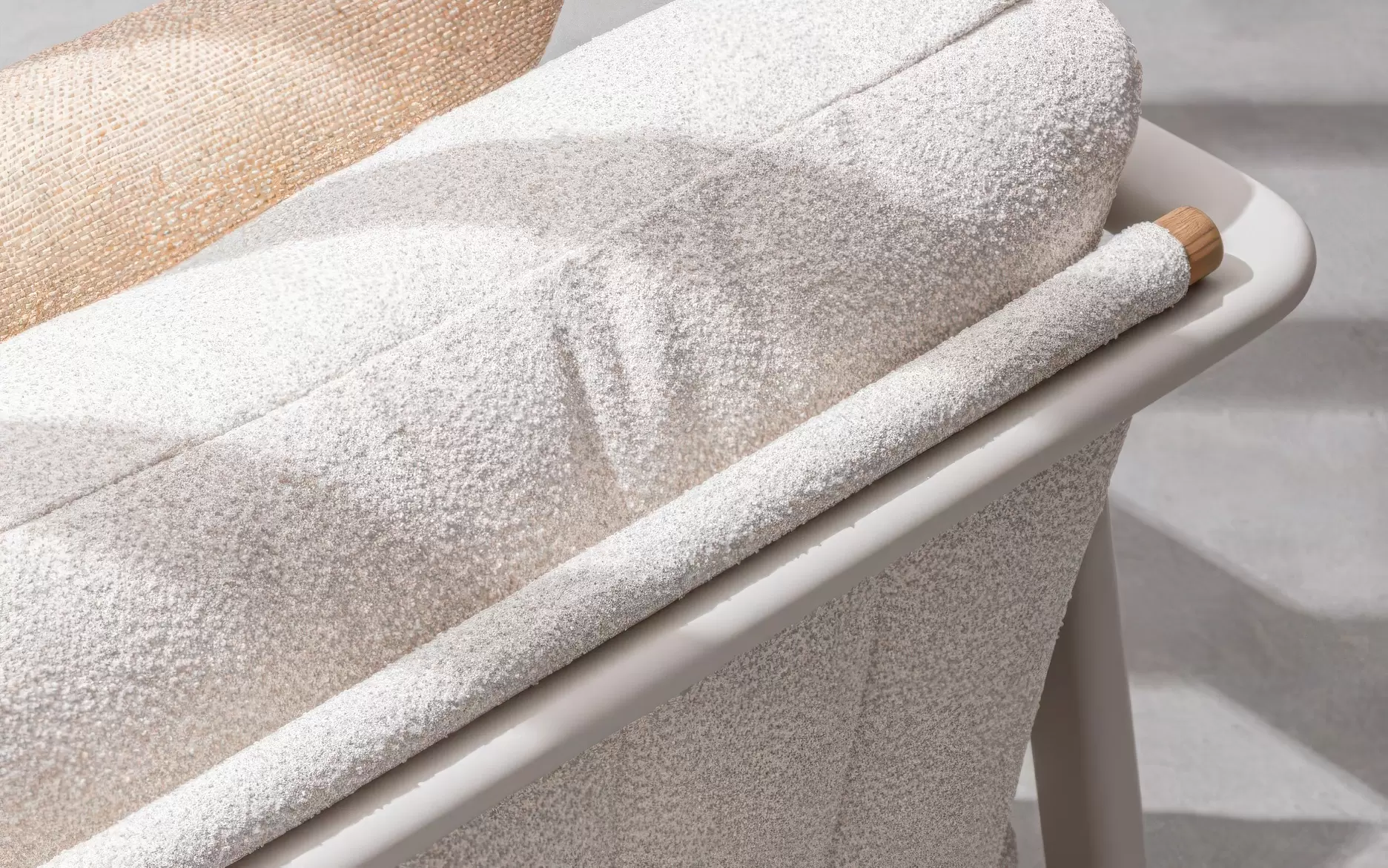 Tkanina Olefin (100% polipropylen) ☁️ – innowacyjne poszycie poduszek wyróżniające się niezwykle modną, pętelkową strukturą bouclé. Materiał ten łączy luksusowy wygląd z najwyższą funkcjonalnością outdoorową: jest hydrofobowy, wysoce odporny na blaknięcie pod wpływem promieniowania UV i nie chłonie zabrudzeń. Zintegrowane zamki pozwalają na łatwe zdjęcie pokrowców do prania.