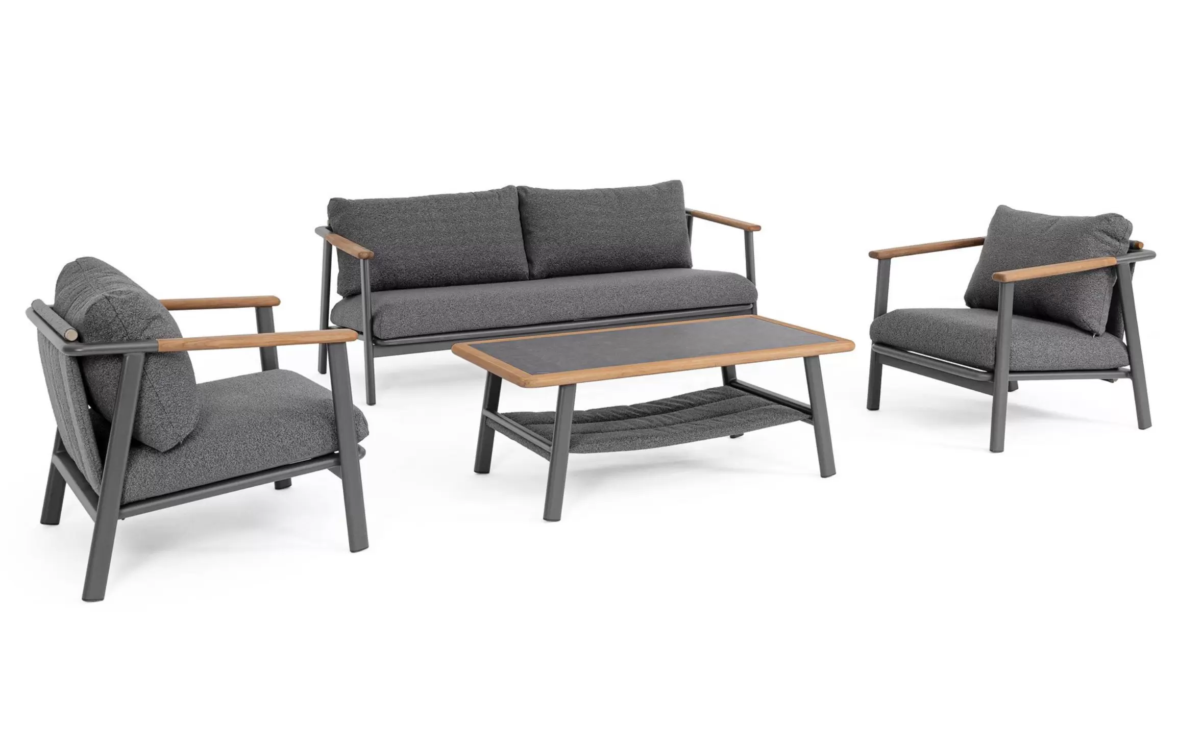Zestaw ogrodowy Leonida to kwintesencja nowoczesnej elegancji, idealnie reprezentująca ekskluzywne meble wypoczynkowe ogrodowe. Komplet składa się z przestronnej, trzyosobowej sofy, dwóch głębokich foteli oraz stylowego stolika kawowego, tworząc reprezentacyjną i spójną aranżację na tarasie lub patio. Projekt zachwyca odważnym połączeniem surowego aluminium z ciepłym, naturalnym drewnem teakowym, co sprawia, że meble te stają się nie tylko miejscem relaksu, ale również dominującym elementem dekoracyjnym zewnętrznej architektury domu.