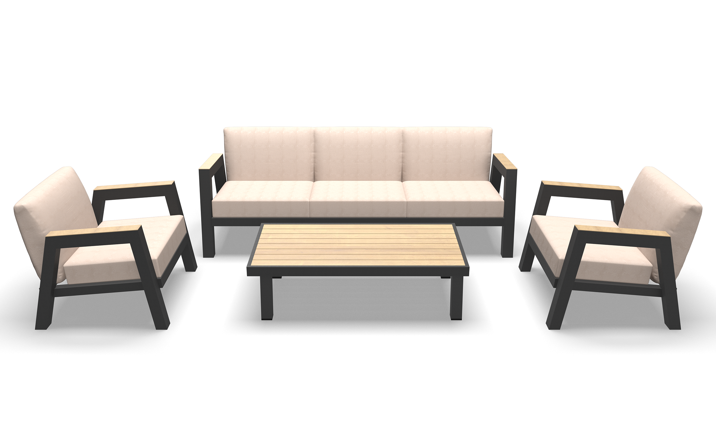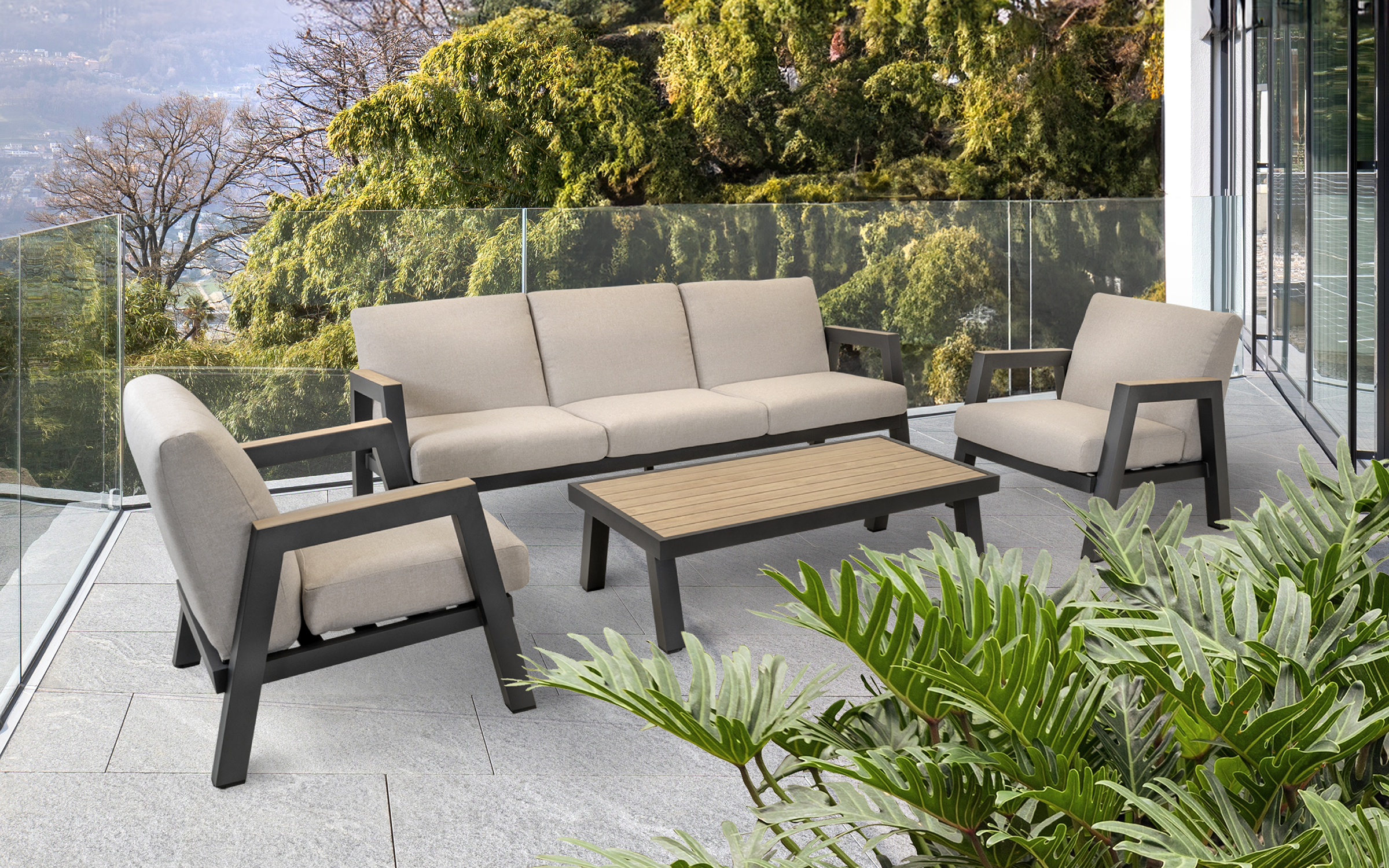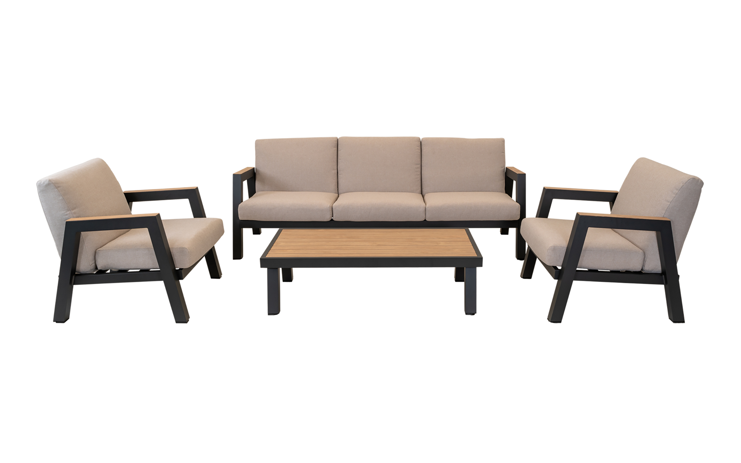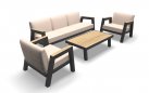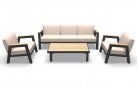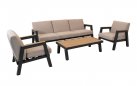 MANU Zestaw wypoczynkowy ogrodowy sofa 3‑osobowa, 2 fotele i stolik – rama antracyt, poduszki beżowe, woodlook