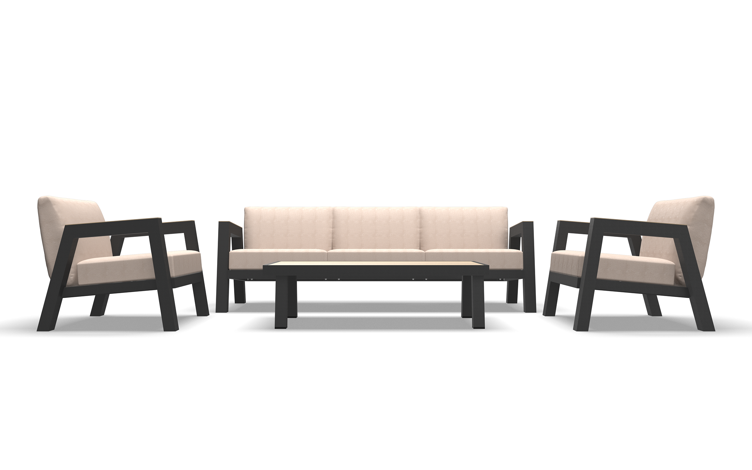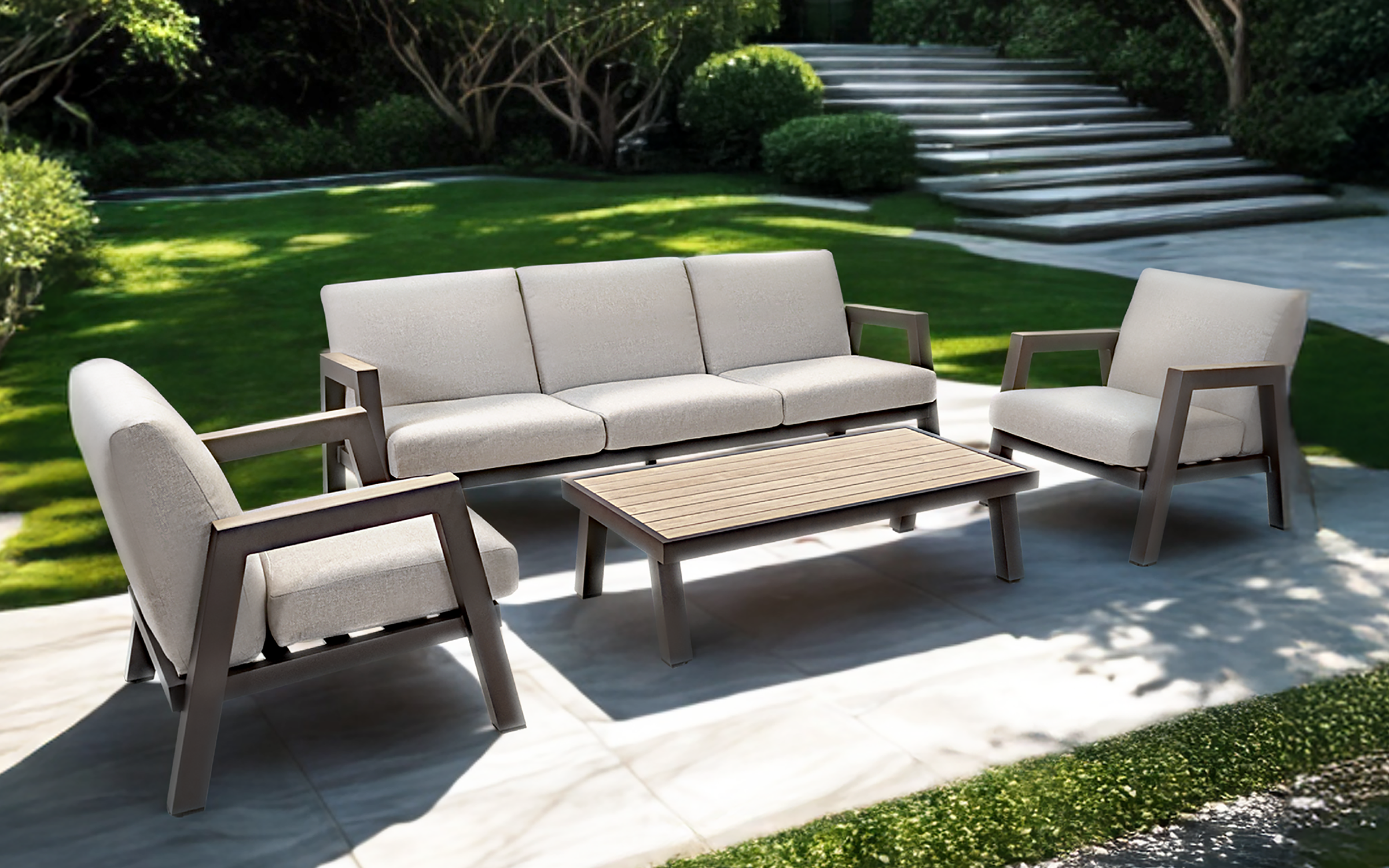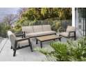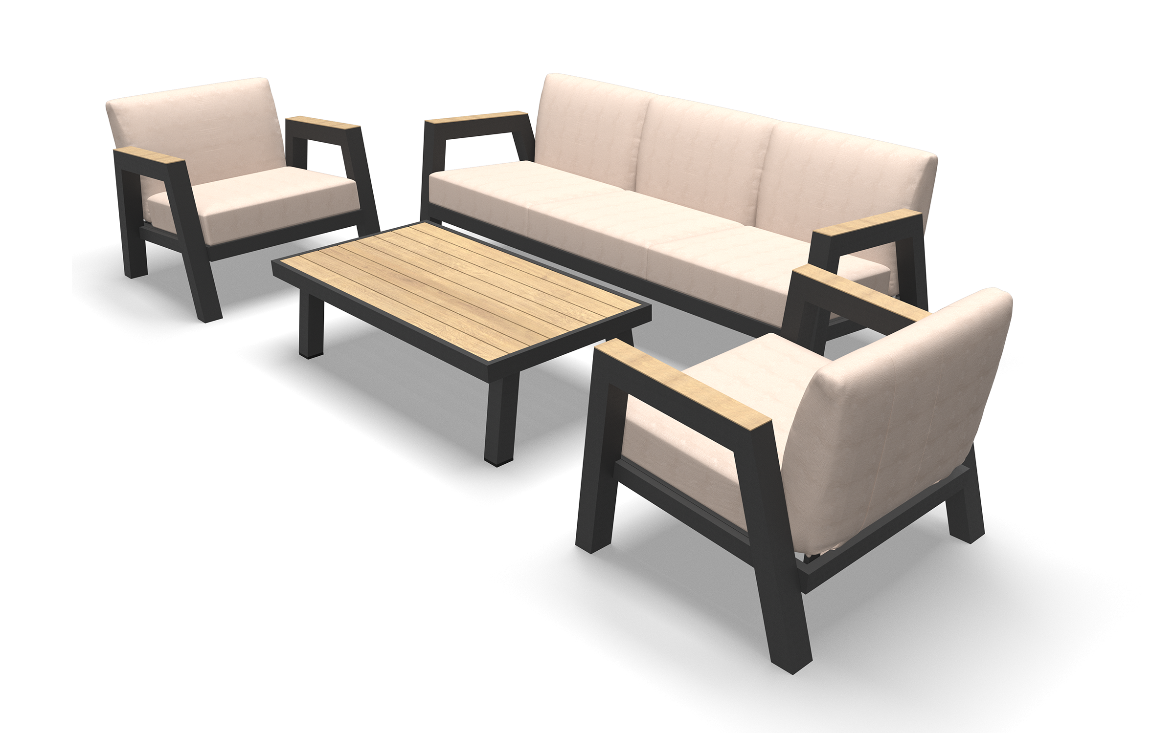 MANU Zestaw wypoczynkowy ogrodowy sofa 3‑osobowa, 2 fotele i stolik – rama antracyt, poduszki beżowe, woodlook