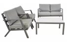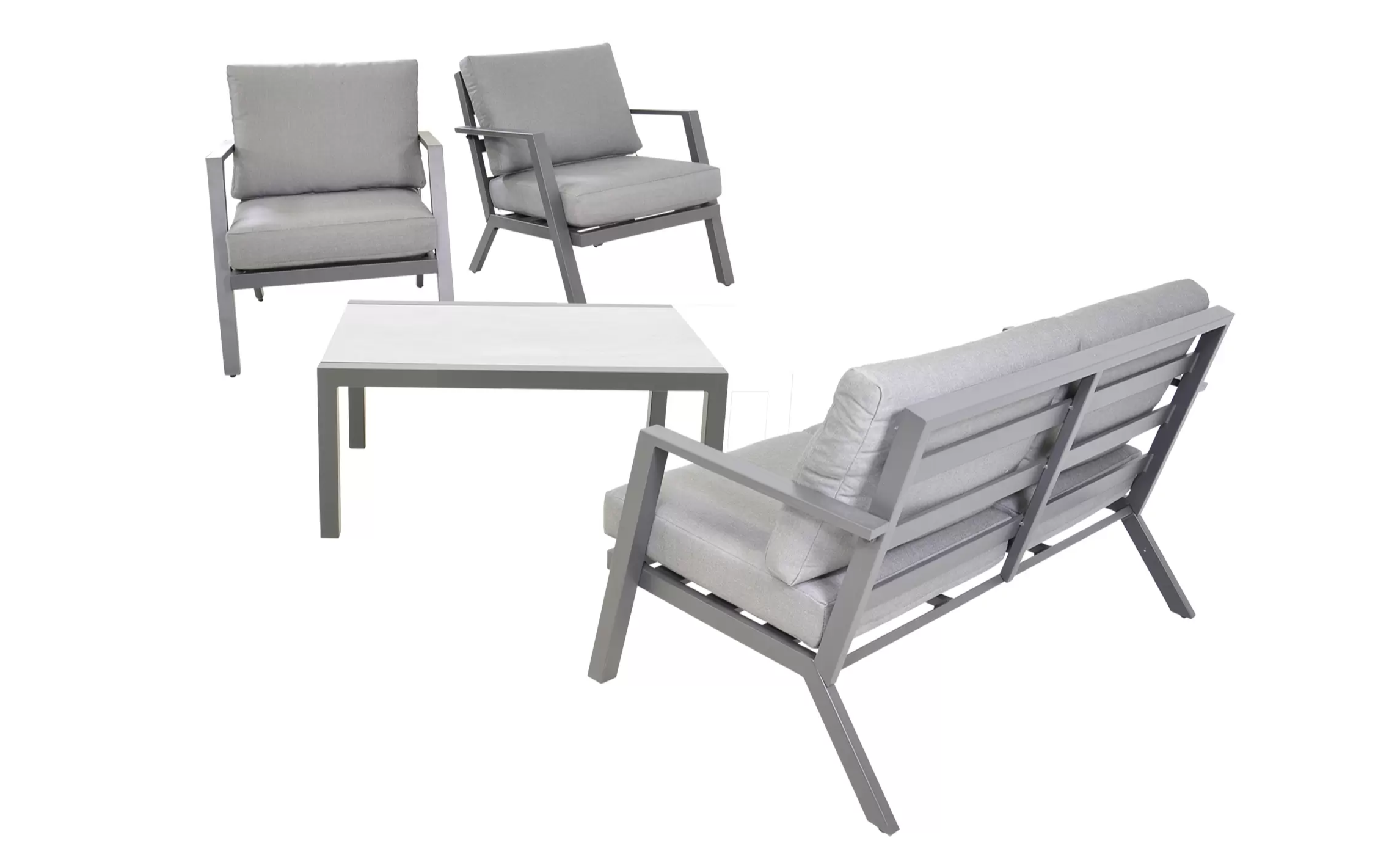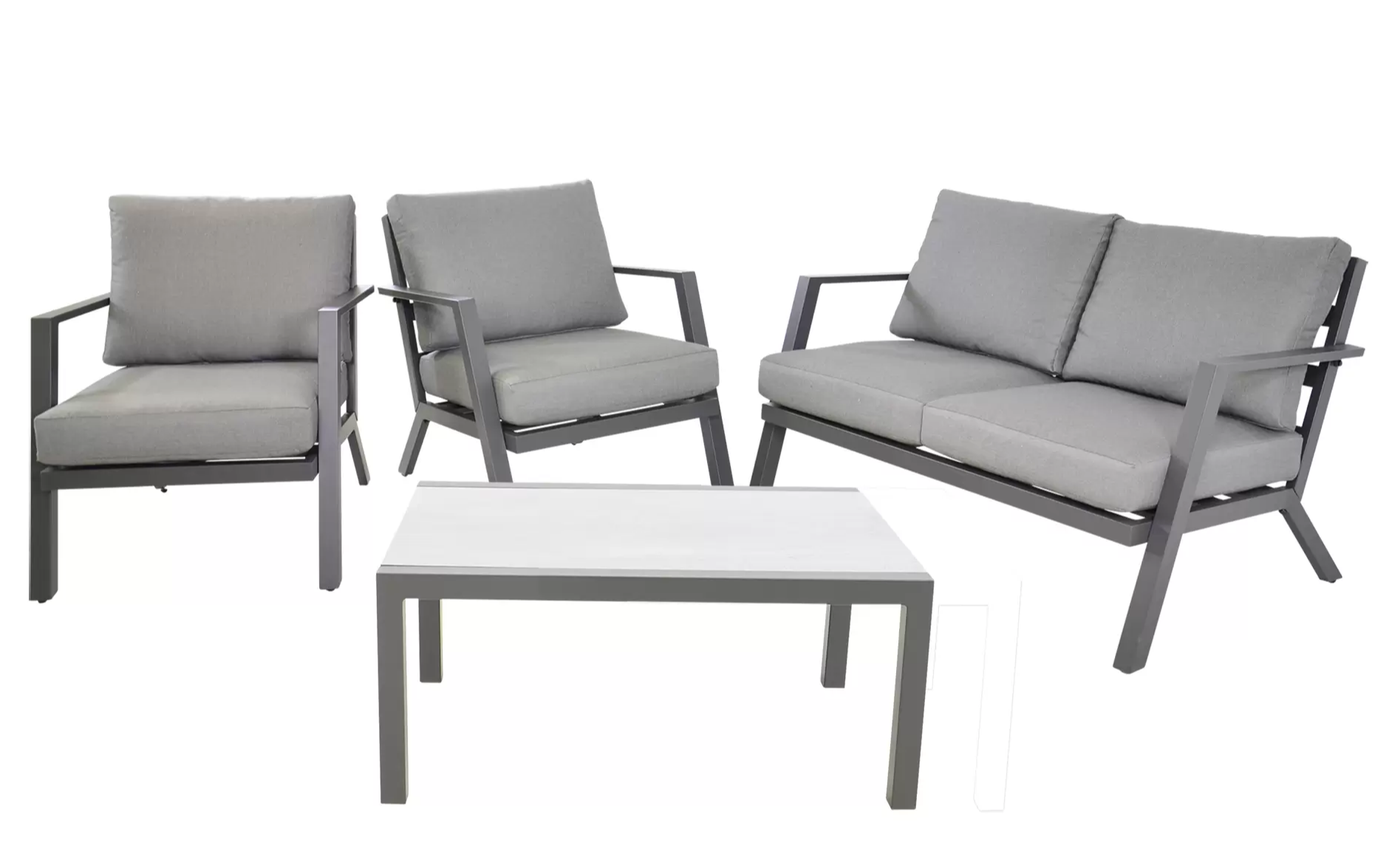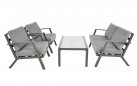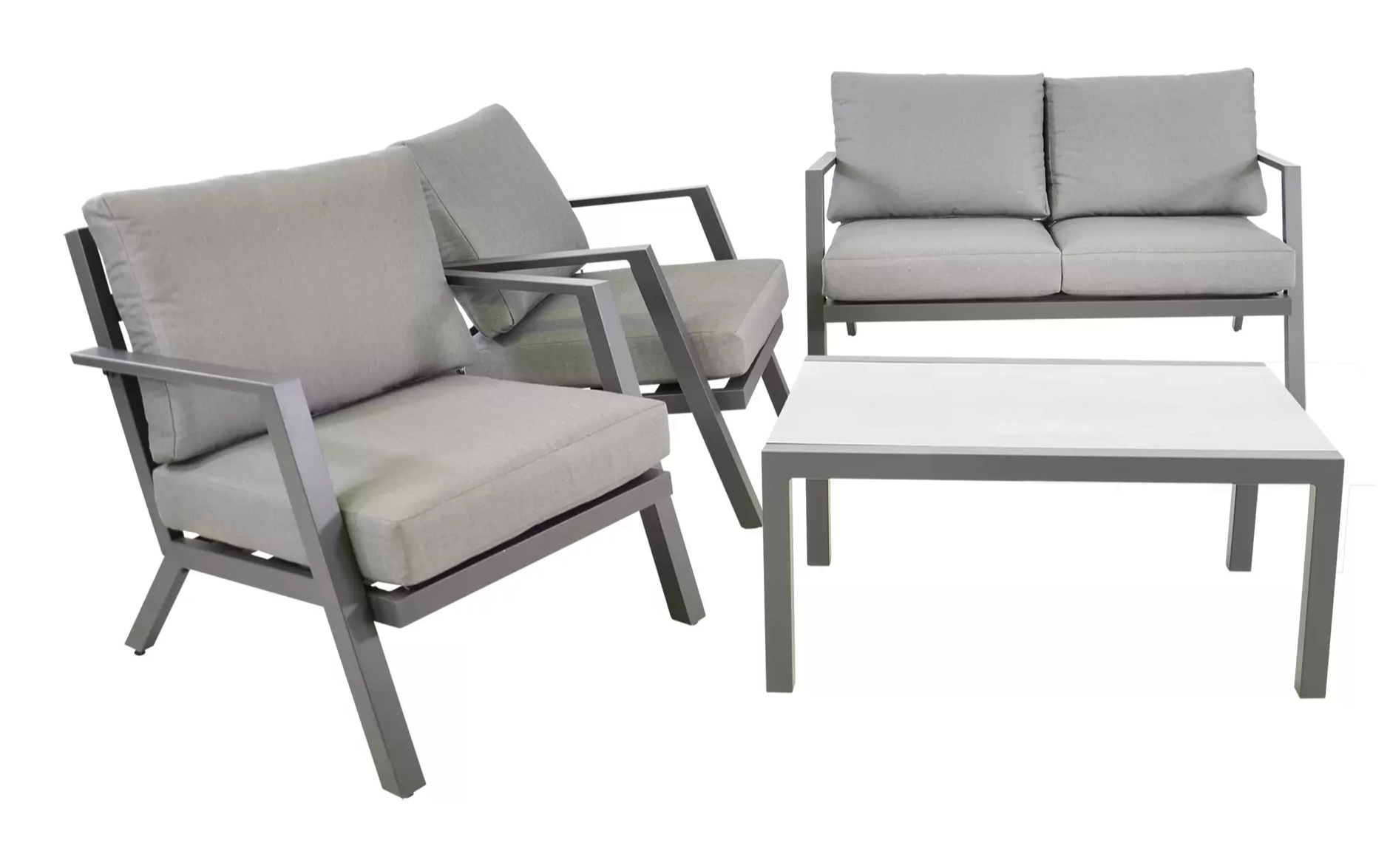Klasyczny aluminiowy zestaw wypoczynkowy na taras szary z szarymi poduszkami. W komplecie stolik z blatem ze szkła hartowanego pokrytego spiekiem kamiennym.
