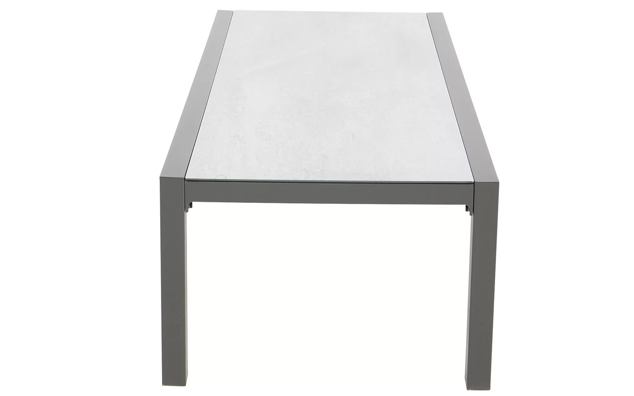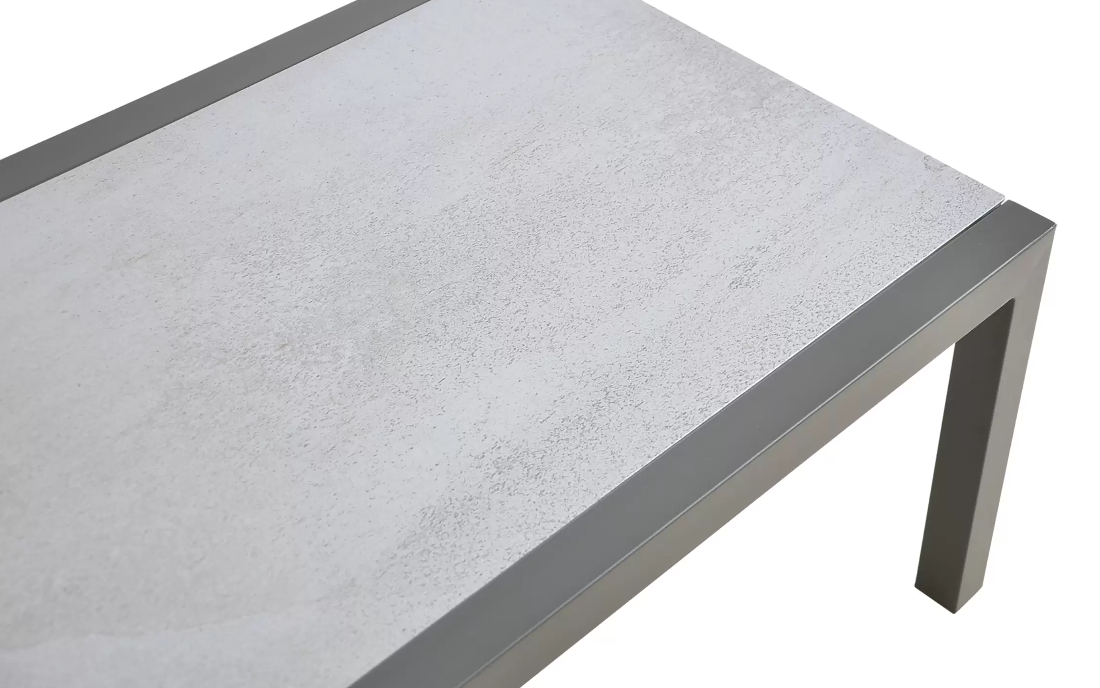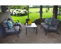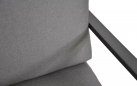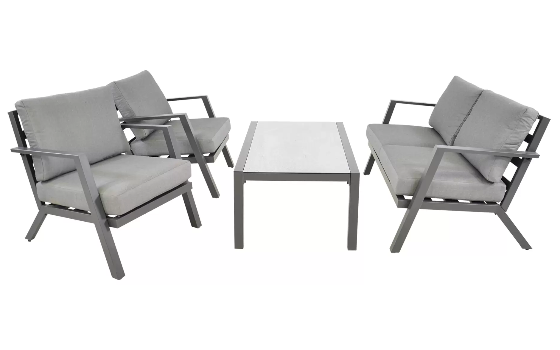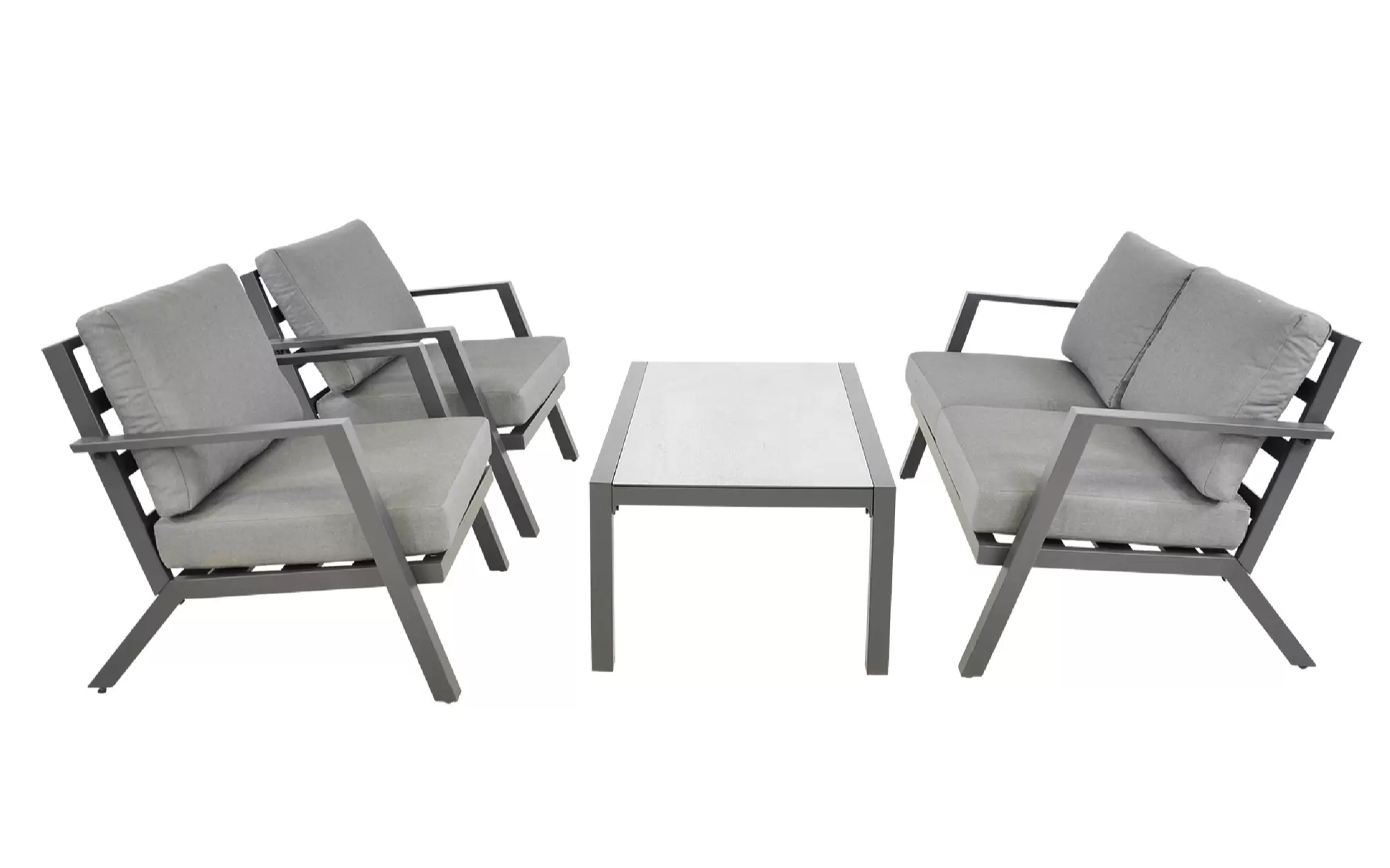 Klasyczny aluminiowy zestaw wypoczynkowy na taras szary z szarymi poduszkami. W komplecie stolik z blatem ze szkła hartowanego pokrytego spiekiem kamiennym.