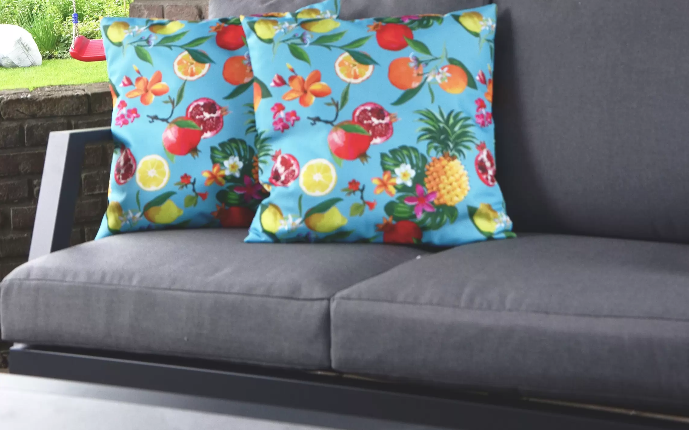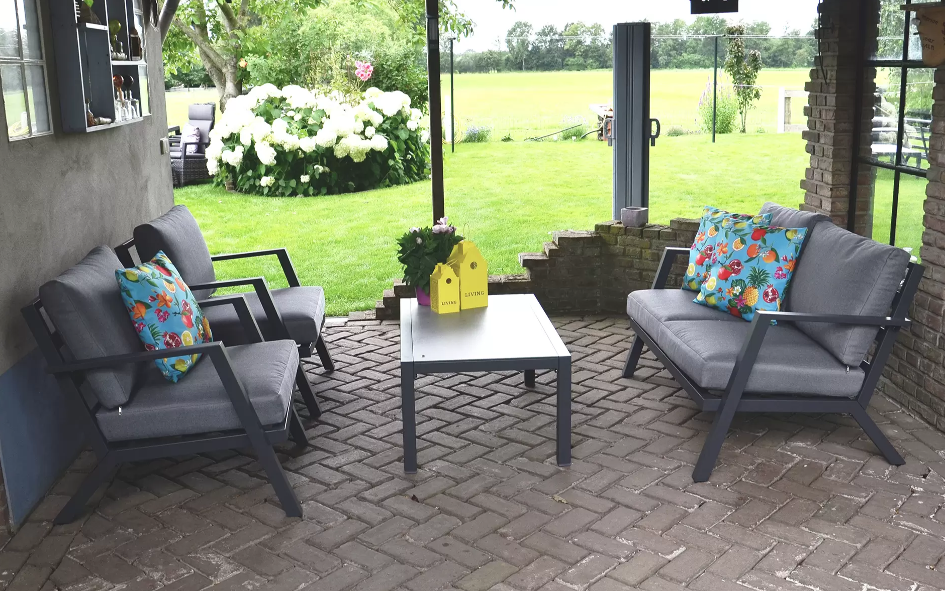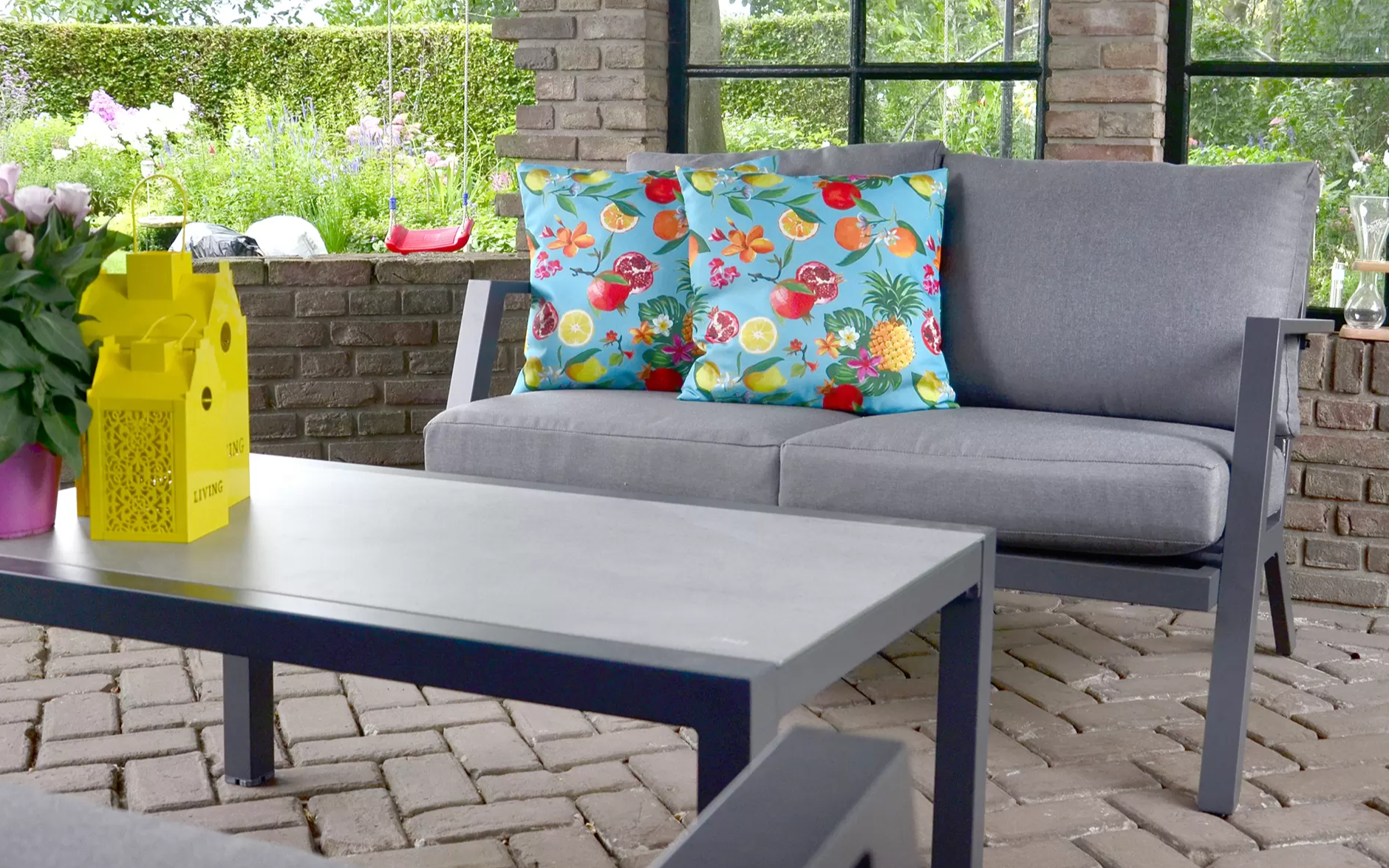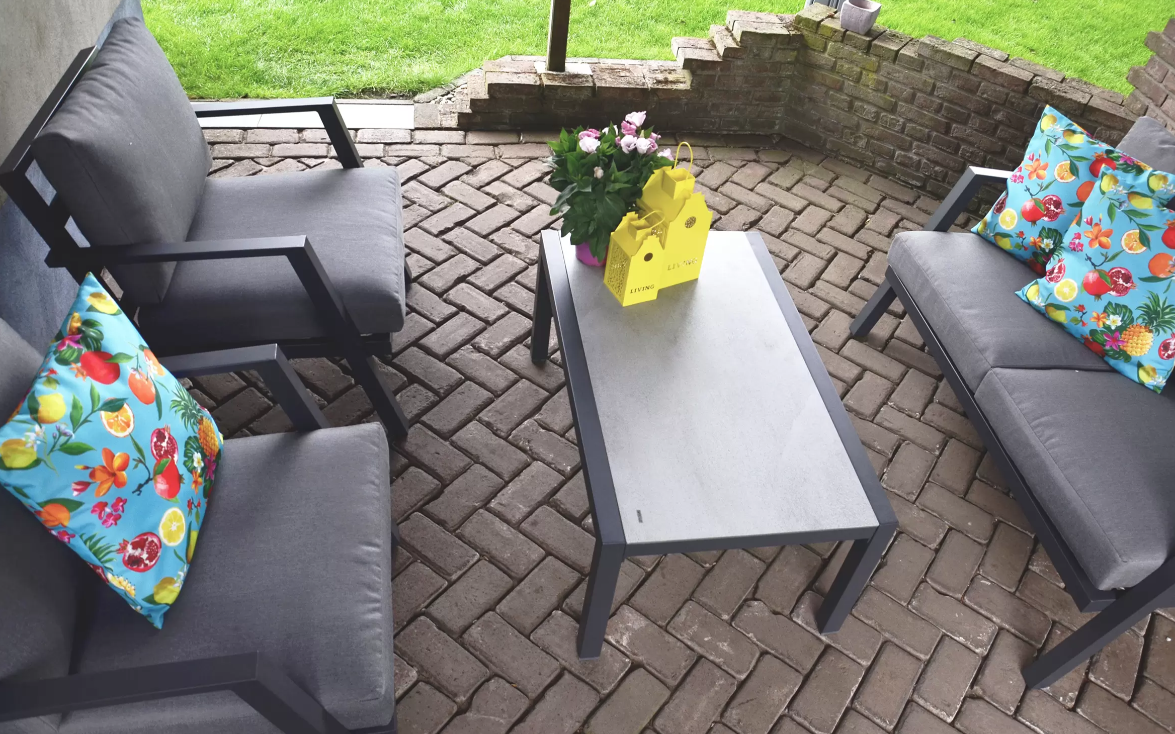 Poduszki z pianki szybkoschnącej. Blat stolika ogrodowego ze szkła hartowanego pokrytego spiekiem kamiennym o wyglądzie powierzchni betonowej jasnoszarej.