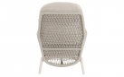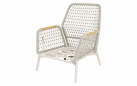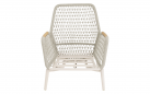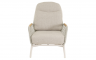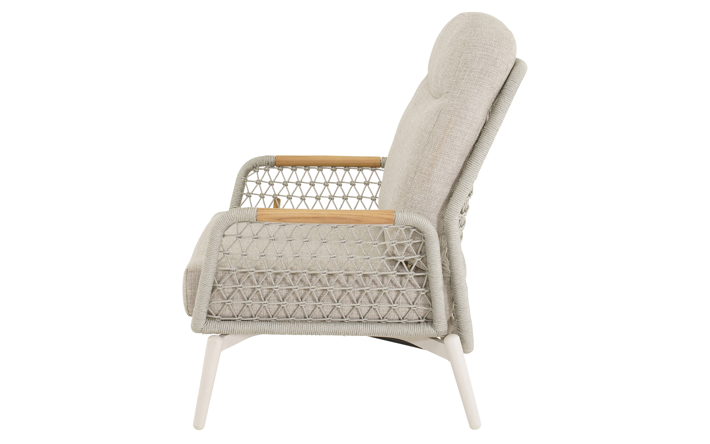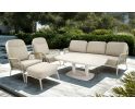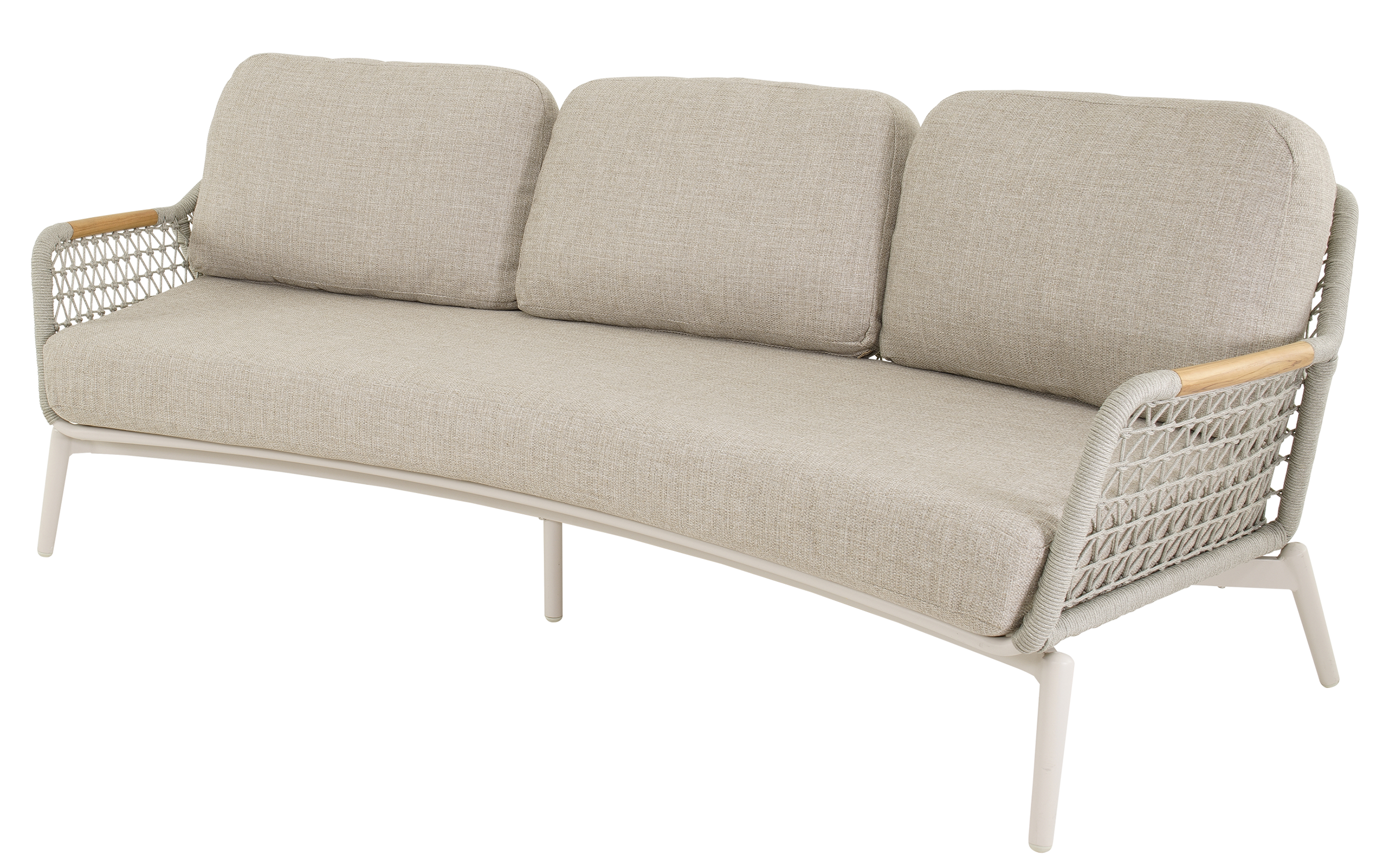 Sofa, fotele oraz stolik kawowy tworzą spójną całość, w której aluminium, teak i pleciony sznurek spotykają się z kamiennym blatem sintered stone. Jasna kolorystyka beżu nadaje zestawowi lekkości i sprawia, że doskonale prezentuje się w ogrodzie, na tarasie czy patio.