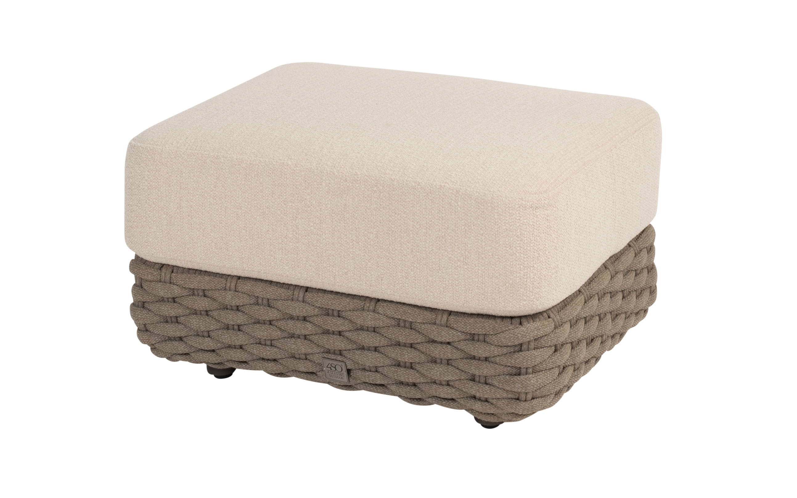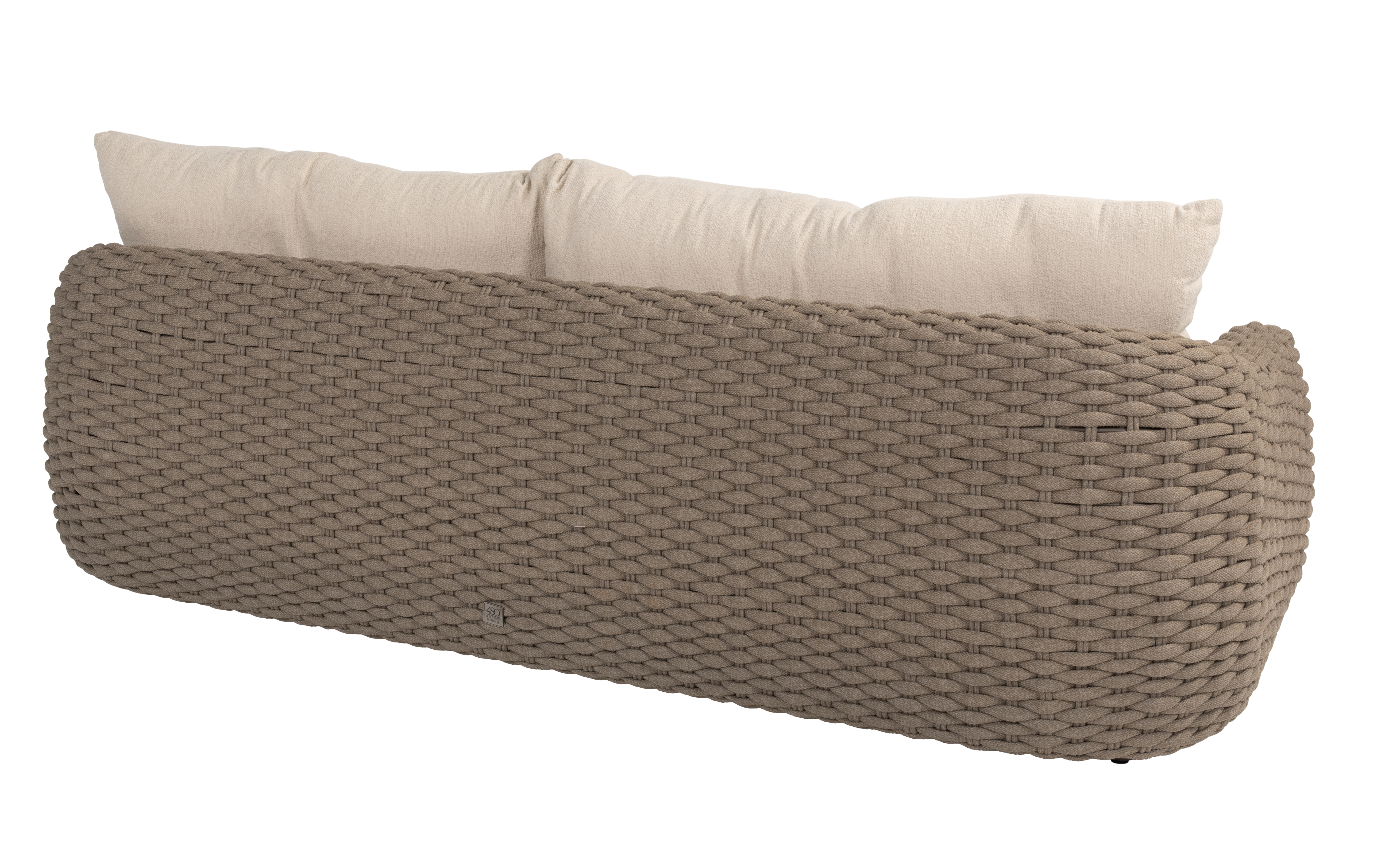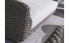 Siedzisko oplecione plecionką z liny polipropylenowej i pasów w formie rękawa z wypełnieniem nadającym wygląd przestrzenny.