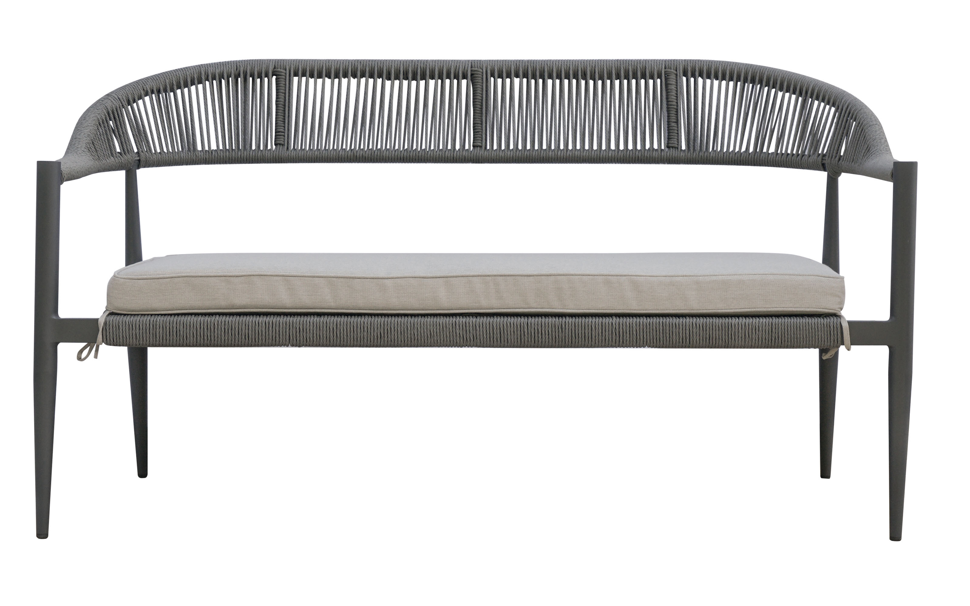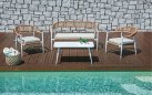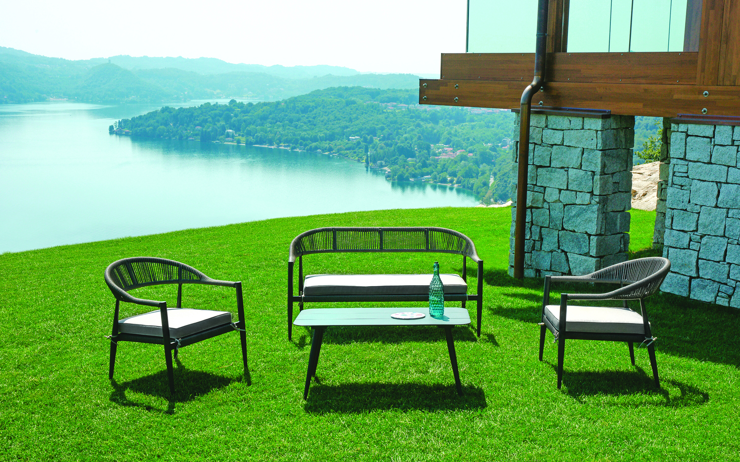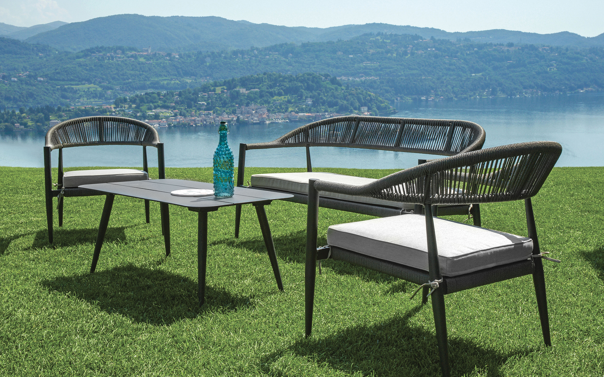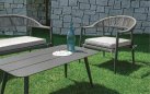 Konstrukcja z aluminium malowanego proszkowo. Siedziska i oparcia z technorattanu twist Ø5 mm. Blat stolika z dogi aluminiowych. Poduszki zdejmowane – kolor jasnoszary (antracyt) lub ecru (biały).