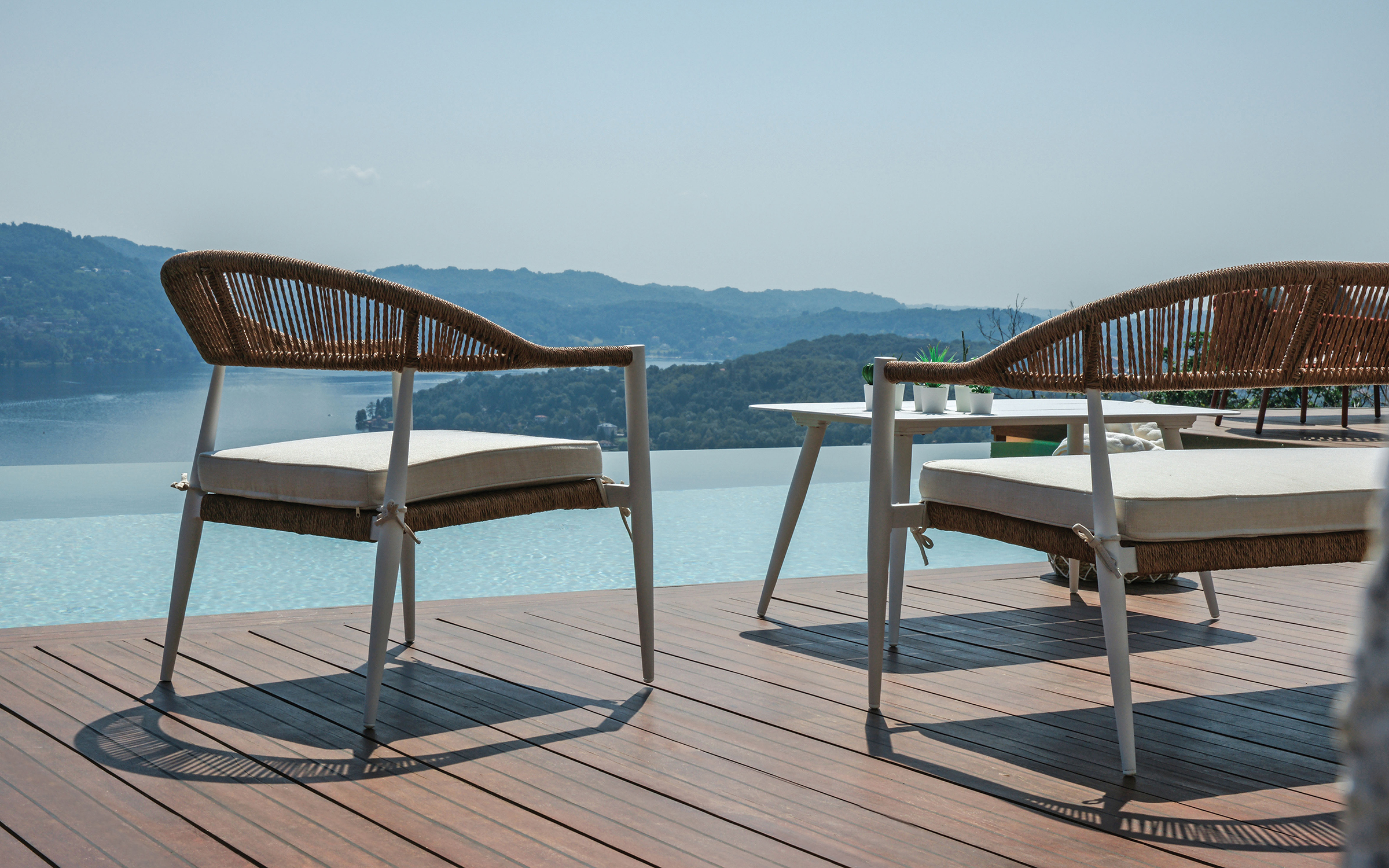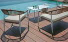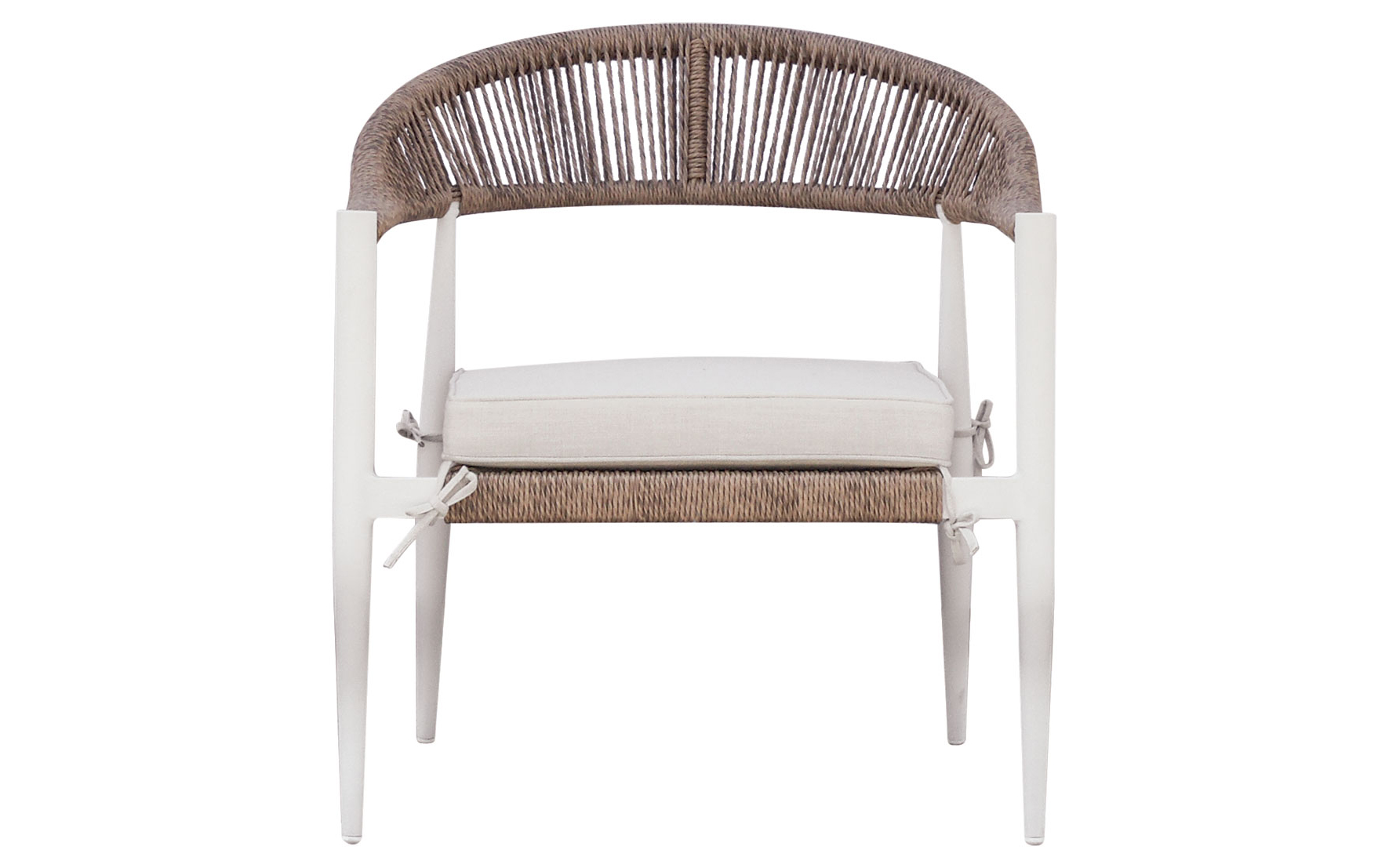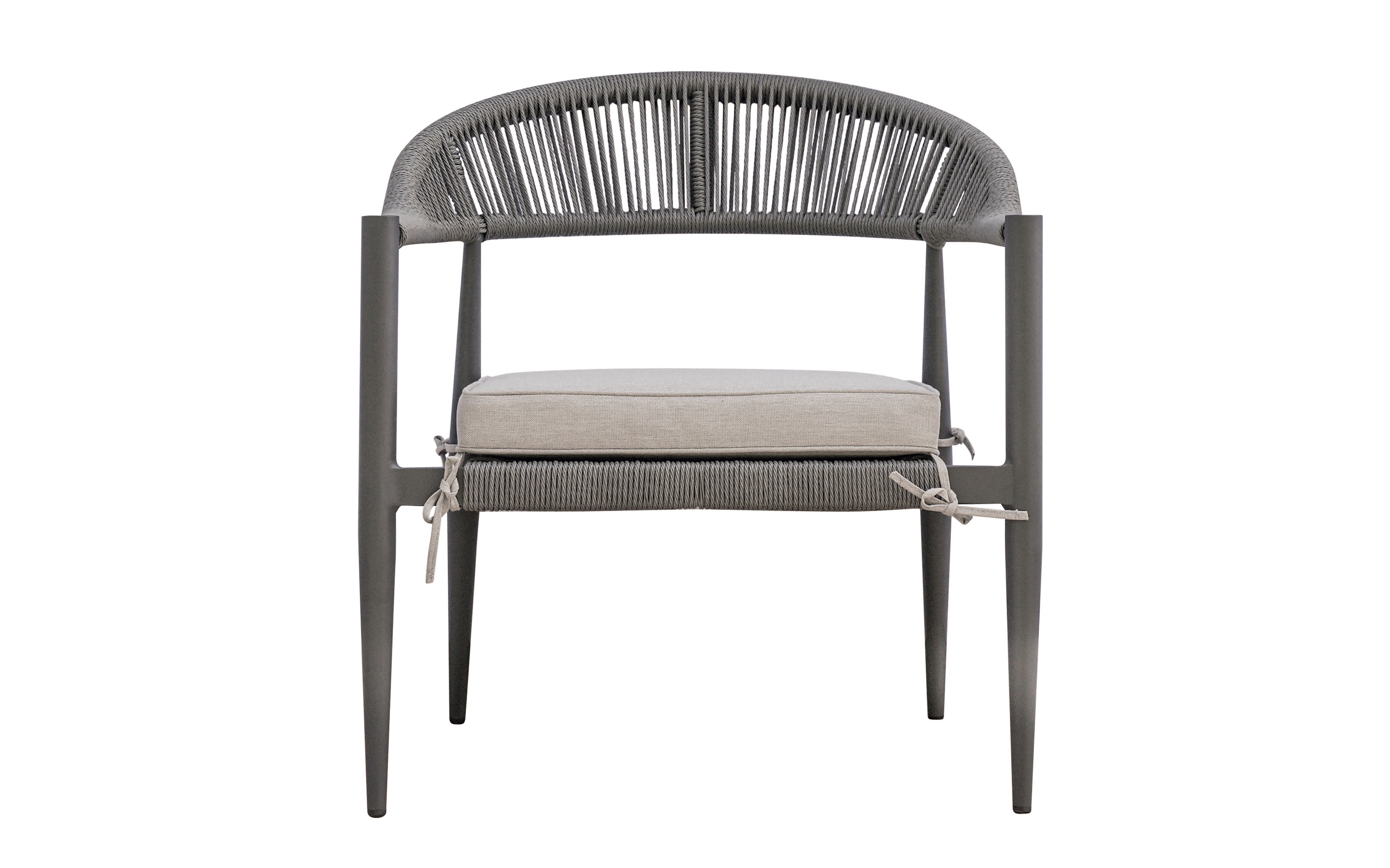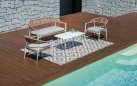 Konstrukcja z aluminium malowanego proszkowo. Siedziska i oparcia z technorattanu twist Ø5 mm. Blat stolika z dogi aluminiowych. Poduszki zdejmowane – kolor jasnoszary (antracyt) lub ecru (biały).