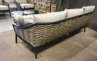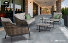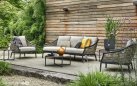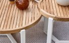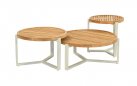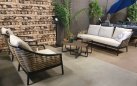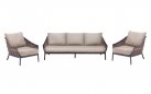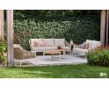 Zestaw wypoczynkowy MILOU to elegancka propozycja na taras lub do ogrodu, łącząca lekką konstrukcję aluminiową z oplotem z grubego trwałego technorattanu i dodatkami z drewna teak. Poduszki All Weather Bee Wett w kolorze piaskowym zapewniają komfort i odporność na warunki atmosferyczne. Uzupełnieniem zestawu jest komplet 3 okrągłych stolików kawowych z blatami z drewna teak.