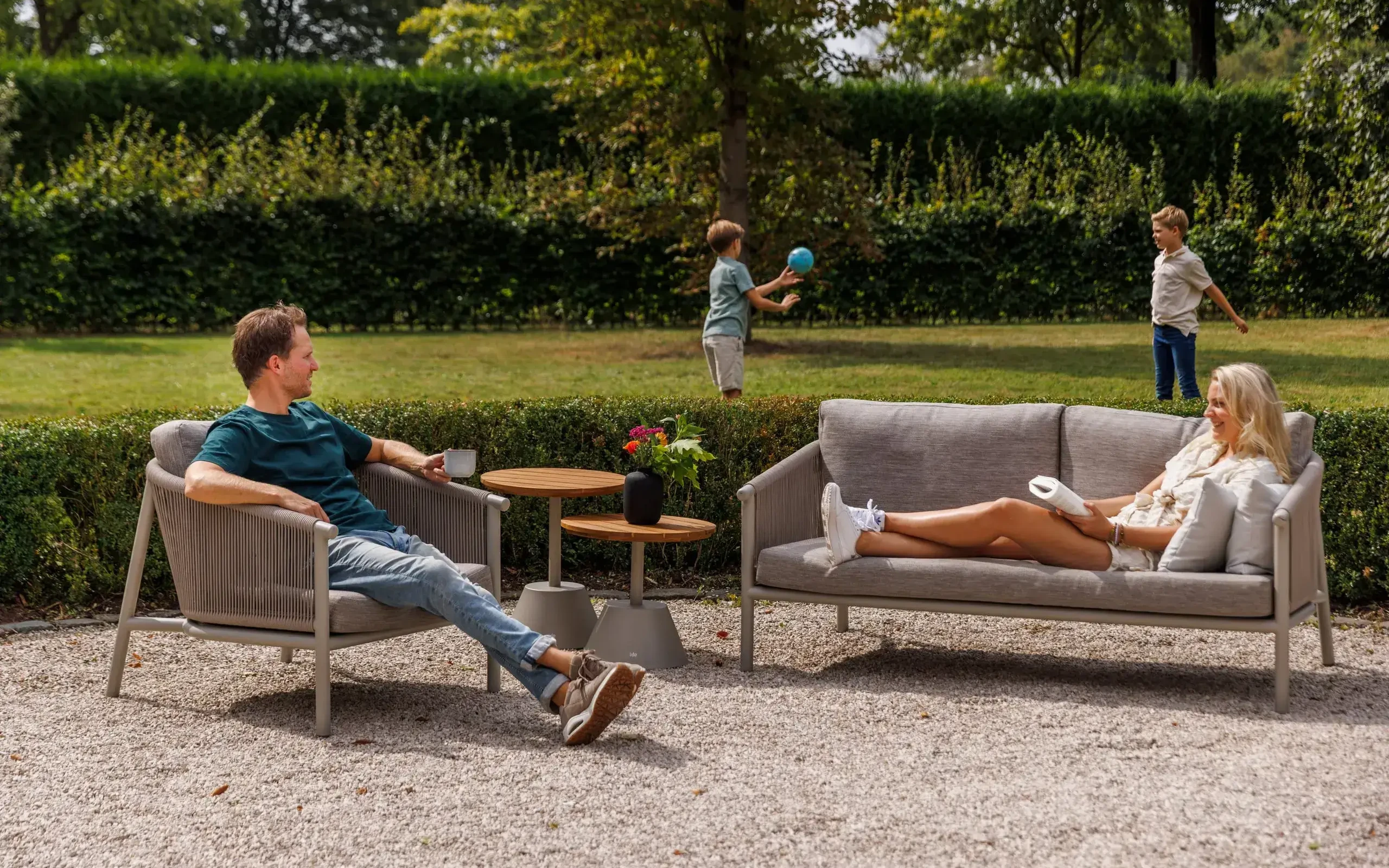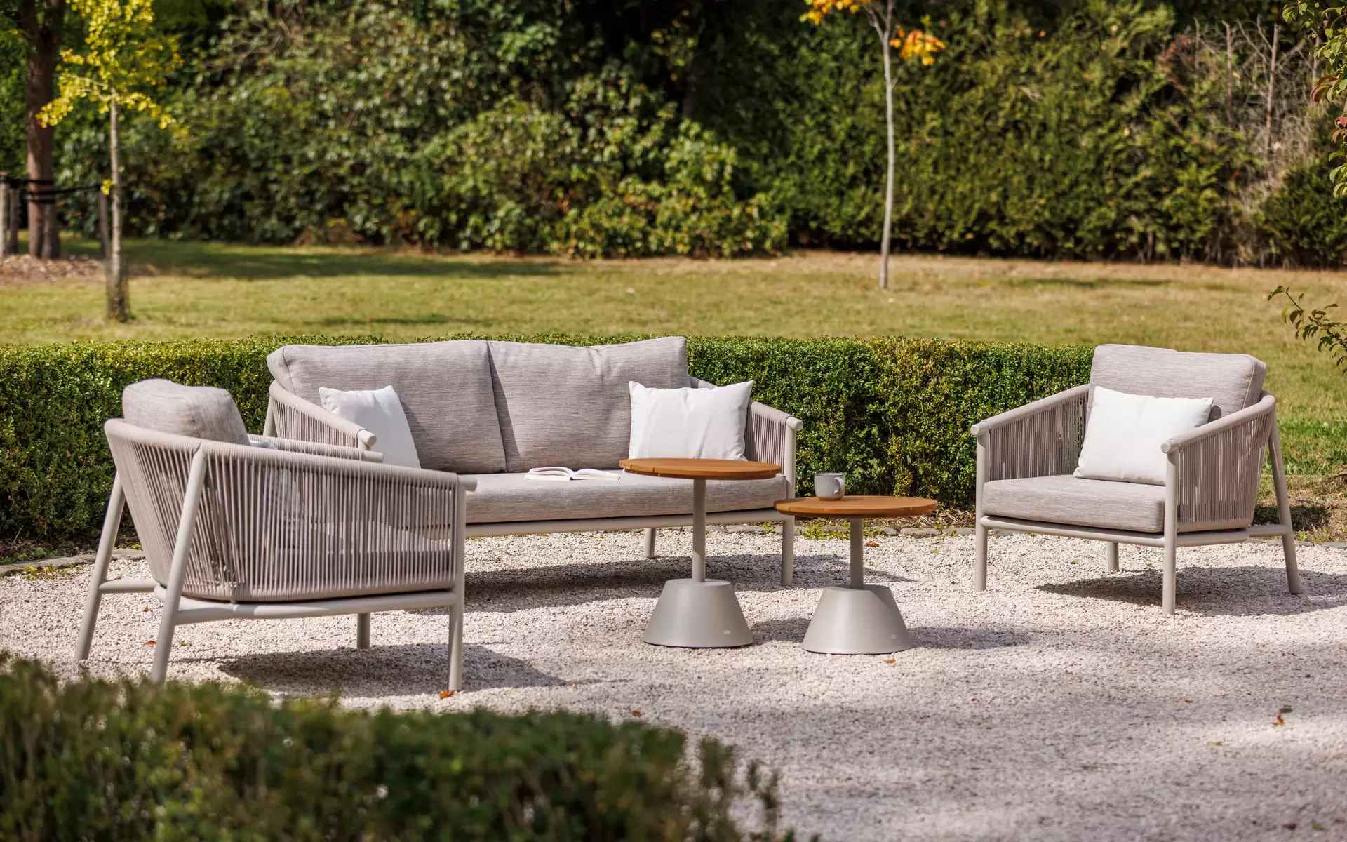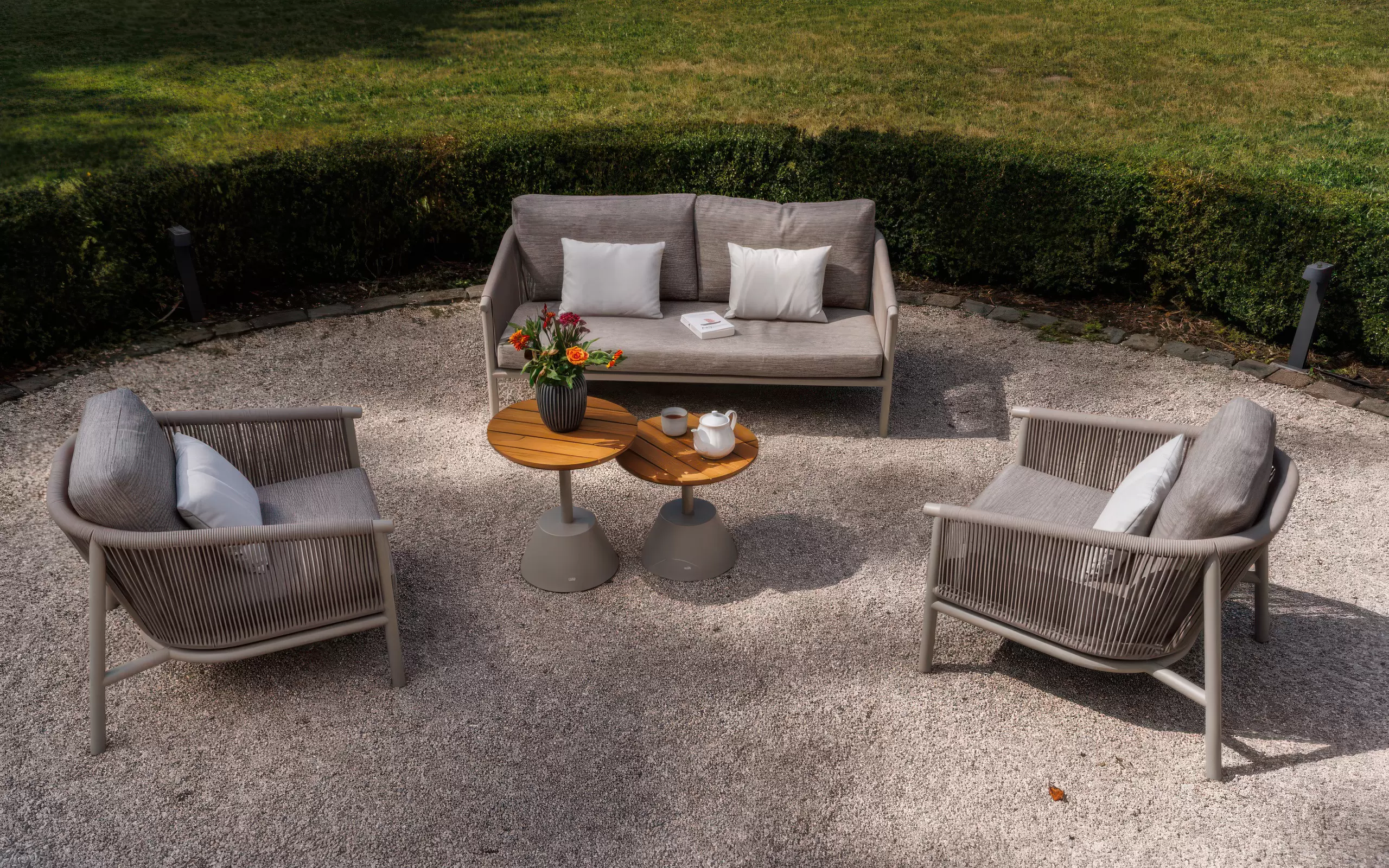 W skład zestawu wchodzi sofa 2.5-osobowa, dwa obszerne fotele oraz duet okrągłych stolików kawowych. Sercem stolików są blaty wykonane z selekcjonowanego drewna teakowego, które nie tylko przyciąga wzrok naturalnym usłojeniem, ale stanowi o trwałości zestawu. Konstrukcja mebli opiera się na lekkim, a zarazem wyjątkowo sztywnym stopie aluminium malowanego proszkowo, co eliminuje problem korozji i ułatwia rearanżację przestrzeni.