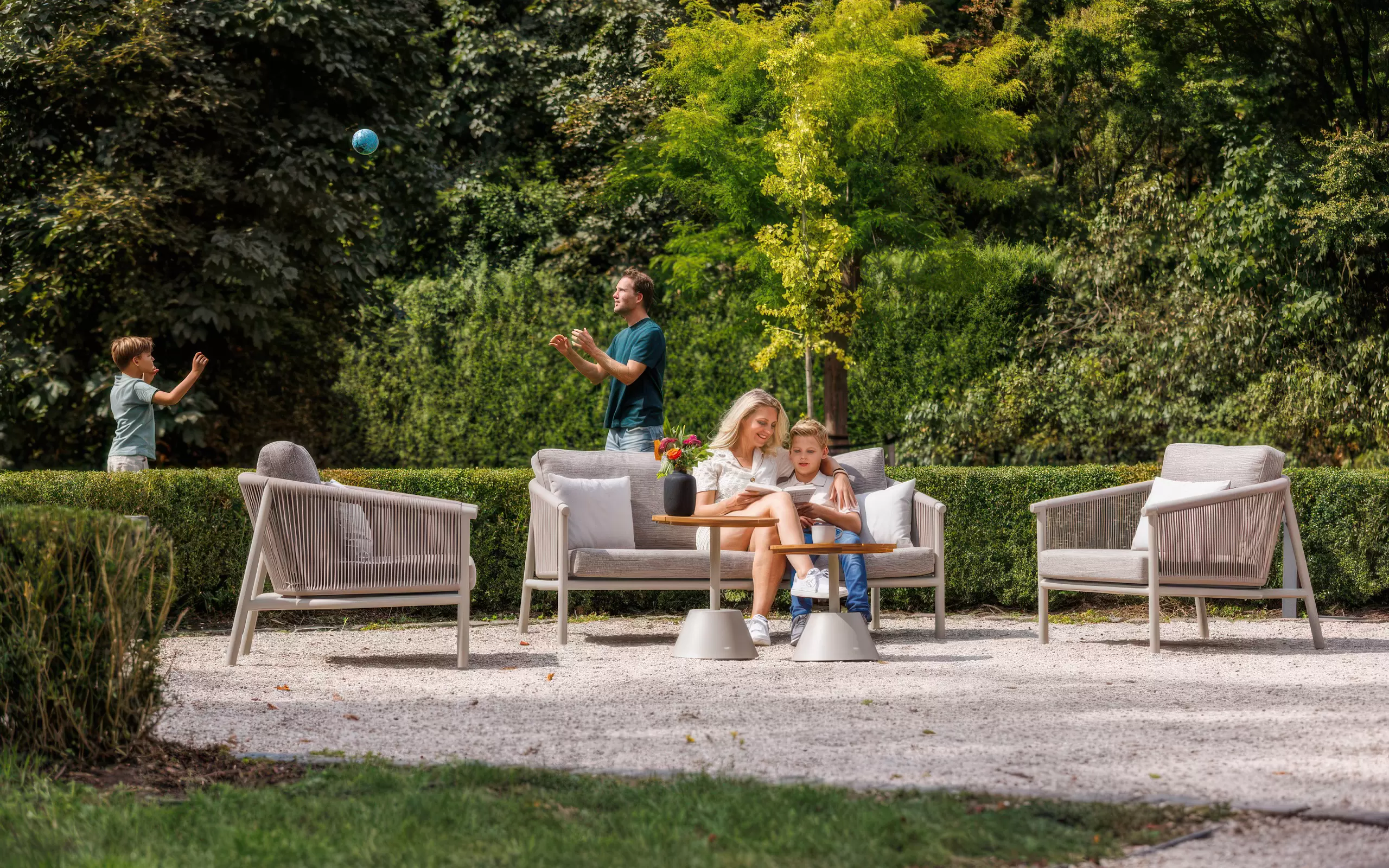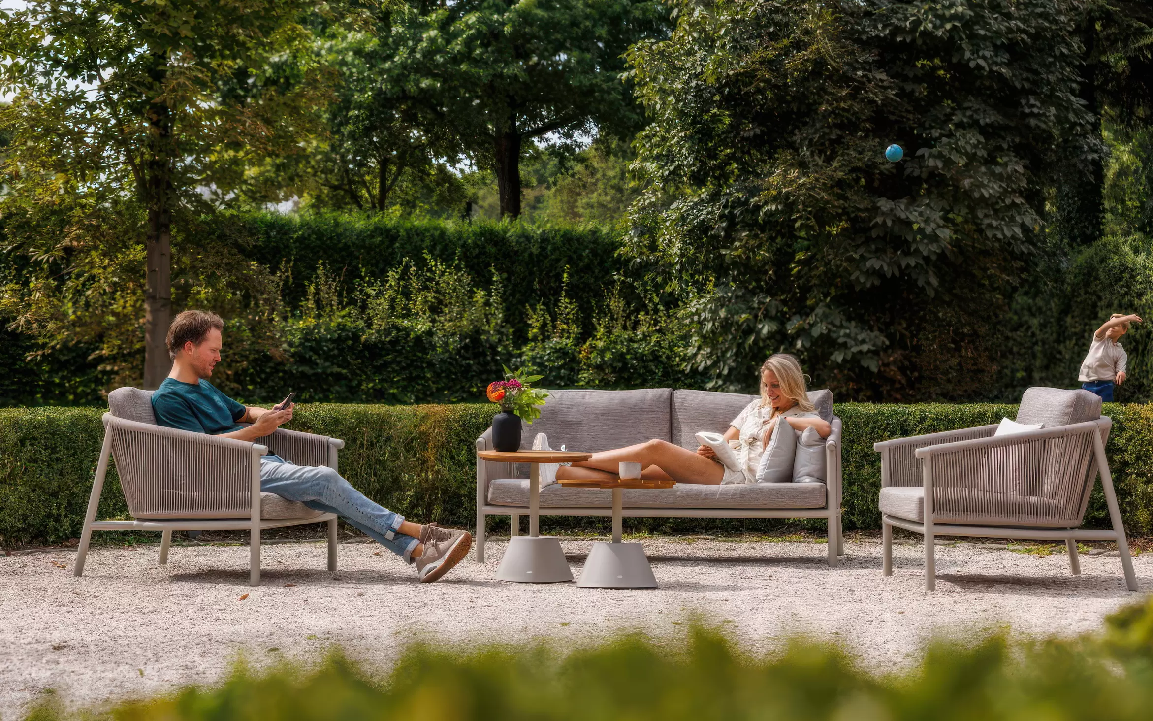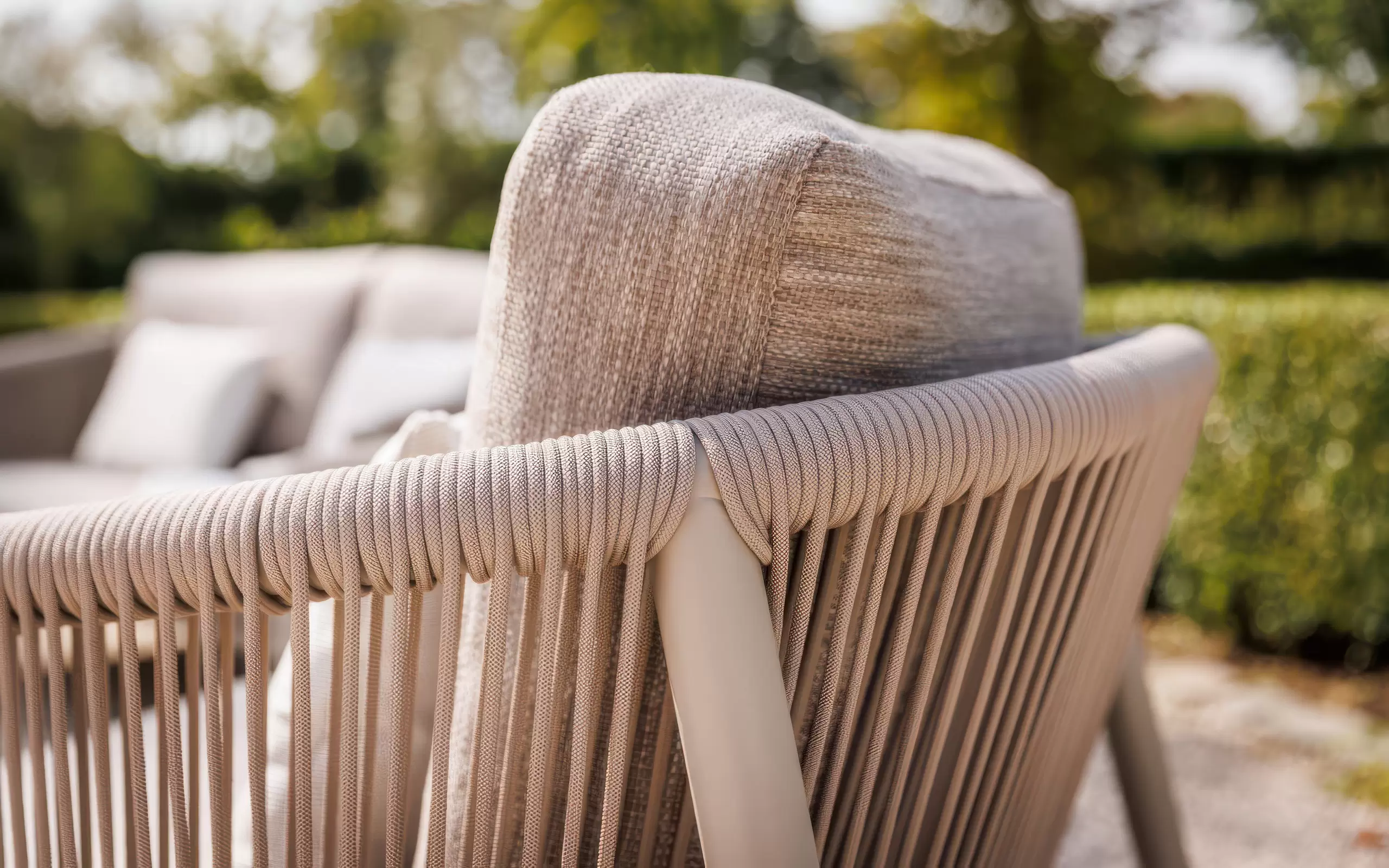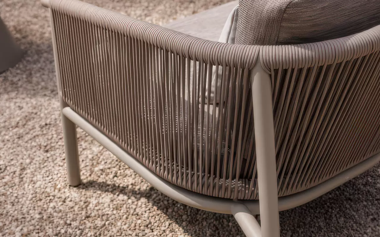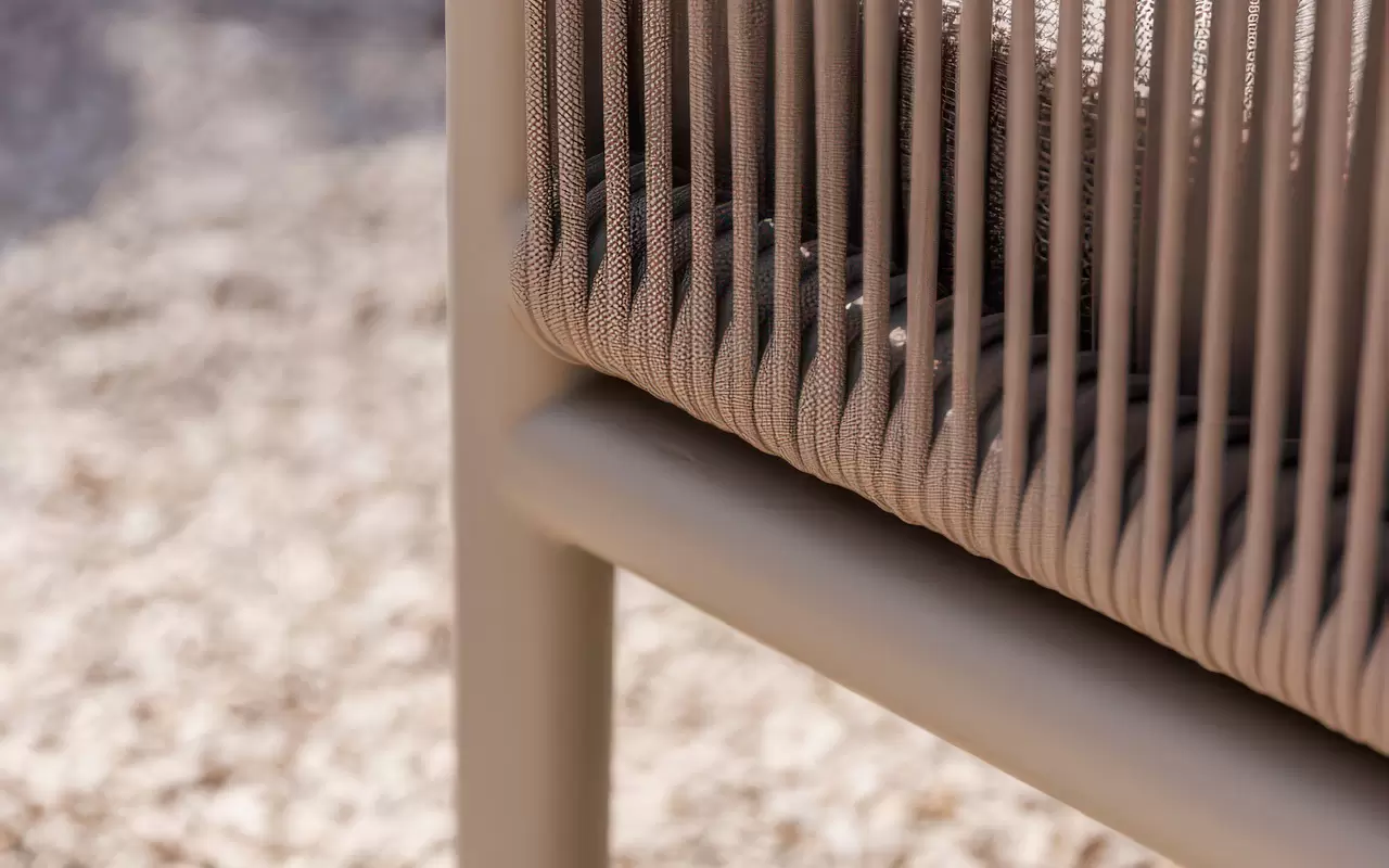 Subtelnym, designerskim akcentem są oparcia wykończone plecionką z lin technicznych. Nadają one bryle wizualnej lekkości i zapewniają stały przepływ powietrza. Komfort wypoczynku potęgują poduszki w tkaninie Soltex – materiale, który w dotyku przypomina szlachetne tkaniny wnętrzarskie, oferując jednocześnie pełną barierowość wobec wilgoci, promieniowania UV oraz zabrudzeń.