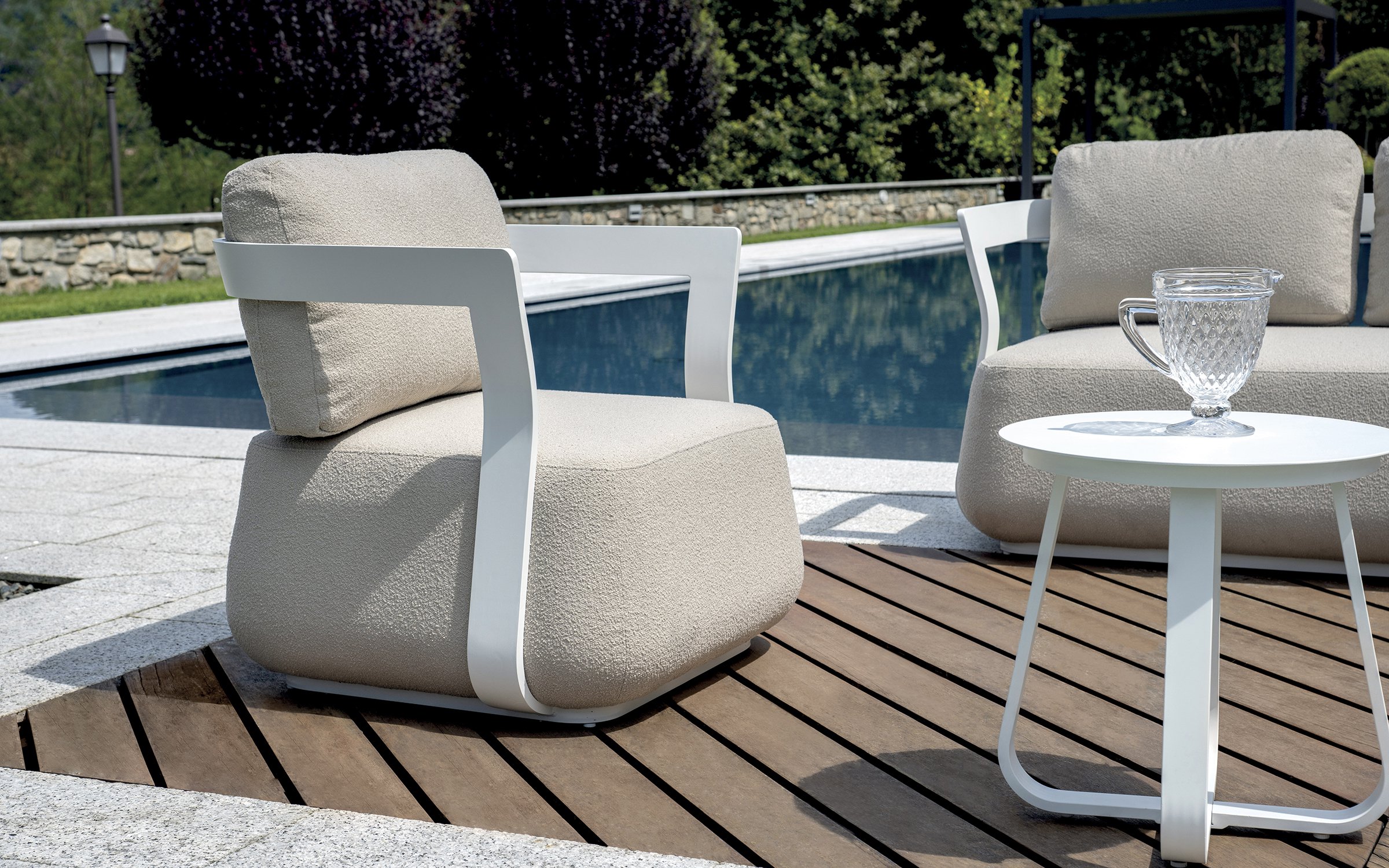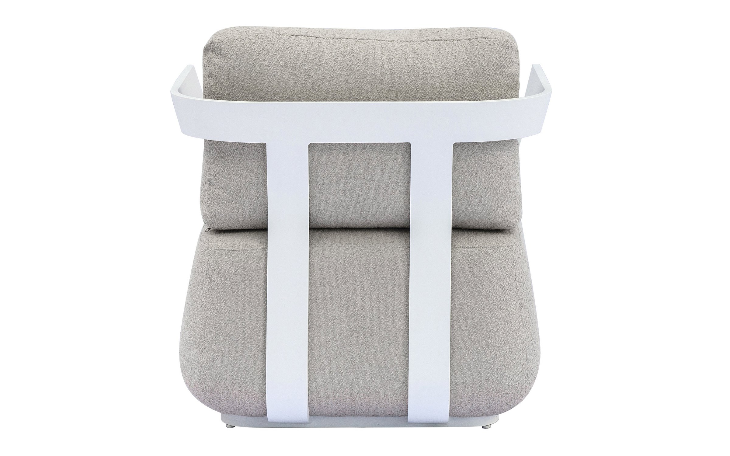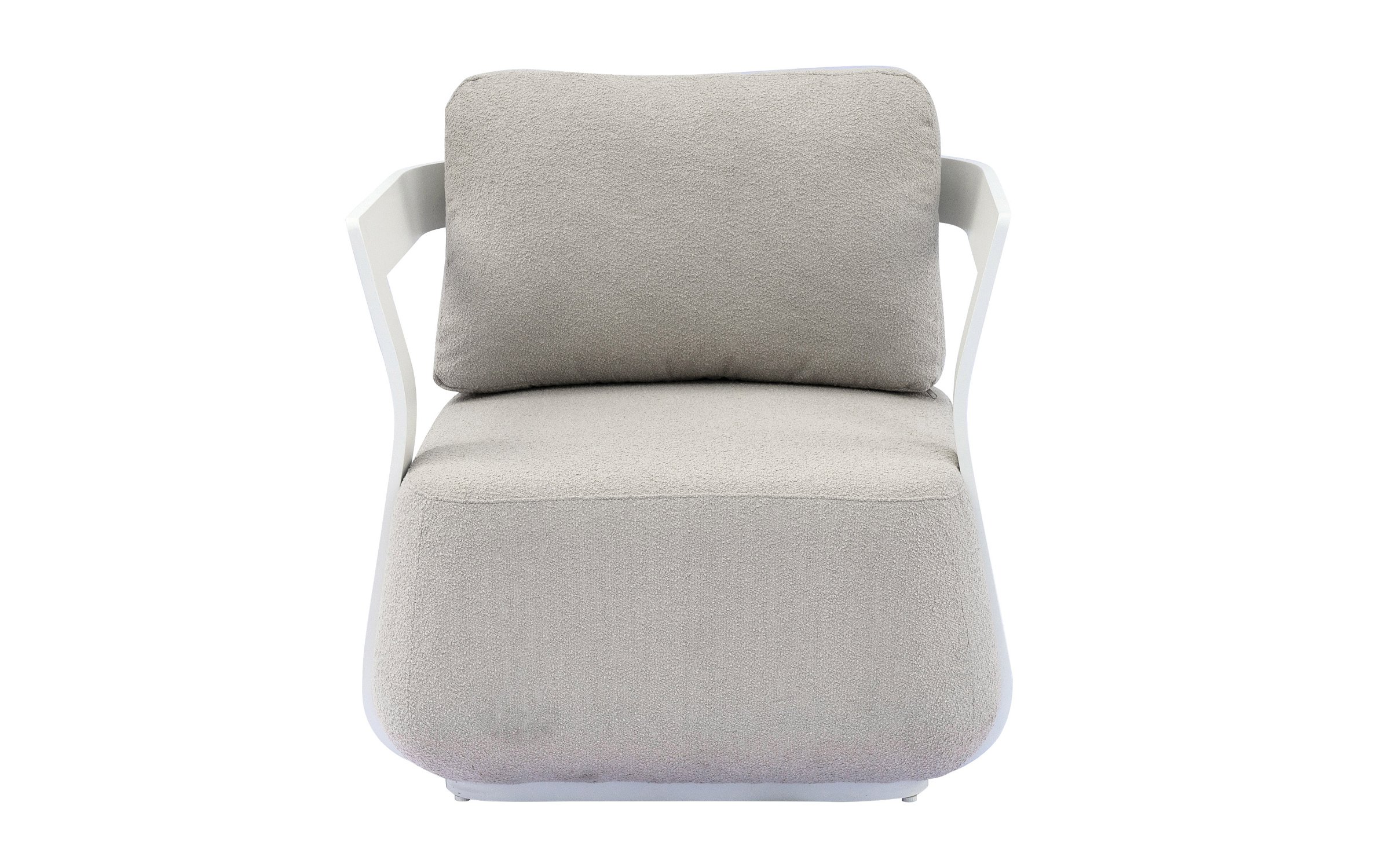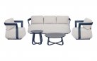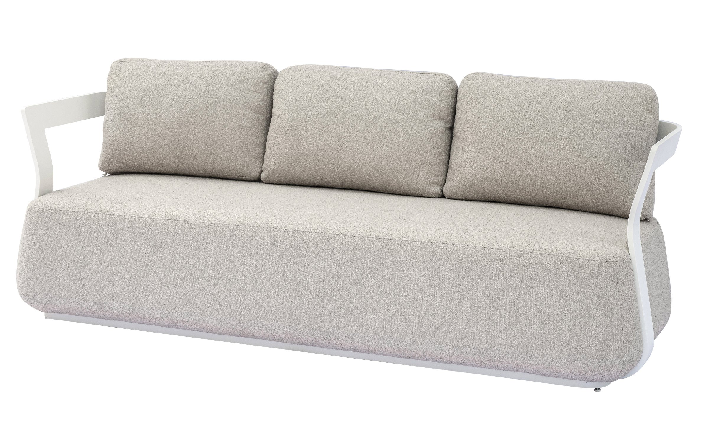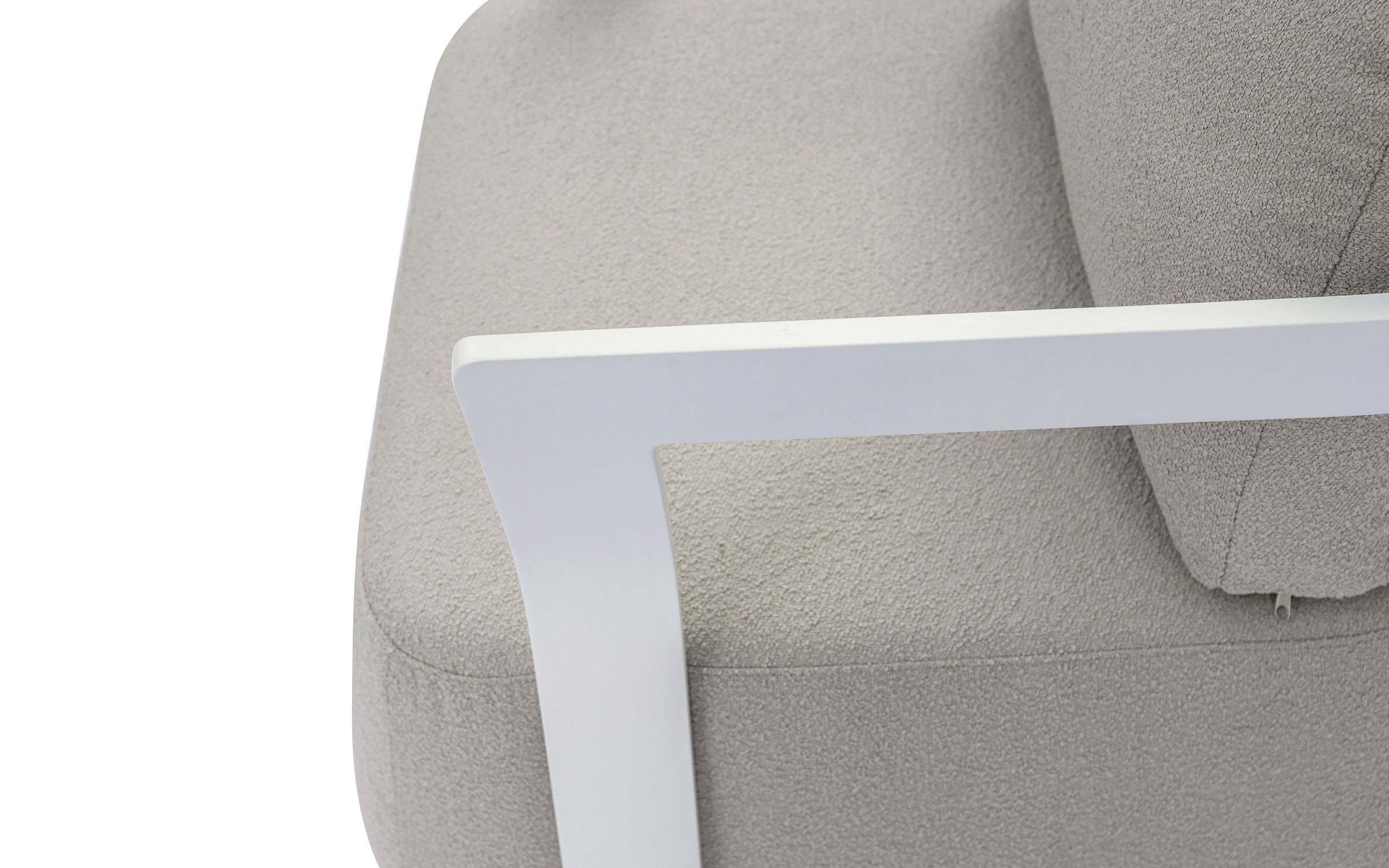 Konstrukcja z aluminium malowanego proszkowo w kolorze białym lub granatowym. Blaty stolików z aluminium. Poduszki zdejmowane wykonane z tkaniny Olefin typu Bouclé.