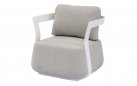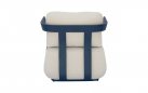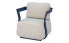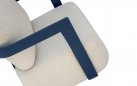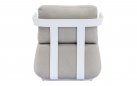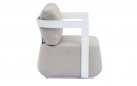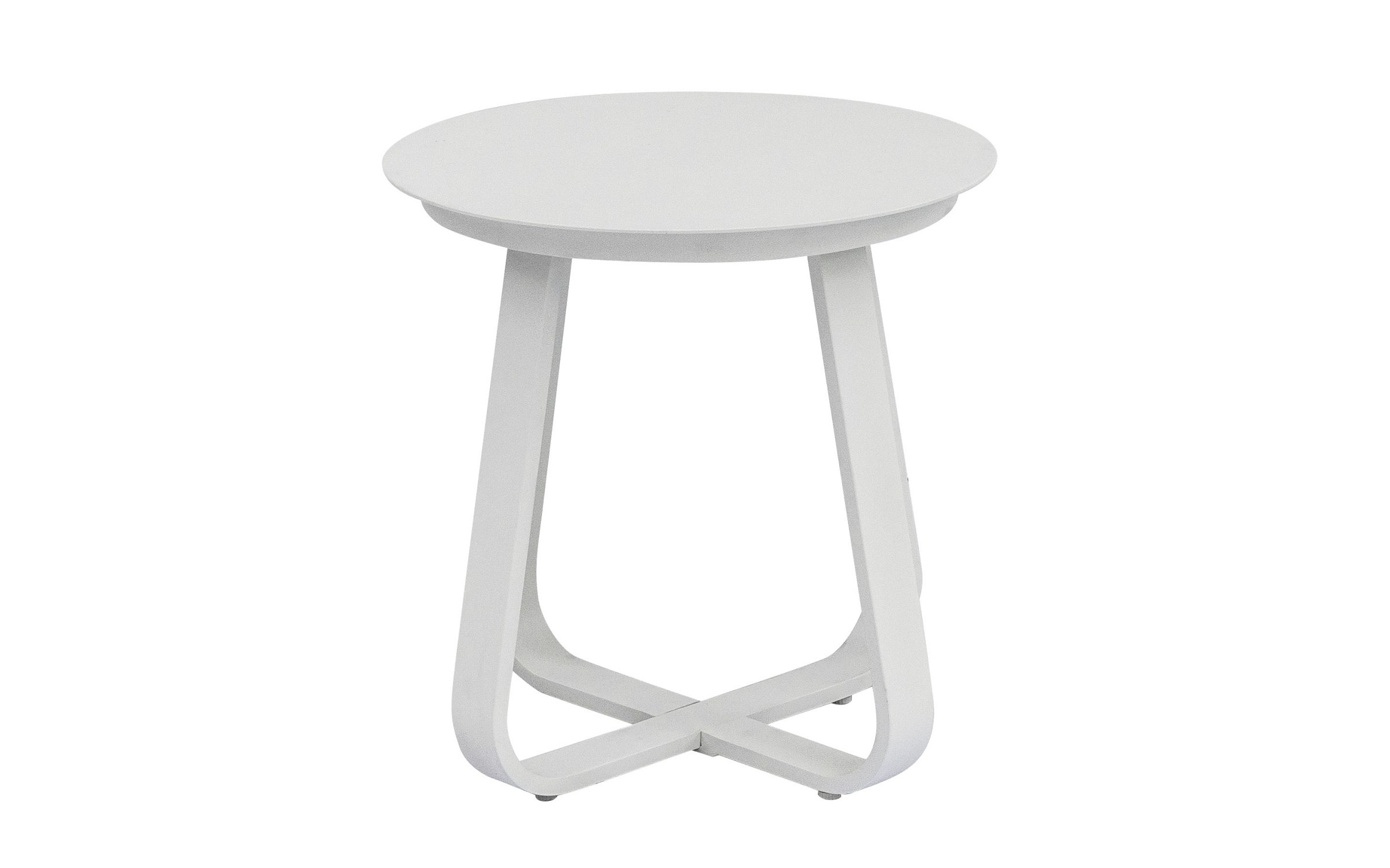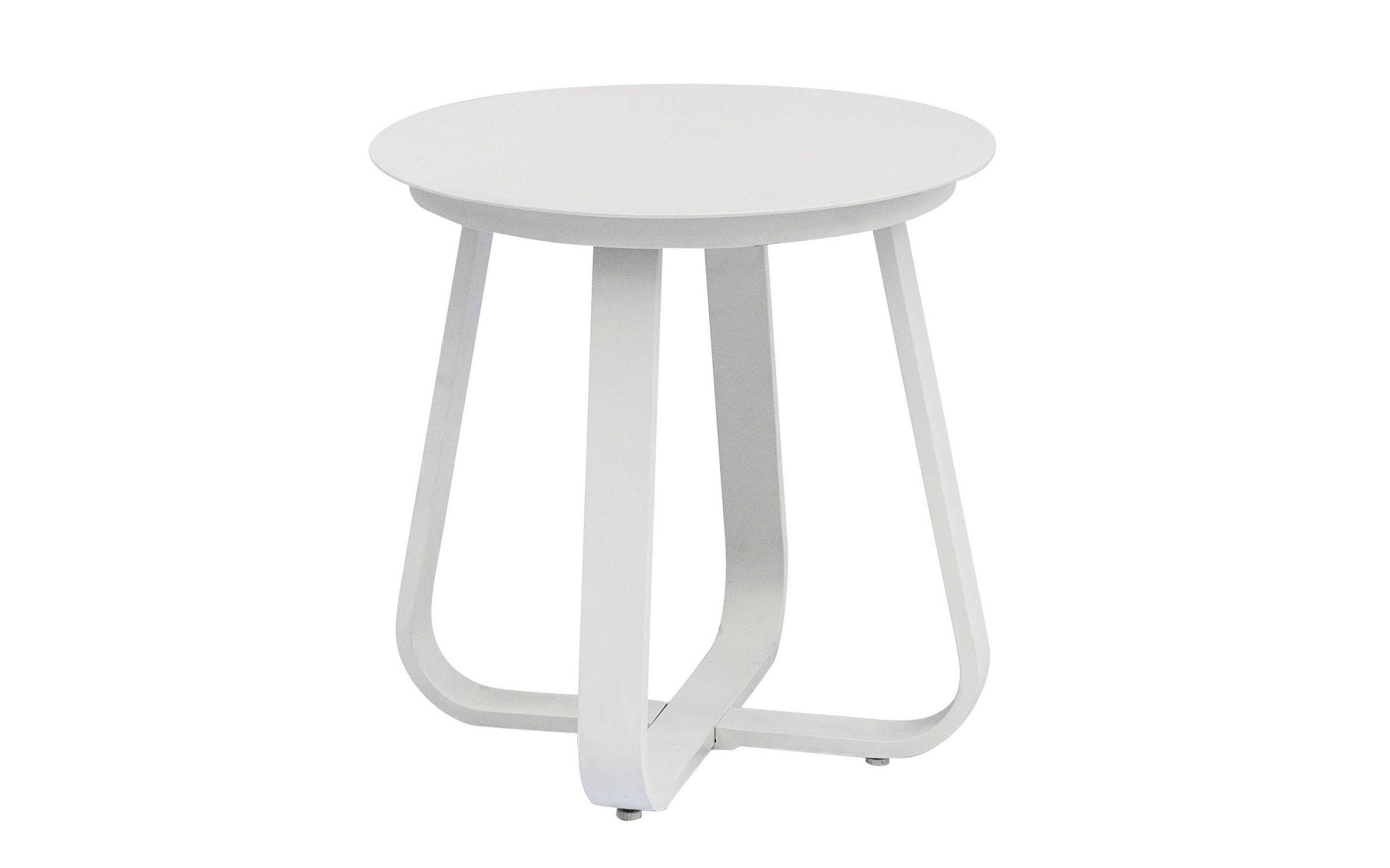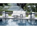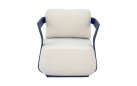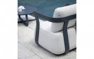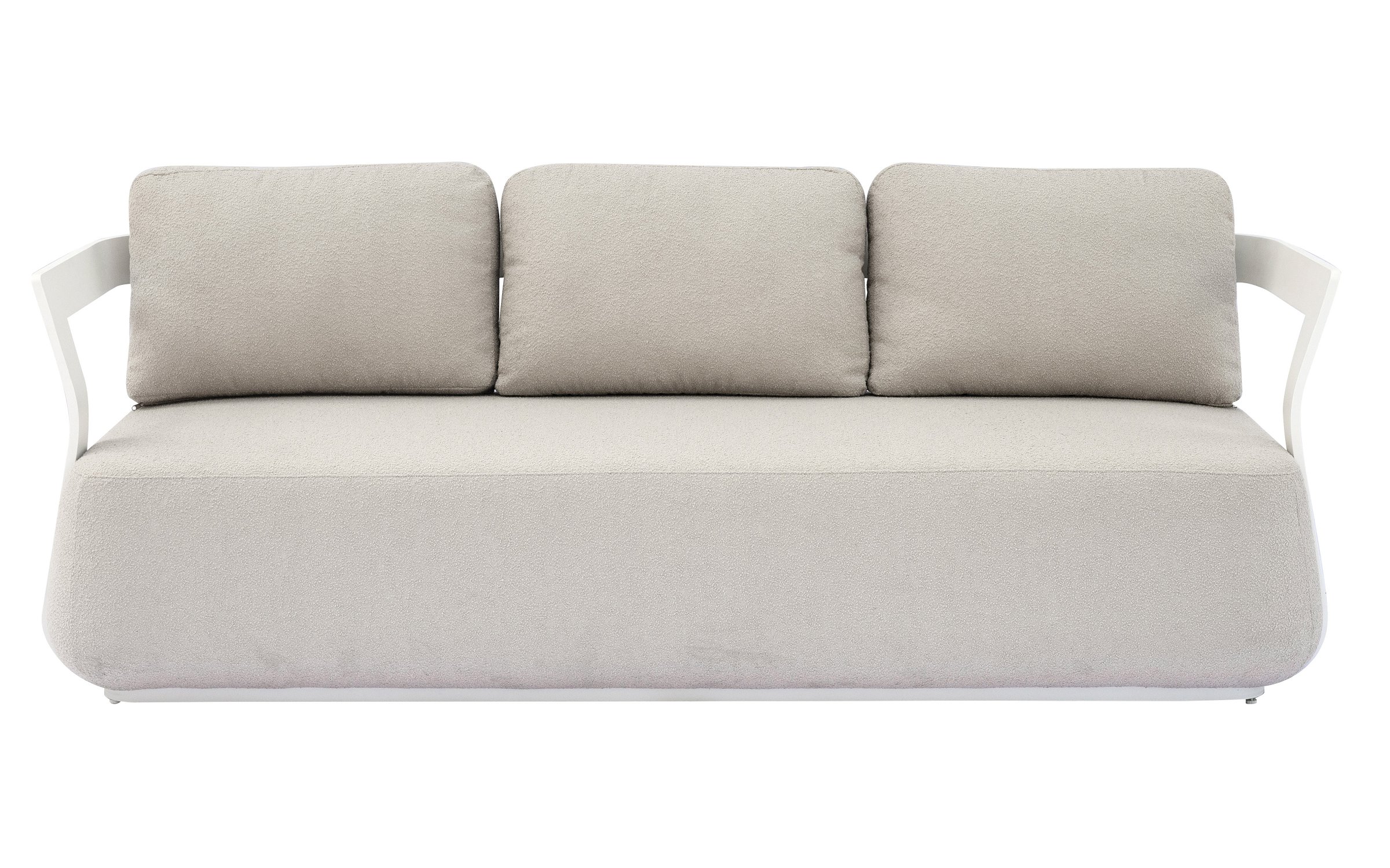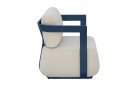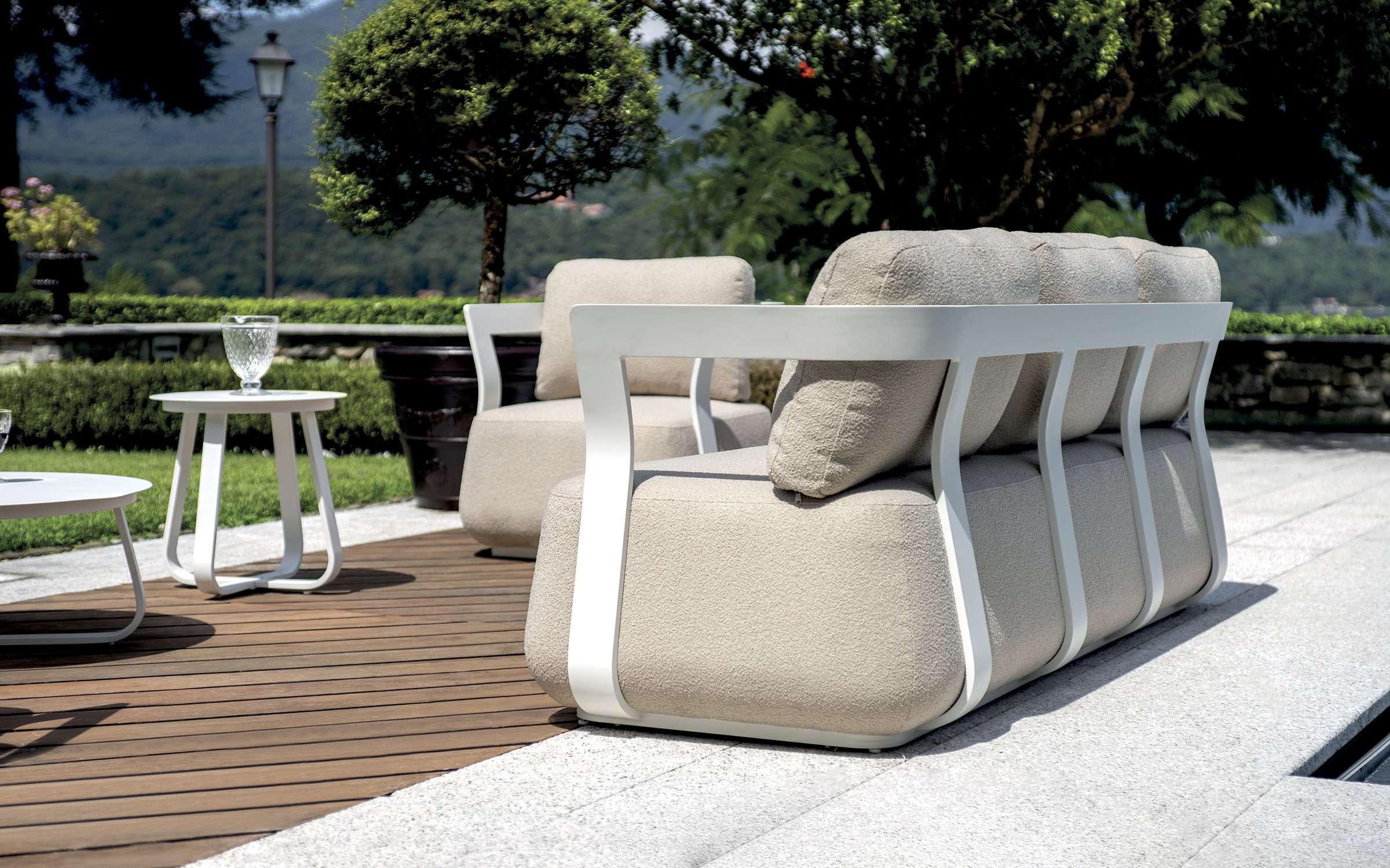 Konstrukcja z aluminium malowanego proszkowo w kolorze białym lub granatowym. Blaty stolików z aluminium. Poduszki zdejmowane wykonane z tkaniny Olefin typu Bouclé.