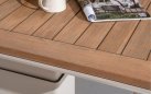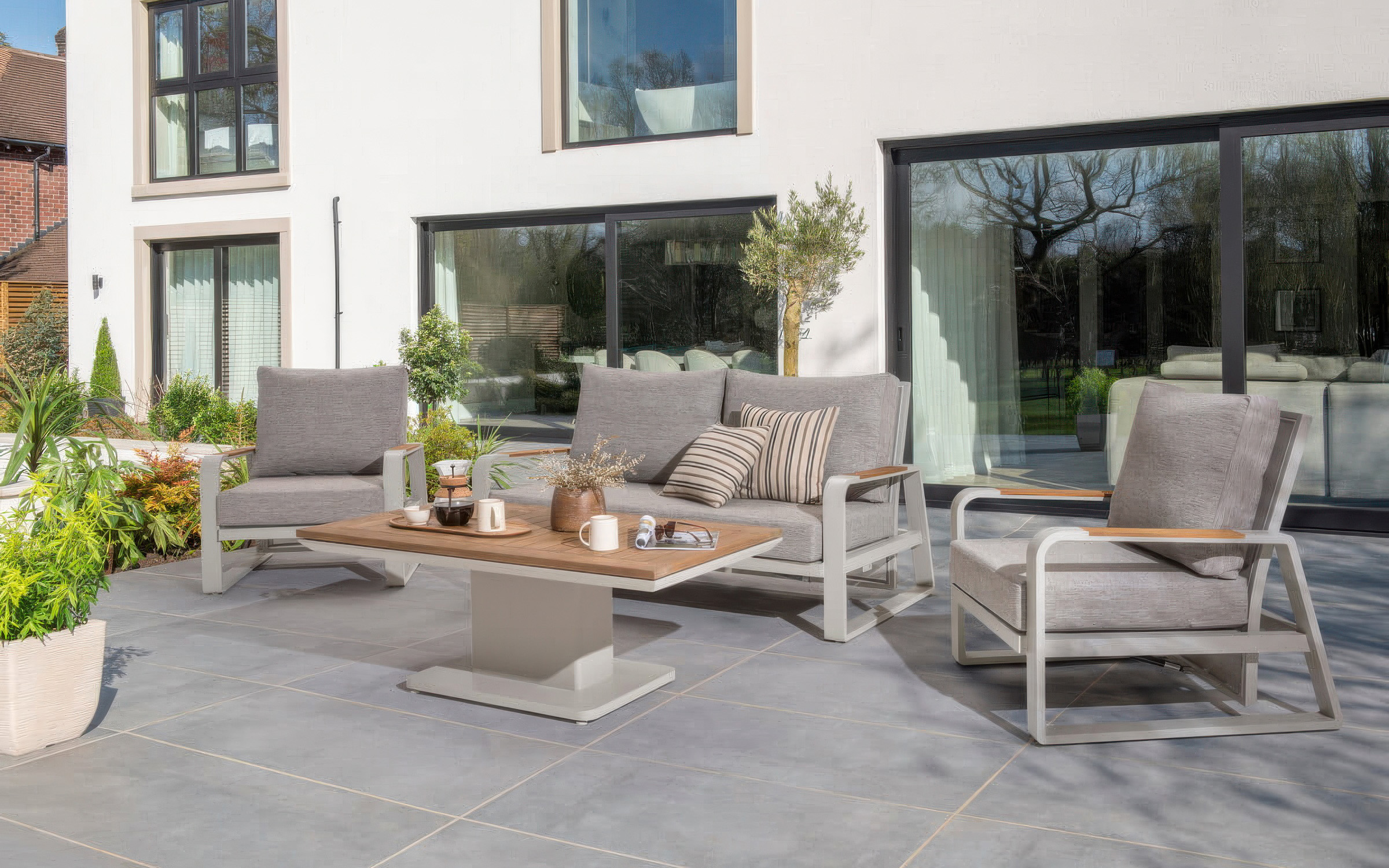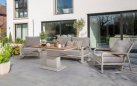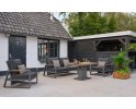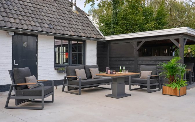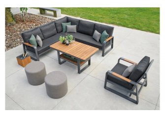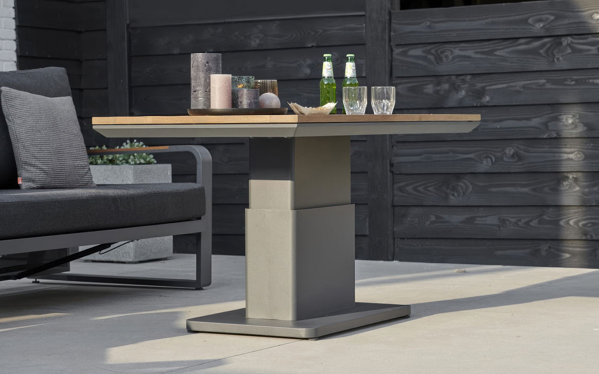 Zestaw składa się z wygodnej sofy i dwóch foteli, które posiadają regulowane oparcia. Dzięki temu możesz dostosować ich pozycję do swoich potrzeb i cieszyć się maksymalnym komfortem podczas relaksu. W komplecie znajduje się również praktyczny stolik kawowy z blatem z drewna teakowego, które słynie ze swojej trwałości i odporności na warunki atmosferyczne. Stolik posiada funkcję płynnej regulacji wysokości, co czyni go idealnym do różnych zastosowań - od wygodnego spożywania posiłków po pracę na laptopie.