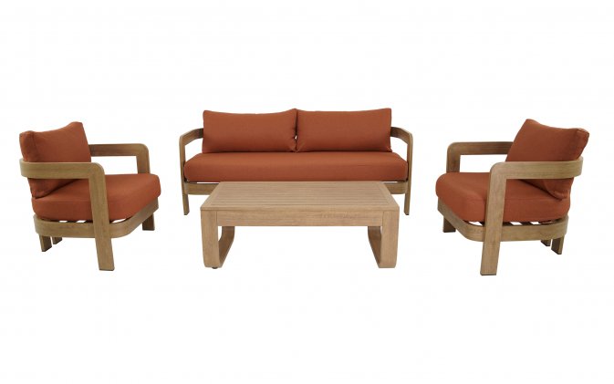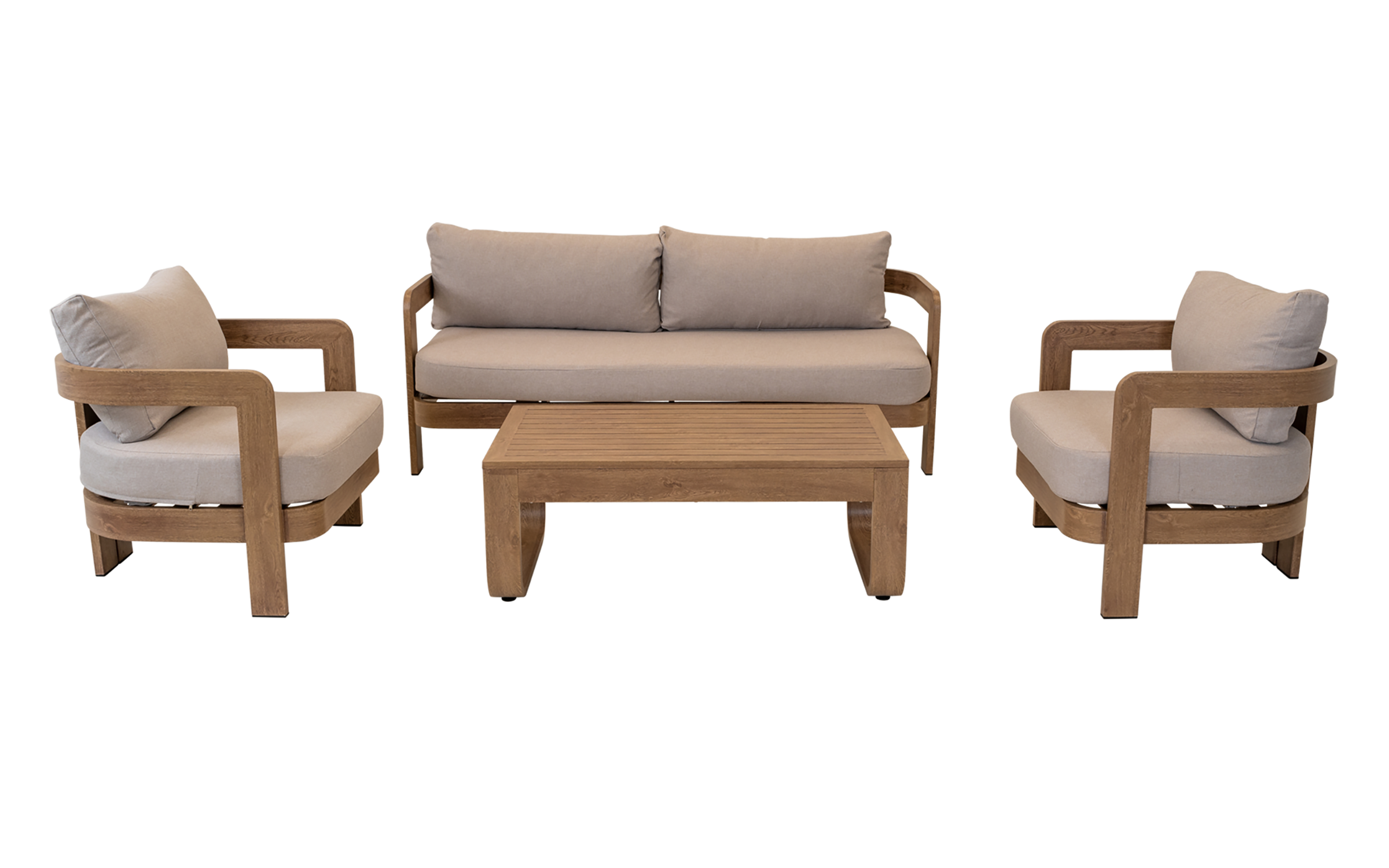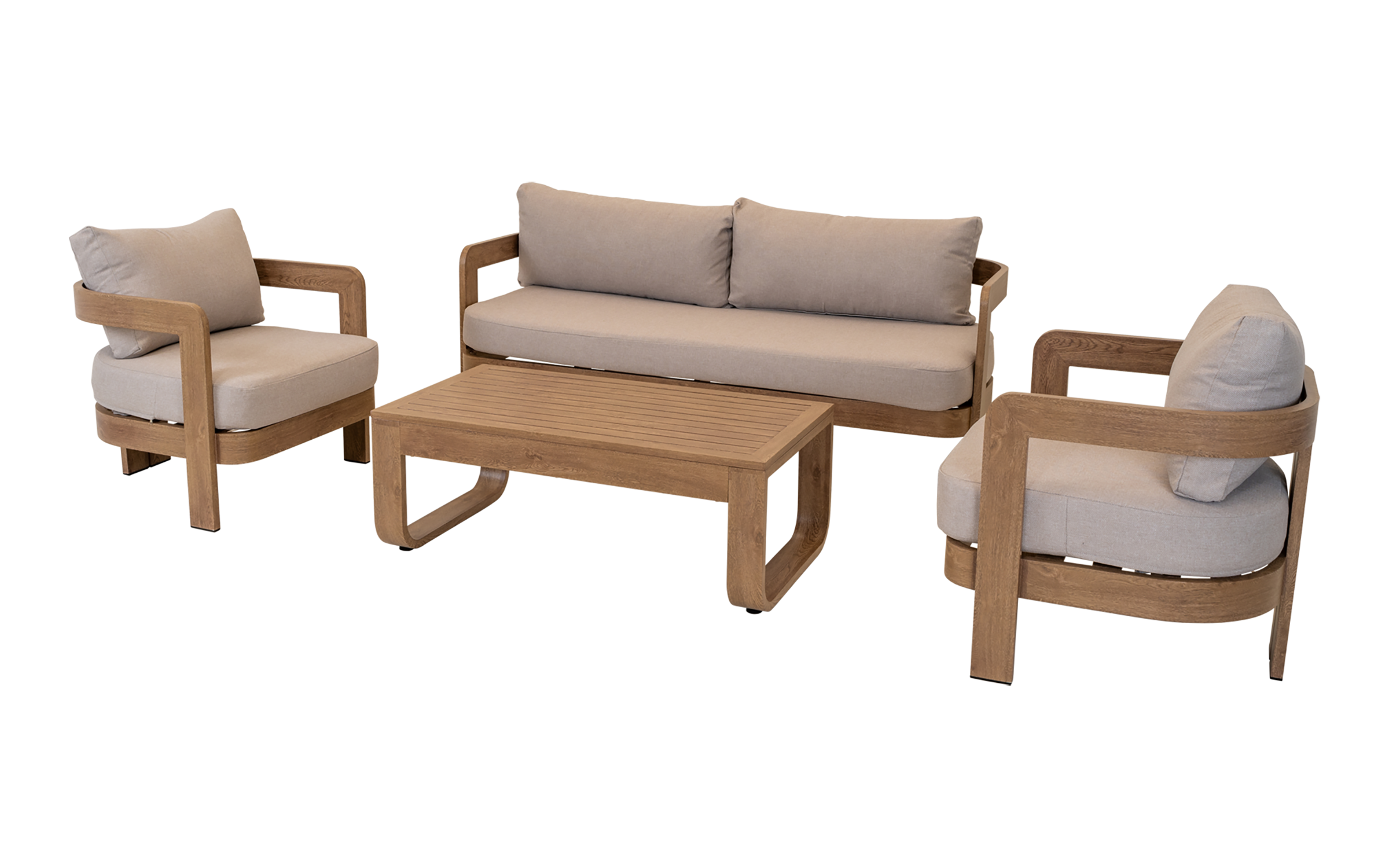 Zestaw wypoczynkowy MYLO marki LesliLiving to elegancka i funkcjonalna propozycja dla strefy relaksu na tarasie lub w ogrodzie. W skład zestawu wchodzi sofa 2‑osobowa, dwa fotele oraz stolik kawowy. Konstrukcja wykonana z aluminium w wykończeniu woodlook zapewnia trwałość i odporność na warunki atmosferyczne, a jednocześnie nadaje meblom naturalny charakter.