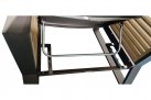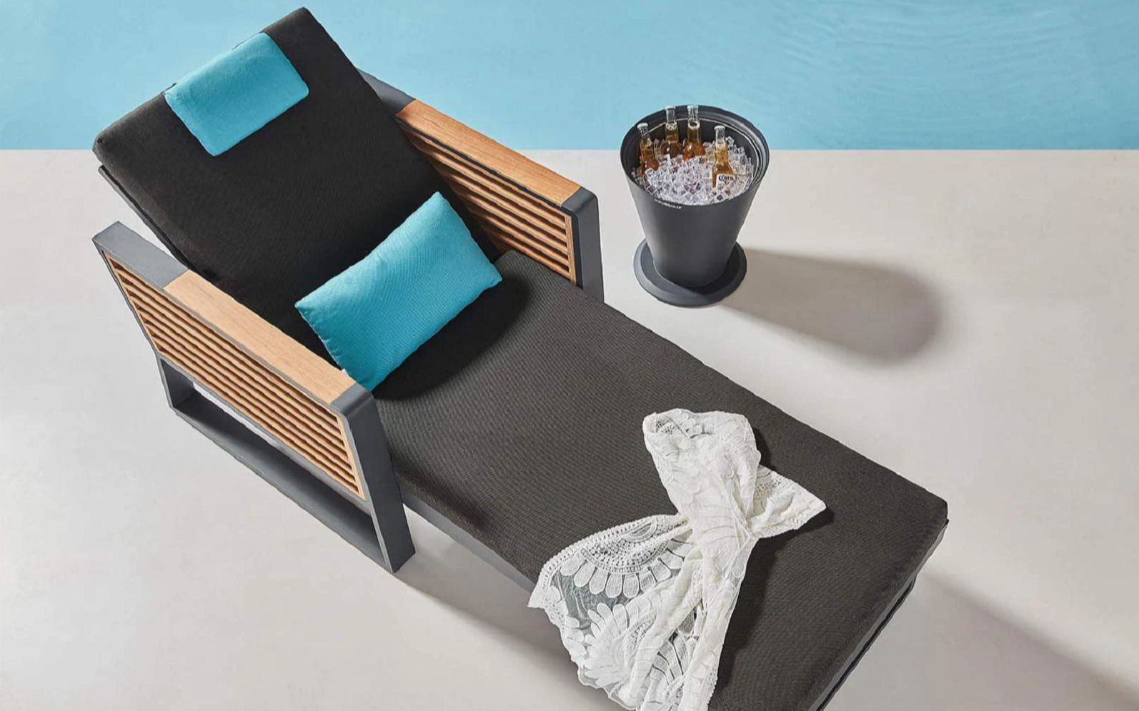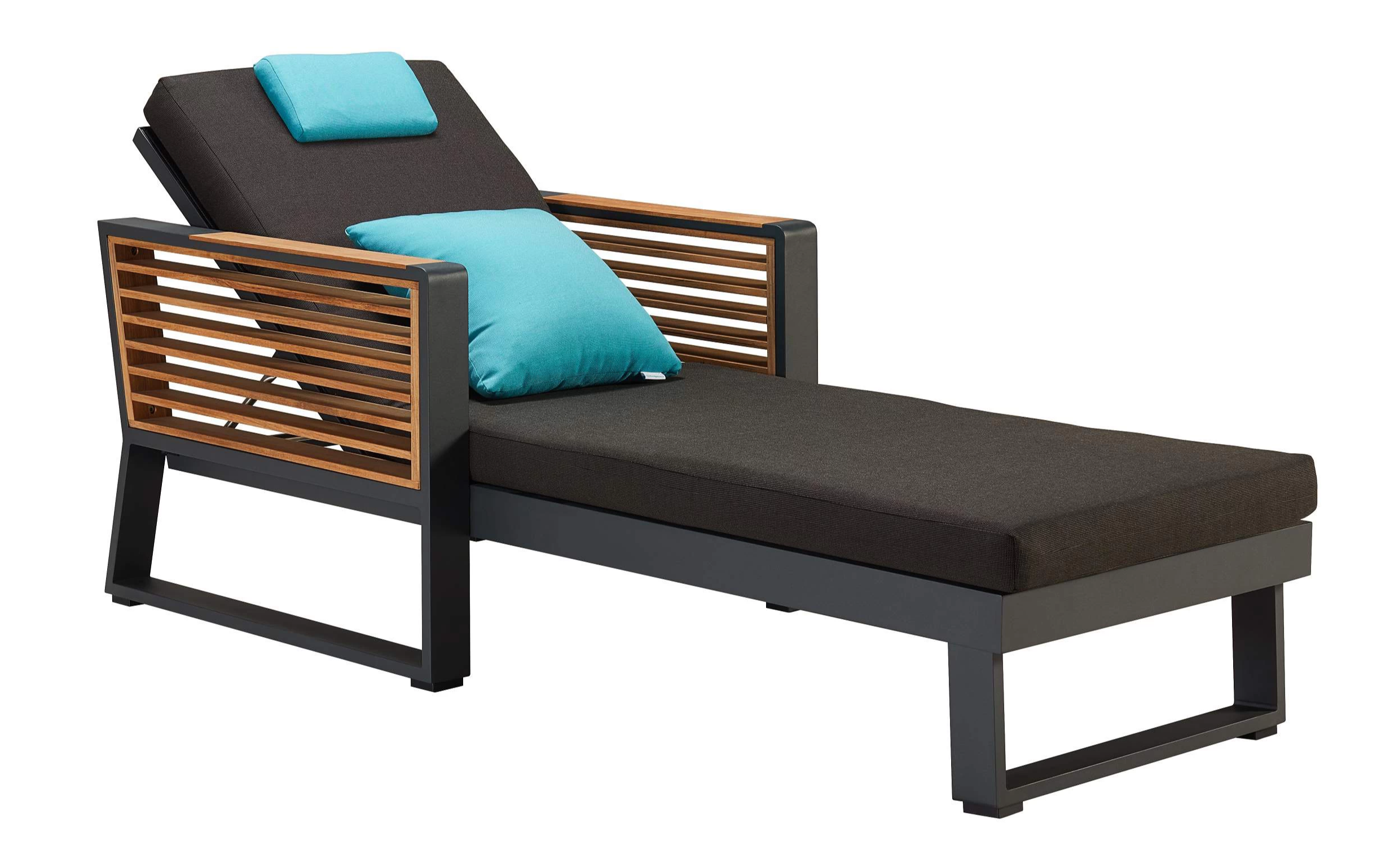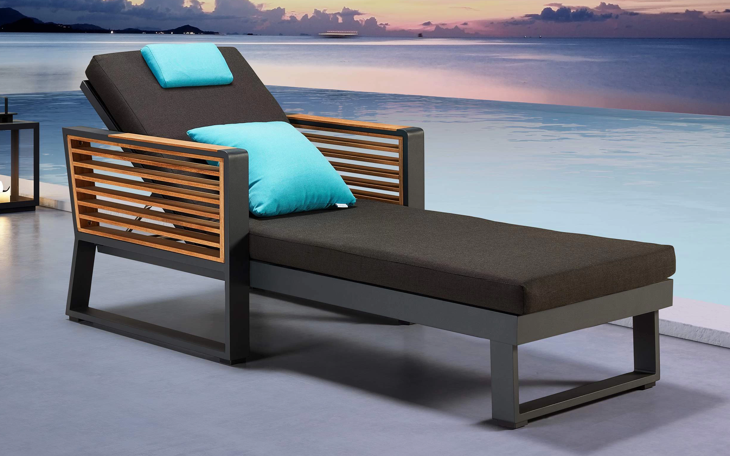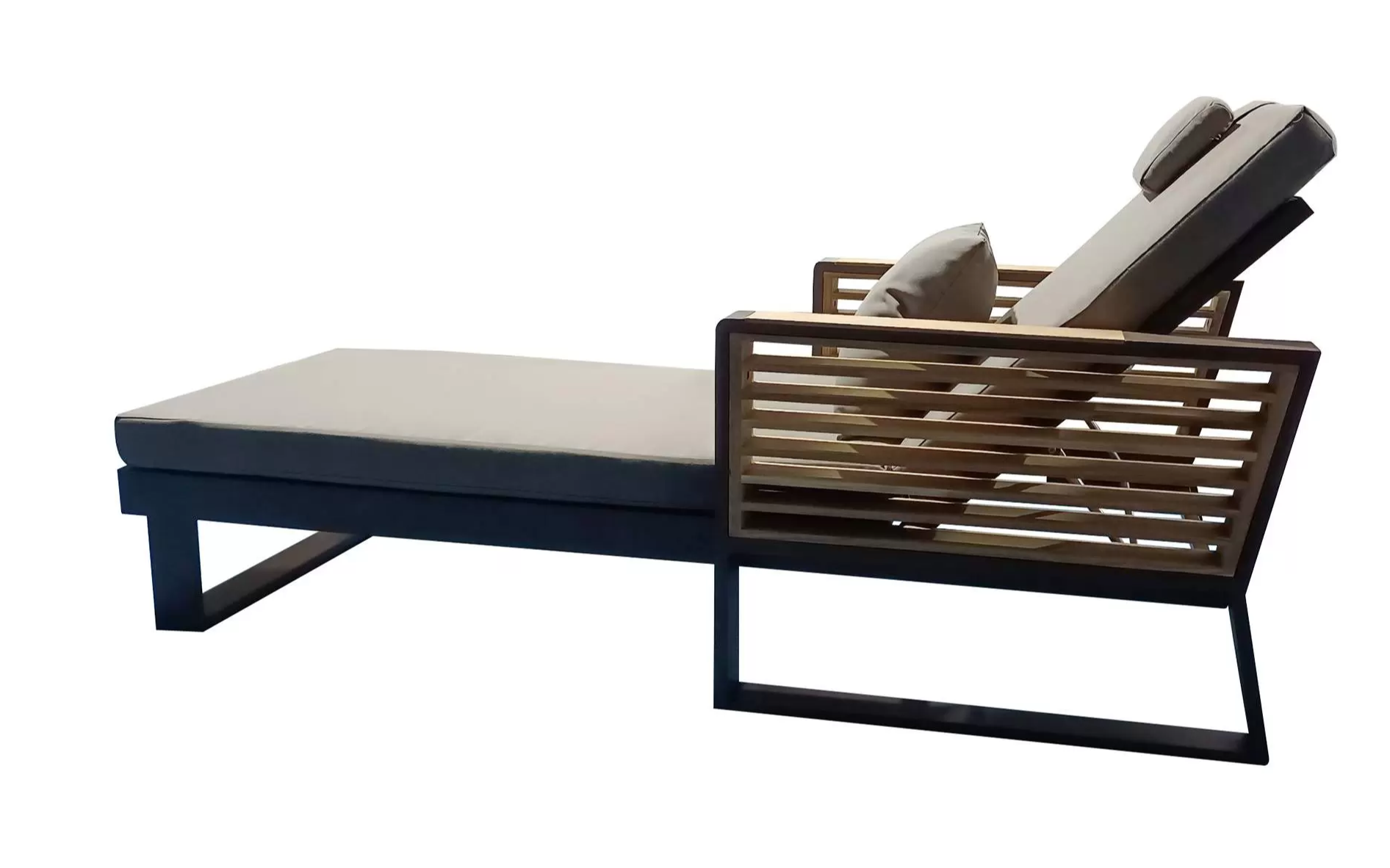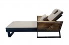 Duży i stylowy leżak aluminiowy na taras pasujący do kolekcji NEW YORK. Konstrukcja opiera się na spawanej ramie aluminiowej malowanej proszkowo, elementach dekoracyjnych z teaku i wygodnych poduszek z obiciami z materiału Olefin. Poduszki położone na opinającej ramę tekstylinie.