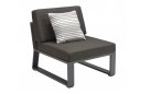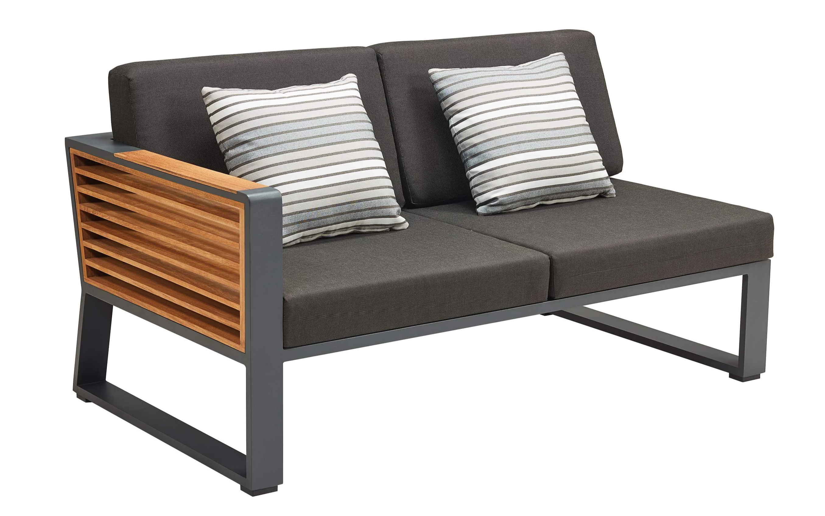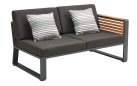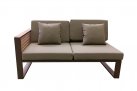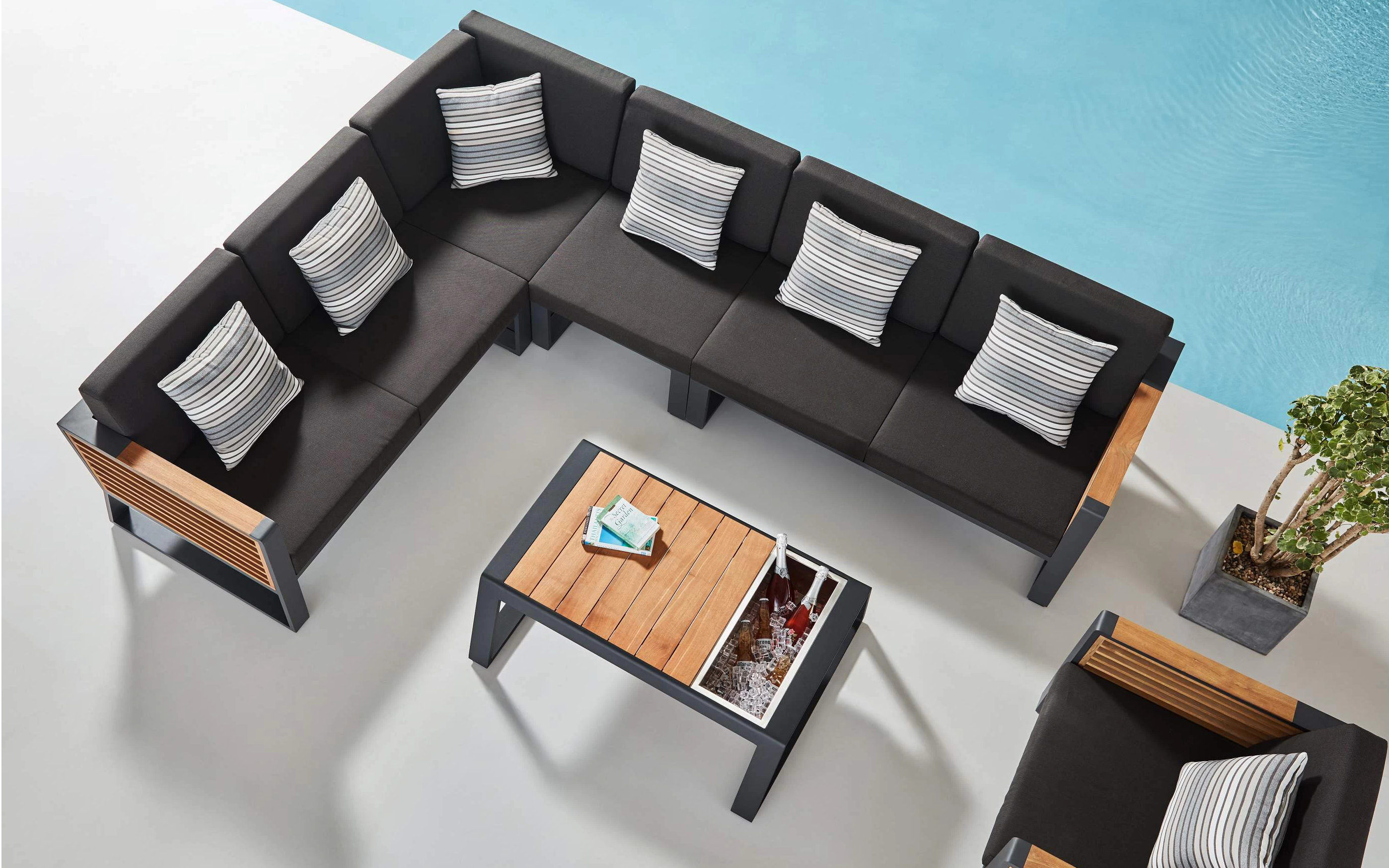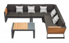Nowoczesny modułowy komplet narożnikowy na taras firmy HIGOLD.  Konstrukcja opiera się na spawanej ramie aluminiowej malowanej proszkowo, elementach dekoracyjnych z teaku i wygodnych poduszek z obiciami z materiału Olefin. Poduszki położone na opinającej ramę tekstylinie.