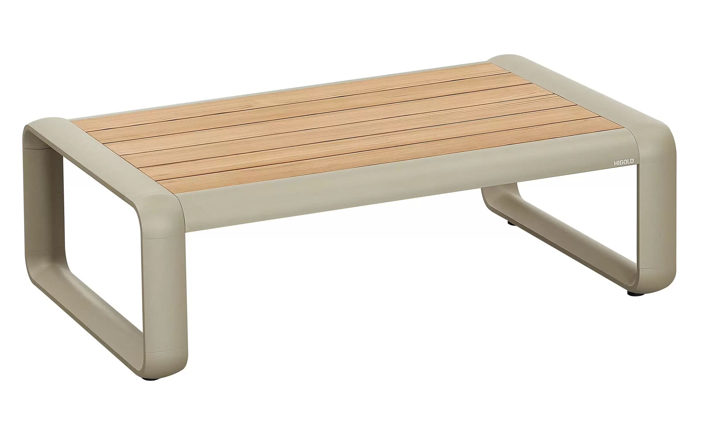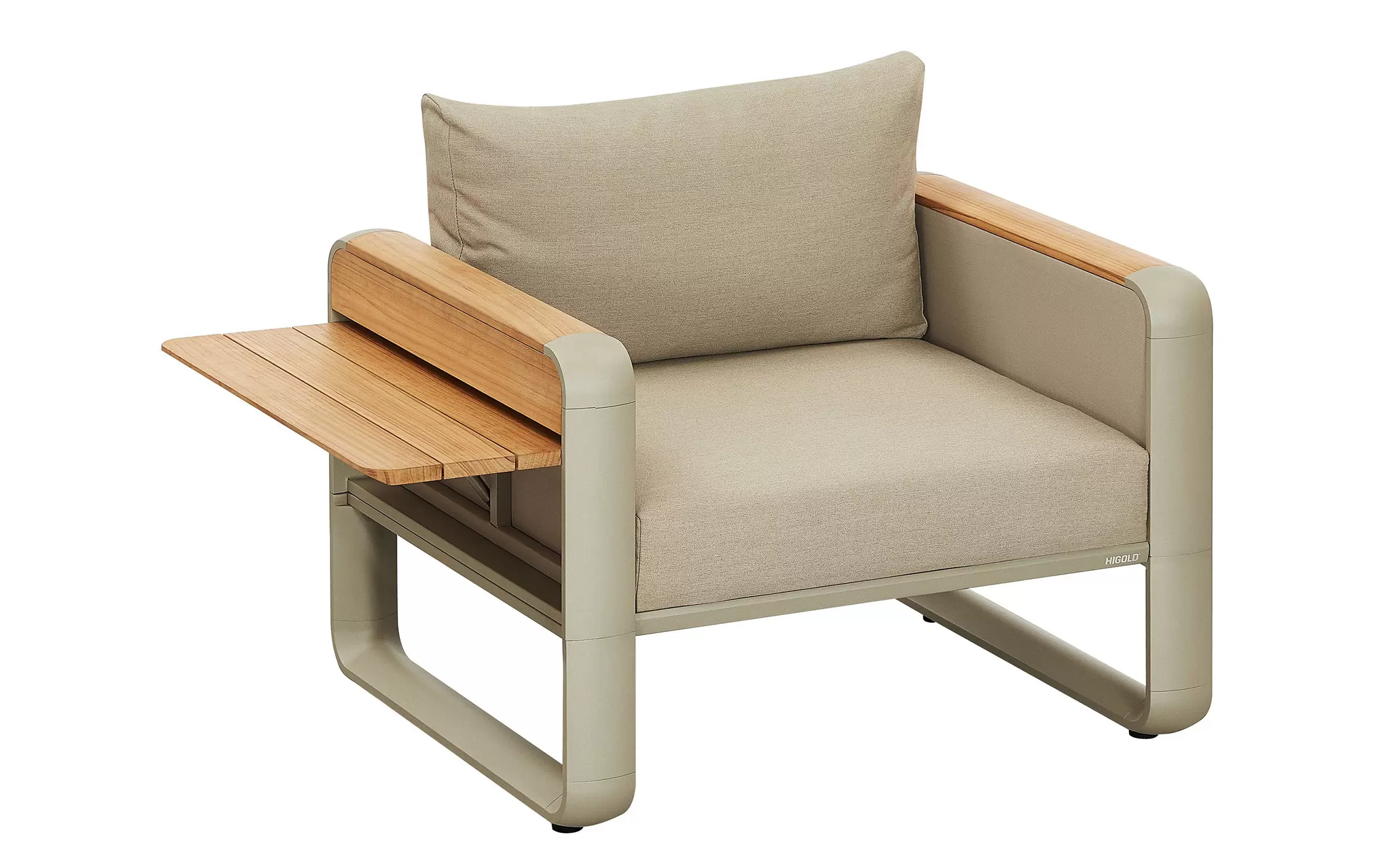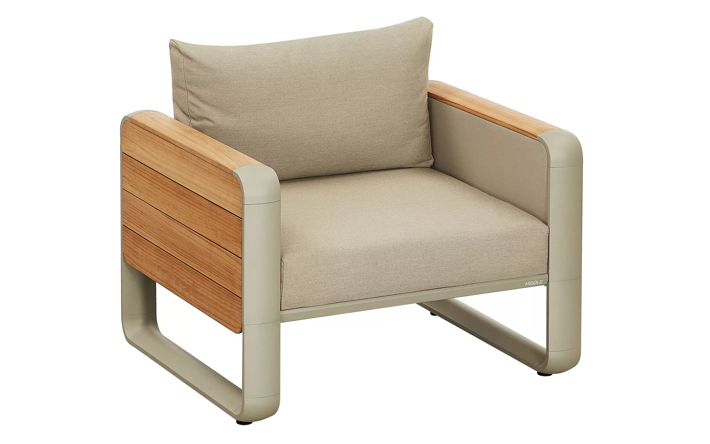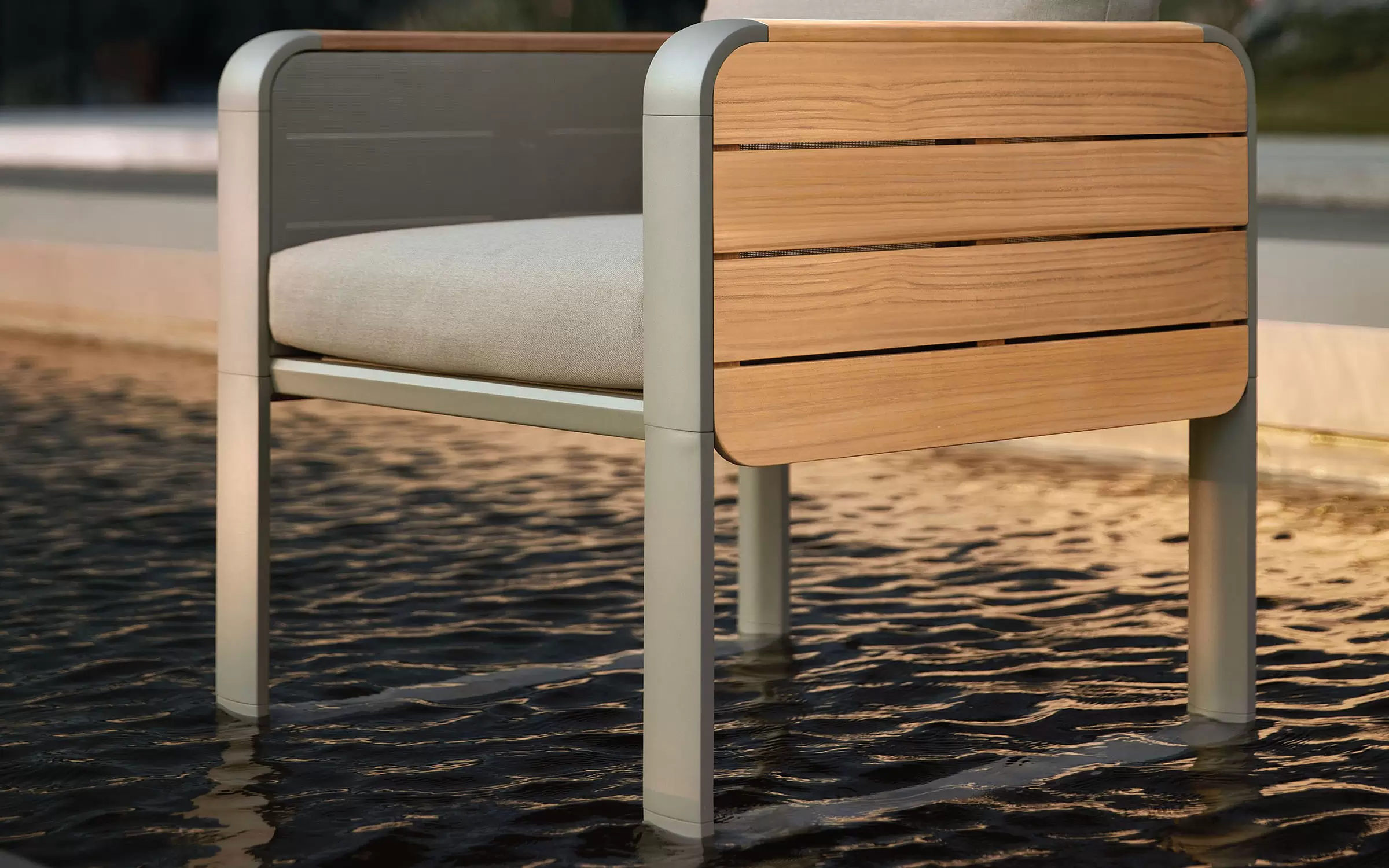 Drewno teakowe klasy Premium – naturalnie nasycone olejkami eterycznymi i krzemionką, drewno teakowe jest uznawane za najlepszy materiał do użytku zewnętrznego. Jest w pełni odporne na wilgoć, grzyby oraz zmienne warunki atmosferyczne. Bursztynowy odcień drewna idealnie współgra z beżową ramą, podkreślając prestiżowy i naturalny charakter kolekcji. Z biegiem czasu teak może nabrać szlachetnej, srebrzystej patyny, co jest procesem naturalnym i pożądanym w meblach klasy premium.