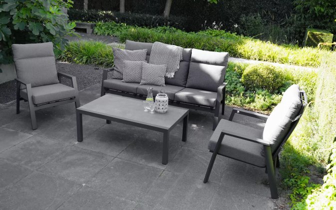 Kolekcja modułowych mebli ogrodowych wypoczynkowych aluminiowych w kolorze ciemnoszarym z wysokimi i pochylanymi(!) oparciami.