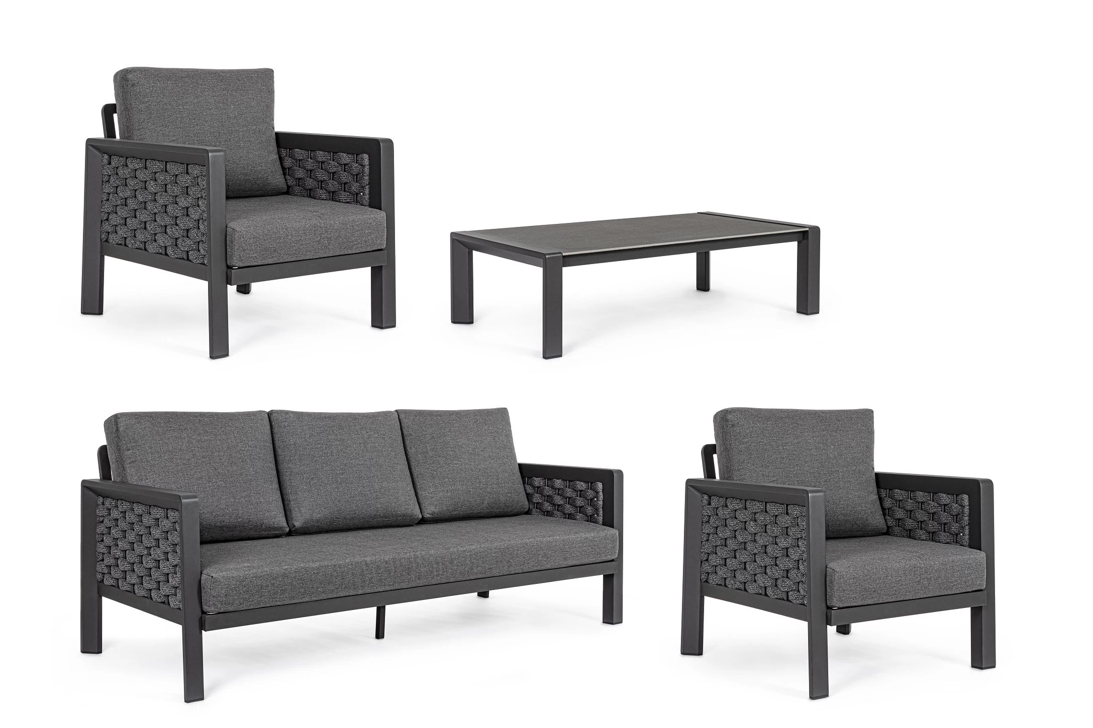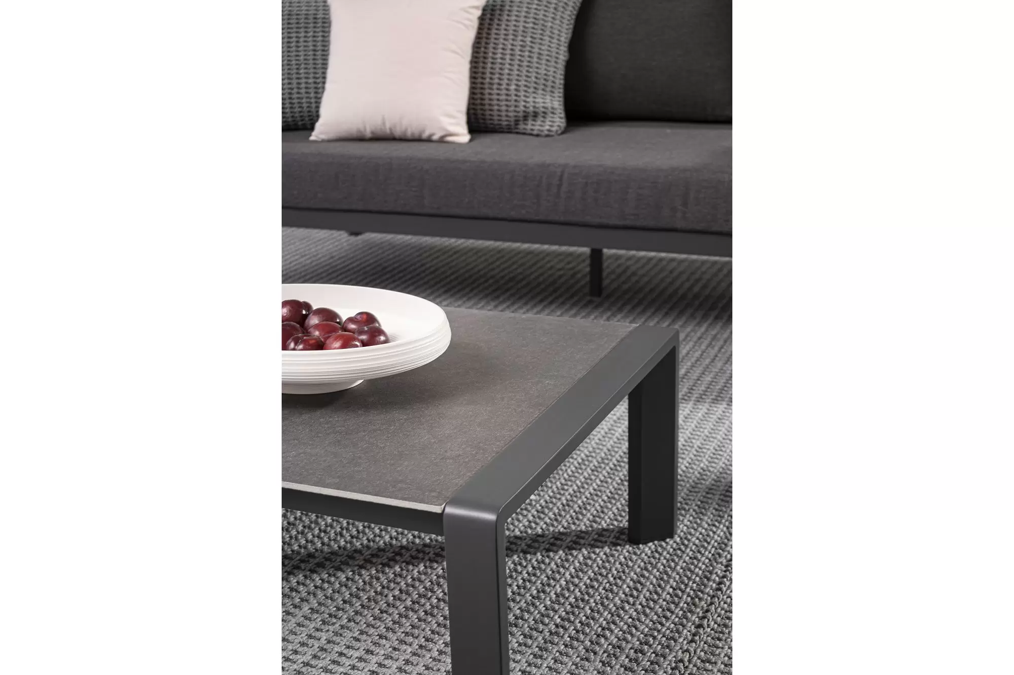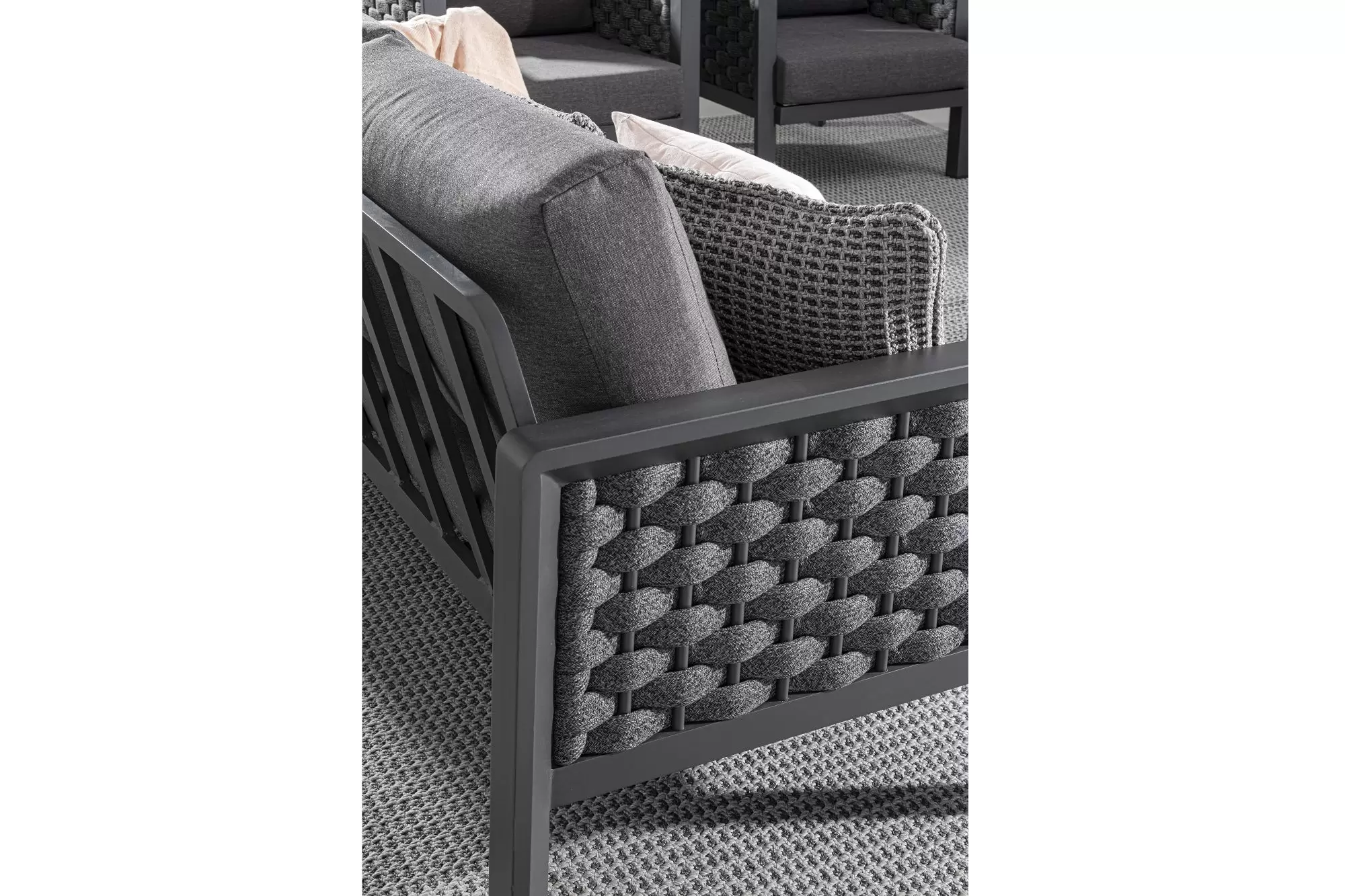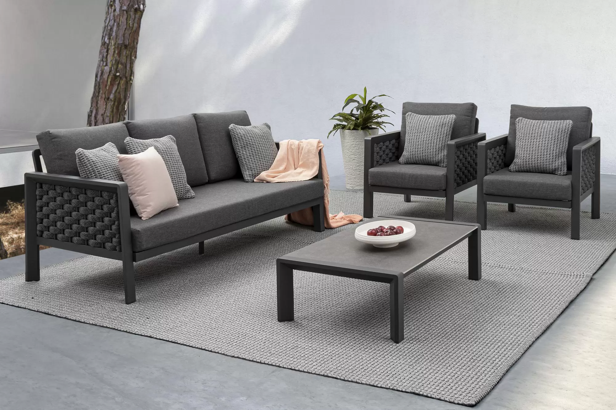 Aluminiowy zestaw mebli ogrodowych na taras z szeroką sofą, dwoma wygodnymi fotelami z wysokim oparciem oraz stolikiem kawowym z blatem ceramicznym z przeznaczeniem do użytku na zewnątrz lub w patio.