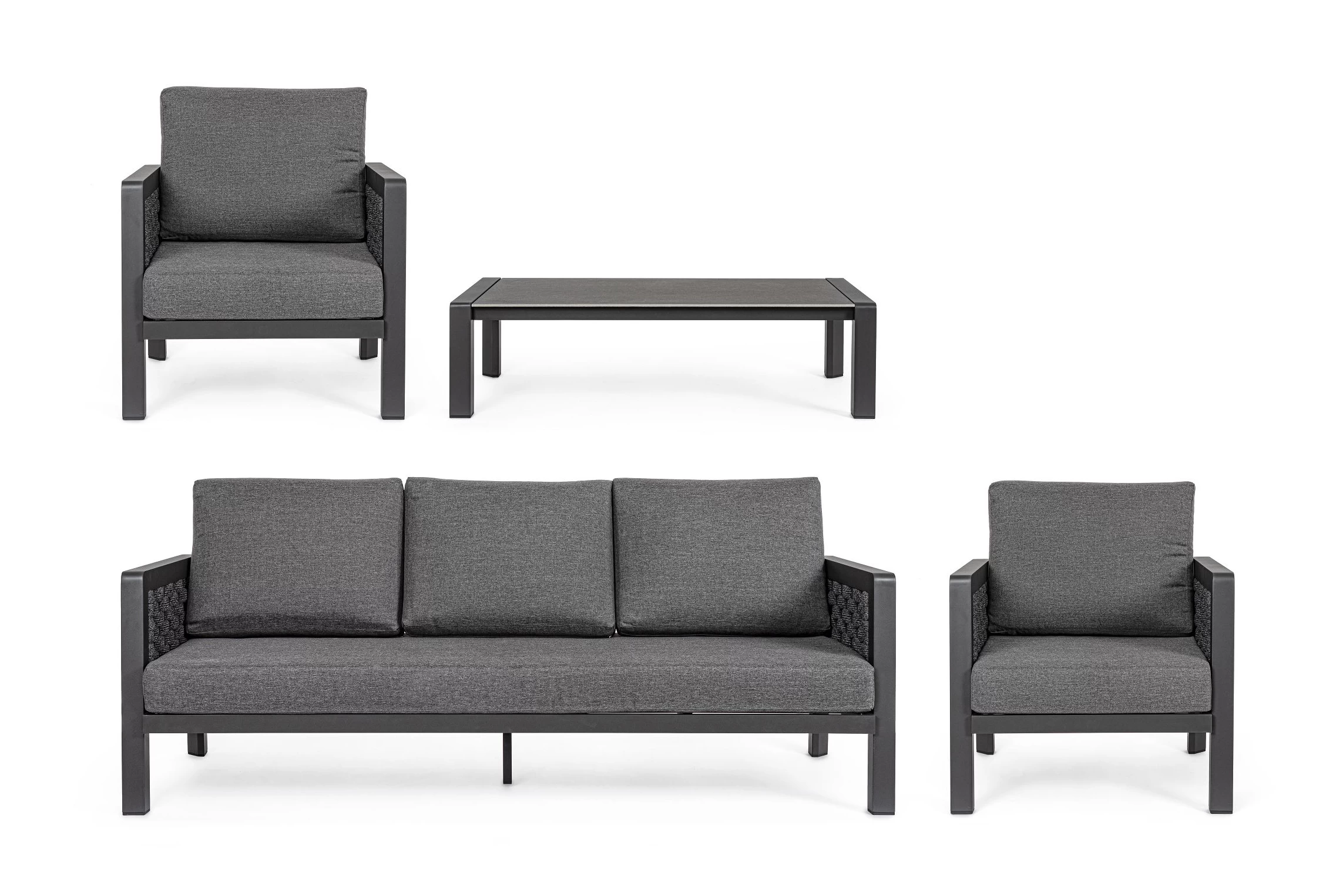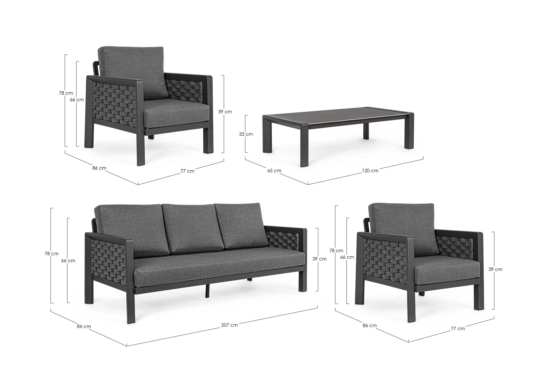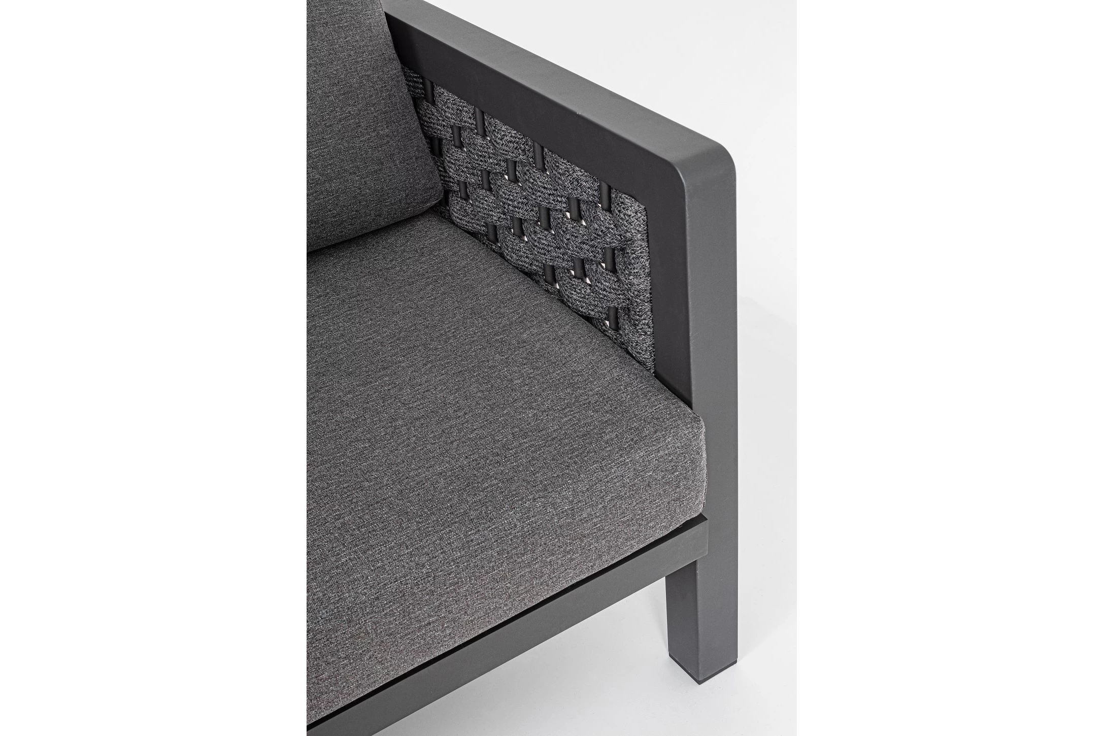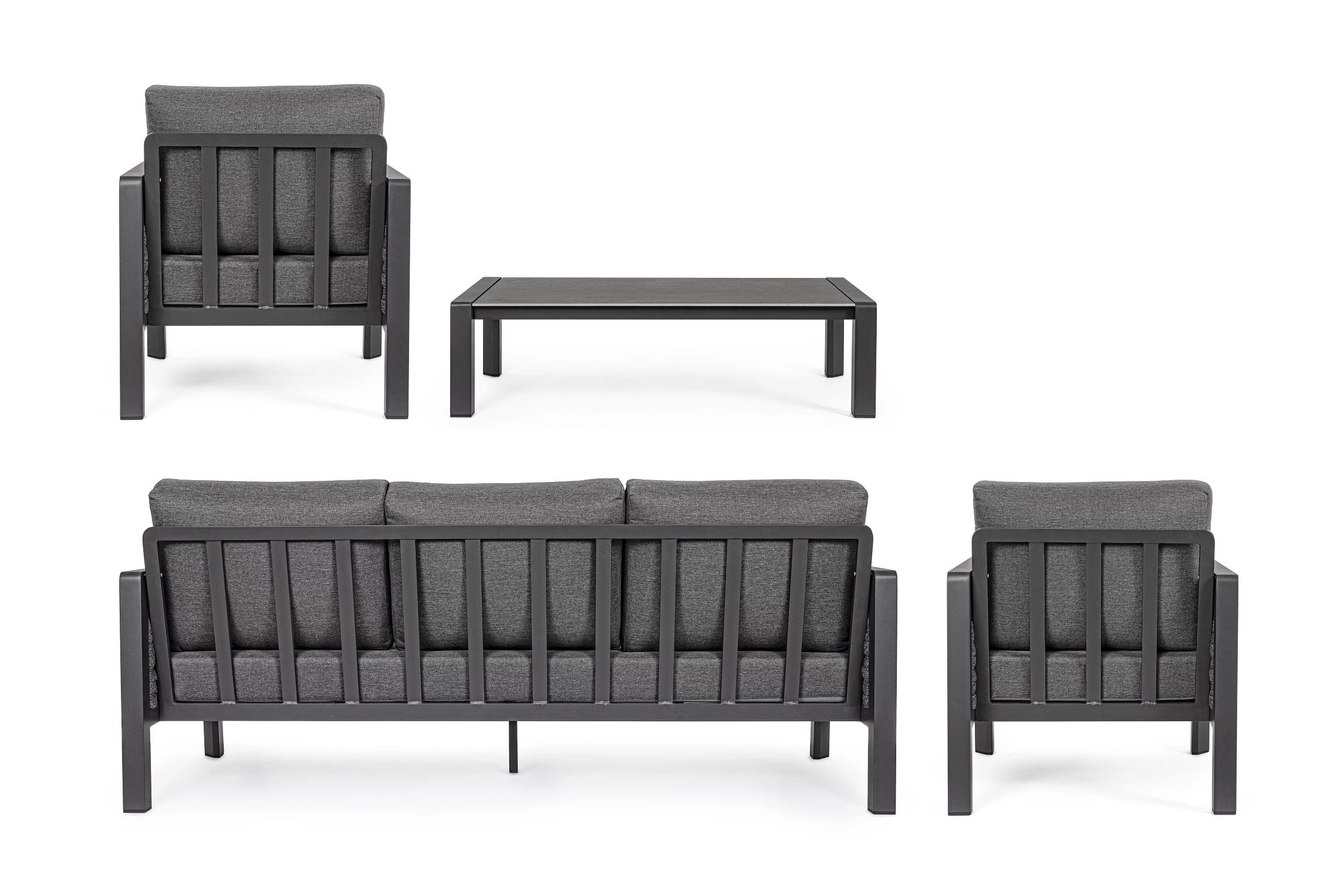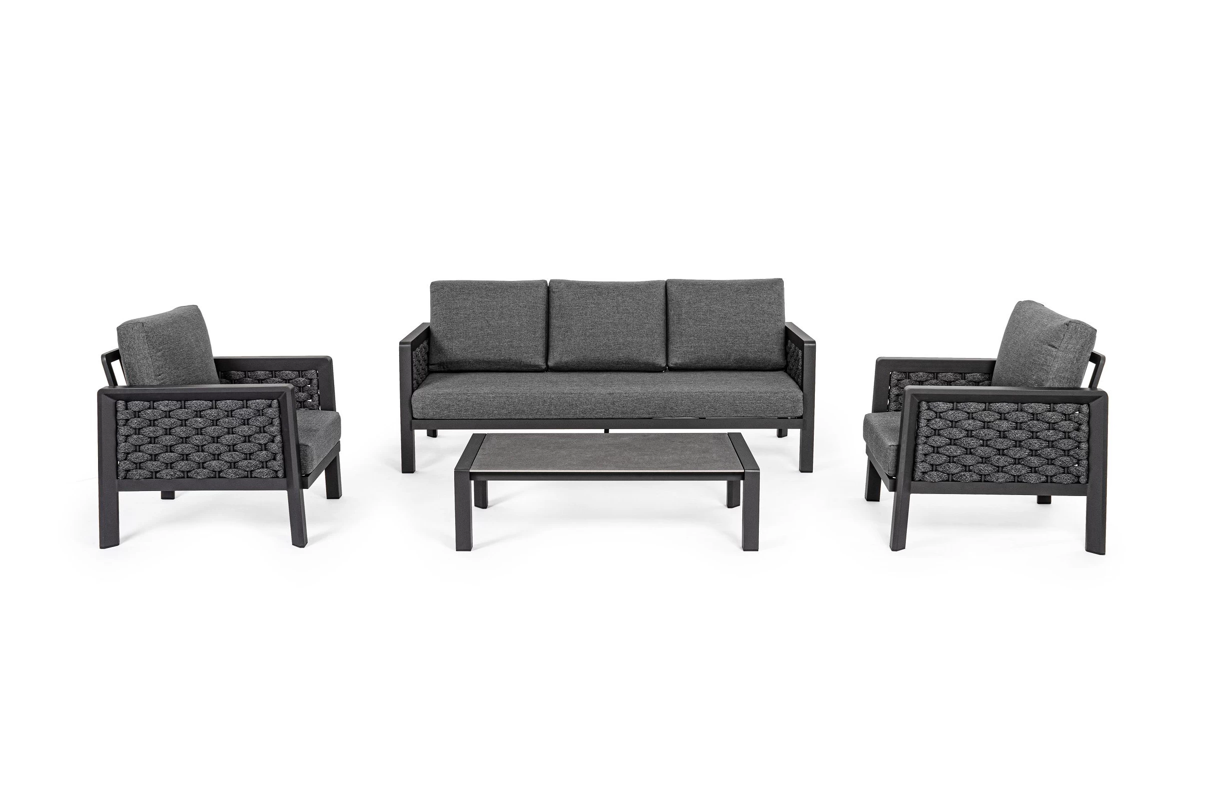 Aluminiowy zestaw mebli ogrodowych na taras z szeroką sofą, dwoma wygodnymi fotelami z wysokim oparciem oraz stolikiem kawowym z blatem ceramicznym z przeznaczeniem do użytku na zewnątrz lub w patio.