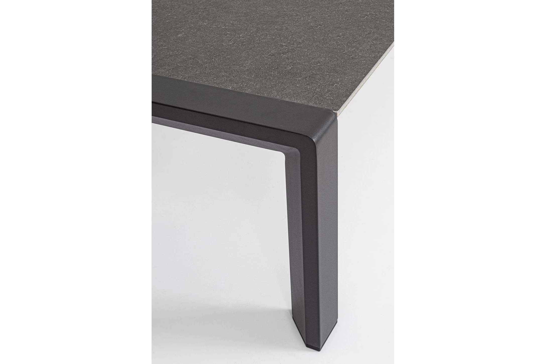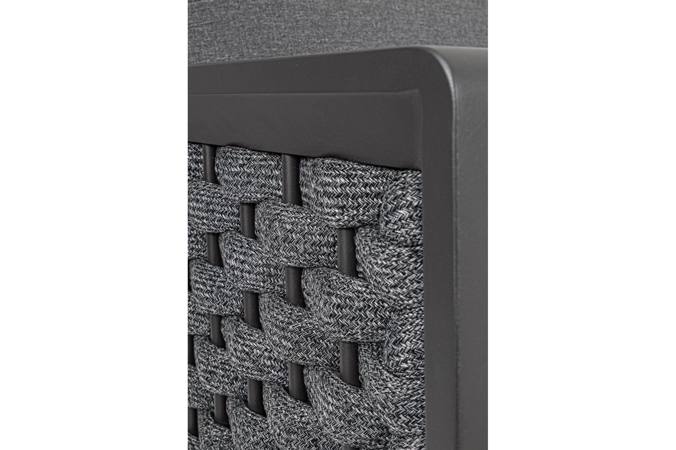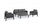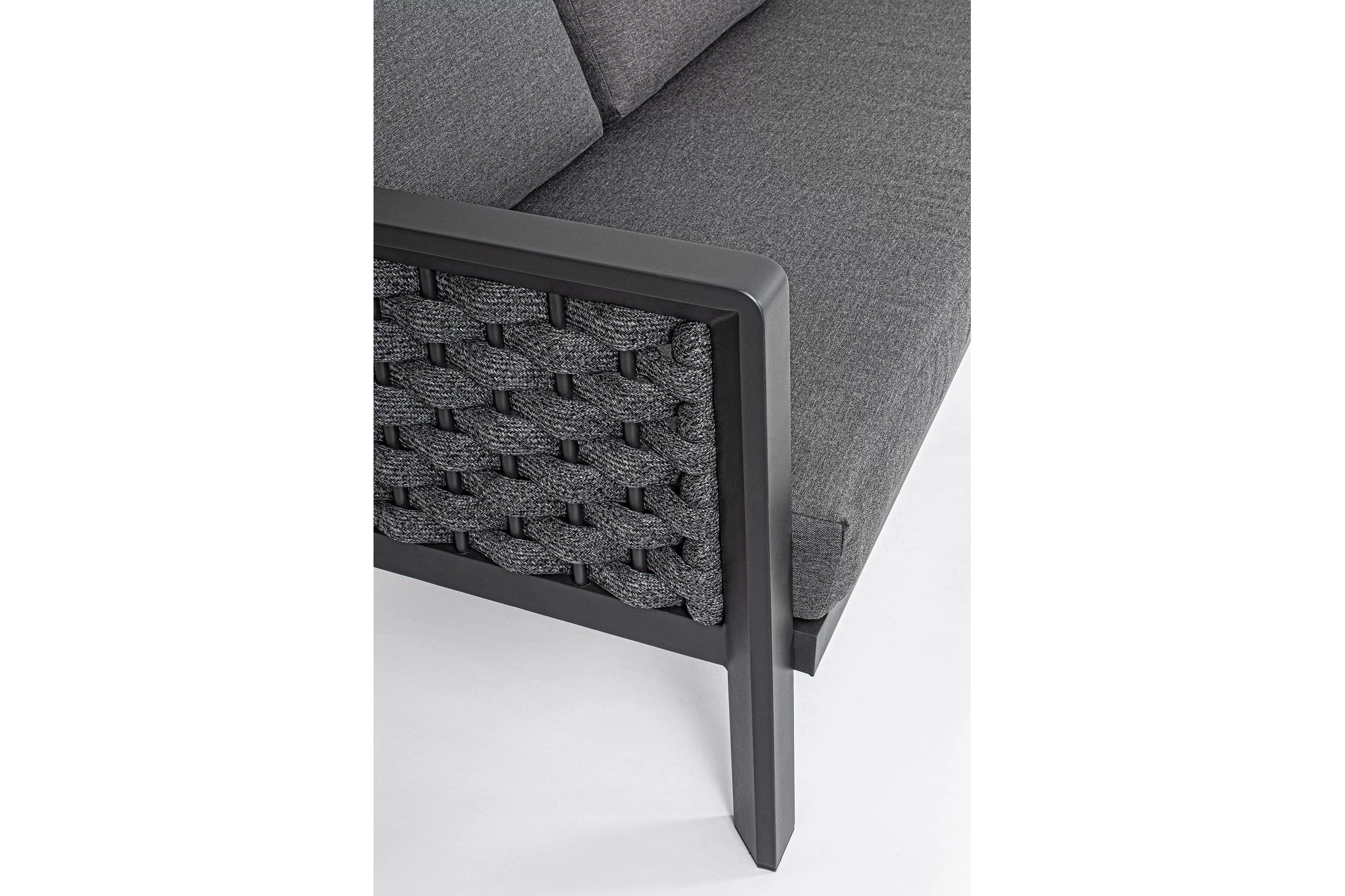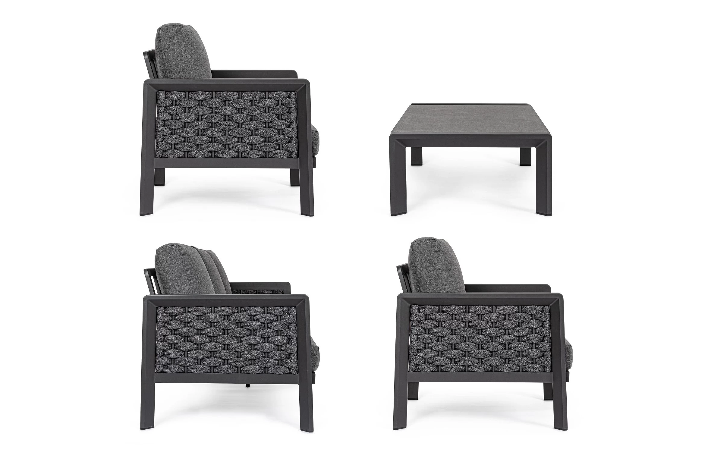 Aluminiowy zestaw mebli ogrodowych na taras z szeroką sofą, dwoma wygodnymi fotelami z wysokim oparciem oraz stolikiem kawowym z blatem ceramicznym z przeznaczeniem do użytku na zewnątrz lub w patio.