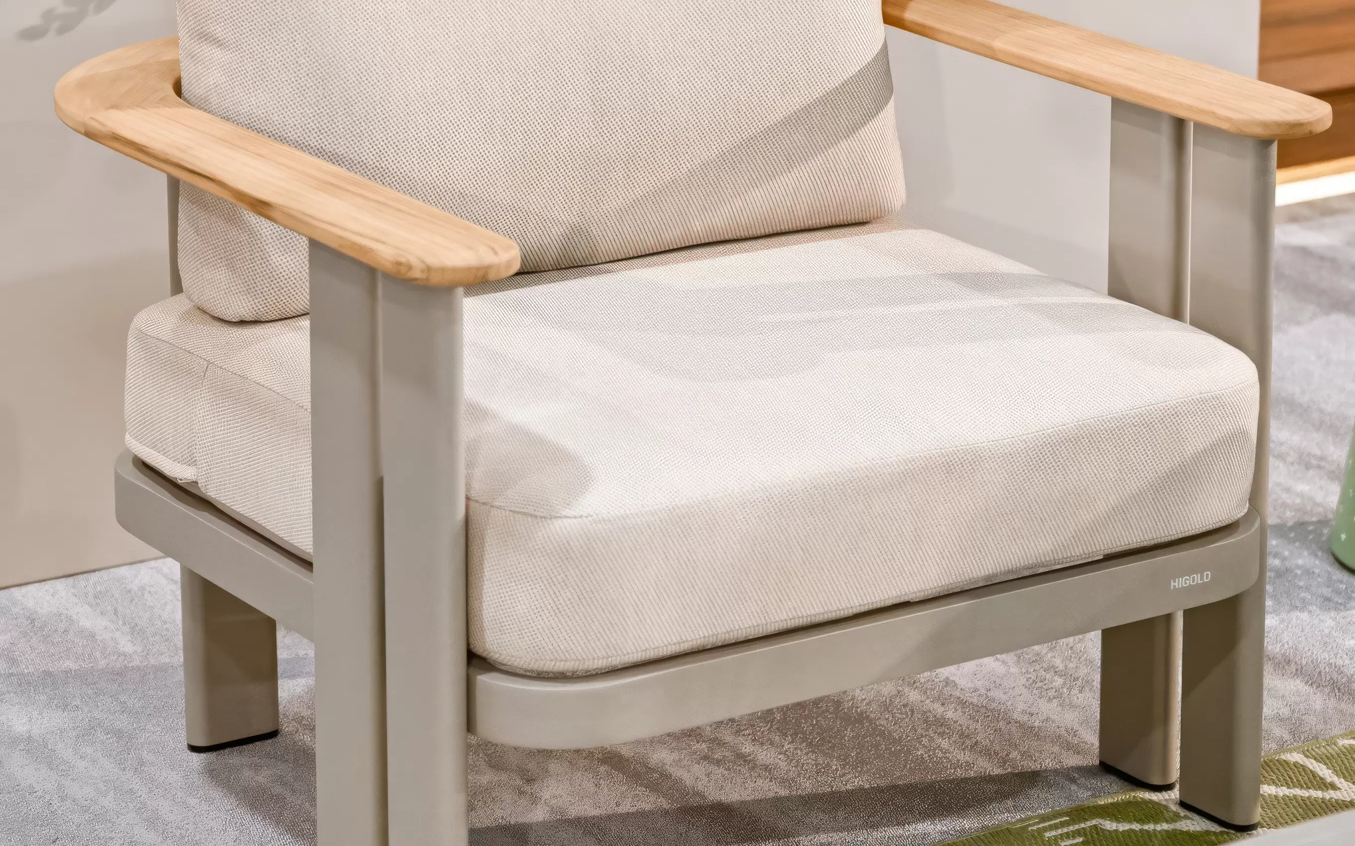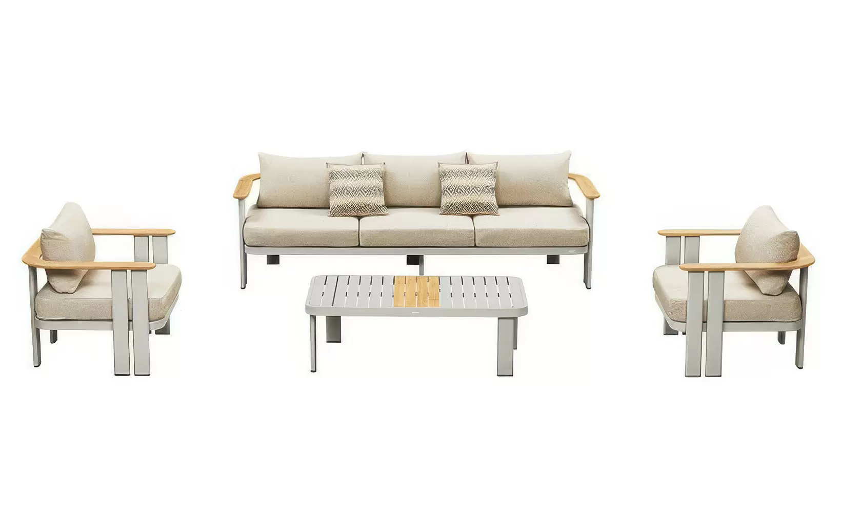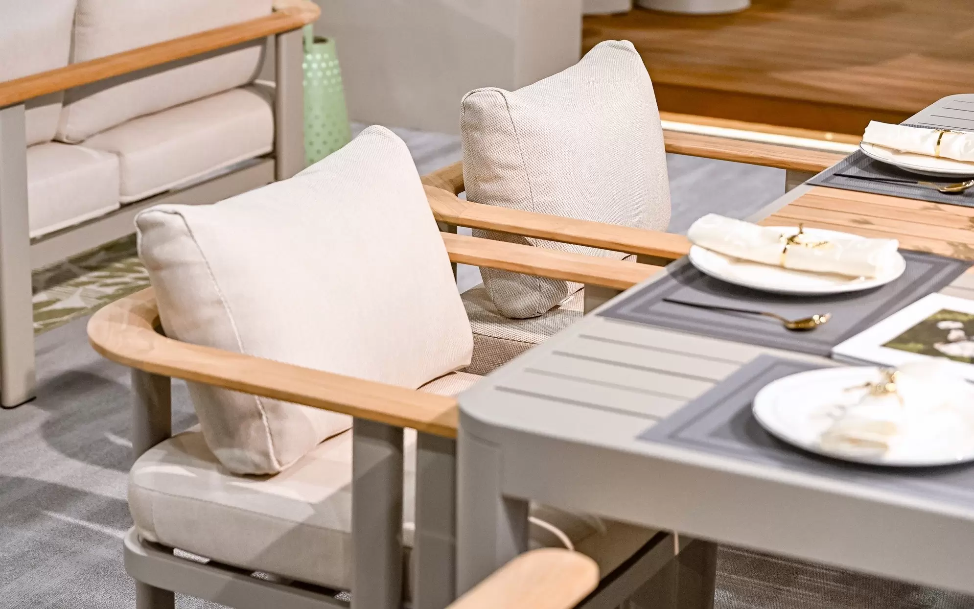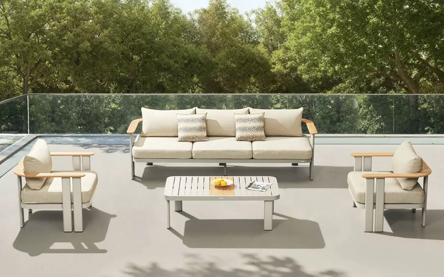 Nierdzewny stelaż z malowanego proszkowo aluminium skutecznie opiera się kaprysom pogody, a detale z naturalnego drewna tekowego przełamują surowość metalu, dodając mu ciepła. Całość dopełniają wytrzymałe poduszki z przędzy olefinowej – materiału, który błyskawicznie schnie i nie blaknie pod wpływem słońca.