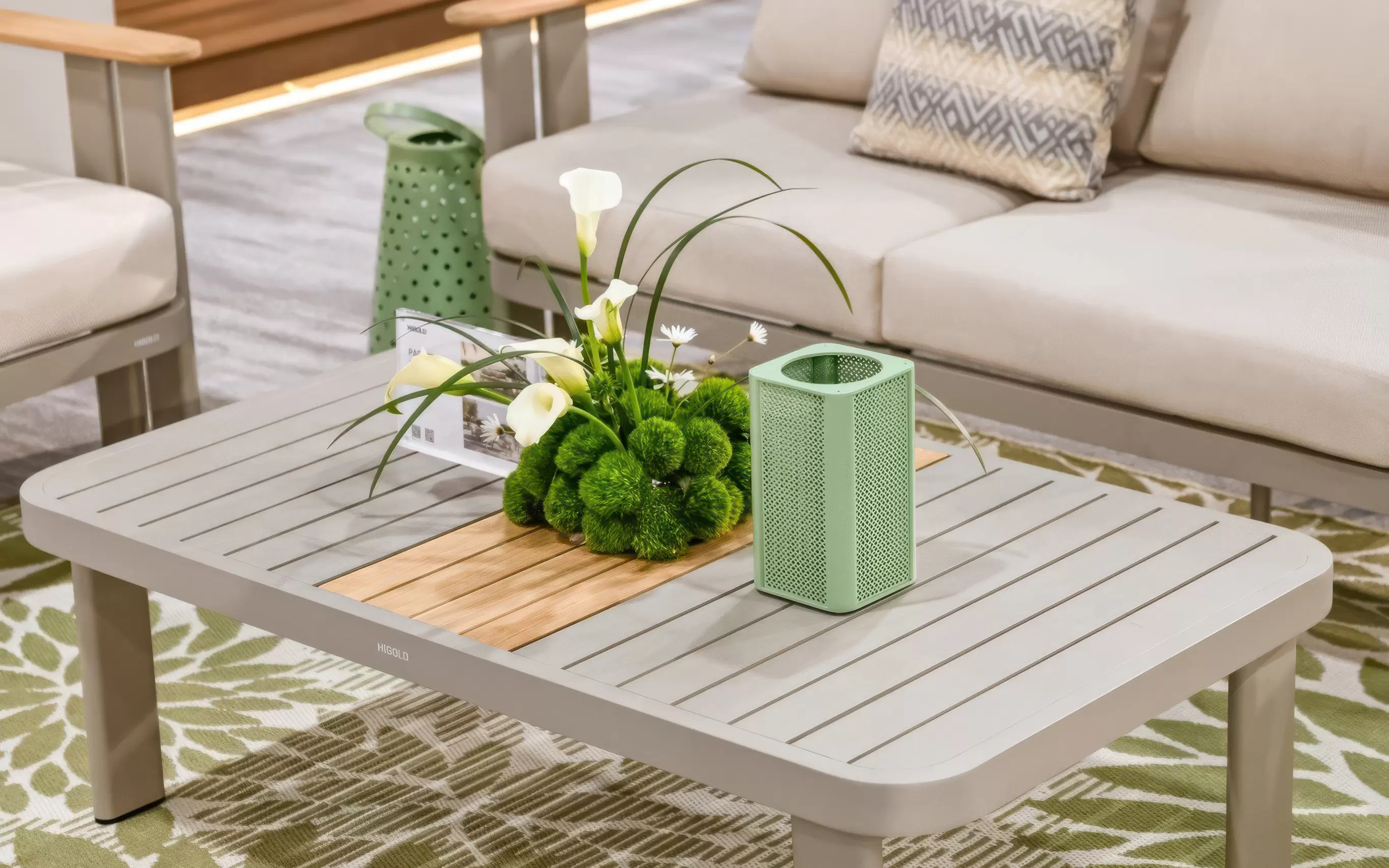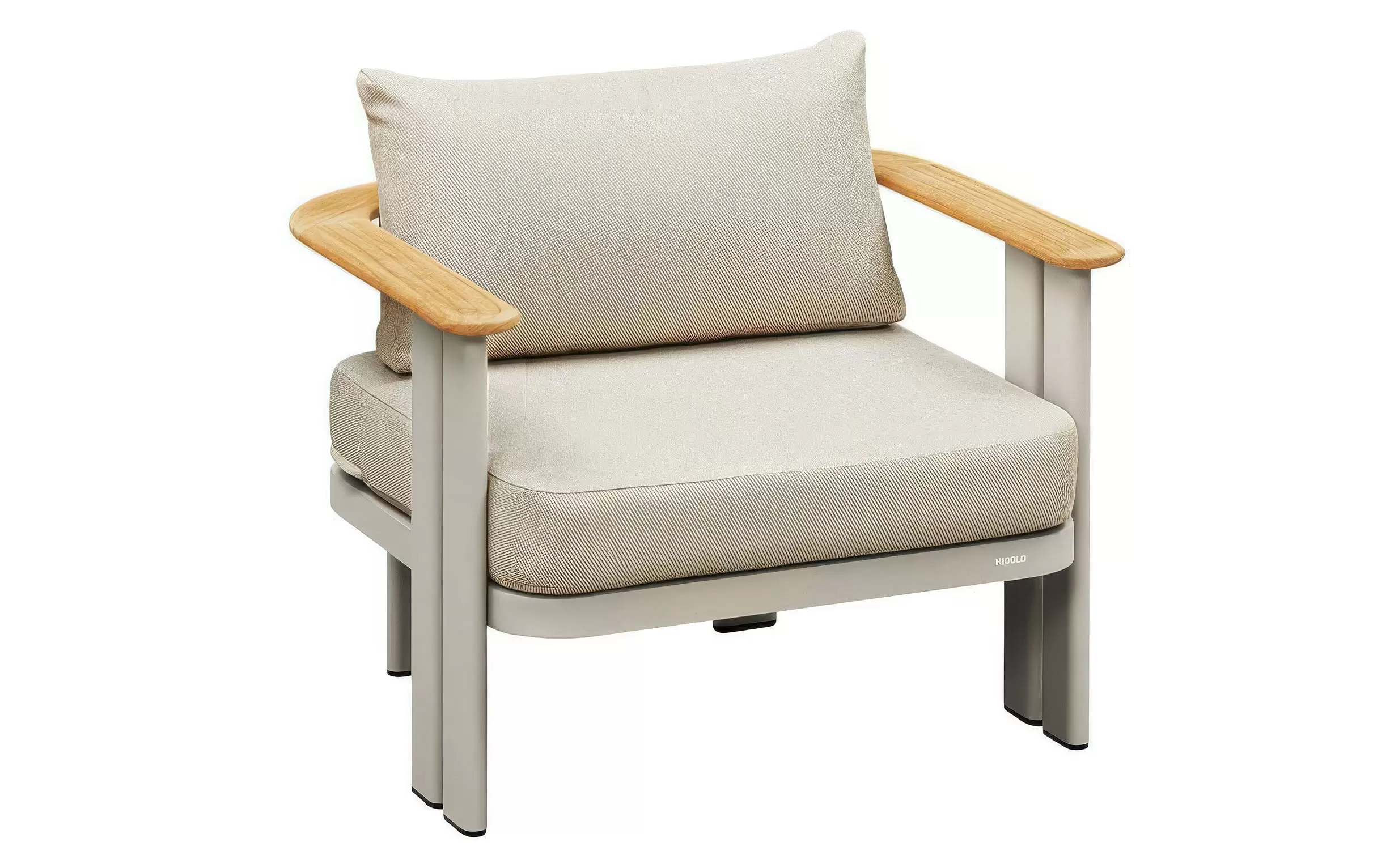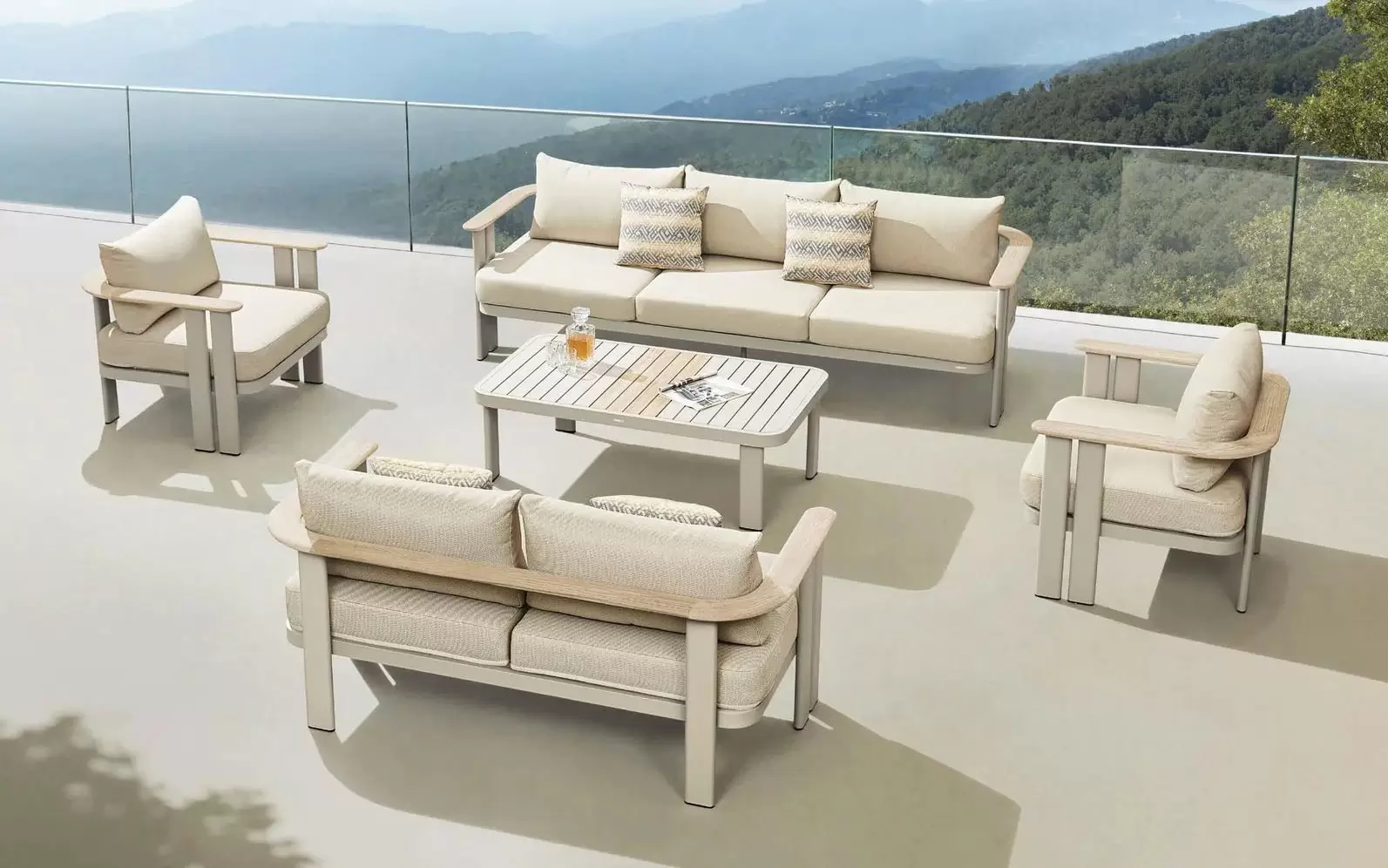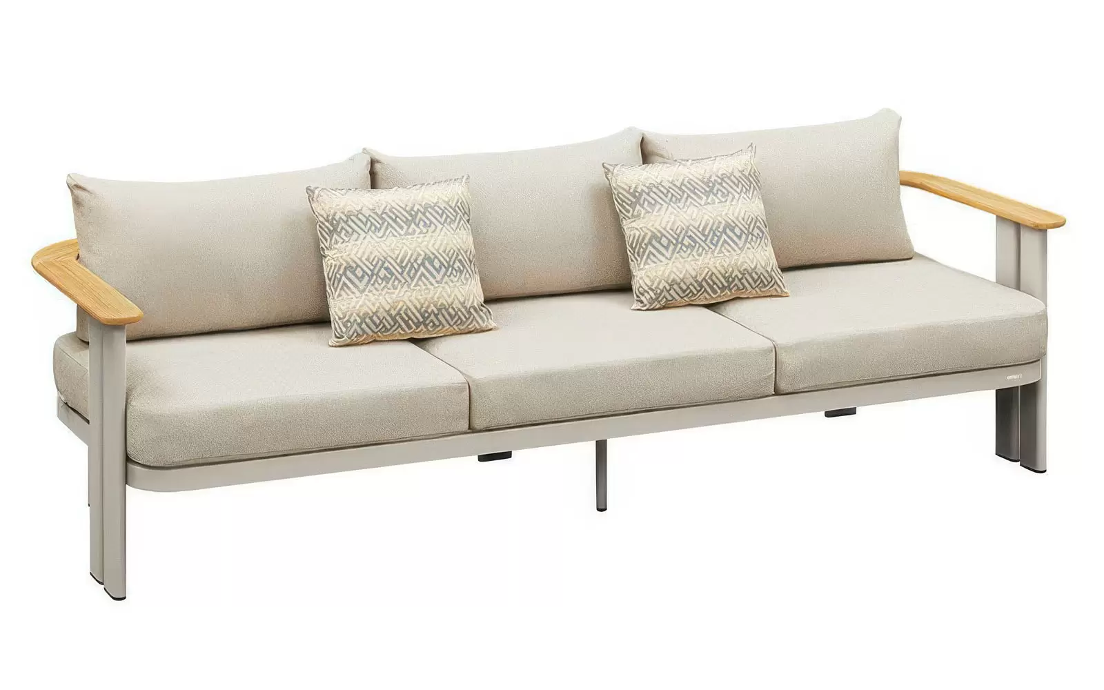 Nierdzewny stelaż z malowanego proszkowo aluminium skutecznie opiera się kaprysom pogody, a detale z naturalnego drewna tekowego przełamują surowość metalu, dodając mu ciepła. Całość dopełniają wytrzymałe poduszki z przędzy olefinowej – materiału, który błyskawicznie schnie i nie blaknie pod wpływem słońca.