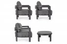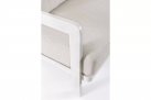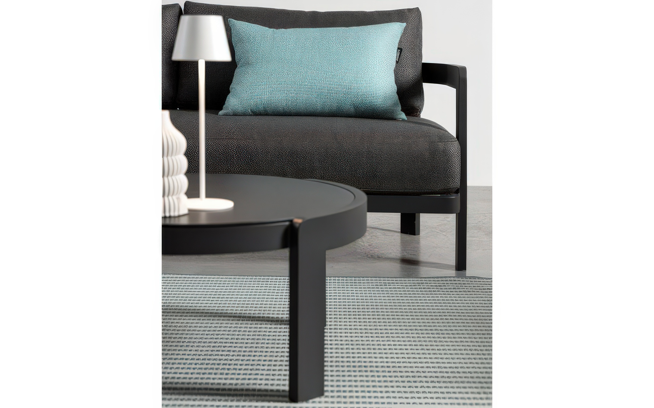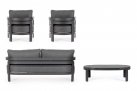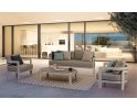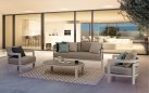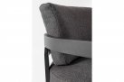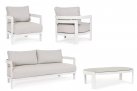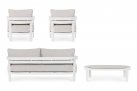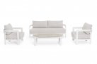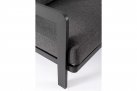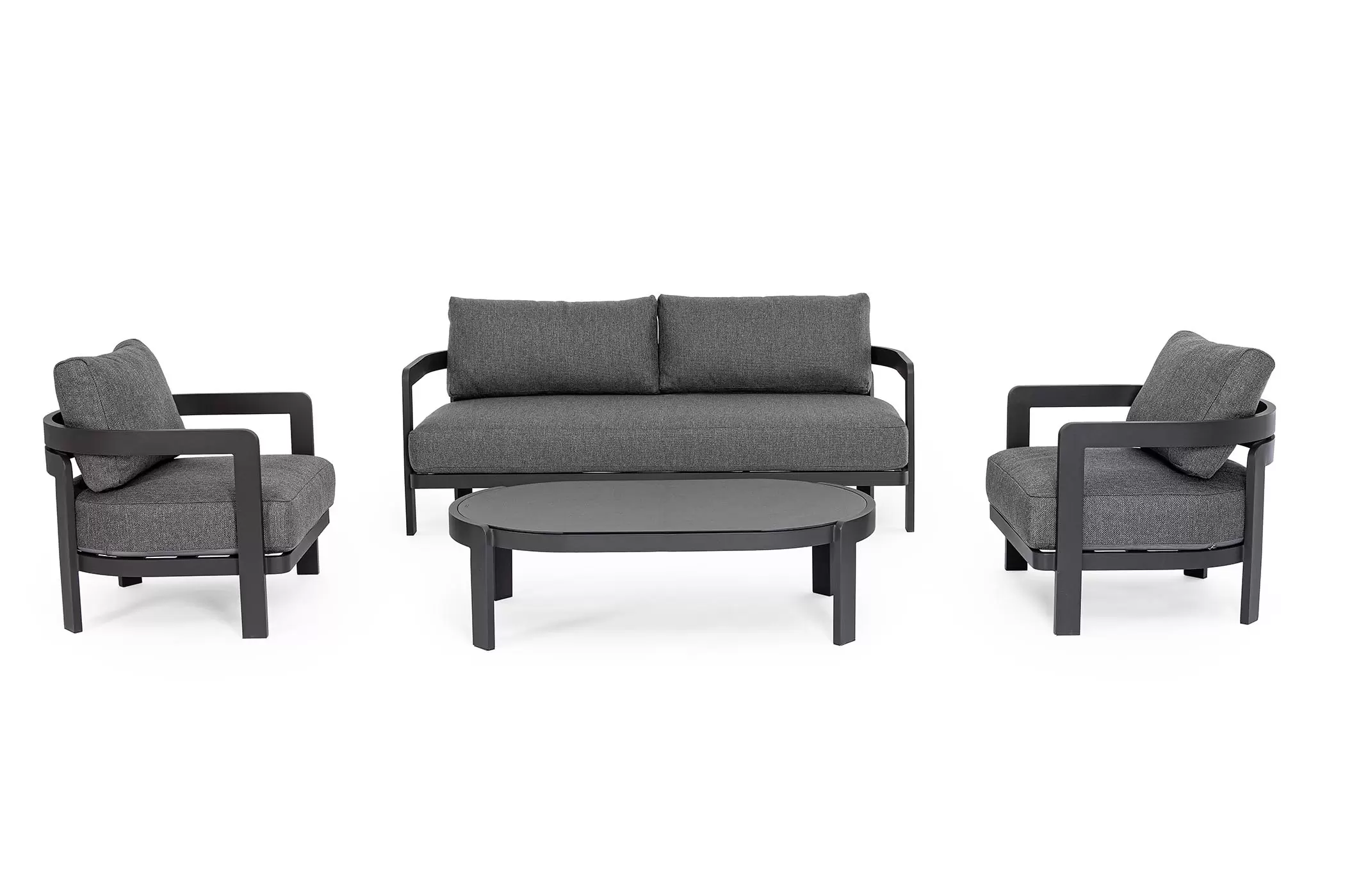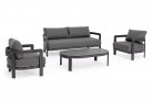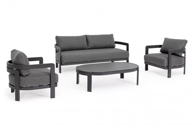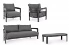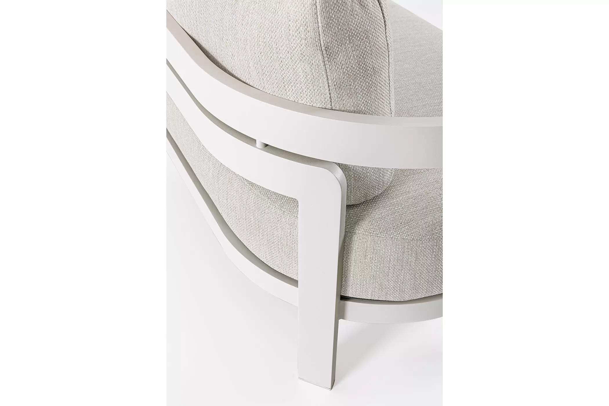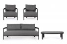 Aluminiowy komplet na taras z sofą 2,5-osobową i dwoma wygodnymi fotelami z przeznaczeniem do użytku na zewnątrz lub w patio. Styl konstrukcji mebli wyznaczają zaokrąglone profile pleców.