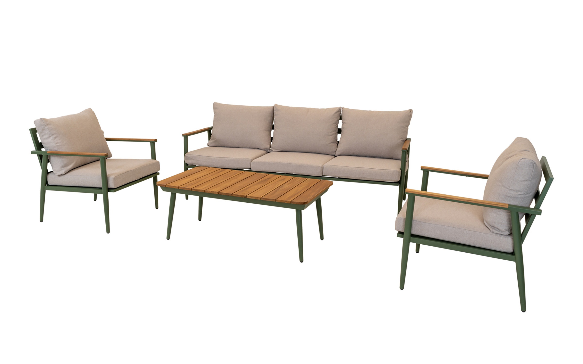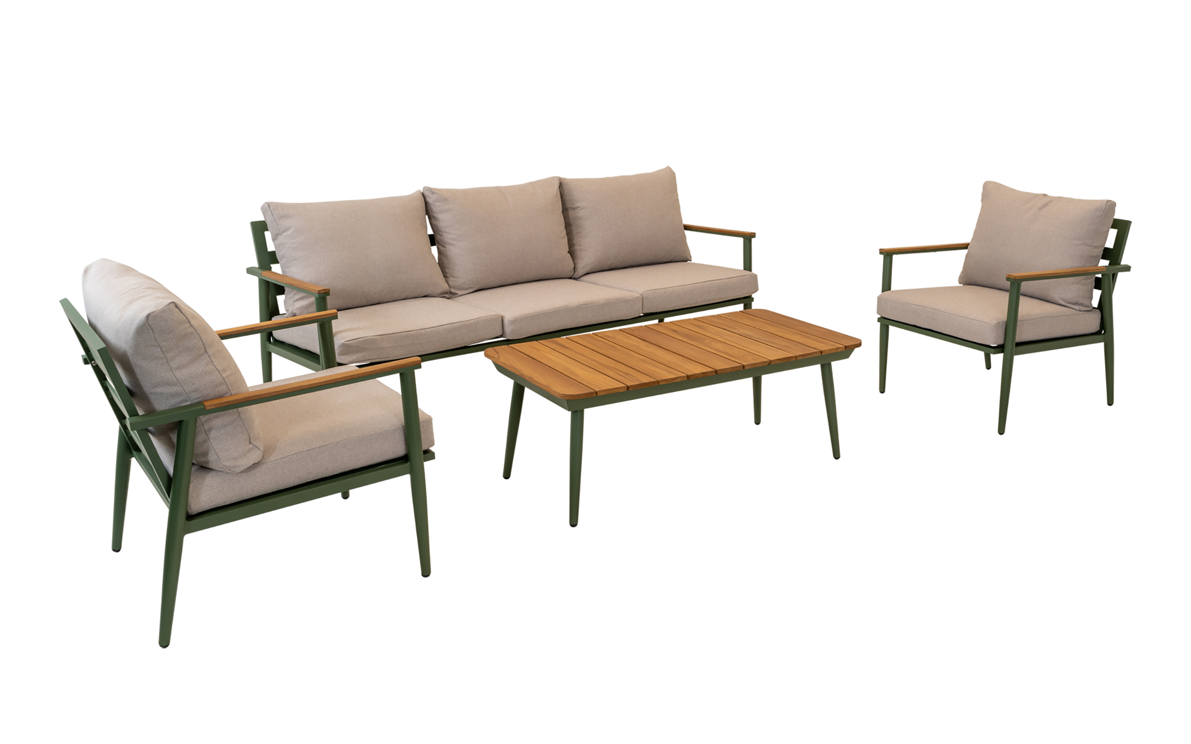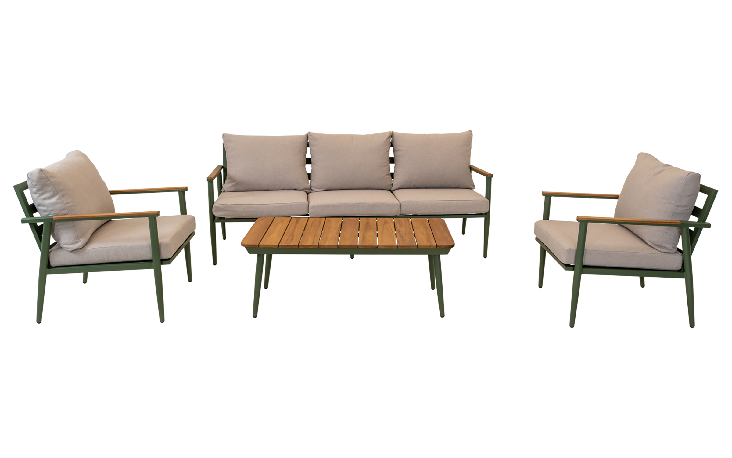 RIGA Zestaw wypoczynkowy ogrodowy aluminium matowa zieleń z poduszkami Olefin i blatem teak