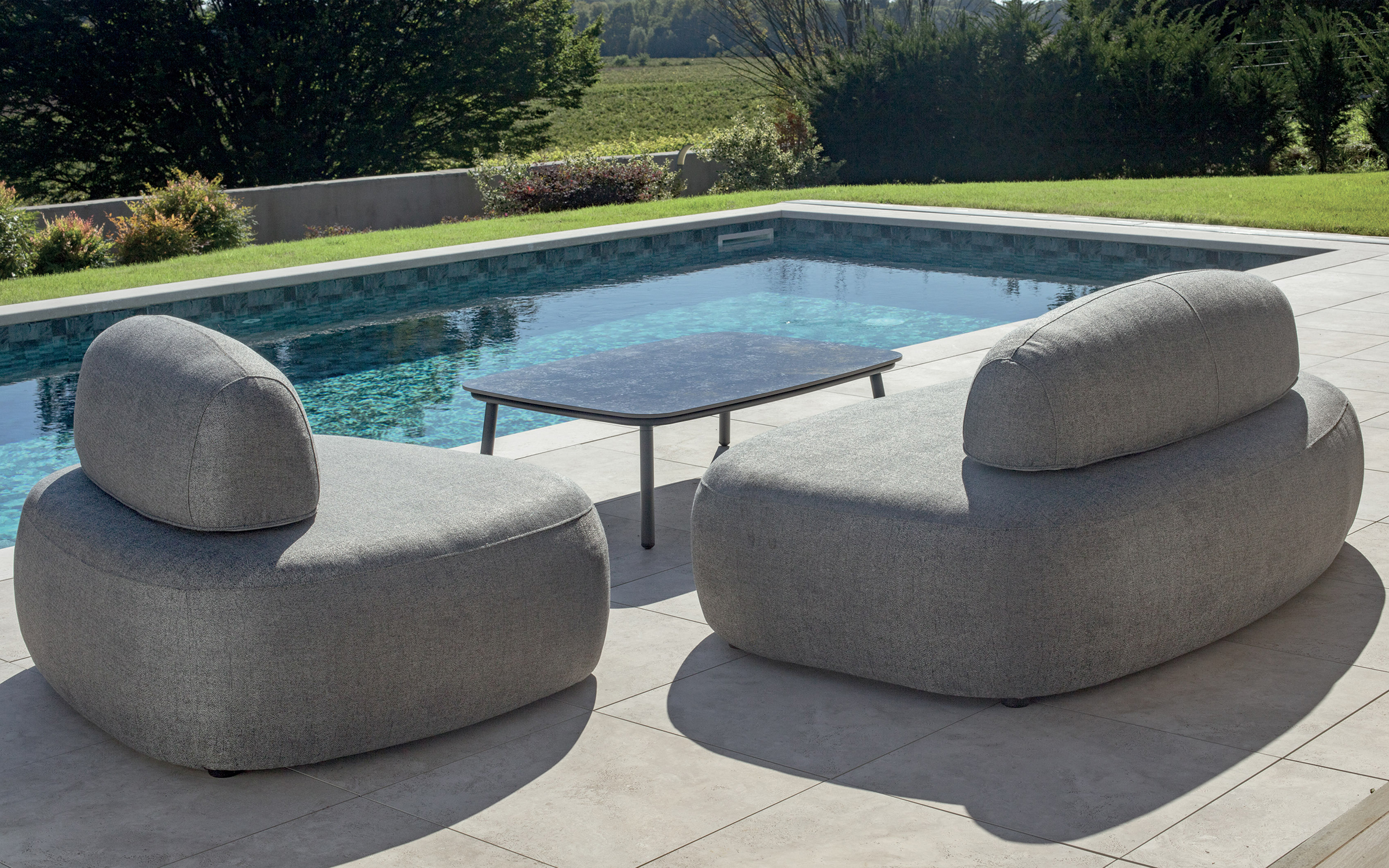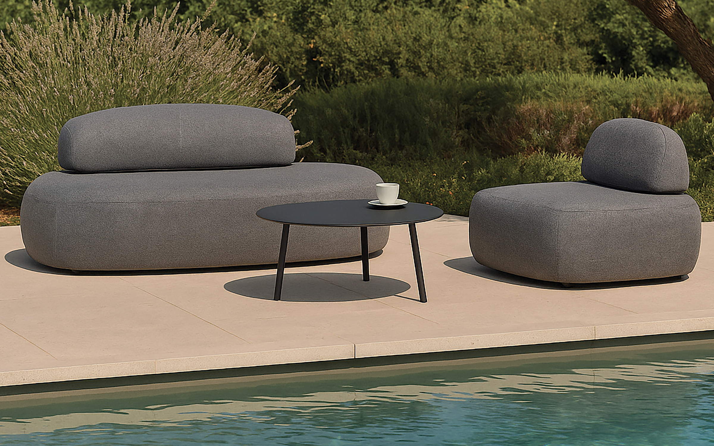 Zaawansowana konstrukcja siedzisk bazuje na lekkim aluminium zintegrowanym ze specjalistyczną gumową warstwą drenażową, co skutecznie chroni meble przed wilgocią i przedłuża ich żywotność. Całość wykończono wysokogatunkową tkaniną Pengi w eleganckim, antracytowym odcieniu, która jest wodoodporna, szybkoschnąca i wyjątkowo przyjemna w dotyku. Dzięki spójnej kolorystyce i połączeniu technicznej wytrzymałości z wyrafinowaną estetyką, ROCK SET stanowi doskonałe dopełnienie prestiżowych aranżacji ogrodowych, oferując luksusowy wypoczynek w nowoczesnym wydaniu.
