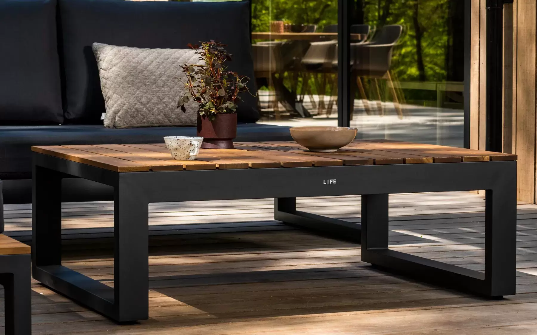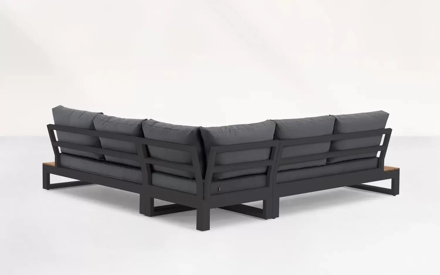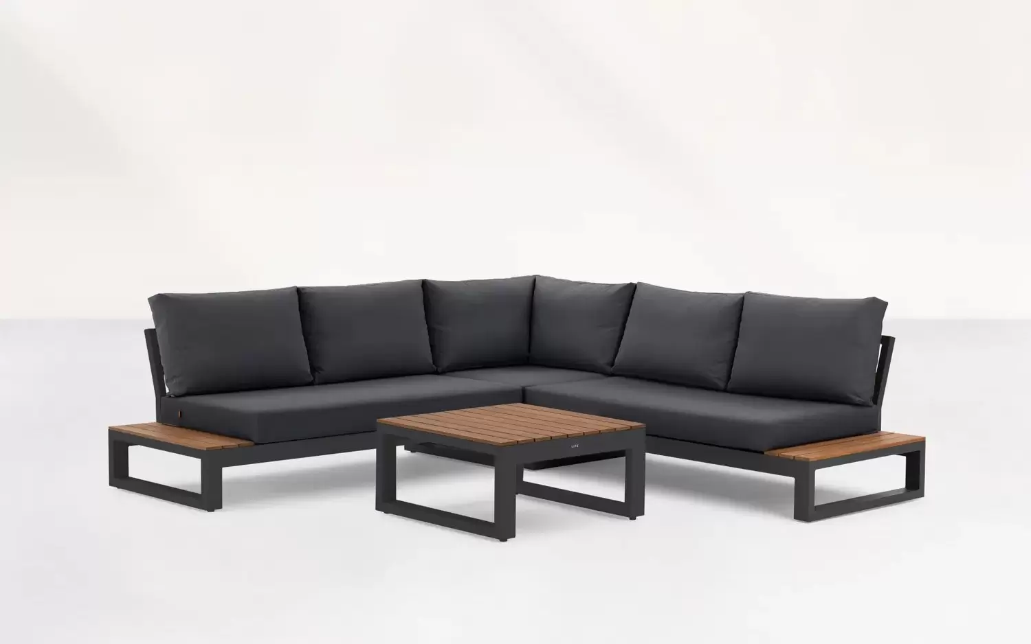 Nowoczesny narożnik Life Outdoor złożony z 3 elementów. Proponowany zestaw posiada na zakończeniach ramion stolik z blatów teak. Zestaw łączy proste kształty solidnej aluminiowej ciemnoszarej konstrukcji z teakowymi dodatkami w ciepłym miodowym kolorze. Stolik w tym komplecie posiada wymiary 82x82 cm.